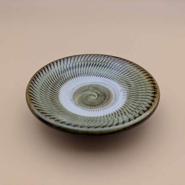 豆皿 小鹿田焼(薄緑 飛び鉋01) 直径9.0cm 高さ2.3m 重量90g 田舎の風景を思わせる豆皿。小鹿田焼の特徴である飛び鉋紋様が美しい一品です。ほどよく盛り付けられたお料理が素敵に映える豆皿は、食卓に彩りを与えてくれます。手に取ると温かみが感じられる陶器製で、持ちやすく、持った瞬間に生活の豊かさを感じることができます。 これは、小鹿田焼の職人たちの技術と情熱が注がれて生まれた一品です。昔ながらの製法と現代的なデザインが融合し、一つ一つ手作業で仕上げられています。そのため、同じ商品でも一つ一つ表情が異なり、個性的な豆皿としてお楽しみいただけます。