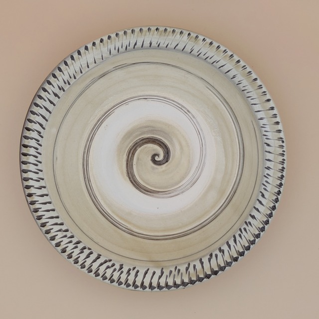 深皿6.5寸 小鹿田焼(縁飛び鉋・白地に渦巻01)