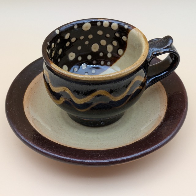 コーヒーカップ&ソーサー 湯町窯(黒 スリップウエア+水玉)01