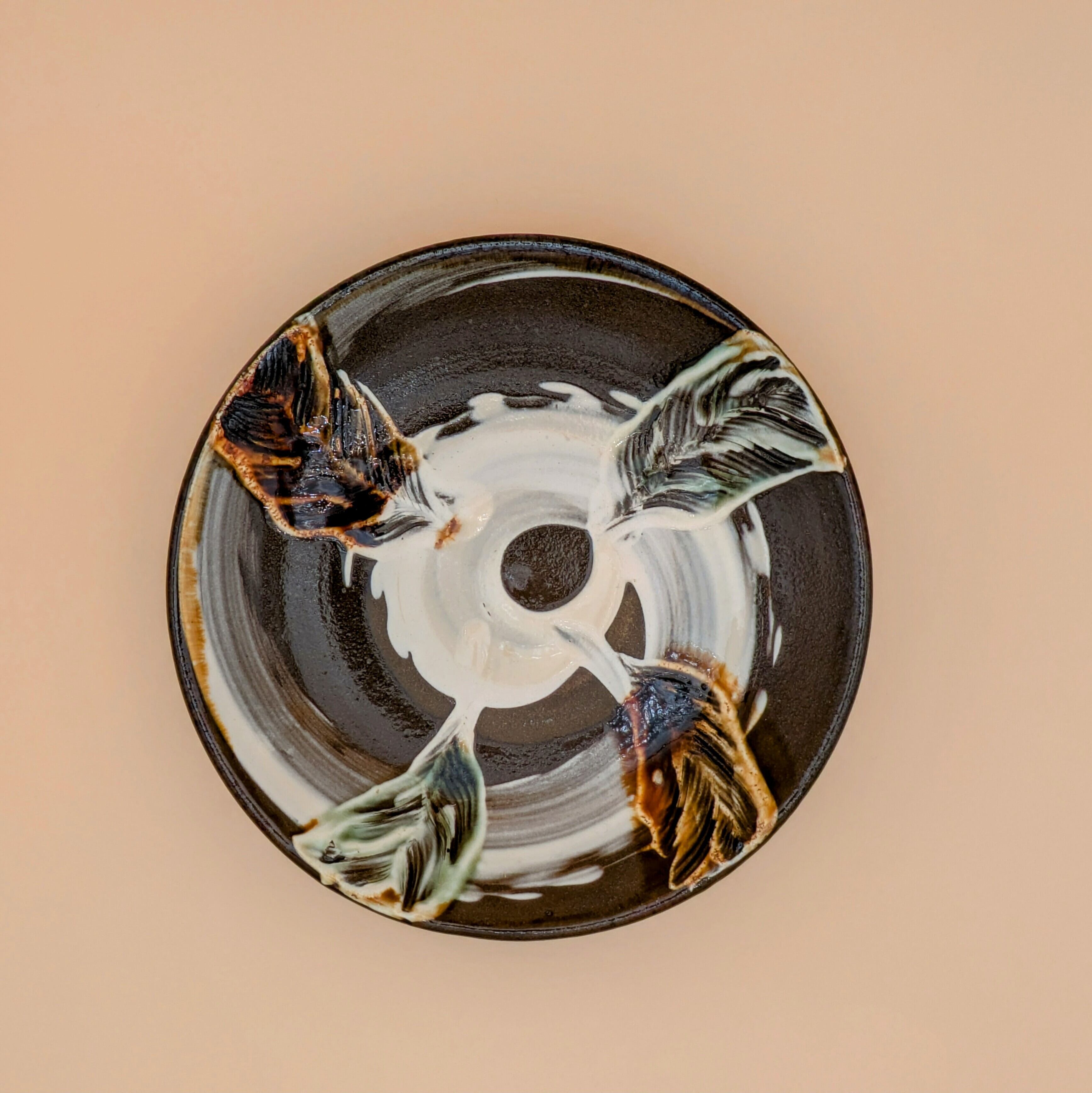 温かみと優雅さが融合した、職人の手作りによる平皿です。小鹿田焼の刷毛目と4つの葉紋様が織りなす美しいデザインは、食卓に自然の恵みと風格を添えてくれます。
