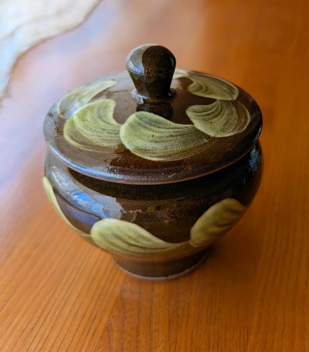 日本の伝統工芸、小鹿田焼による美しい蓋つき壺です。茶釉の深い色合いに緑色の刷毛目の独特な模様が見事に調和し、どんなインテリアにもぴったりな存在感を放ちます。大切な茶葉やスパイスを保管するのに最適で、機能性と美を兼ね備えた逸品です。