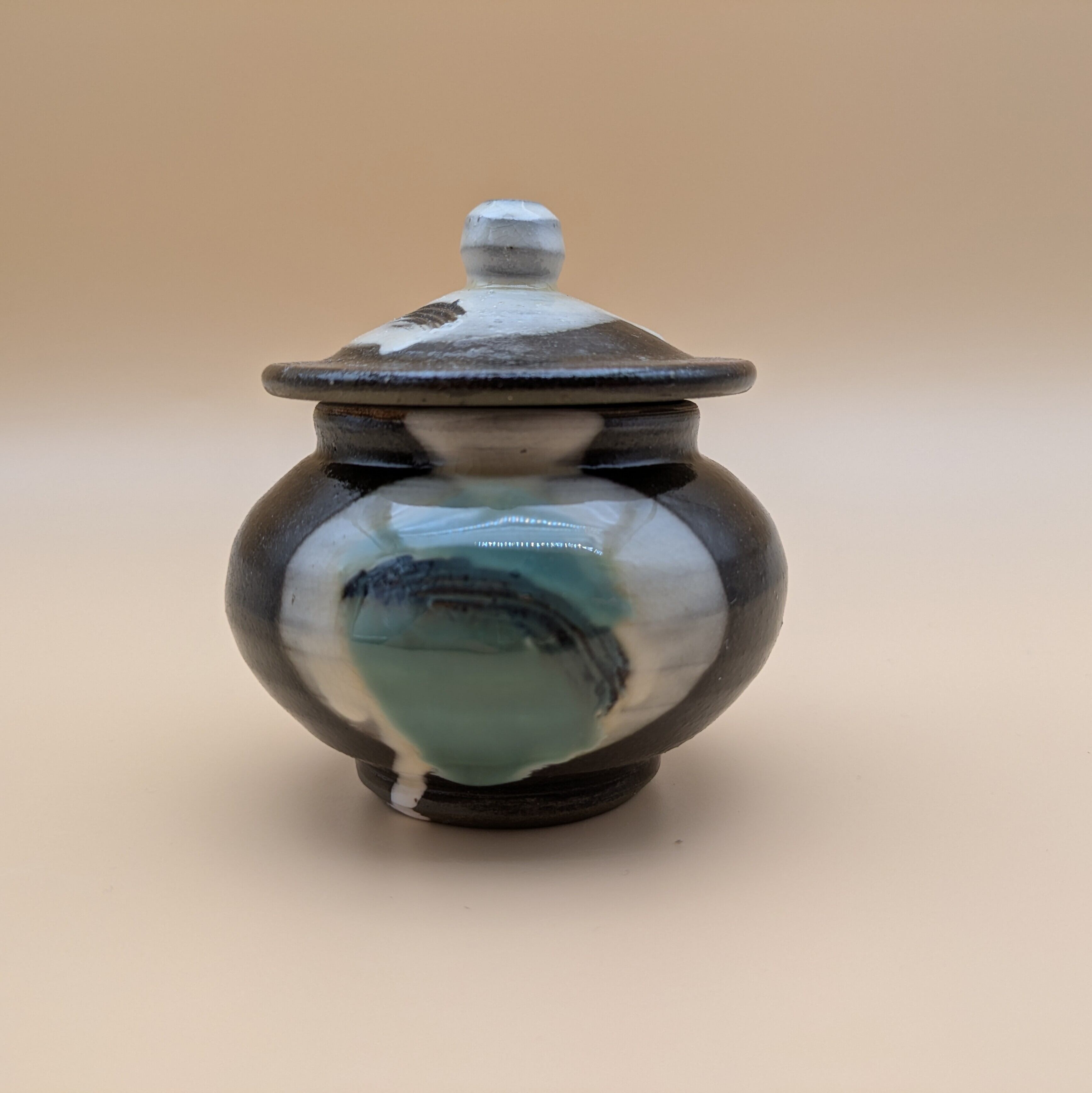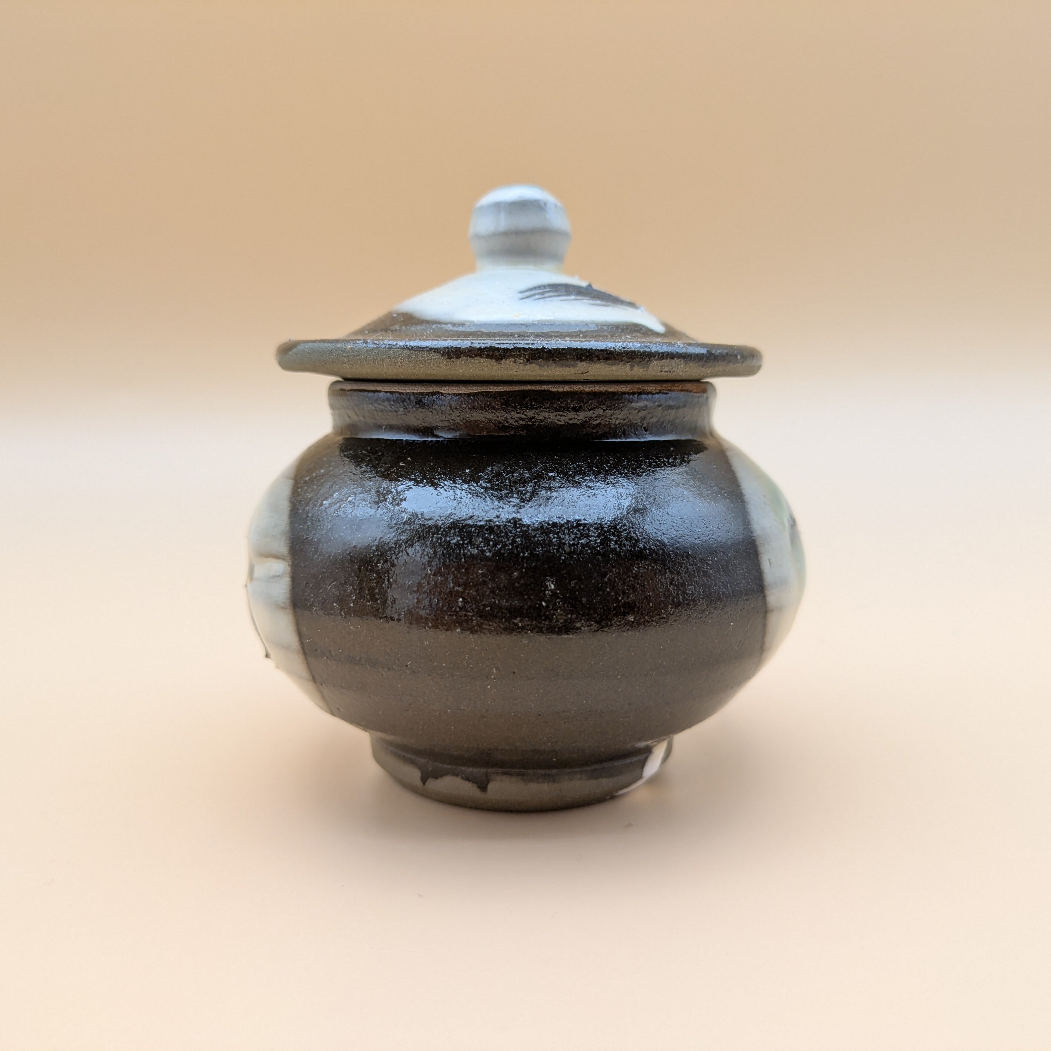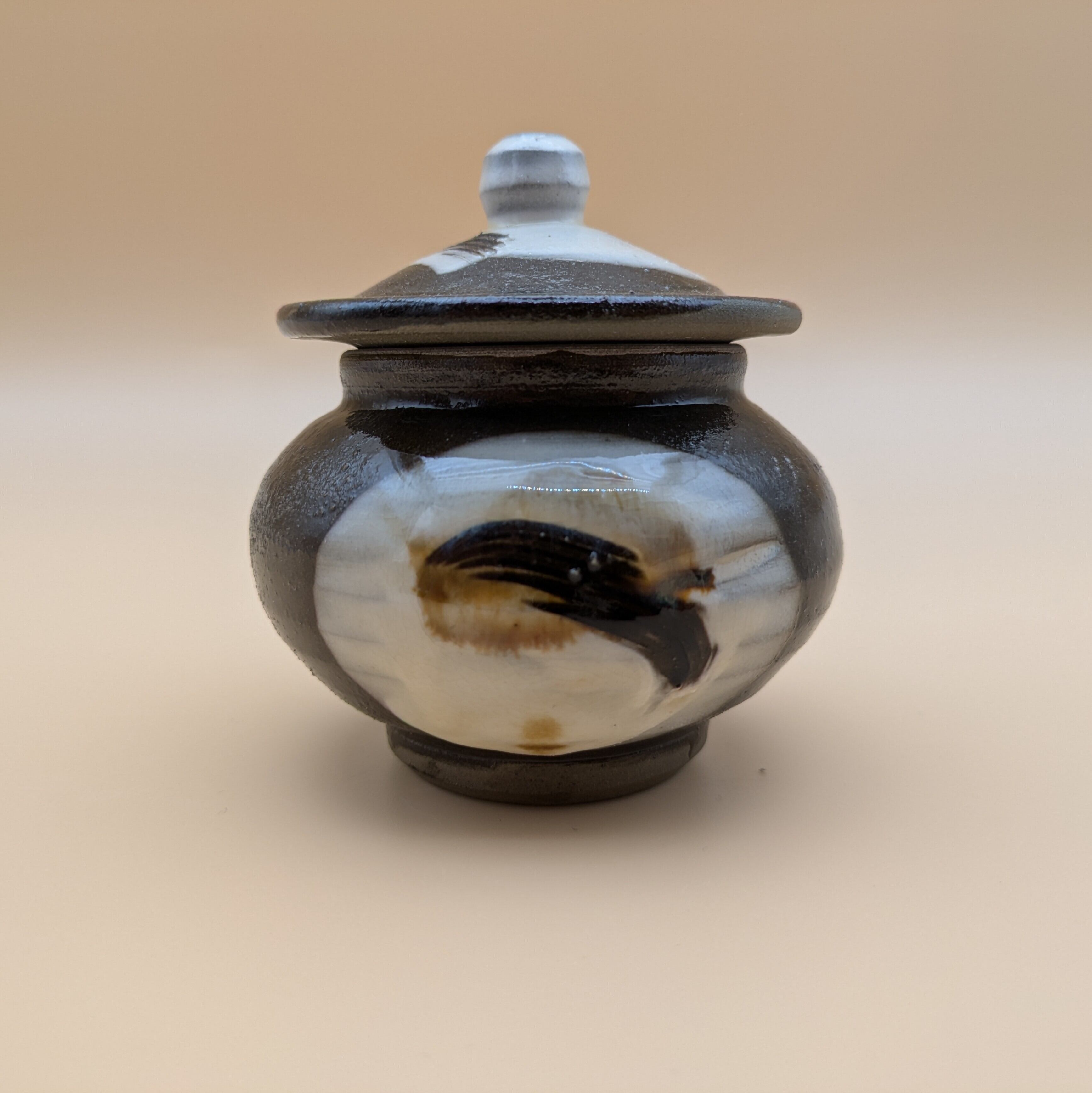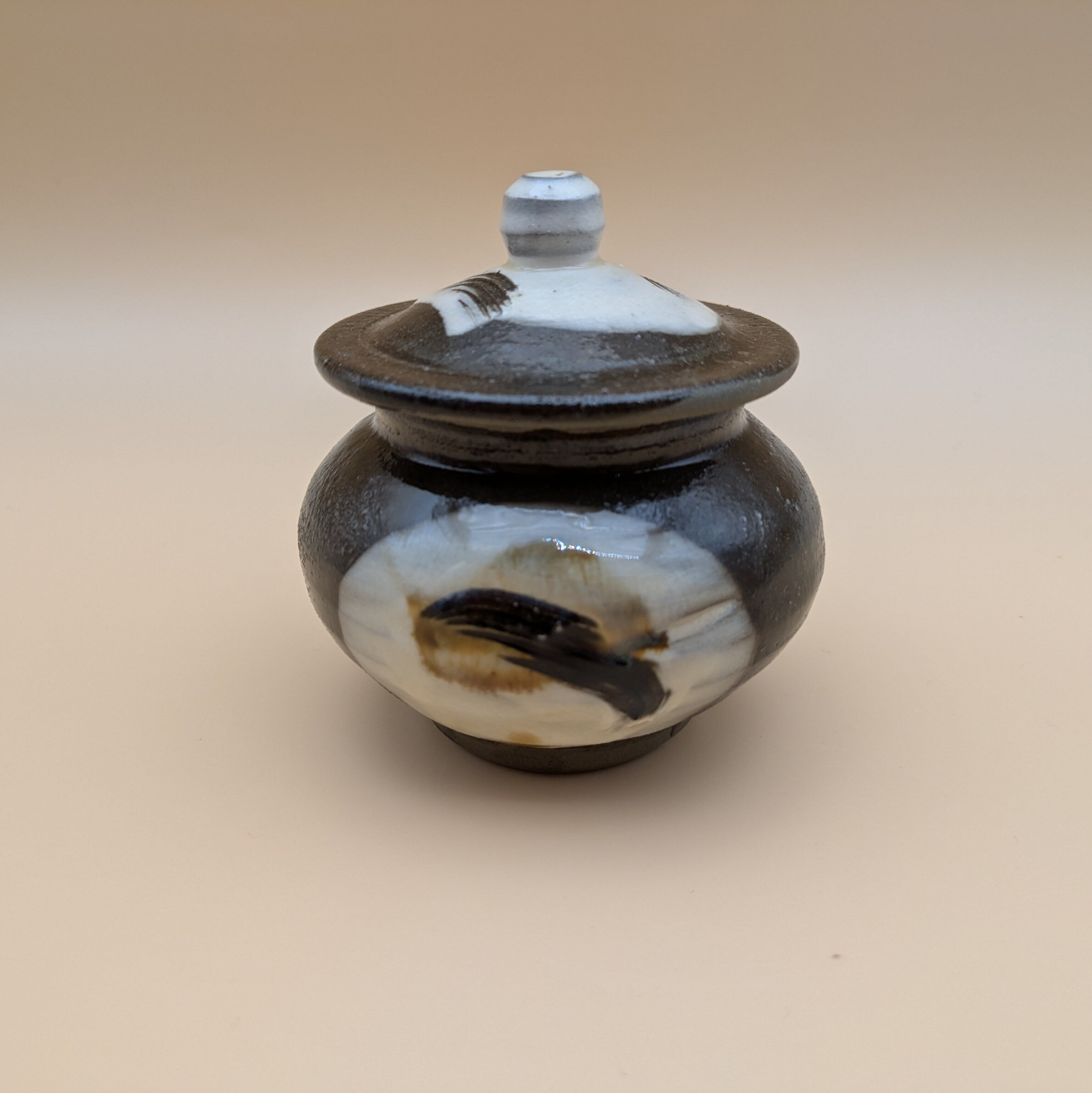 蓋つき壺 小鹿田焼(茶釉・白に黒刷毛目) 最大径8.8cm 開口部外径5.9cm内径4.8cm