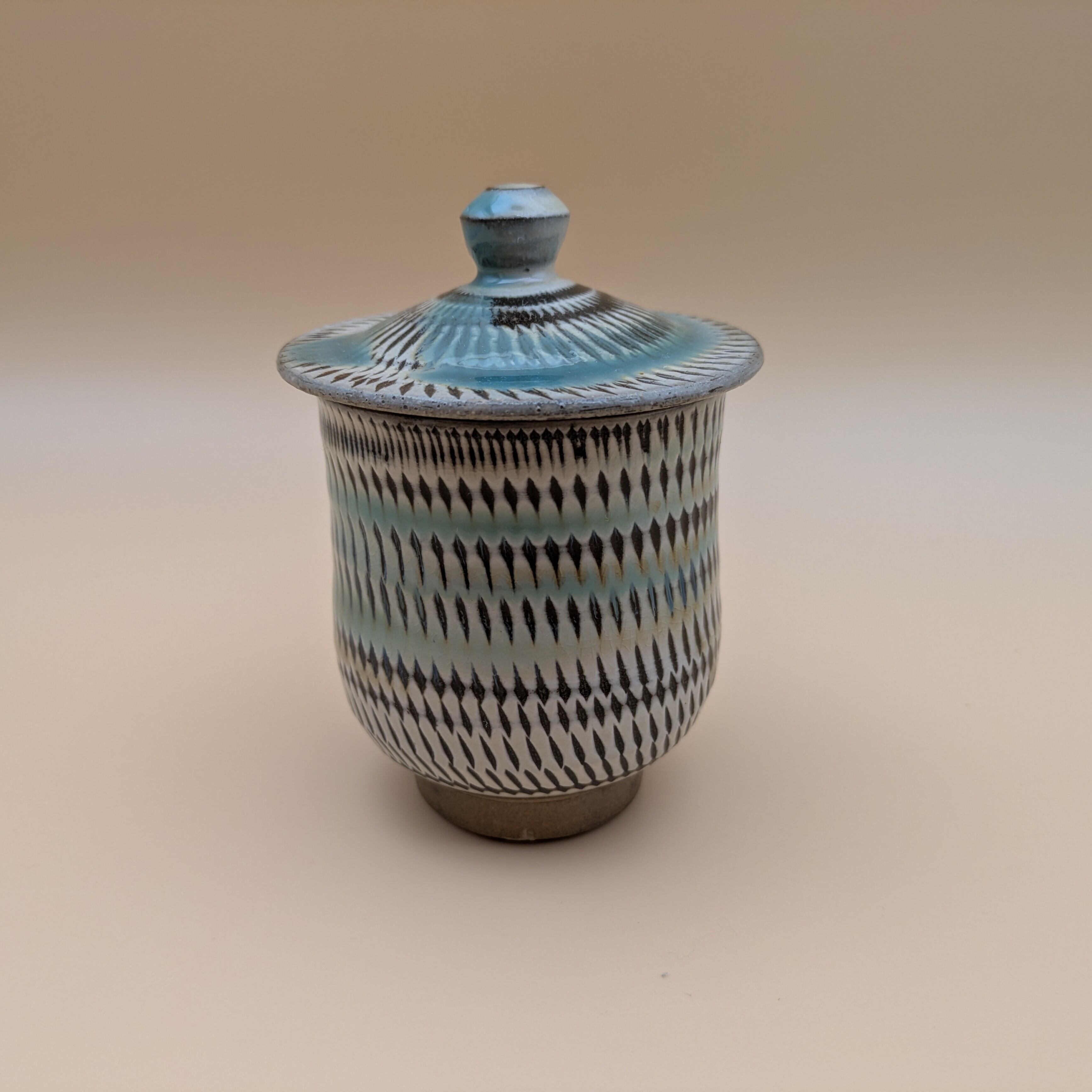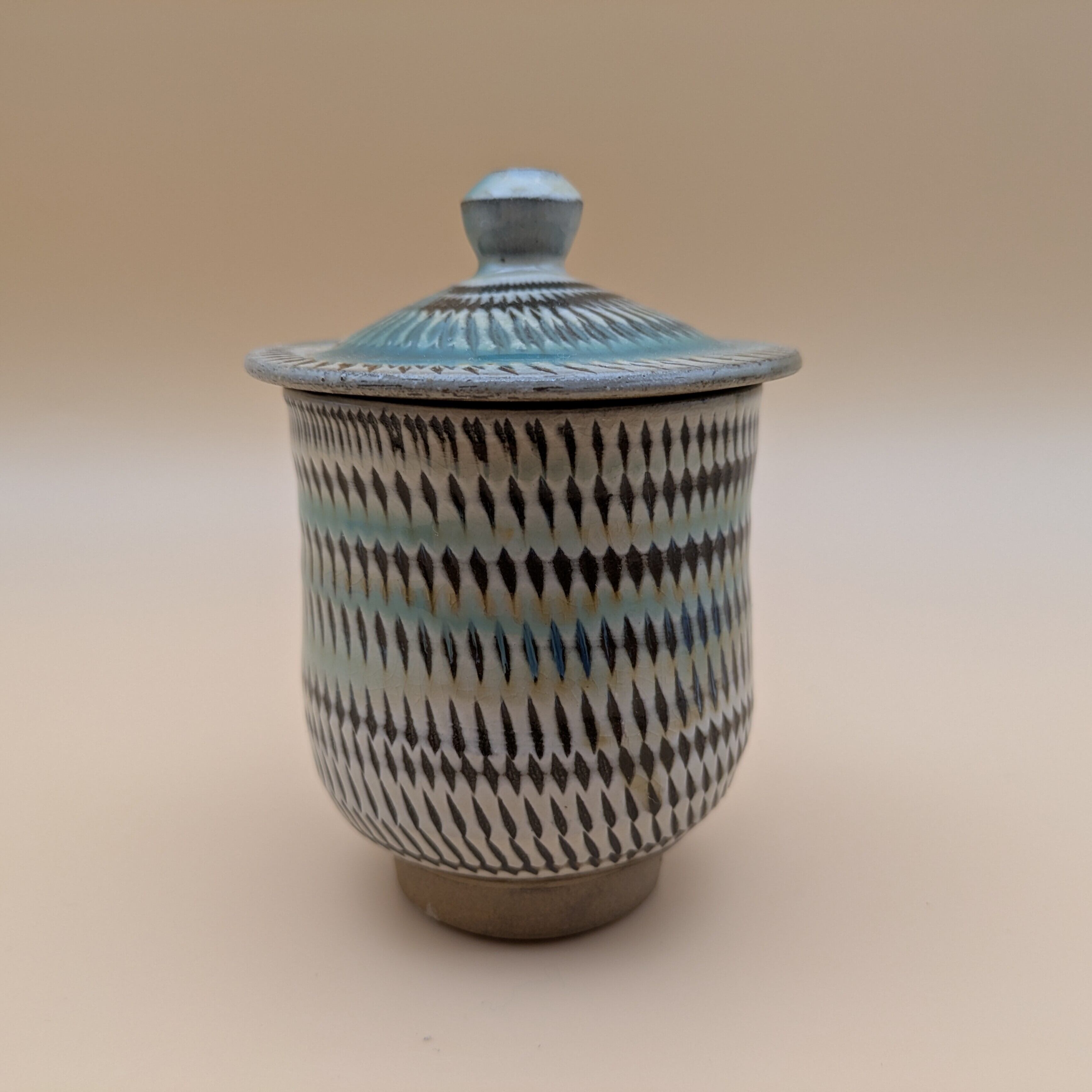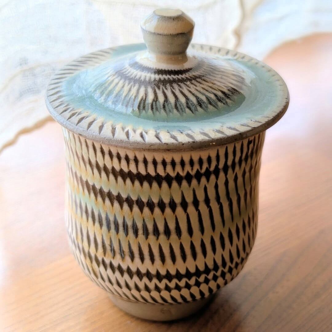 日本の伝統工芸、小鹿田焼による上品な蓋つき湯呑です。白地に施された緑釉の美しい色合いと、飛び鉋の独特なデザインが見事に調和し、どんなインテリアにも調和する魅力を放ちます。お茶の時間を特別なものにする機能性と美しさを兼ね備えた逸品です。