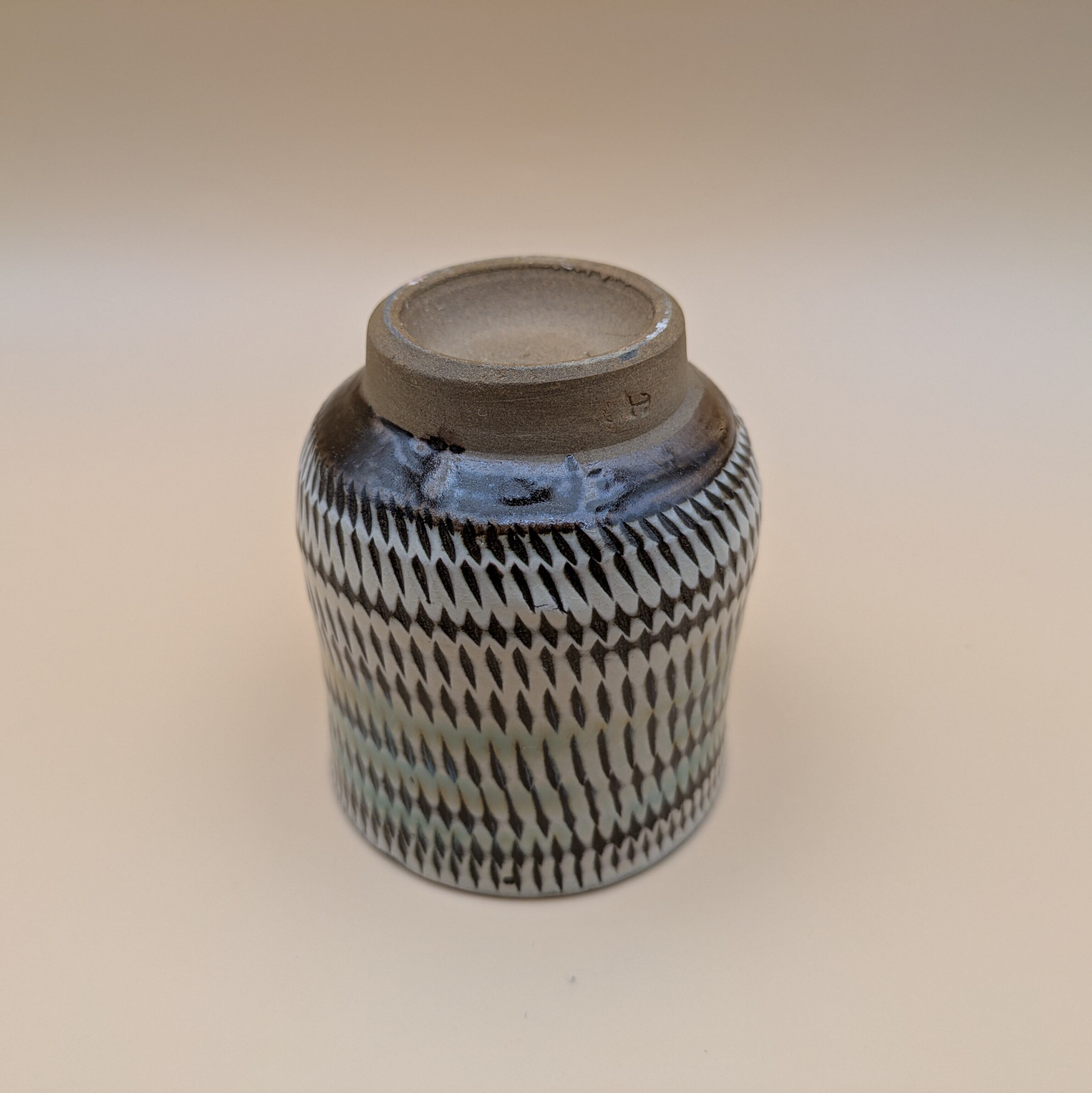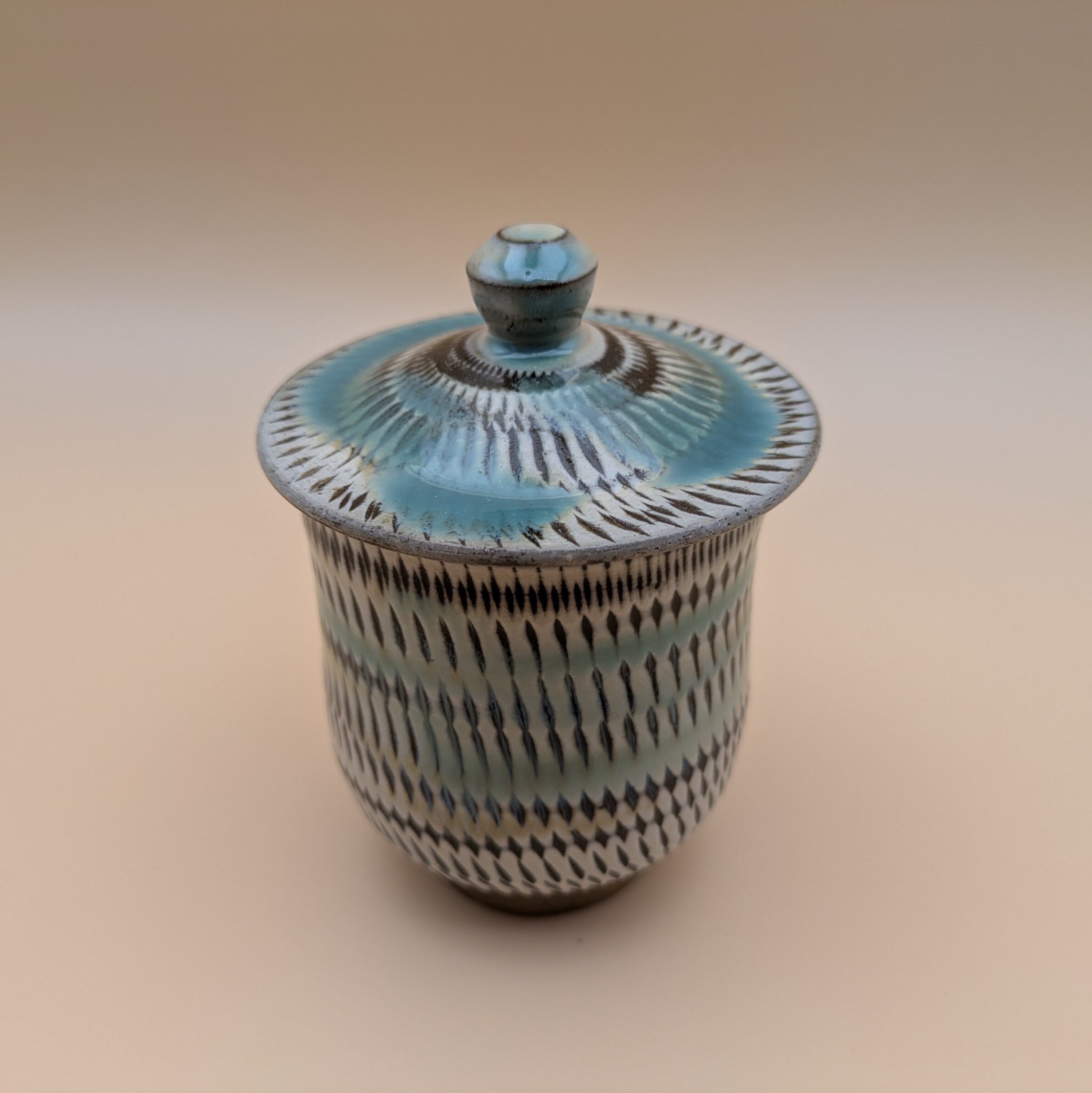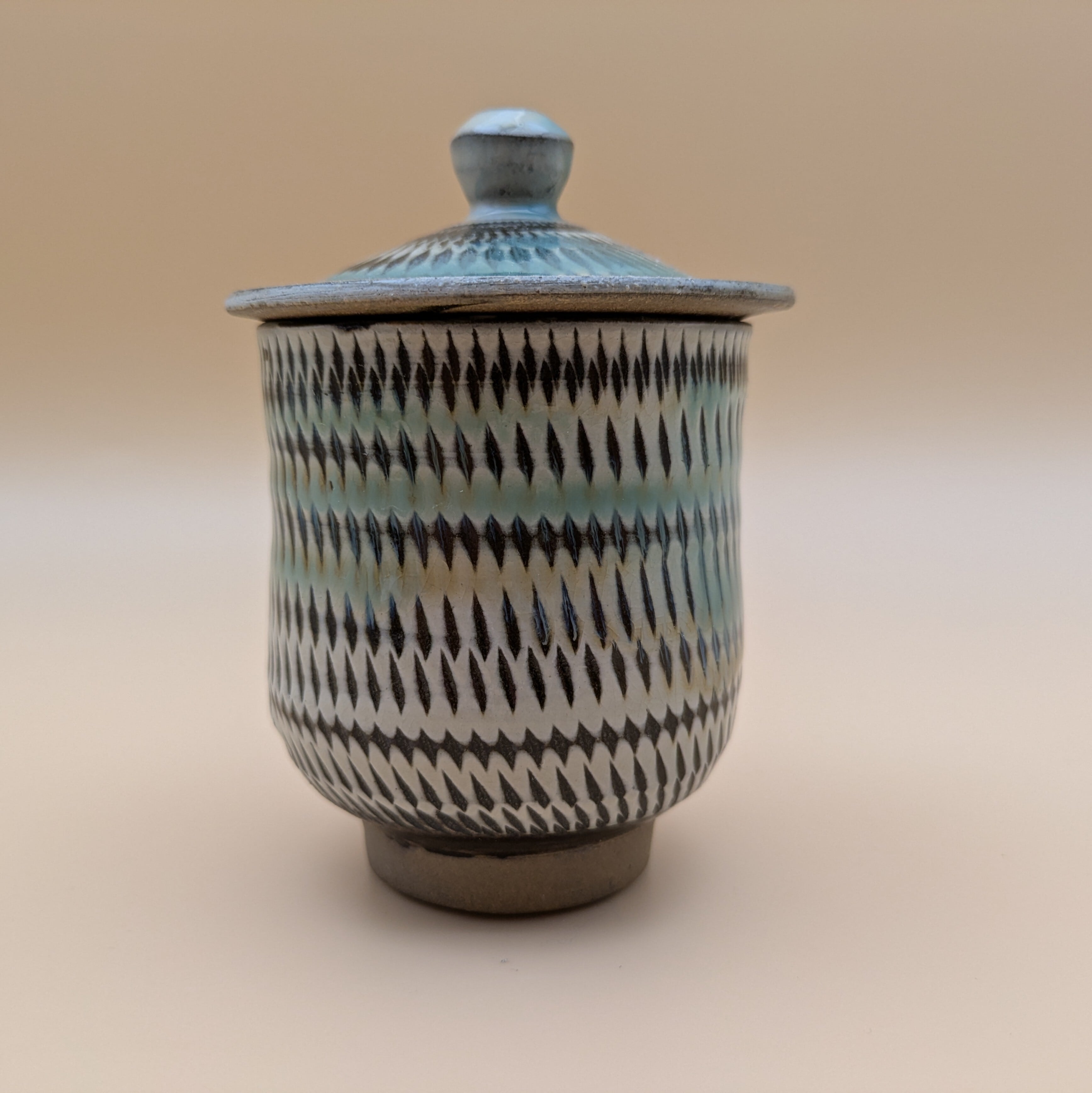 日本の伝統工芸、小鹿田焼による上品な蓋つき湯呑です。白地に施された緑釉の美しい色合いと、飛び鉋の独特なデザインが見事に調和し、どんなインテリアにも調和する魅力を放ちます。お茶の時間を特別なものにする機能性と美しさを兼ね備えた逸品です。