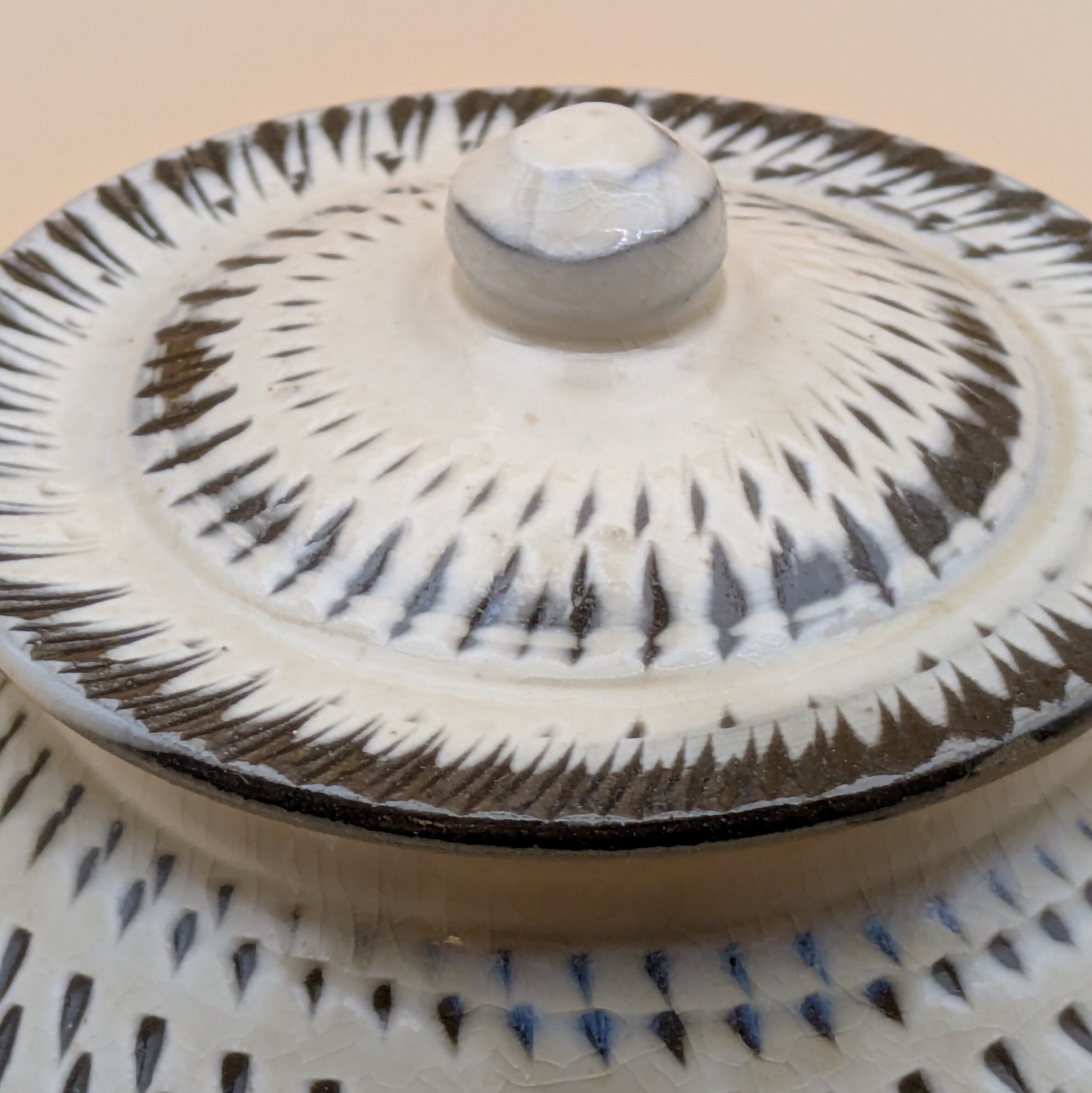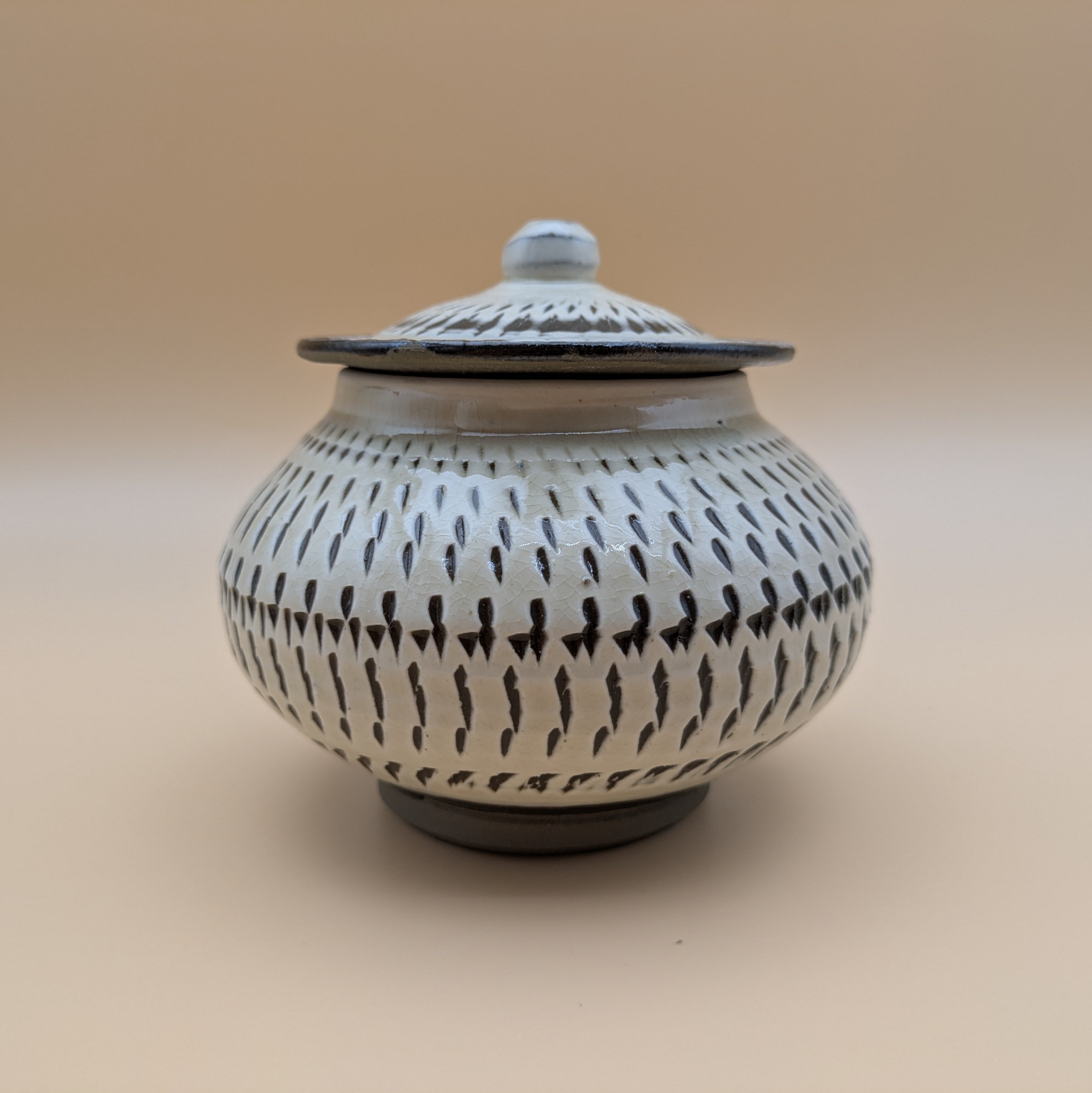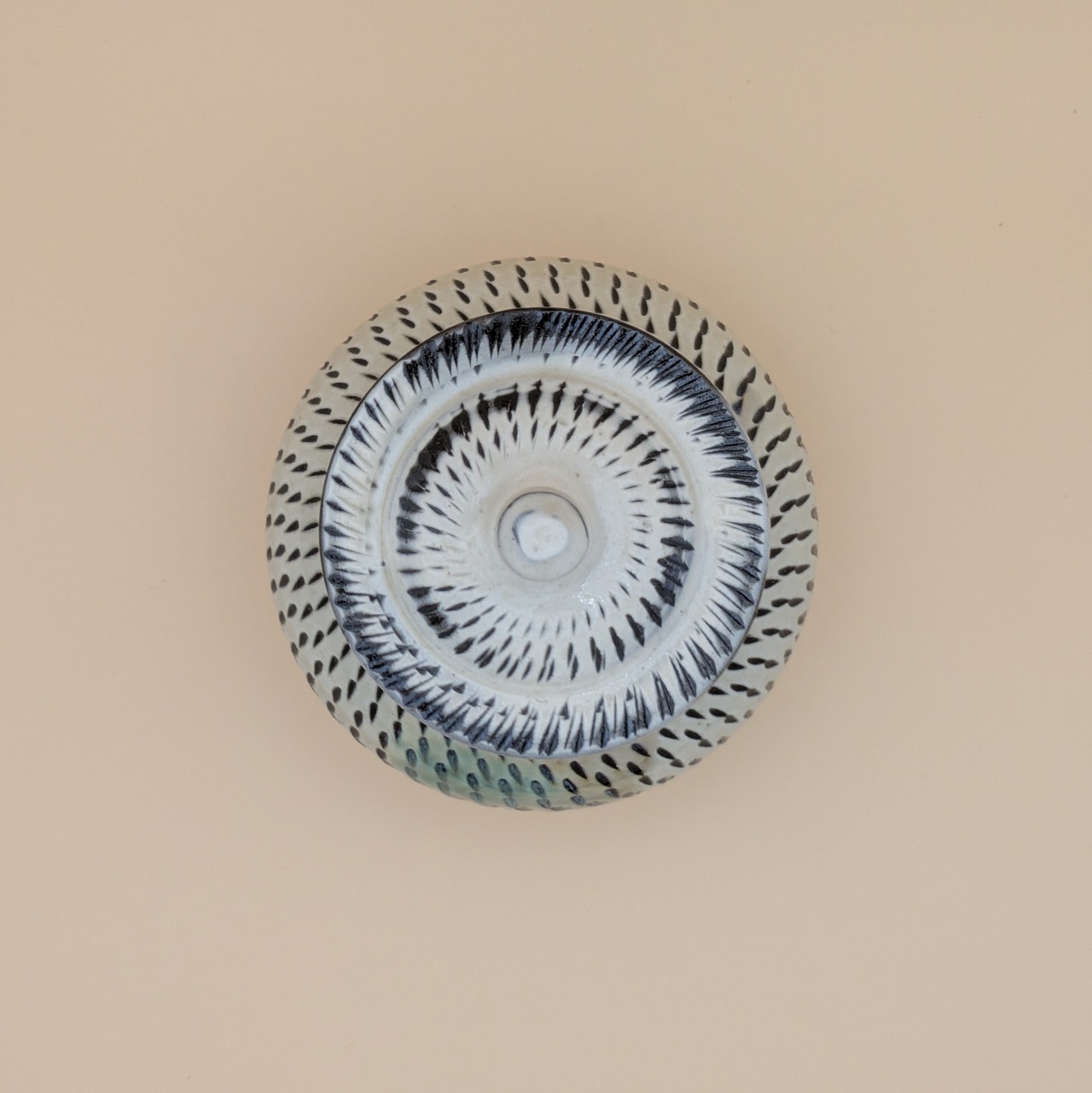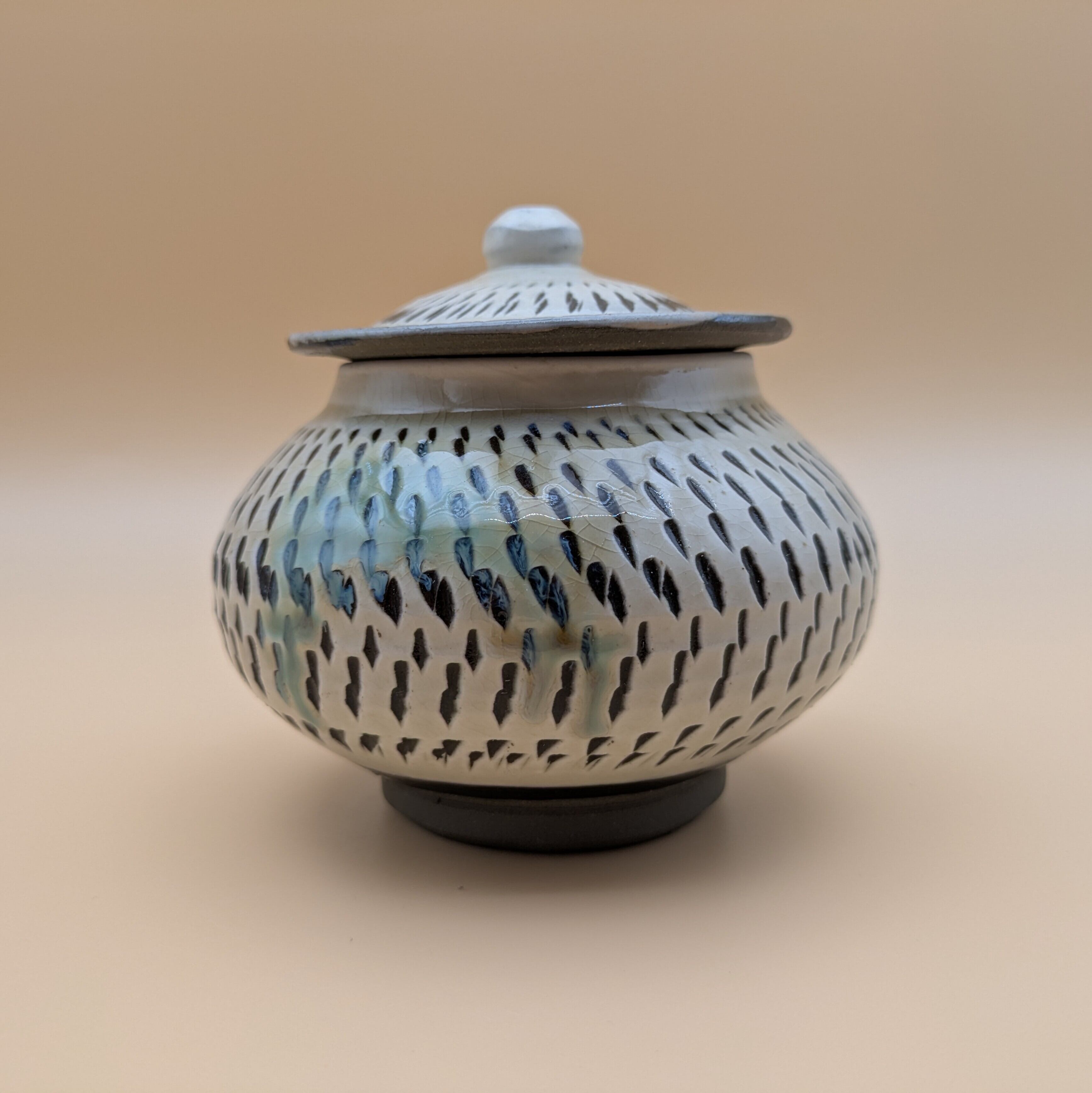 蓋つき壺 小鹿田焼(白地に緑釉・飛び鉋 大) 最大径11.5cm 開口部外径7.5cm内径6cm