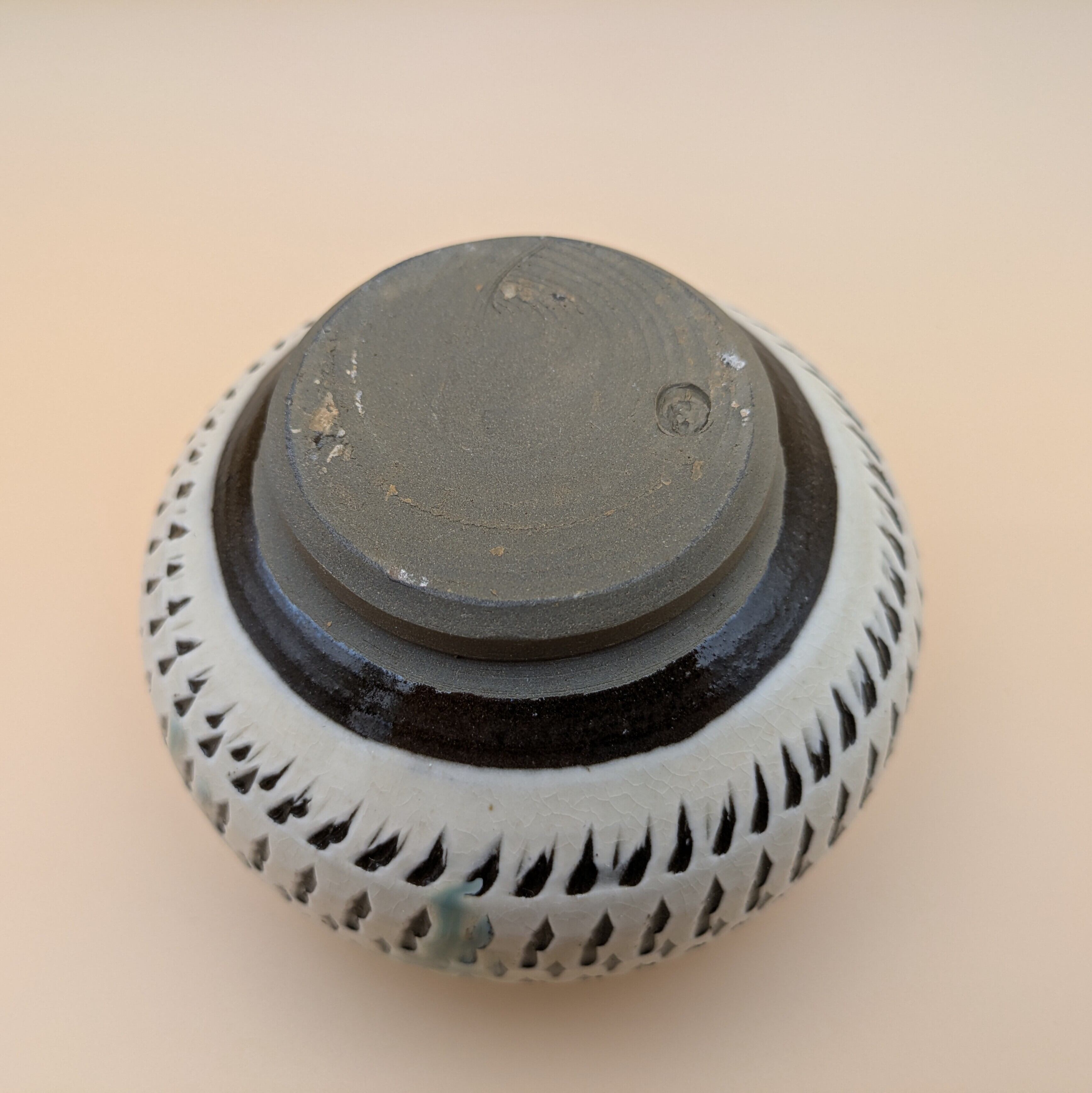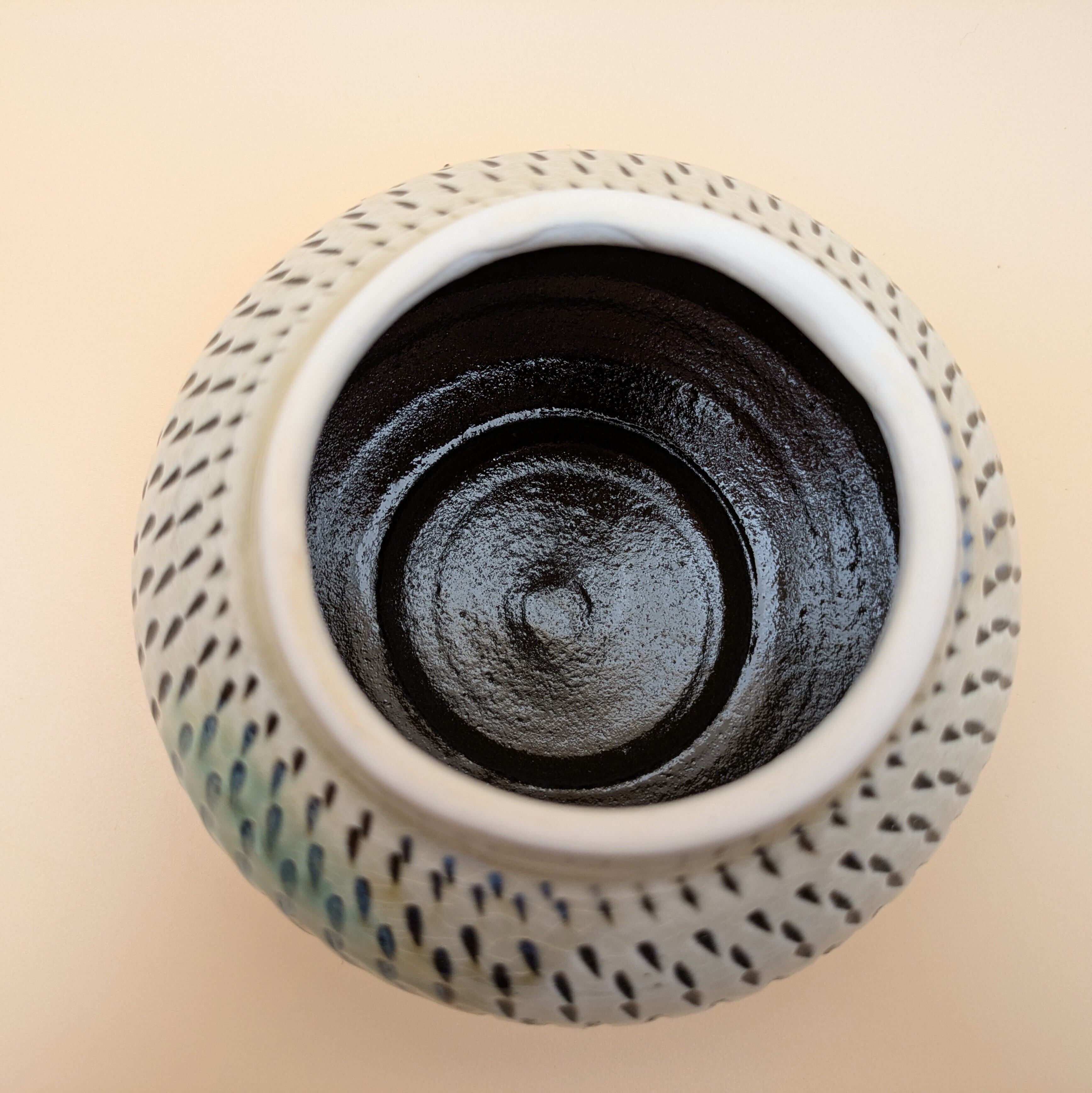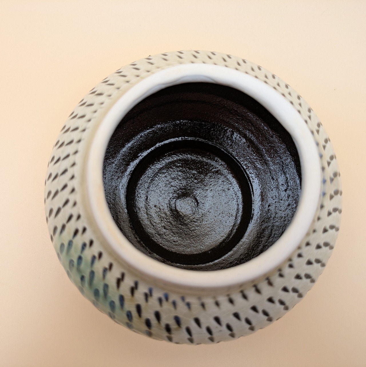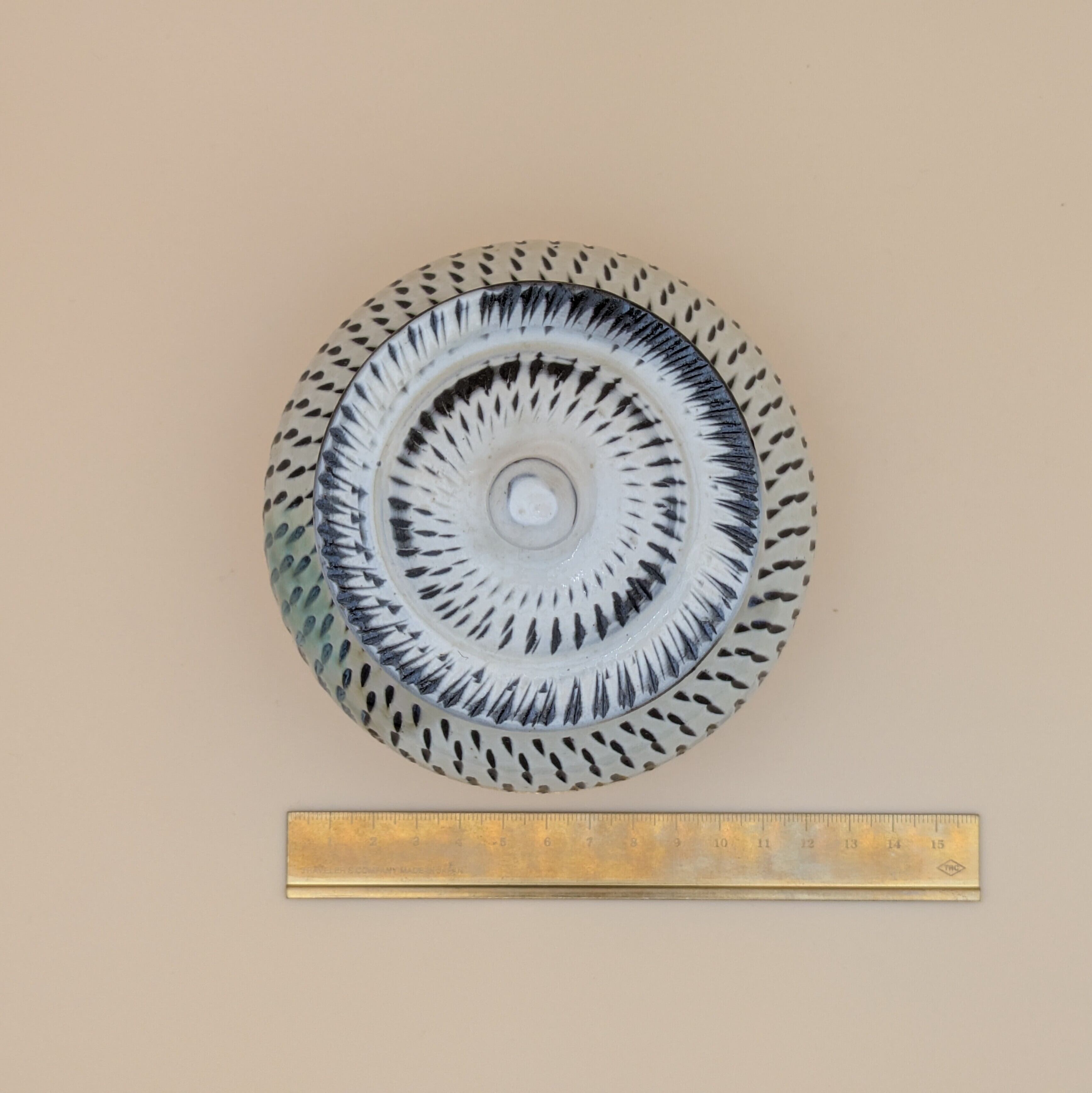 蓋つき壺 小鹿田焼(白地に緑釉・飛び鉋 大) 最大径11.5cm 開口部外径7.5cm内径6cm