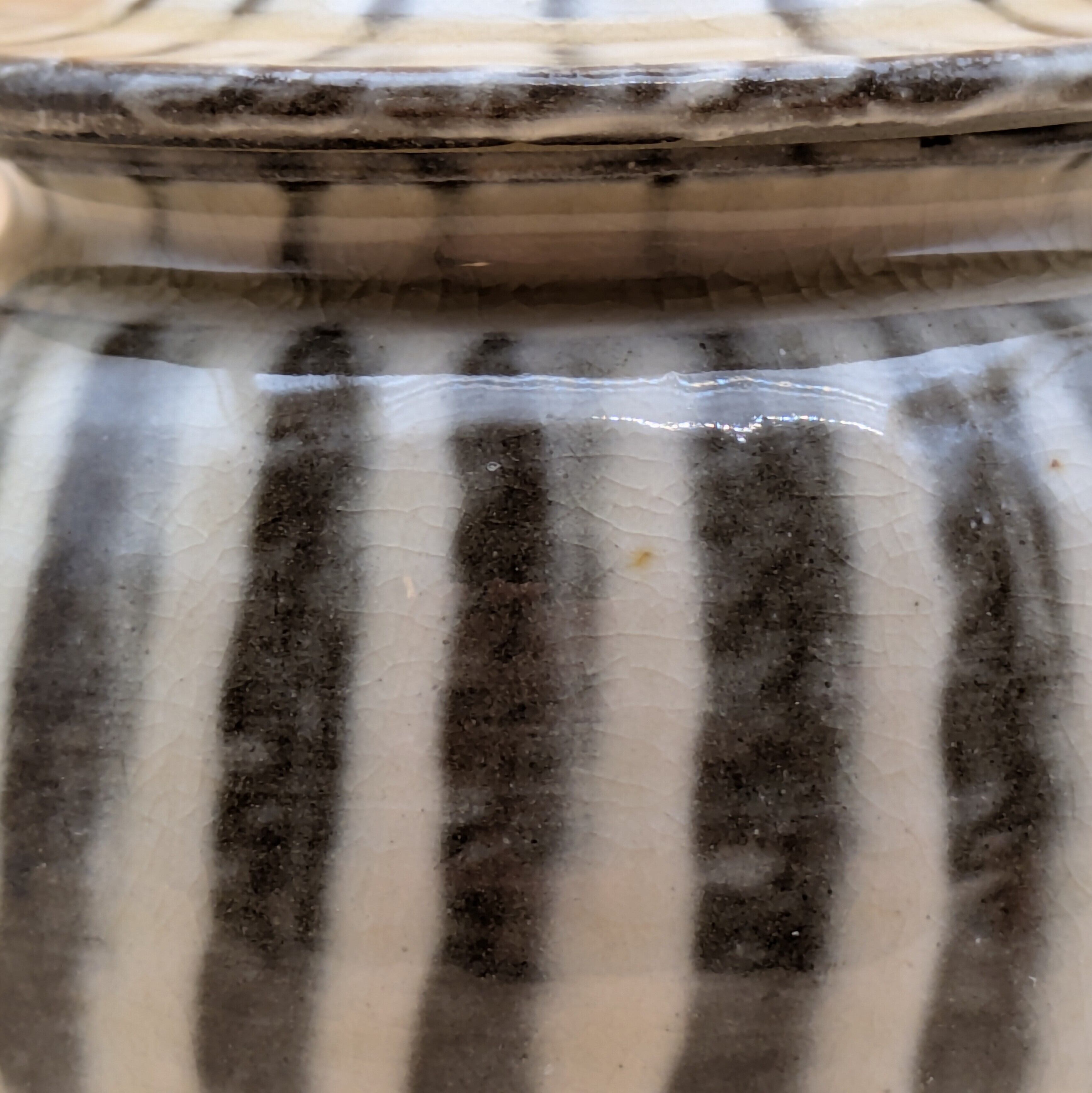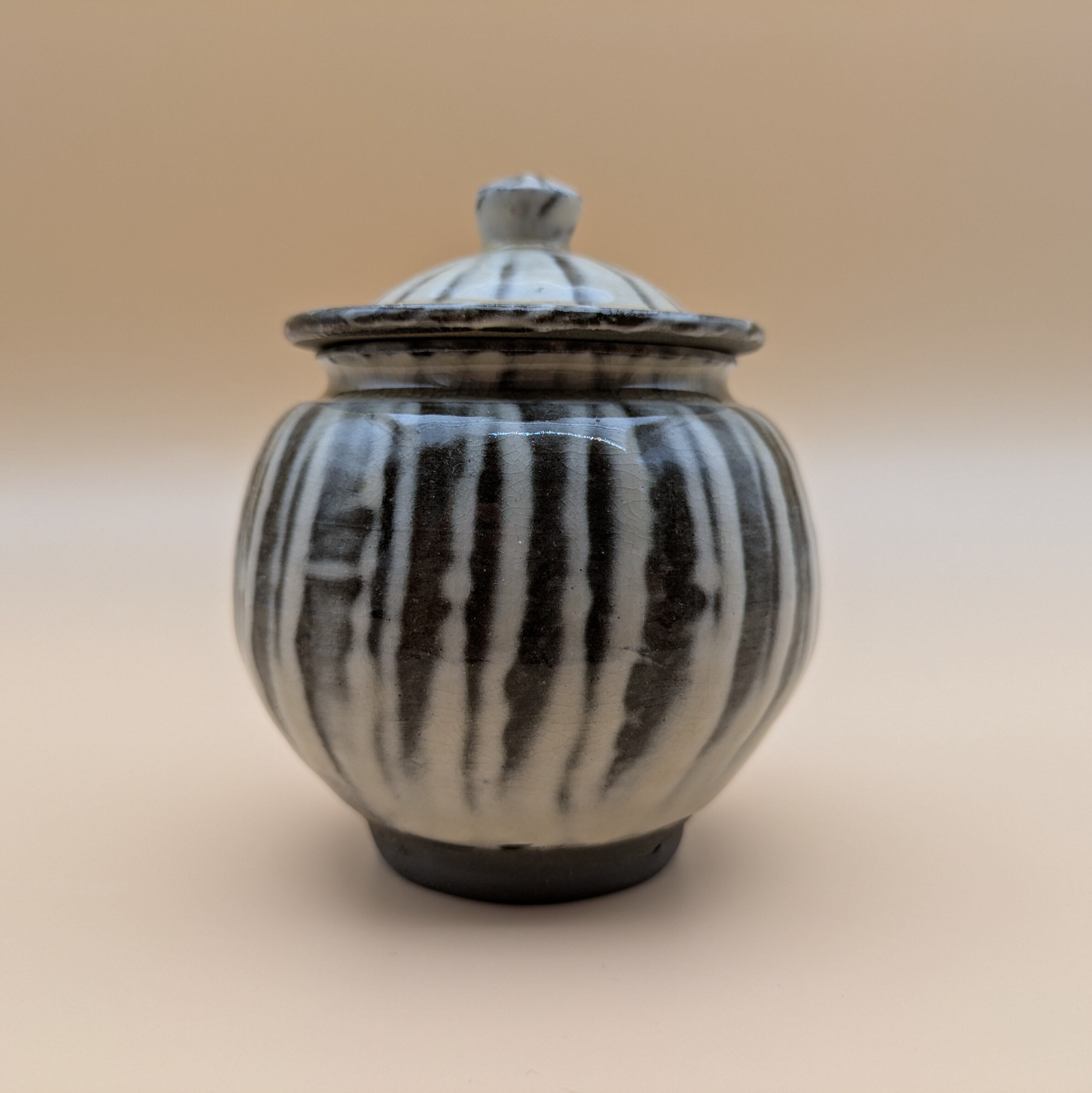 小鹿田焼の伝統的な技法と美しさを堪能できる、蓋つきの壺です。職人が手作りした丁寧な仕上がりと、白釉流し掛けが特徴です。