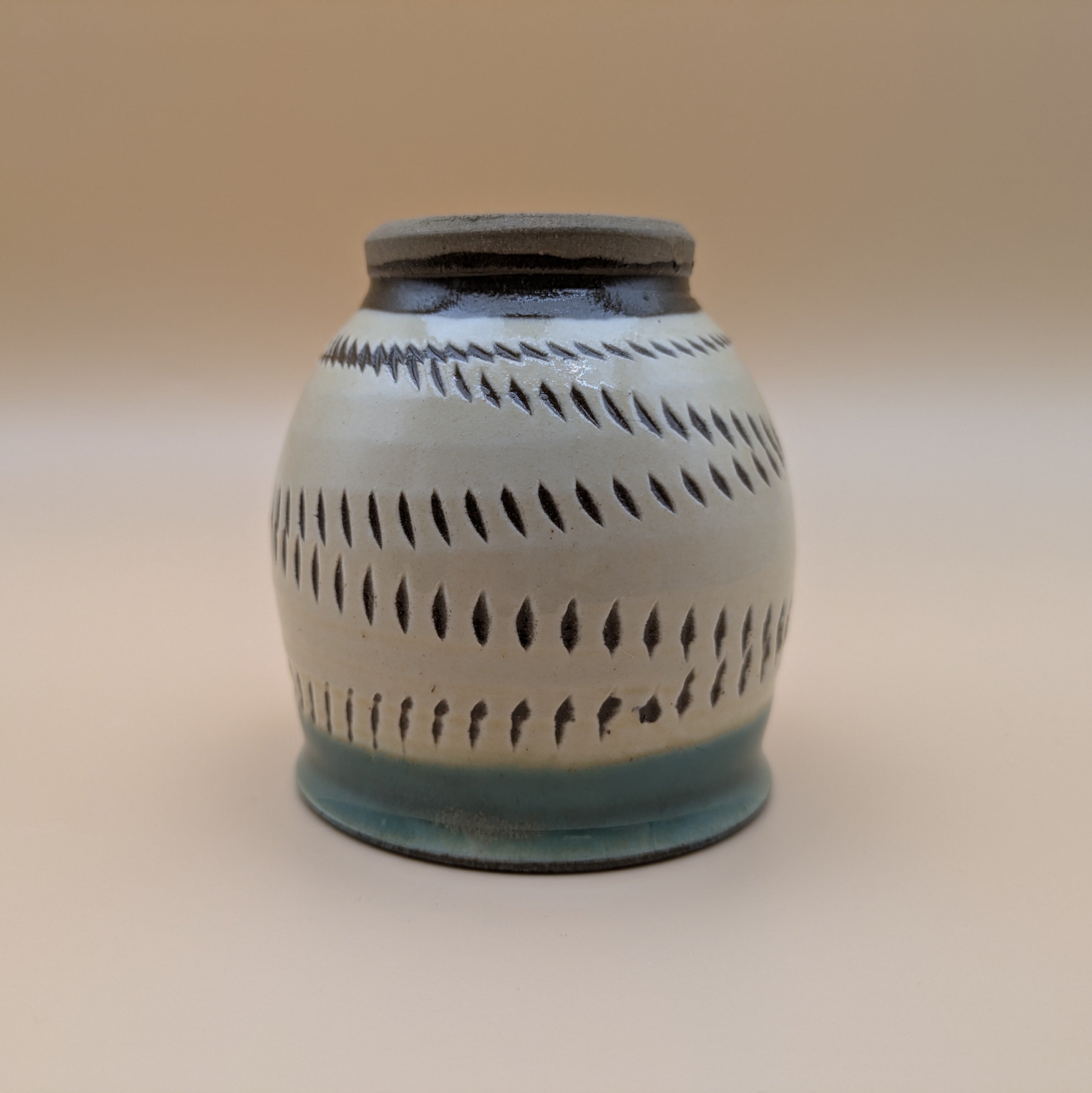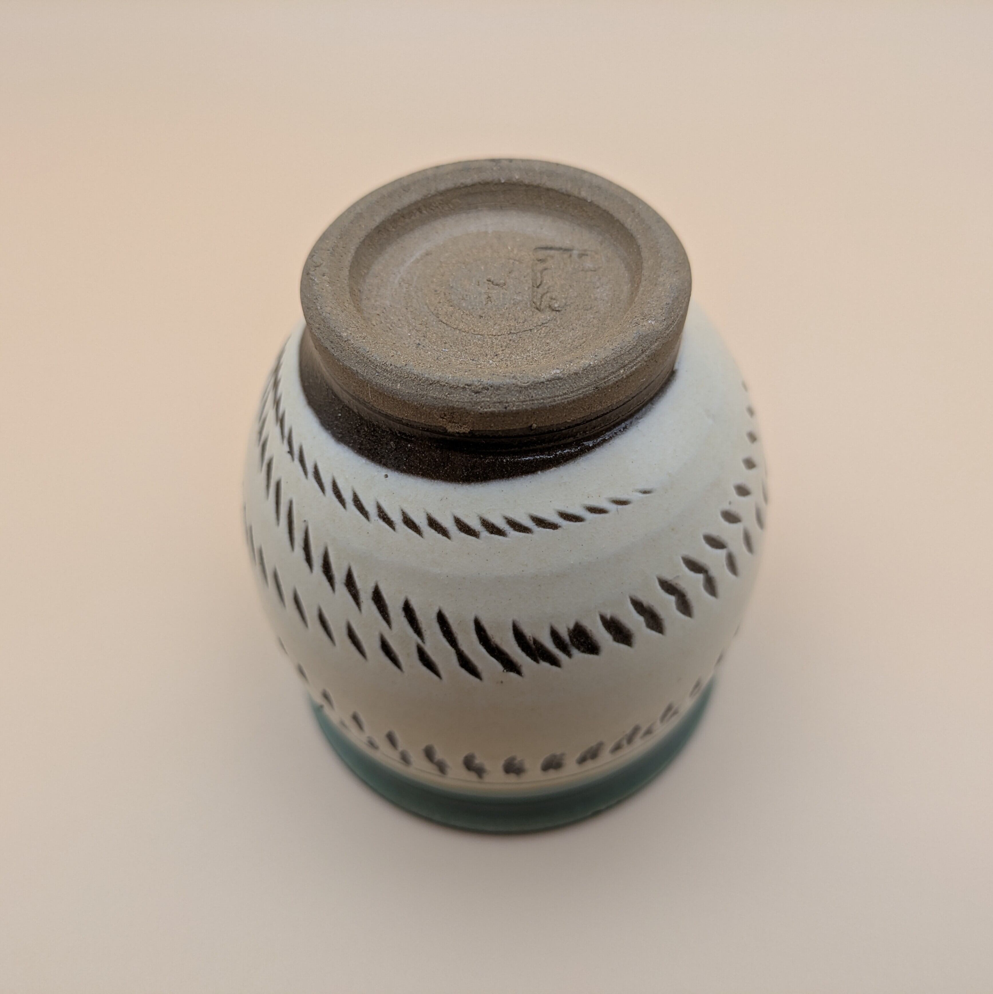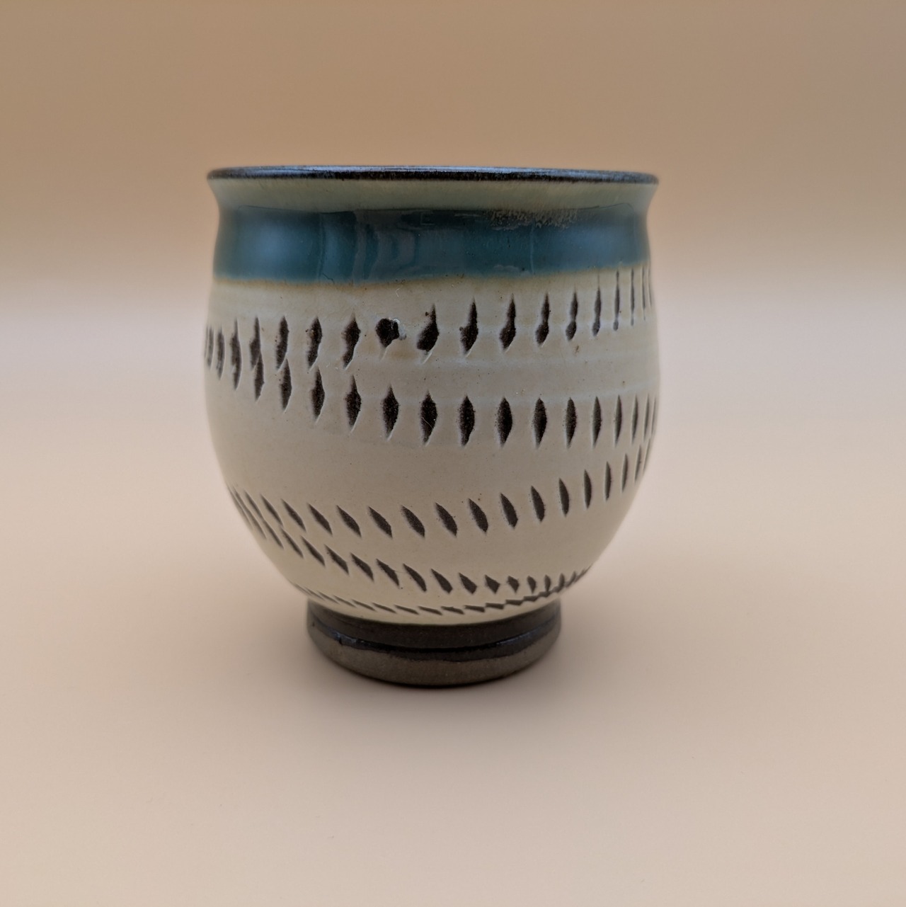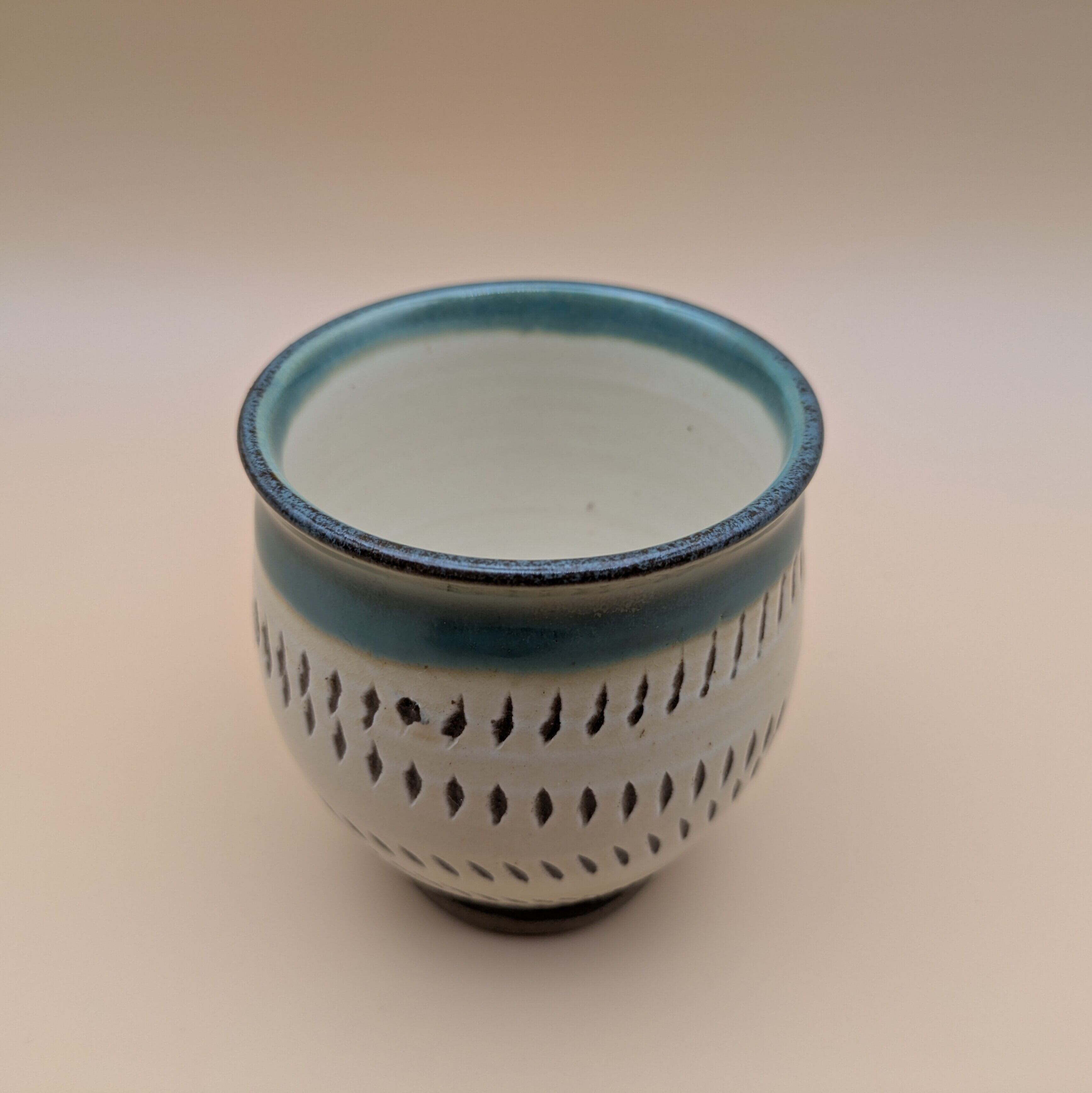 日本の伝統工芸、小鹿田焼による美しい湯呑です。白地の縁に施された緑釉と暴れ鉋の独特なデザインが、シンプルながらも温かみのある雰囲気を演出し、毎日のティータイムをより豊かに彩ります。香り高いお茶を楽しむための大切な一品として、ぜひお役立てください。