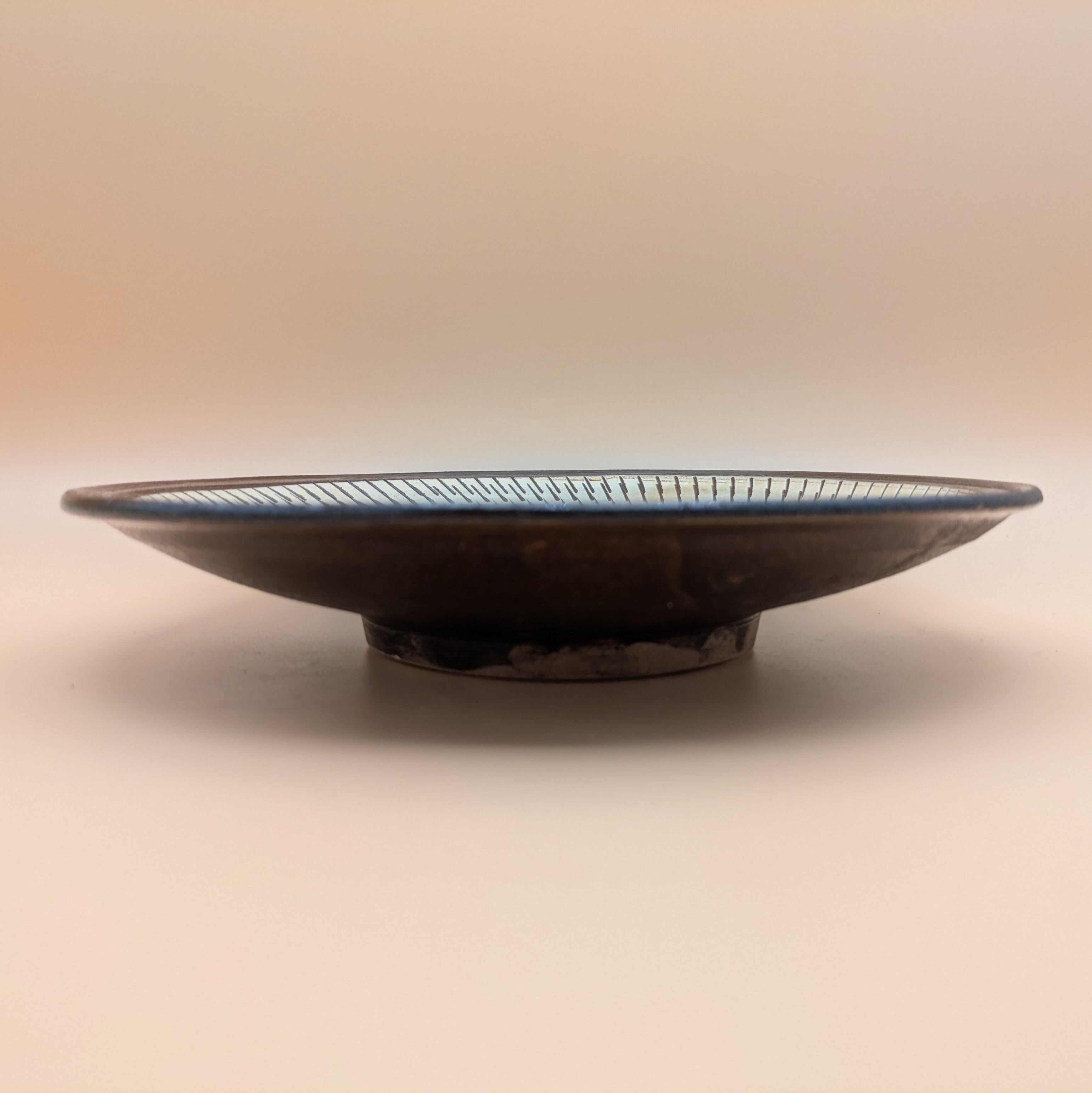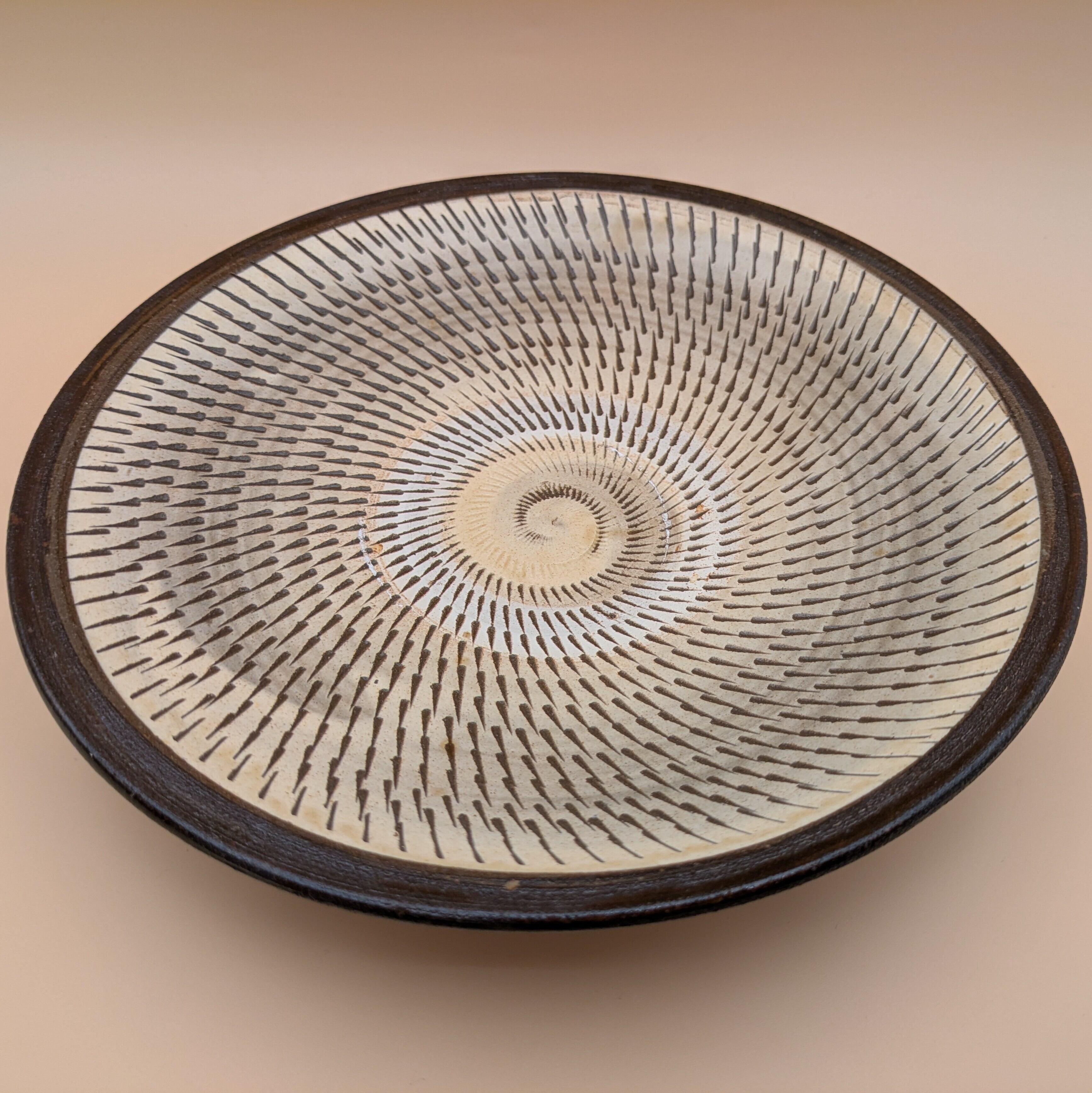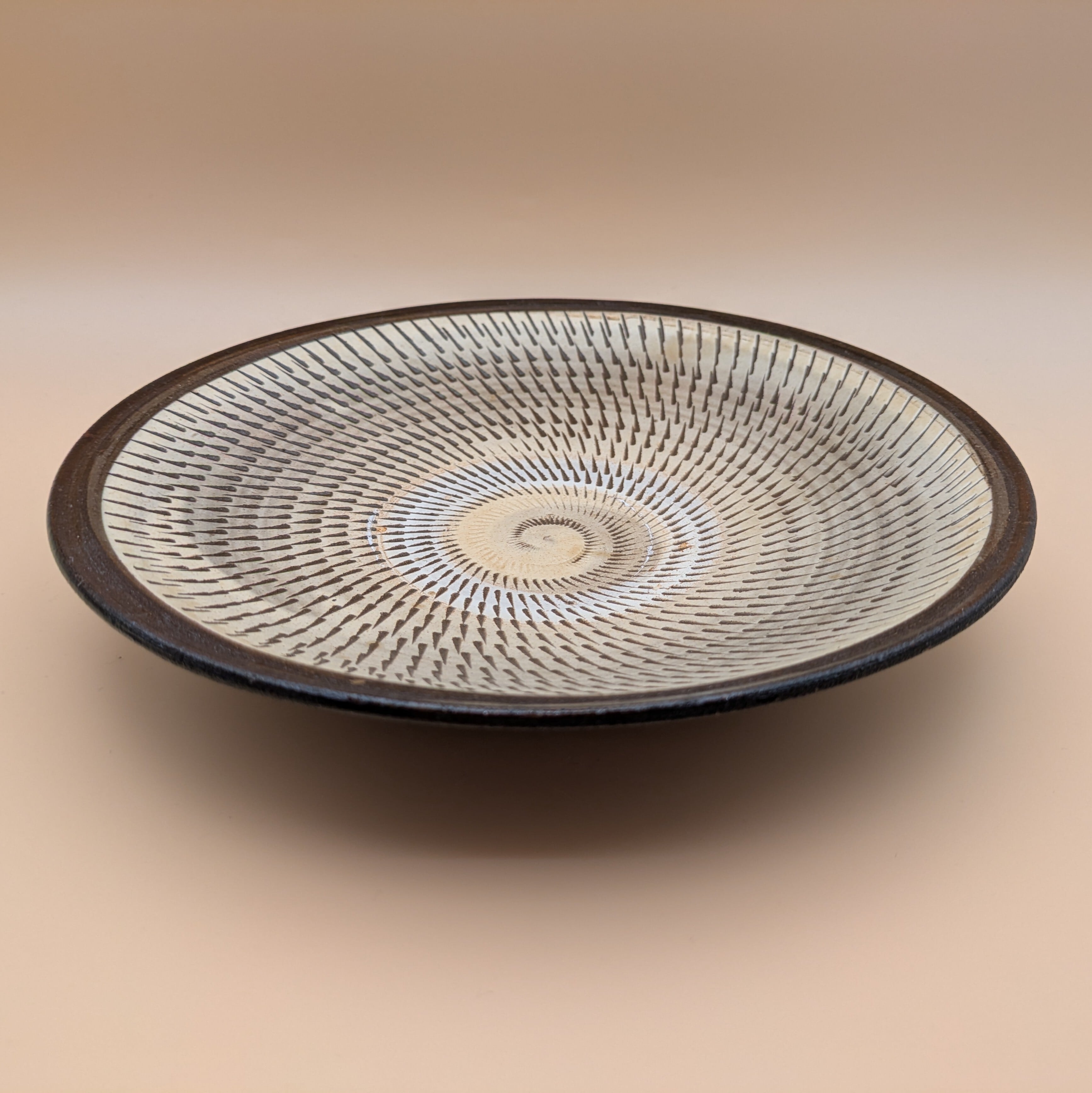 日本の伝統工芸、小鹿田焼による美しい盛皿です。穏やかな白釉に施された茶縁と飛び鉋の技法が生み出す魅力的なデザインが、あなたの食卓に存在感を与えます。料理を盛り付けるのに最適な逸品です。