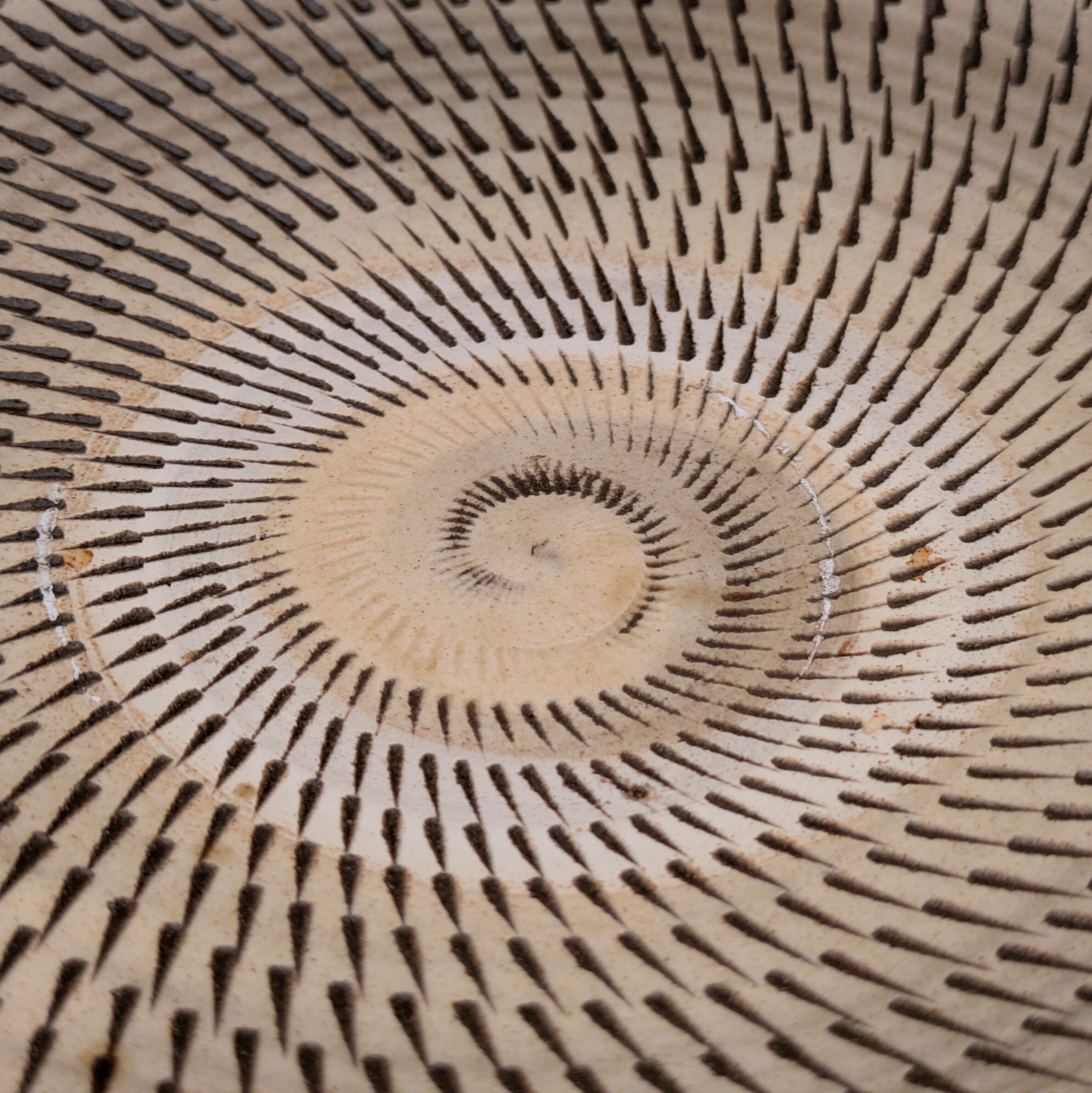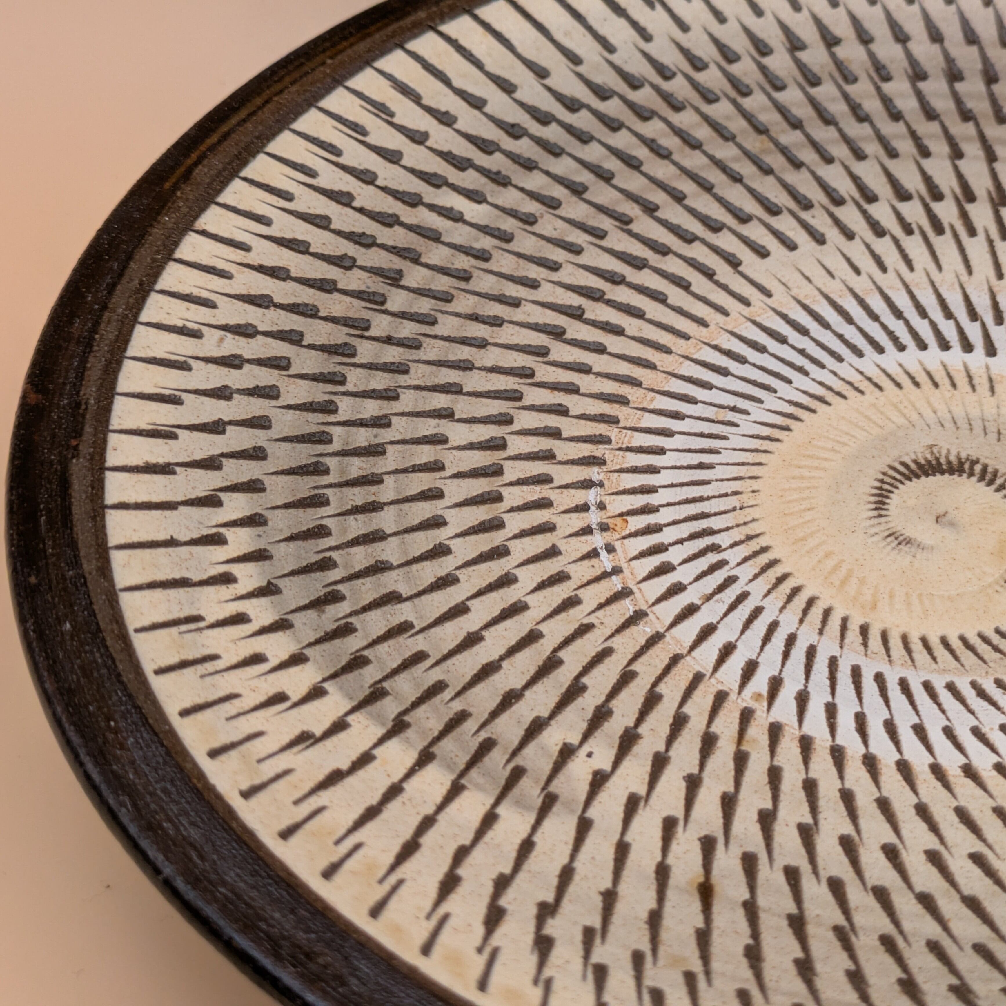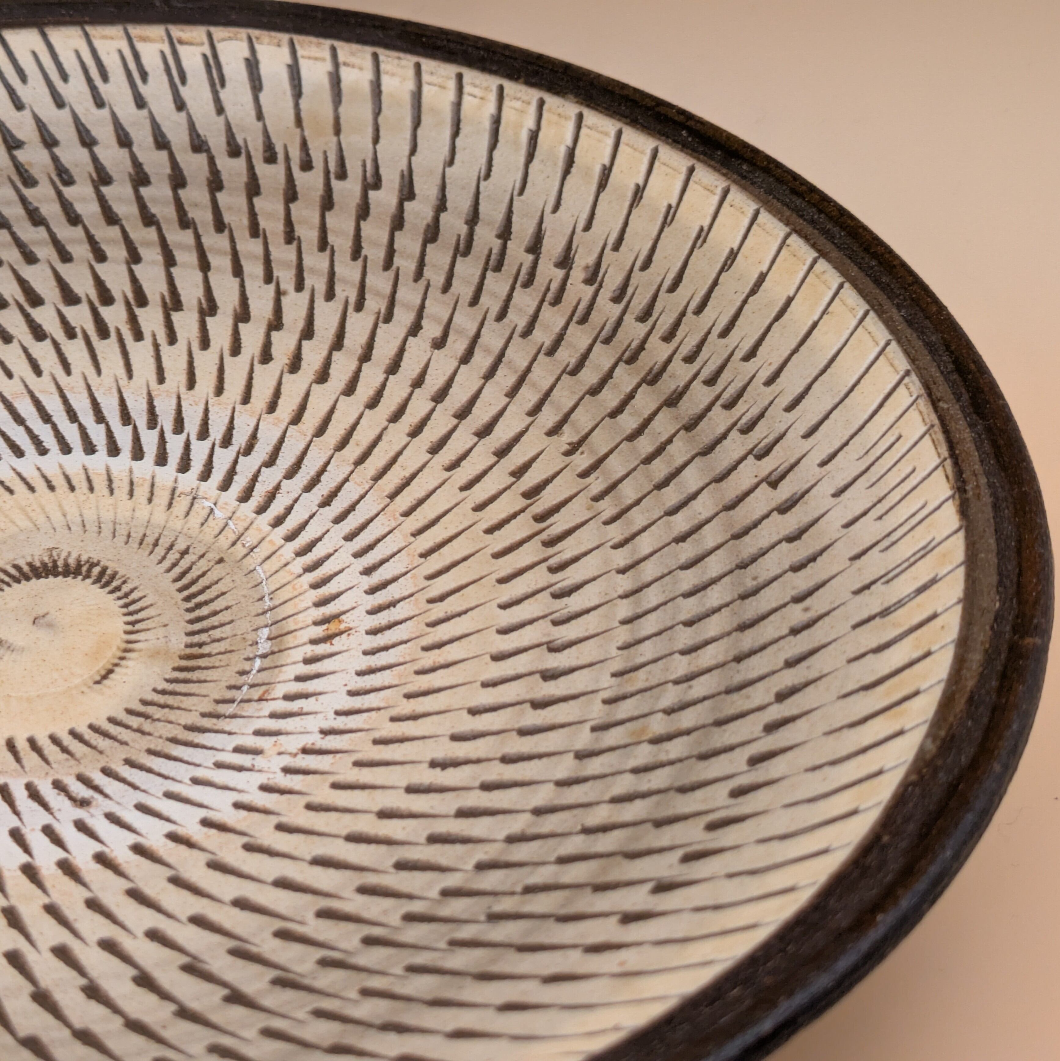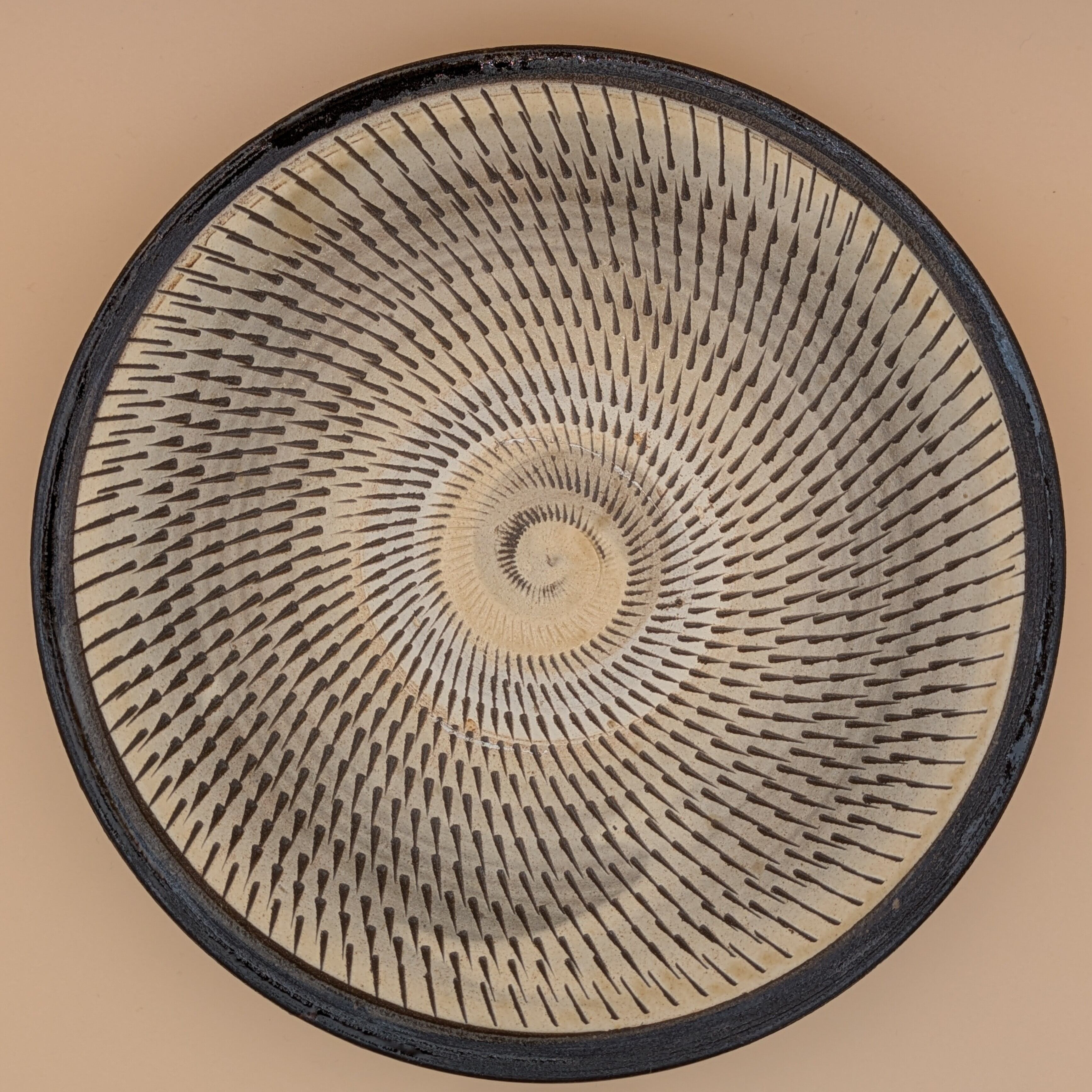 日本の伝統工芸、小鹿田焼による美しい盛皿です。穏やかな白釉に施された茶縁と飛び鉋の技法が生み出す魅力的なデザインが、あなたの食卓に存在感を与えます。料理を盛り付けるのに最適な逸品です。
