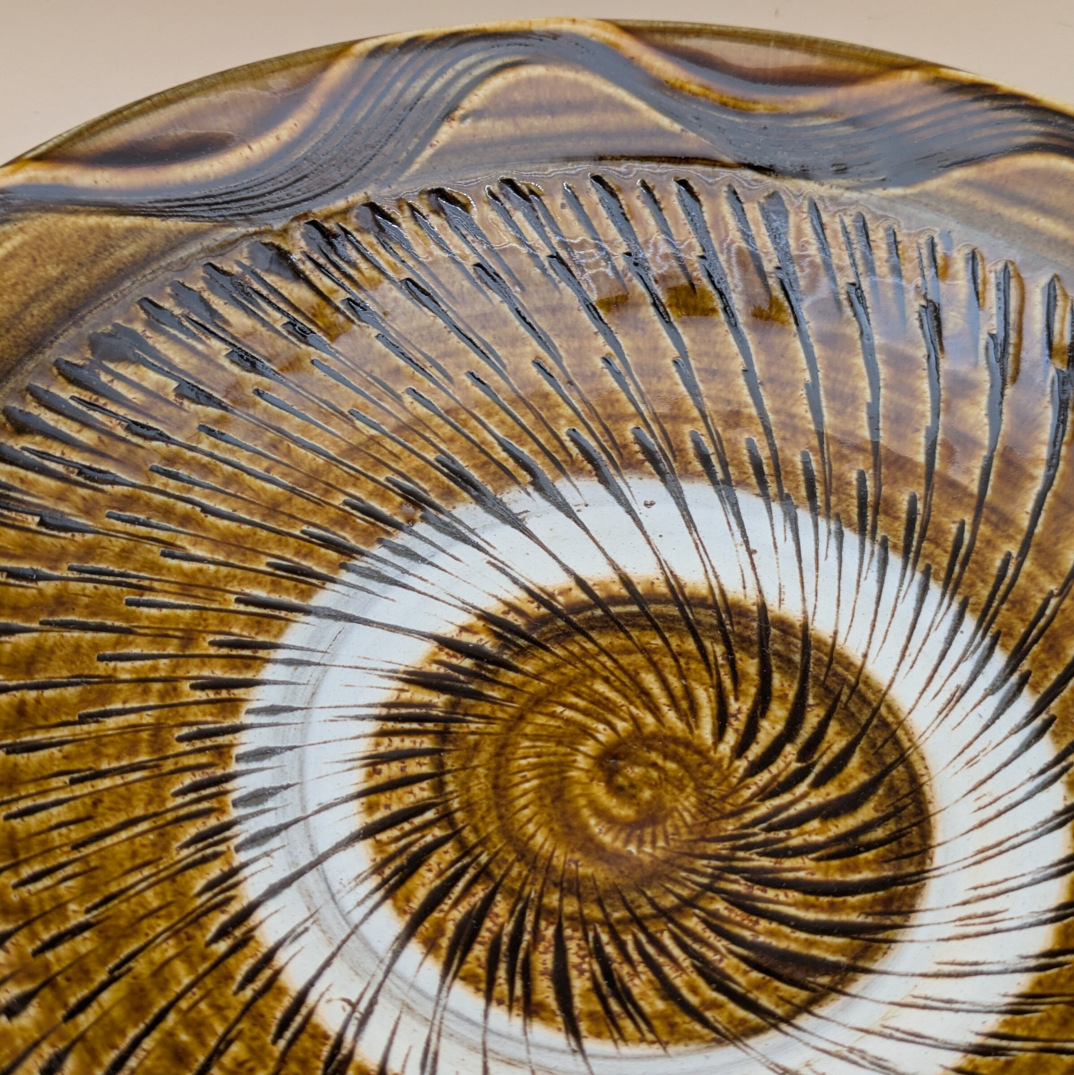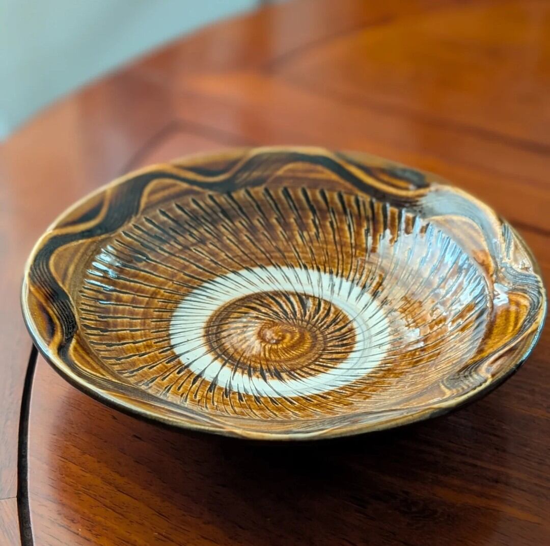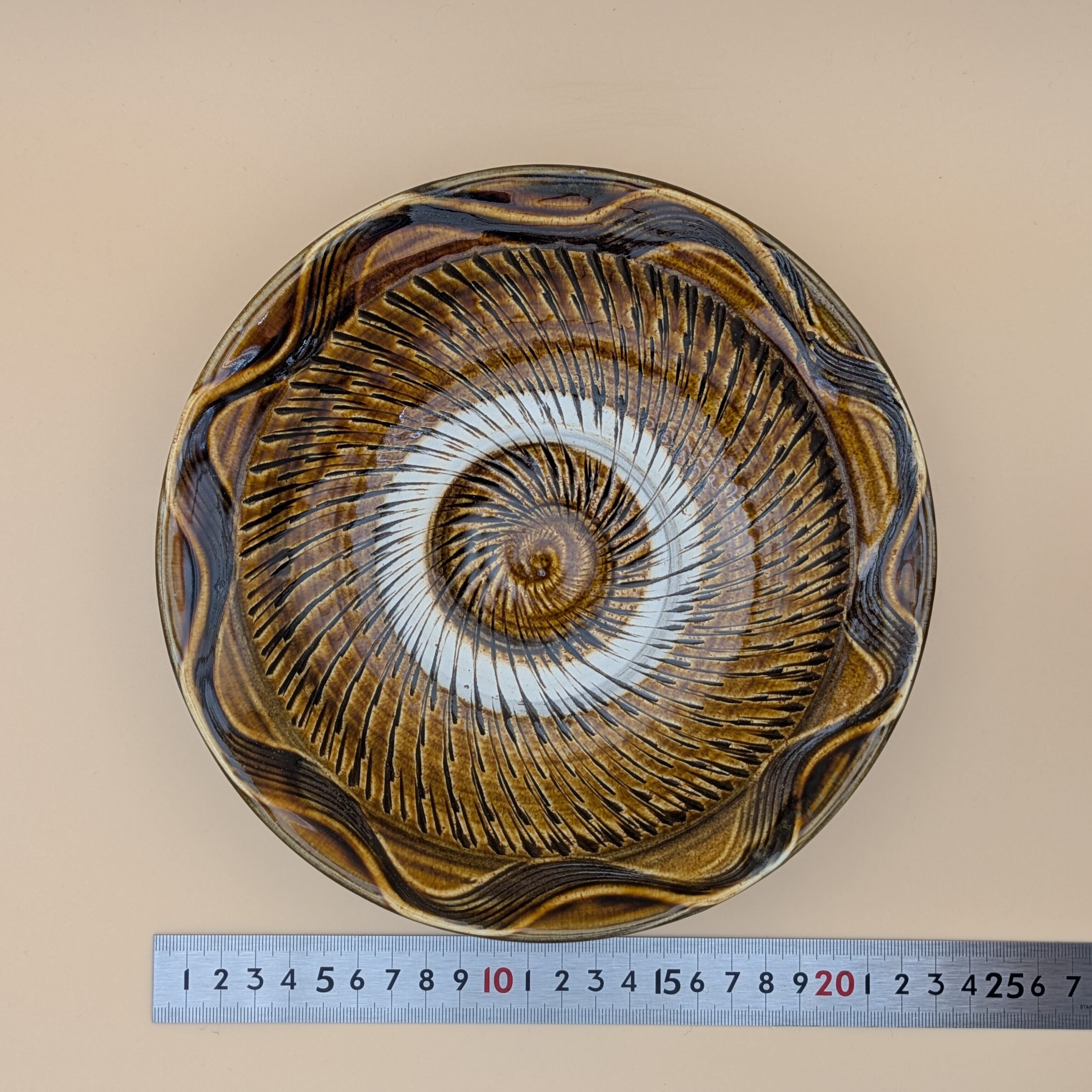 盛皿7寸 小鹿田焼(飴釉・飛び鉋・縁櫛描き) 直径21cm 高さ4.8cm 重量403g
