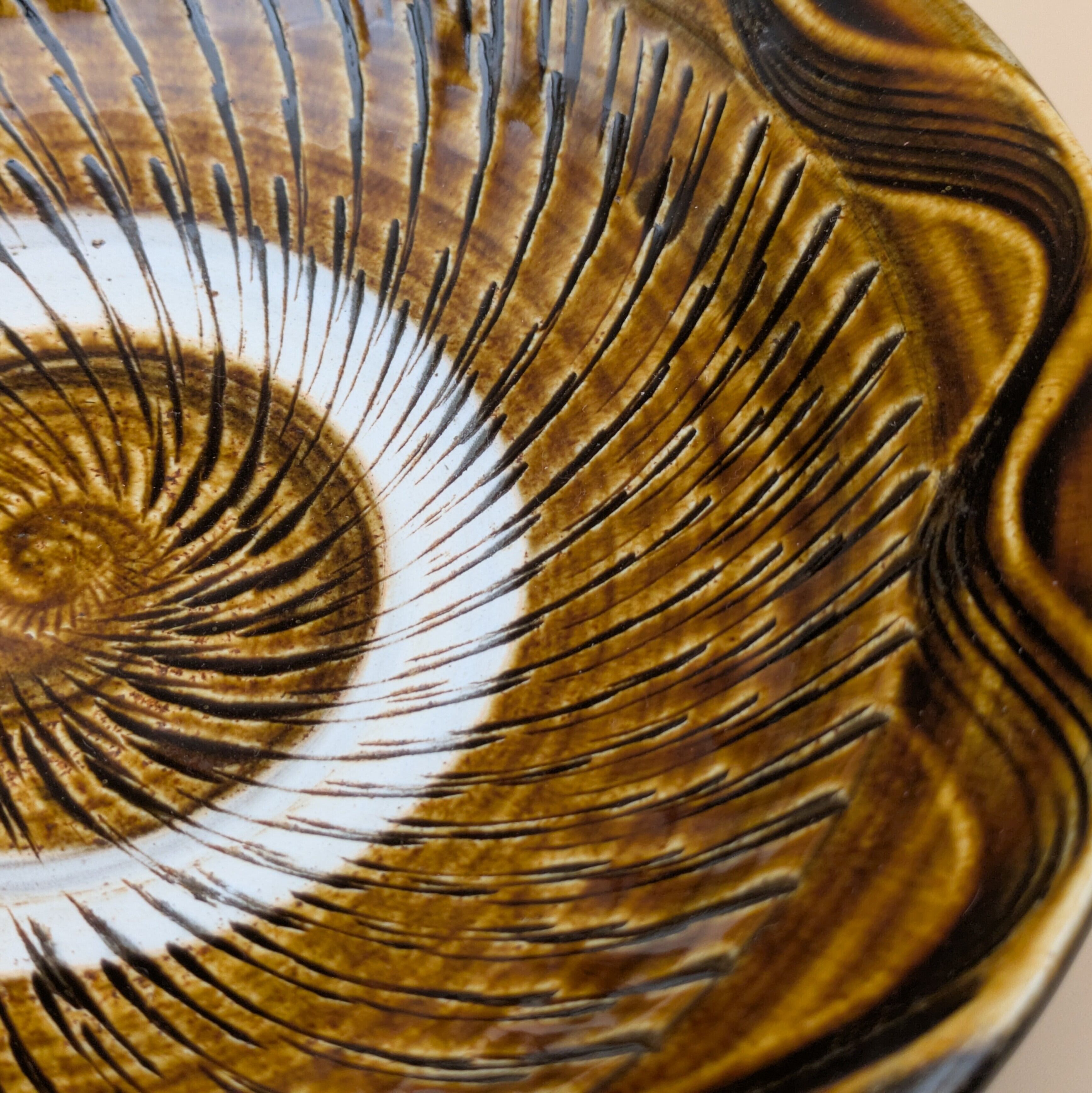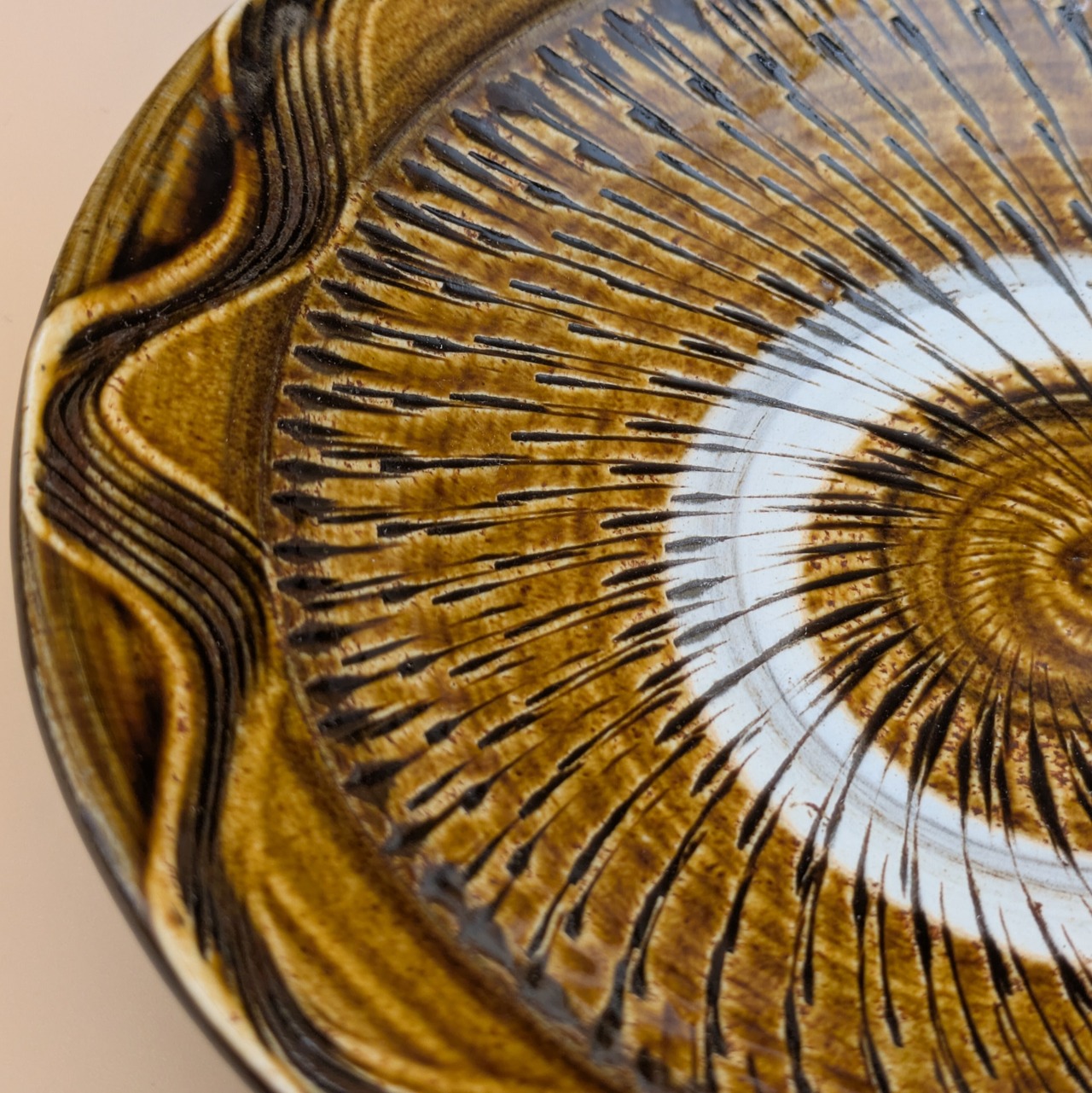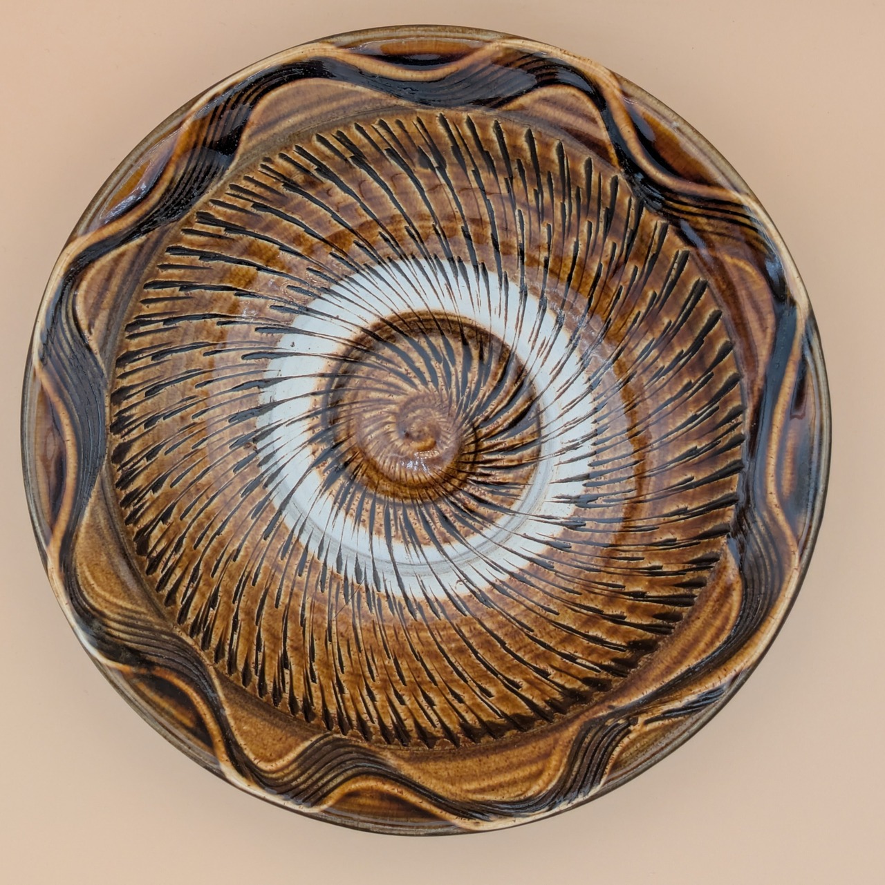 盛皿7寸 小鹿田焼(飴釉・飛び鉋・縁櫛描き) 直径21cm 高さ4.8cm 重量403g