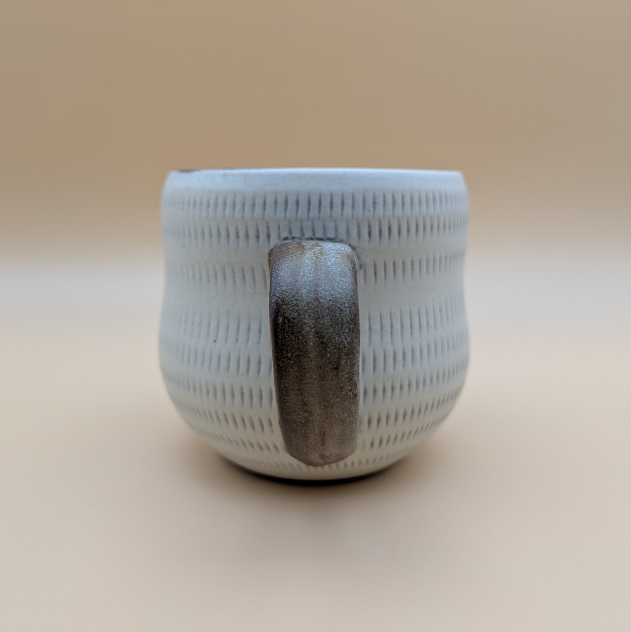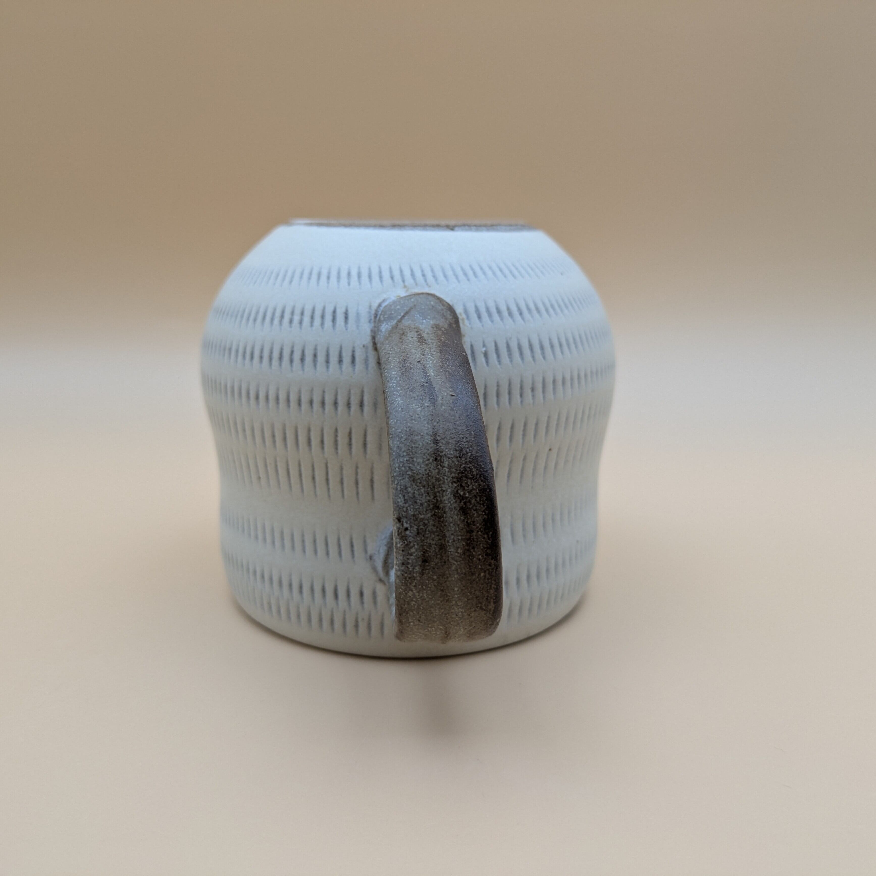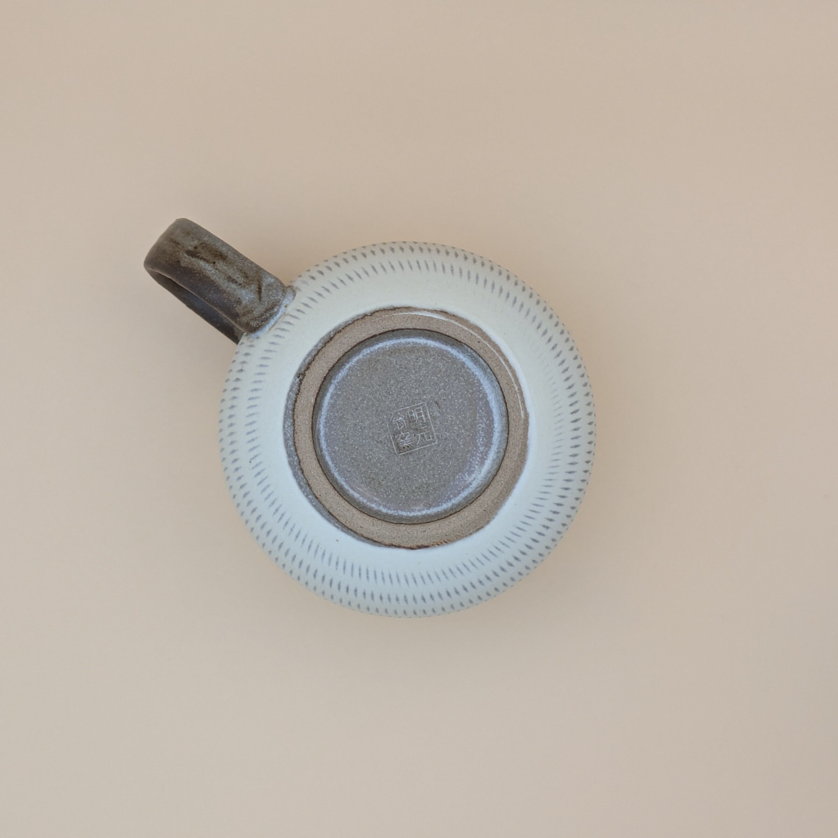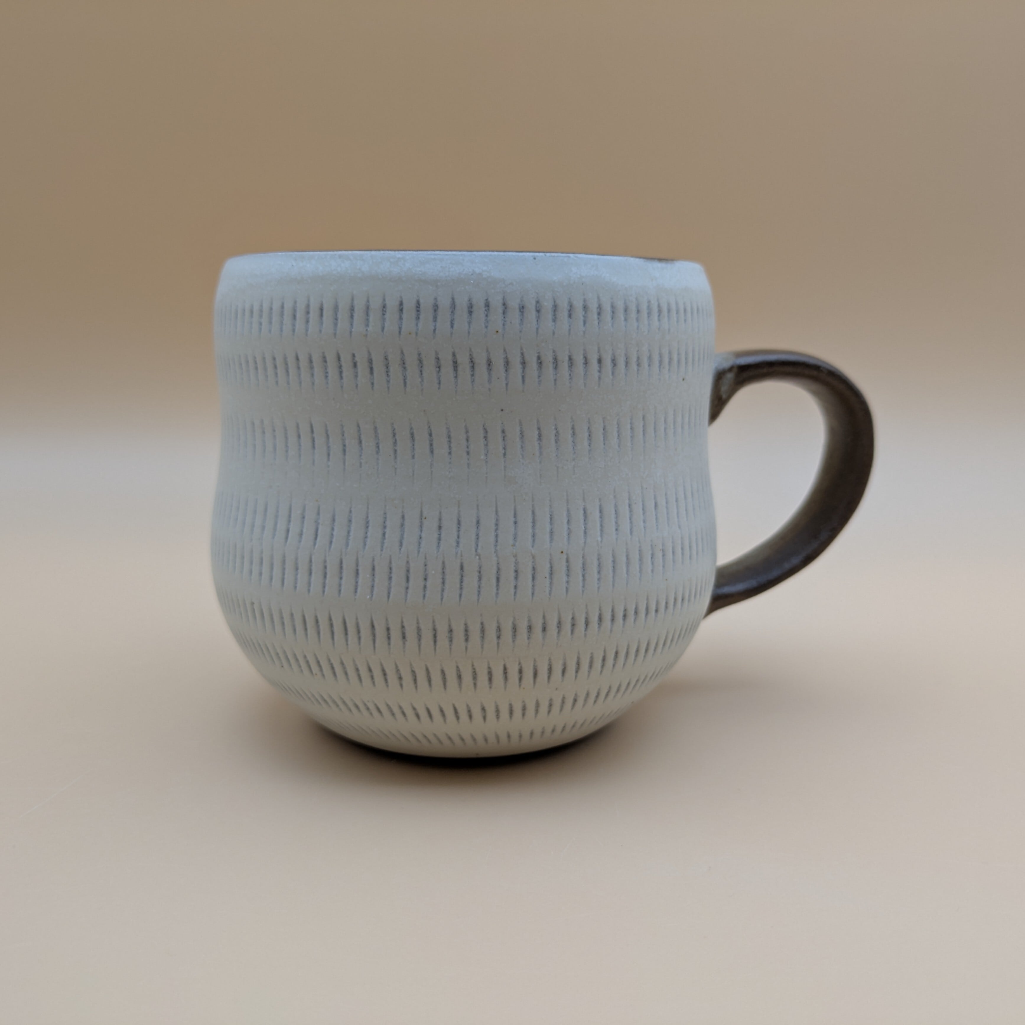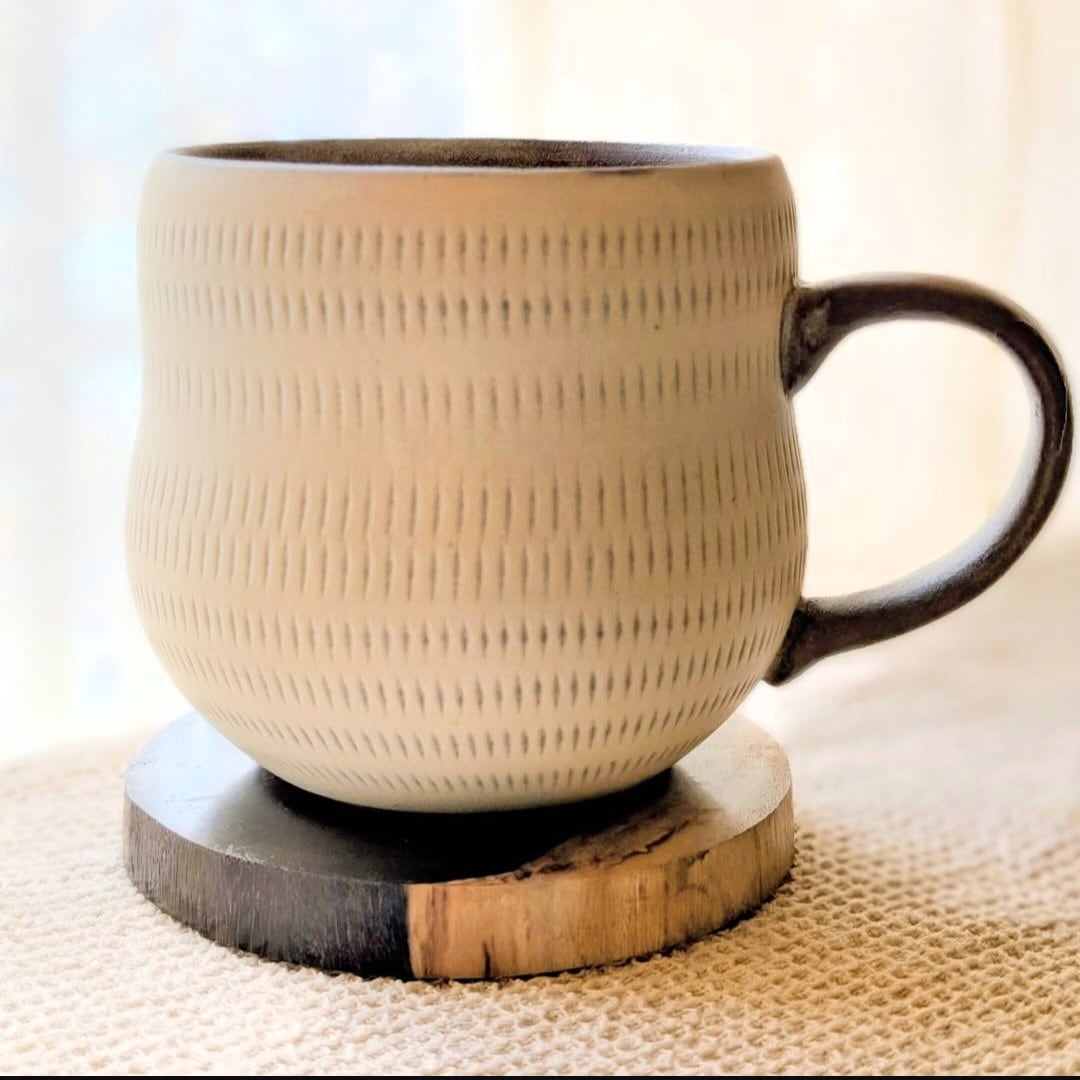 職人の手による温かみあふれるマグカップです。白地に施された飛び鉋のデザインは、個性的でありながらもシンプルな美しさを兼ね備えており、あたたかなひとときを演出します。