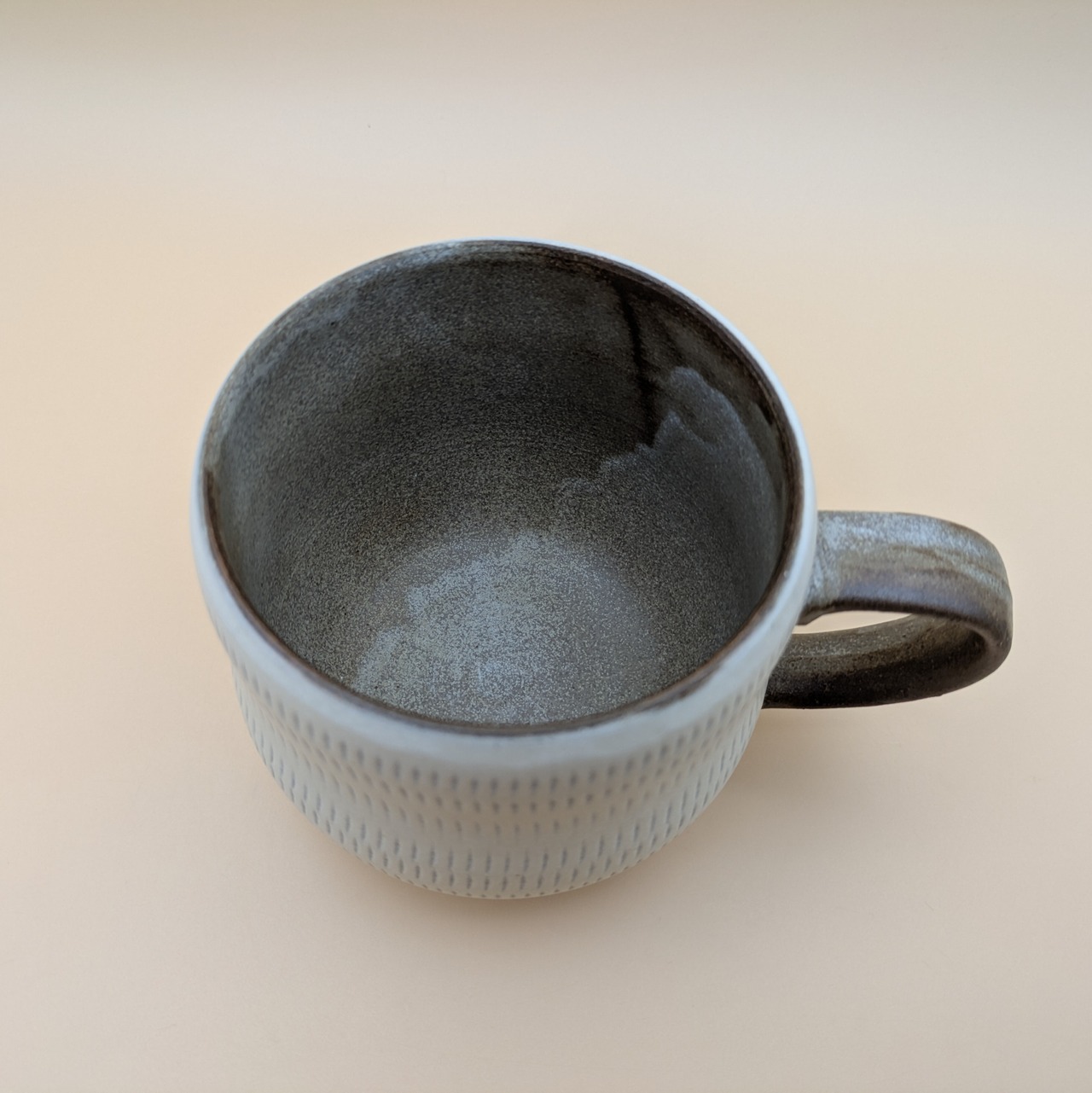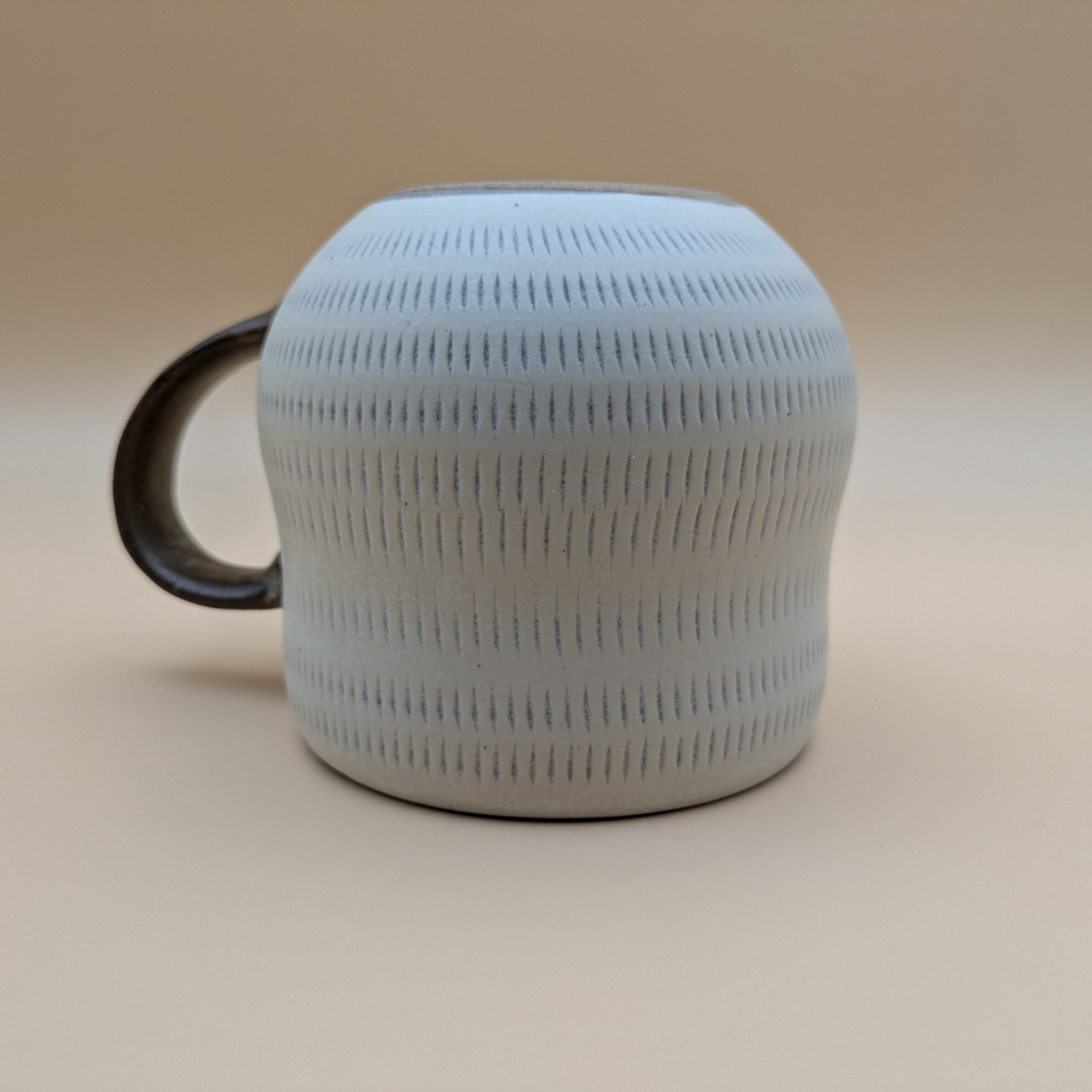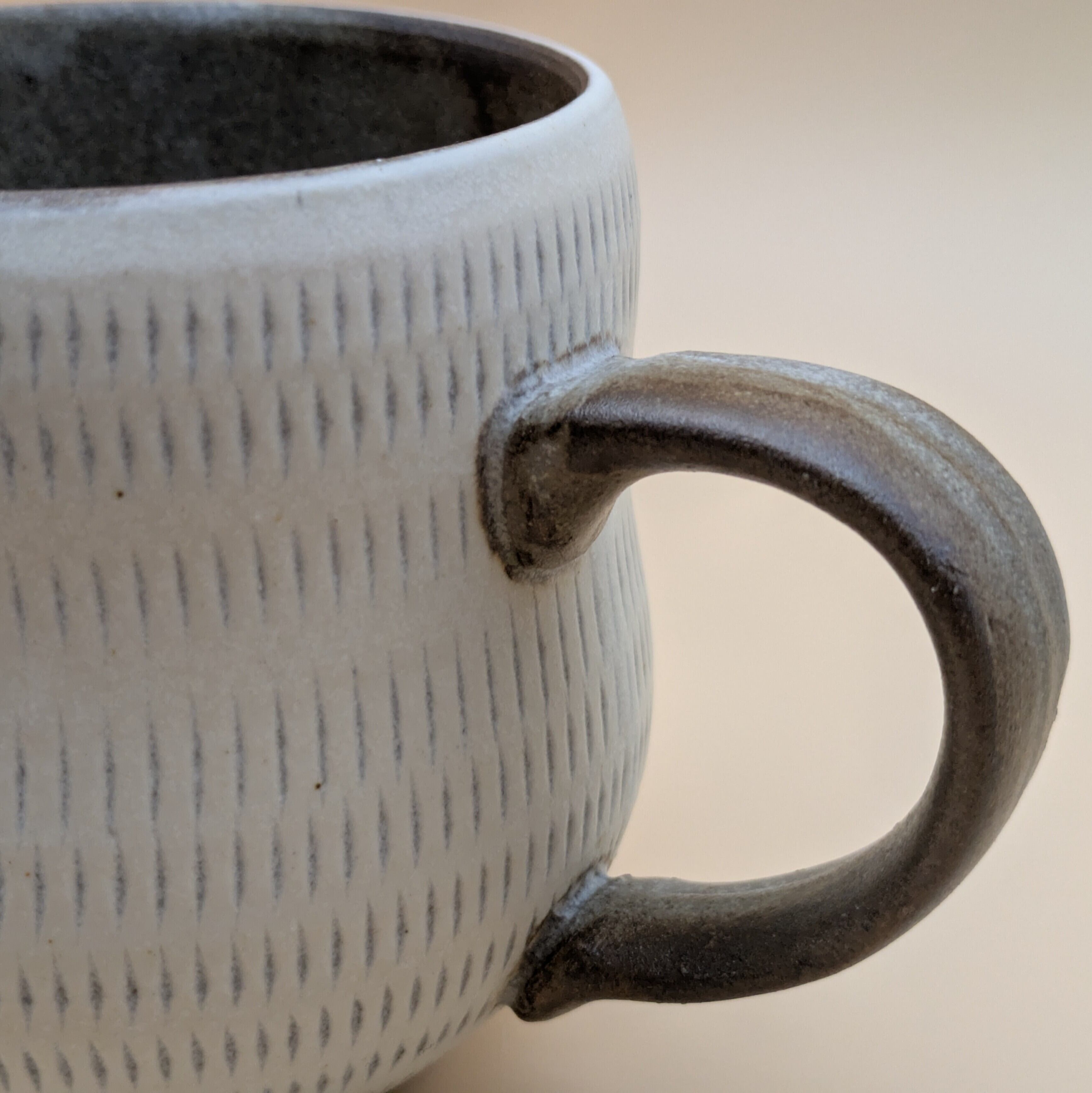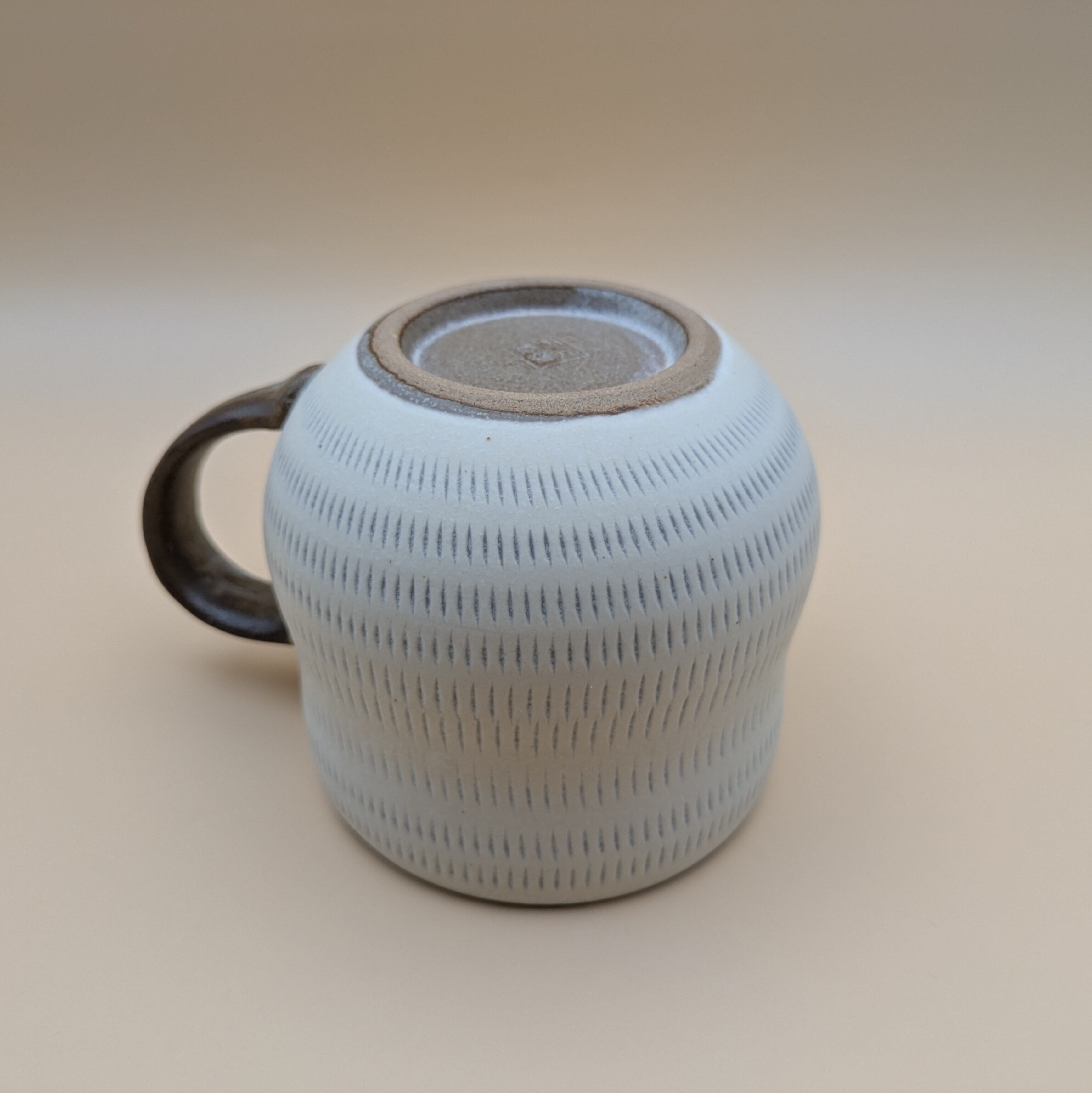 職人の手による温かみあふれるマグカップです。白地に施された飛び鉋のデザインは、個性的でありながらもシンプルな美しさを兼ね備えており、あたたかなひとときを演出します。
