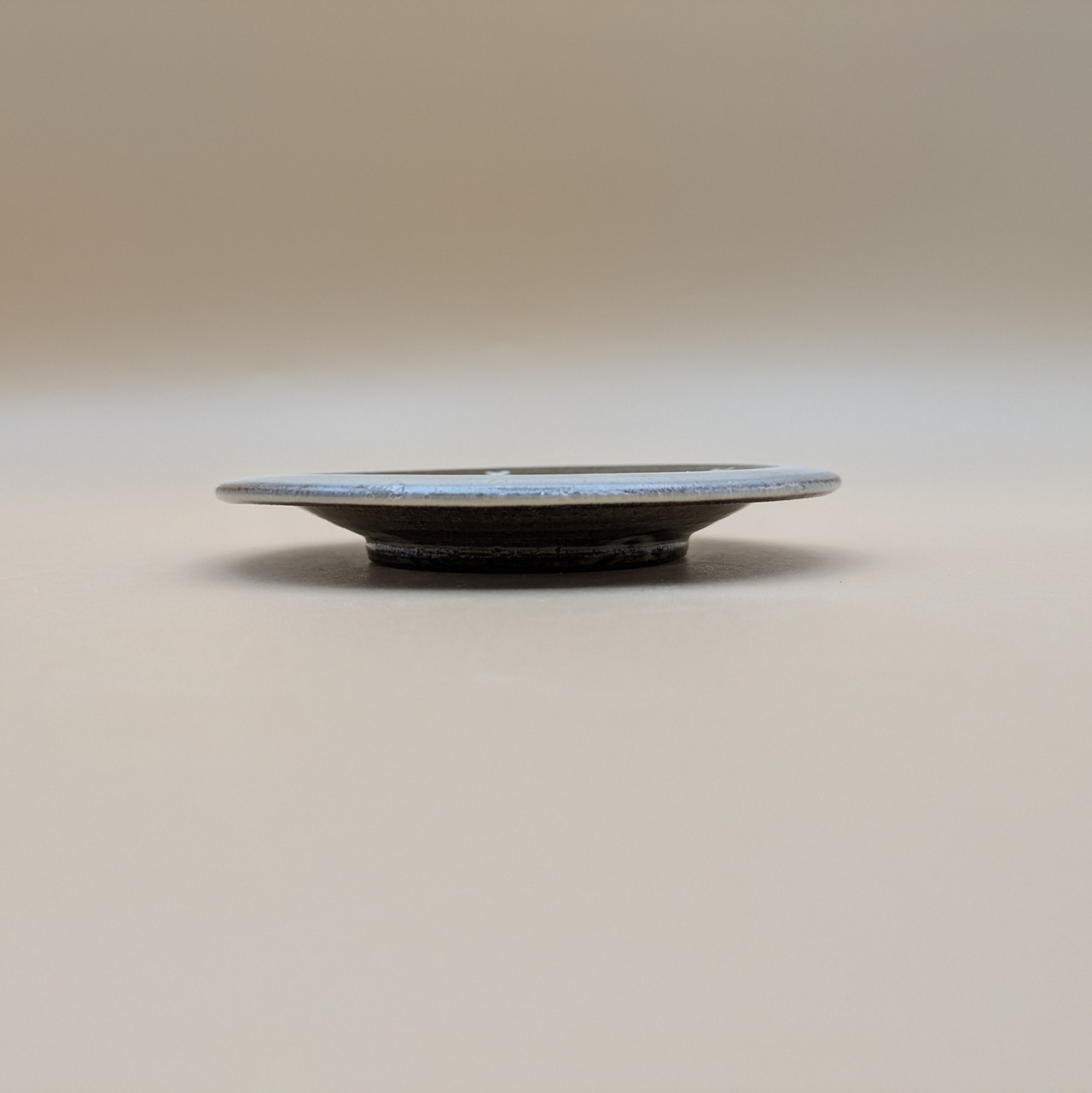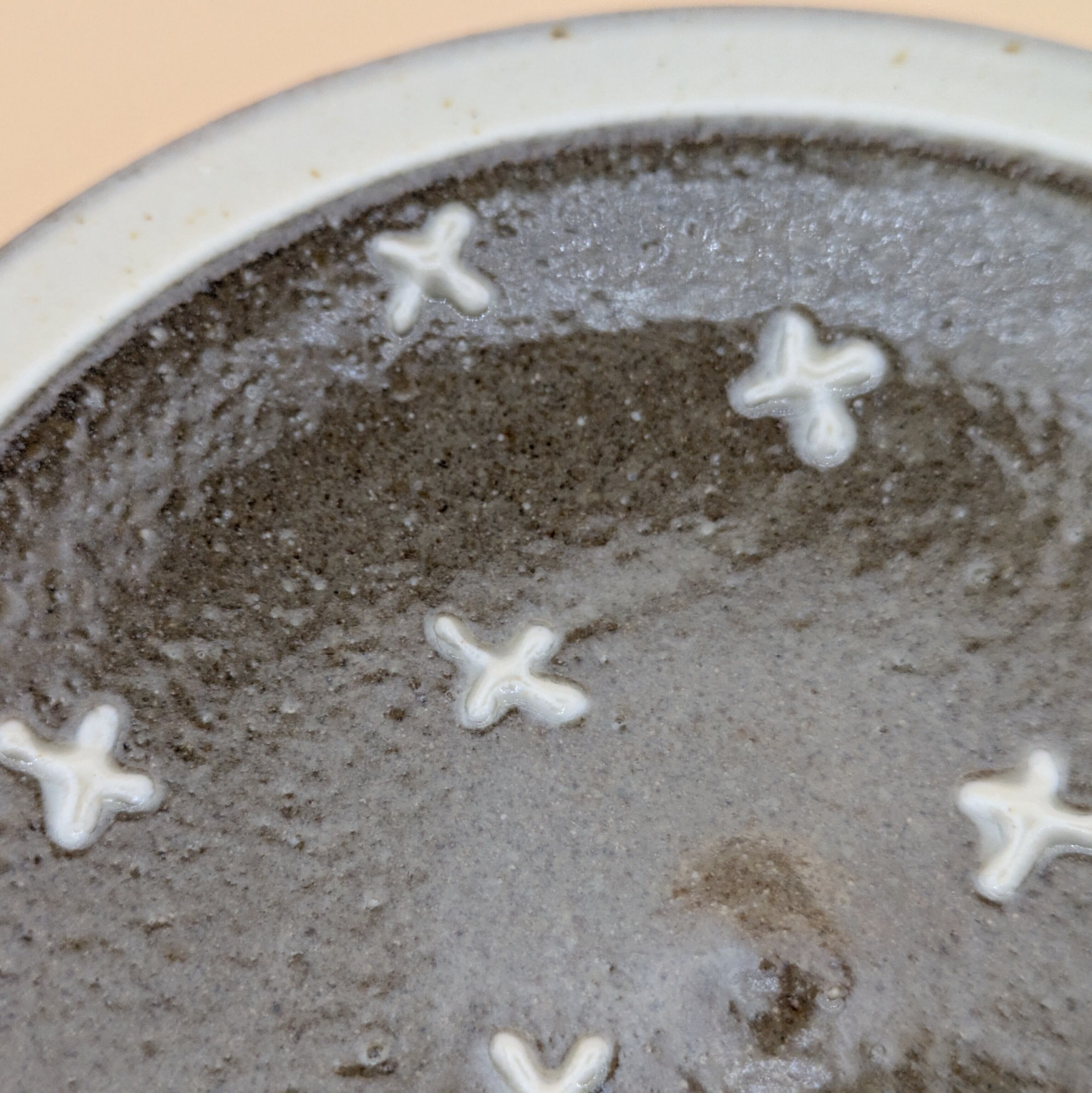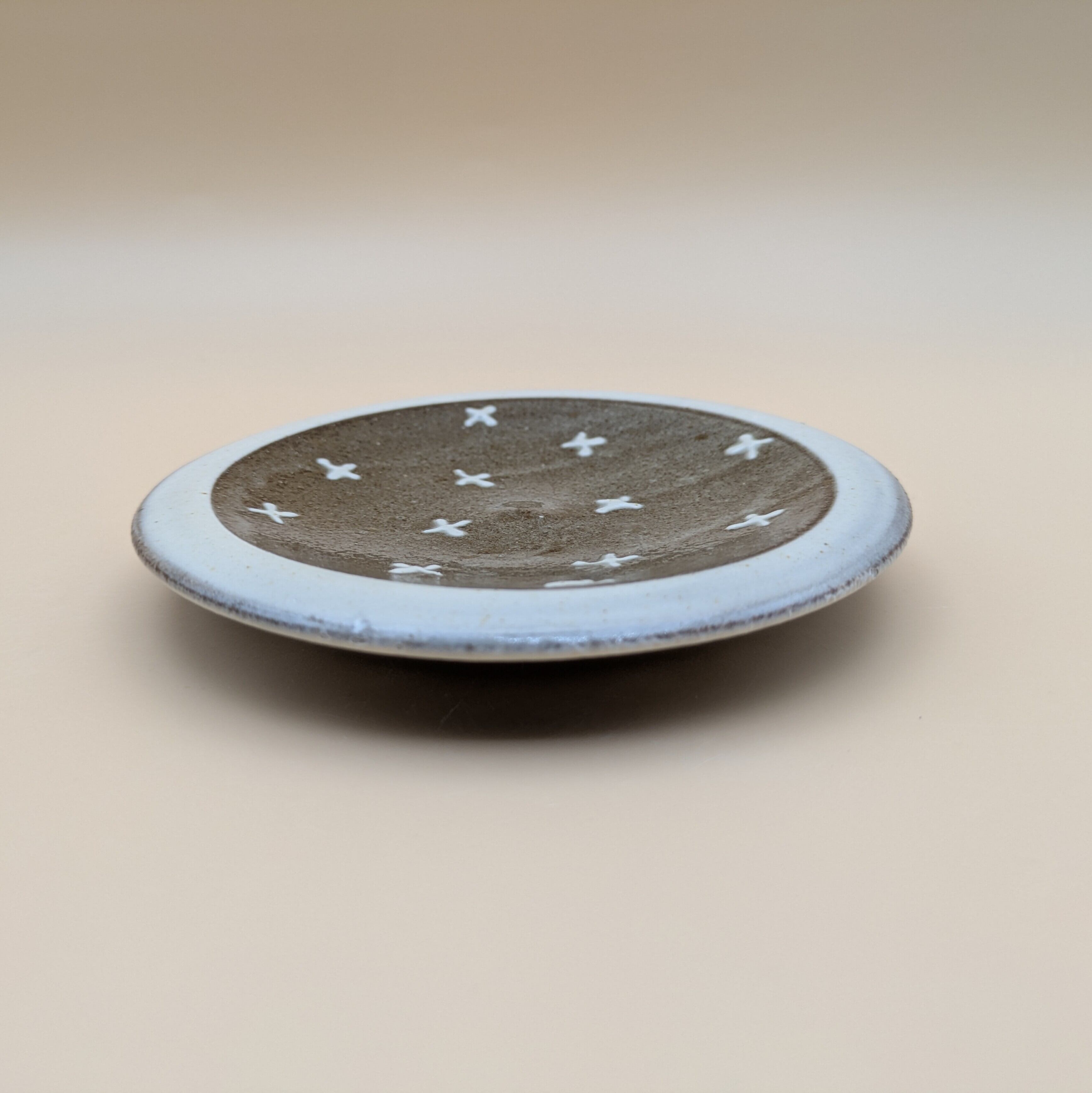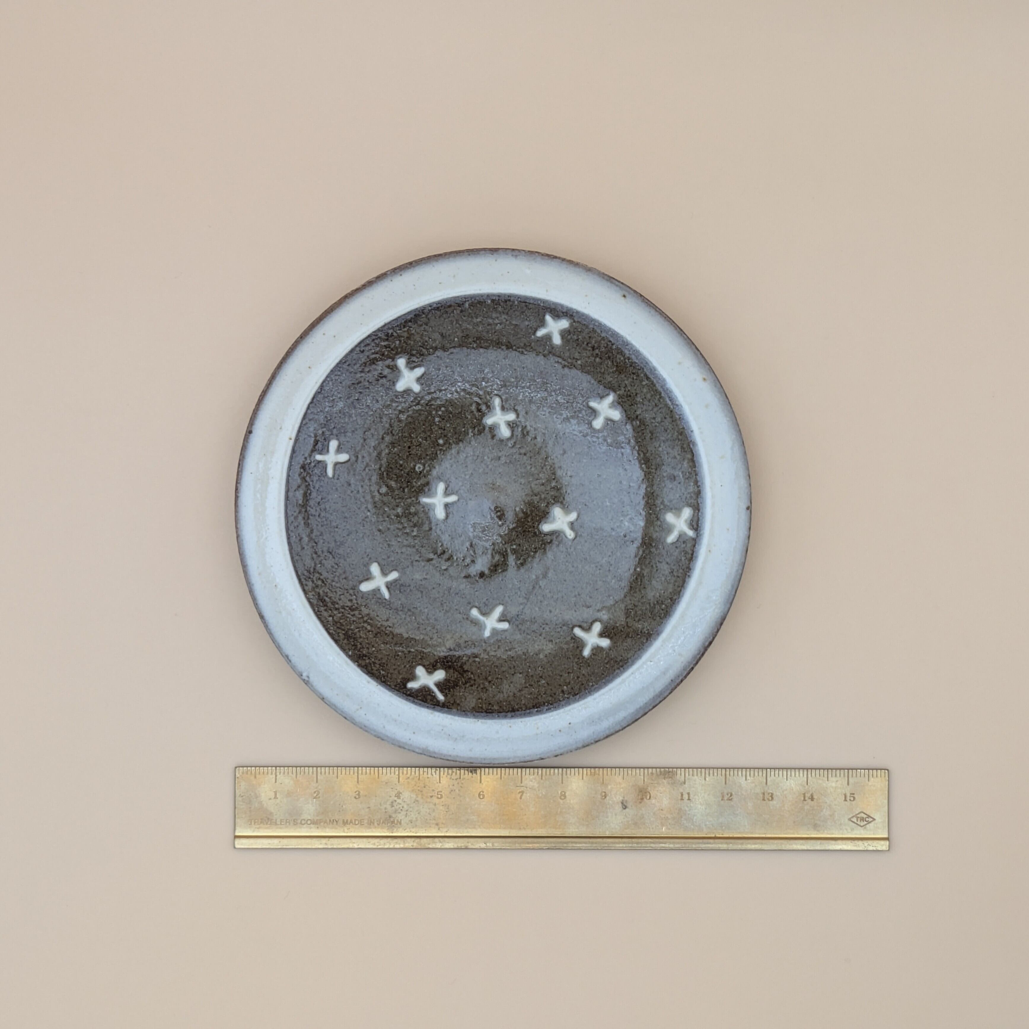 小石原焼の豆皿です。灰釉の地に白縁・白クロスがポイントの可愛らしいデザインです。手作りならではの温かみと風合いがあり、使えば使うほど味わい深さが増します。