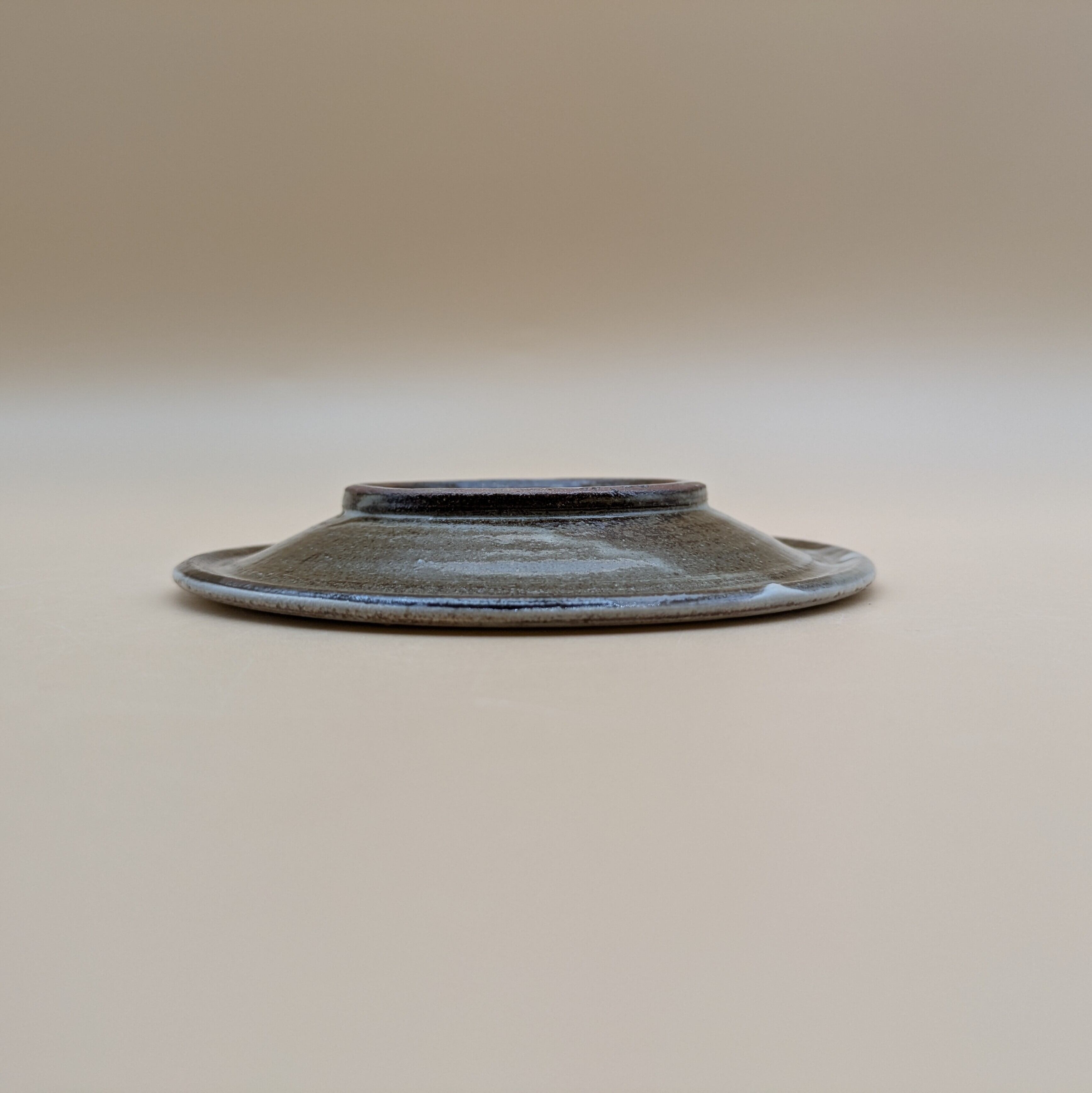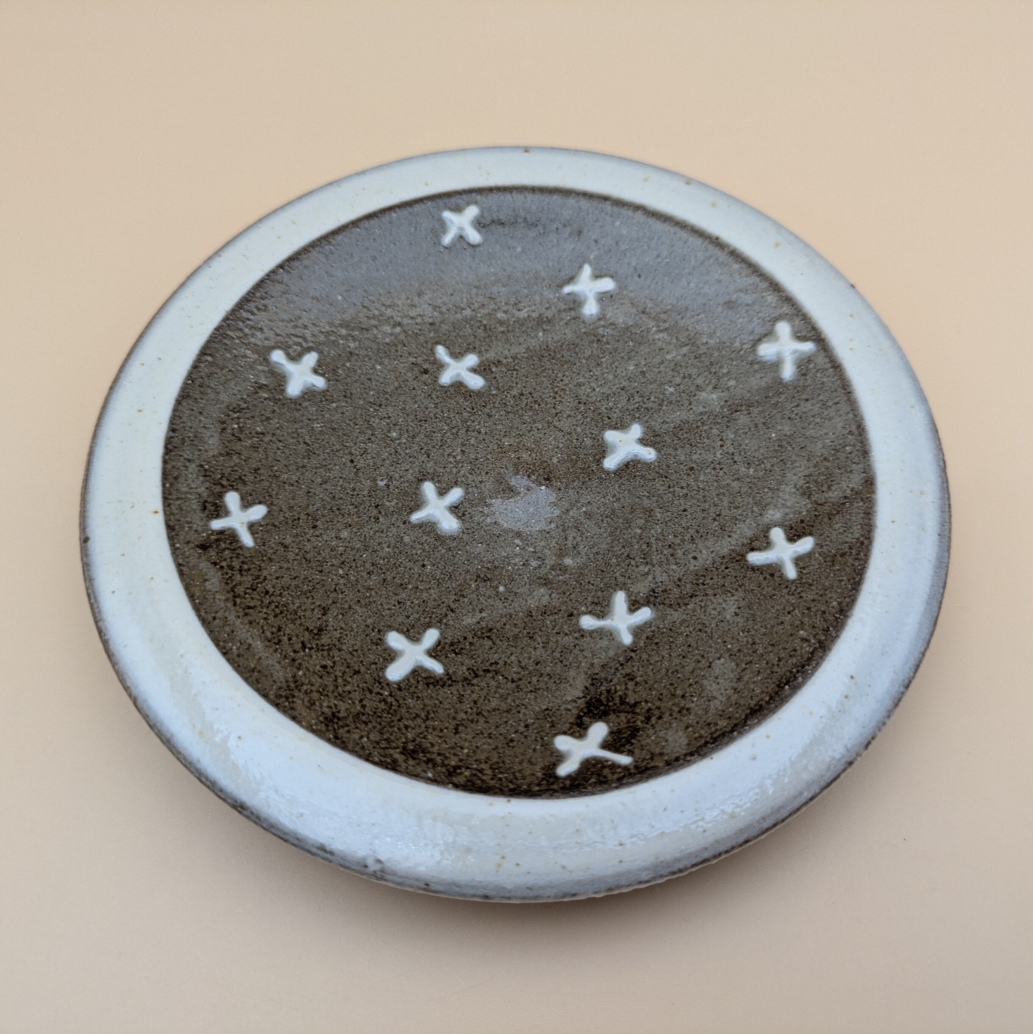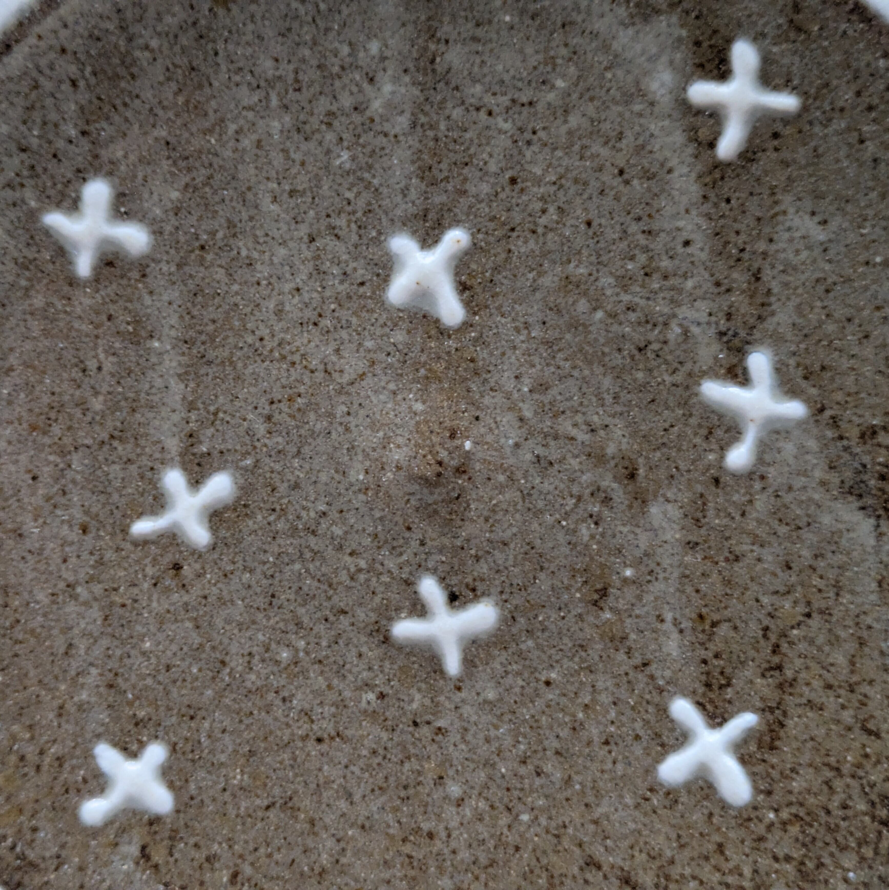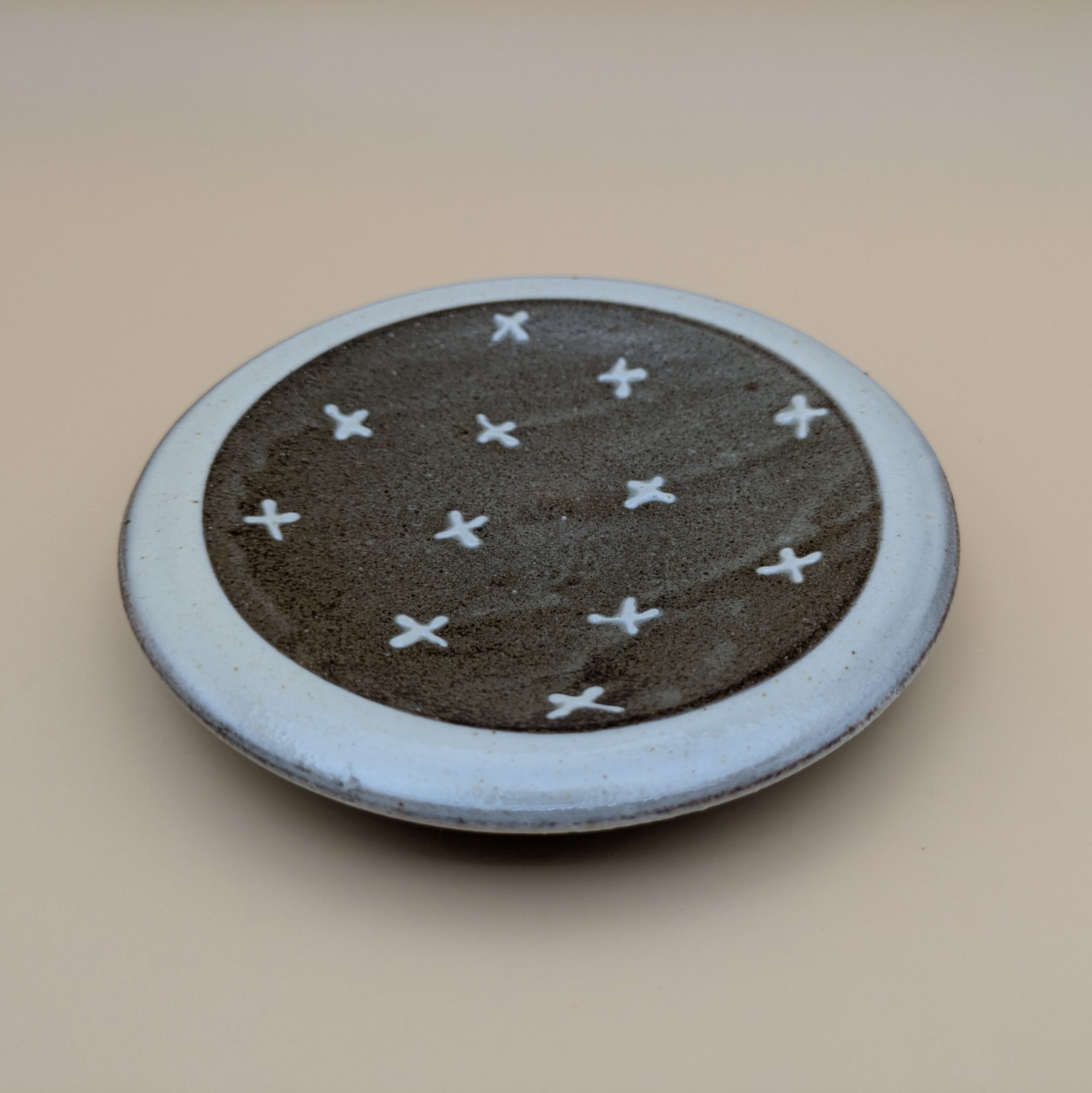 小石原焼の豆皿です。灰釉の地に白縁・白クロスがポイントの可愛らしいデザインです。手作りならではの温かみと風合いがあり、使えば使うほど味わい深さが増します。