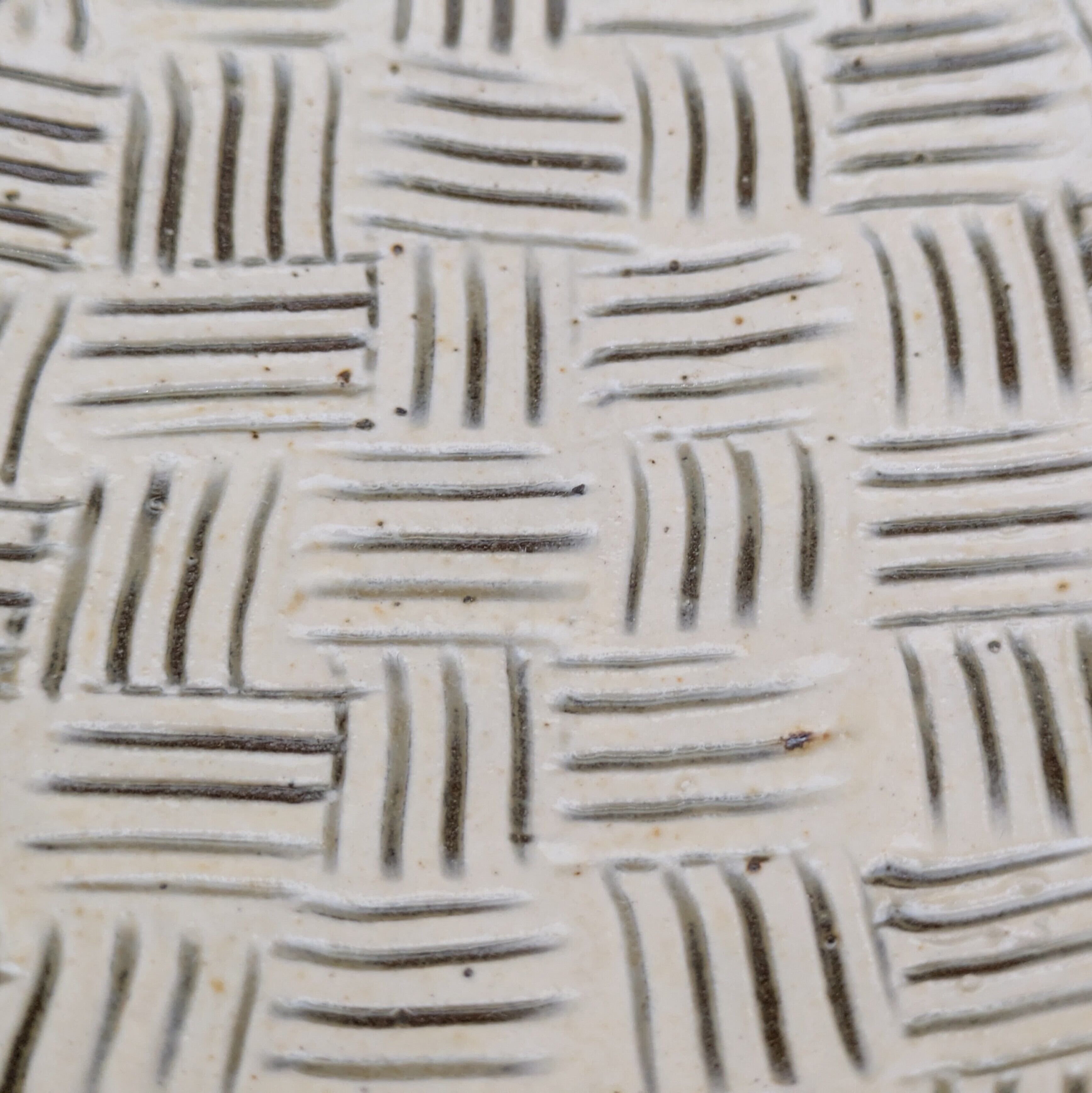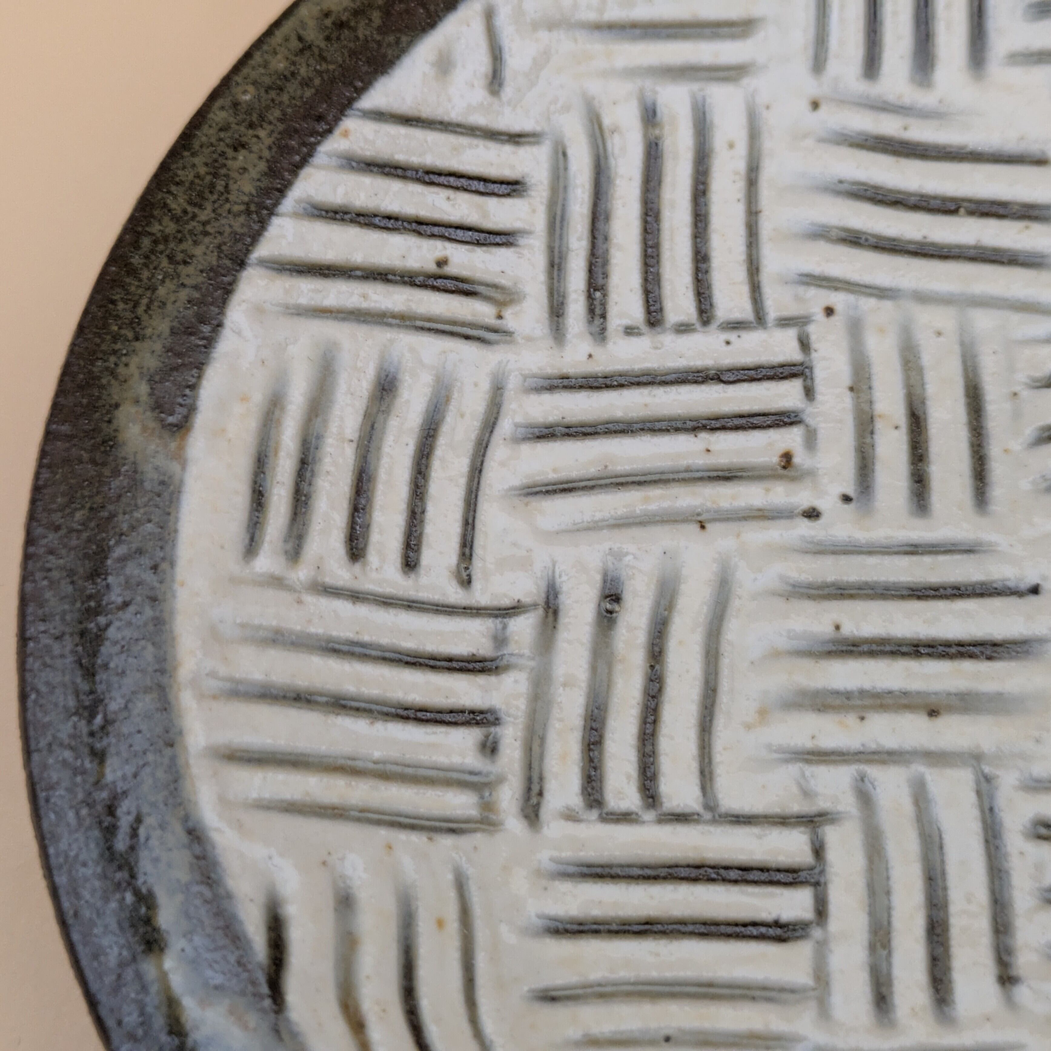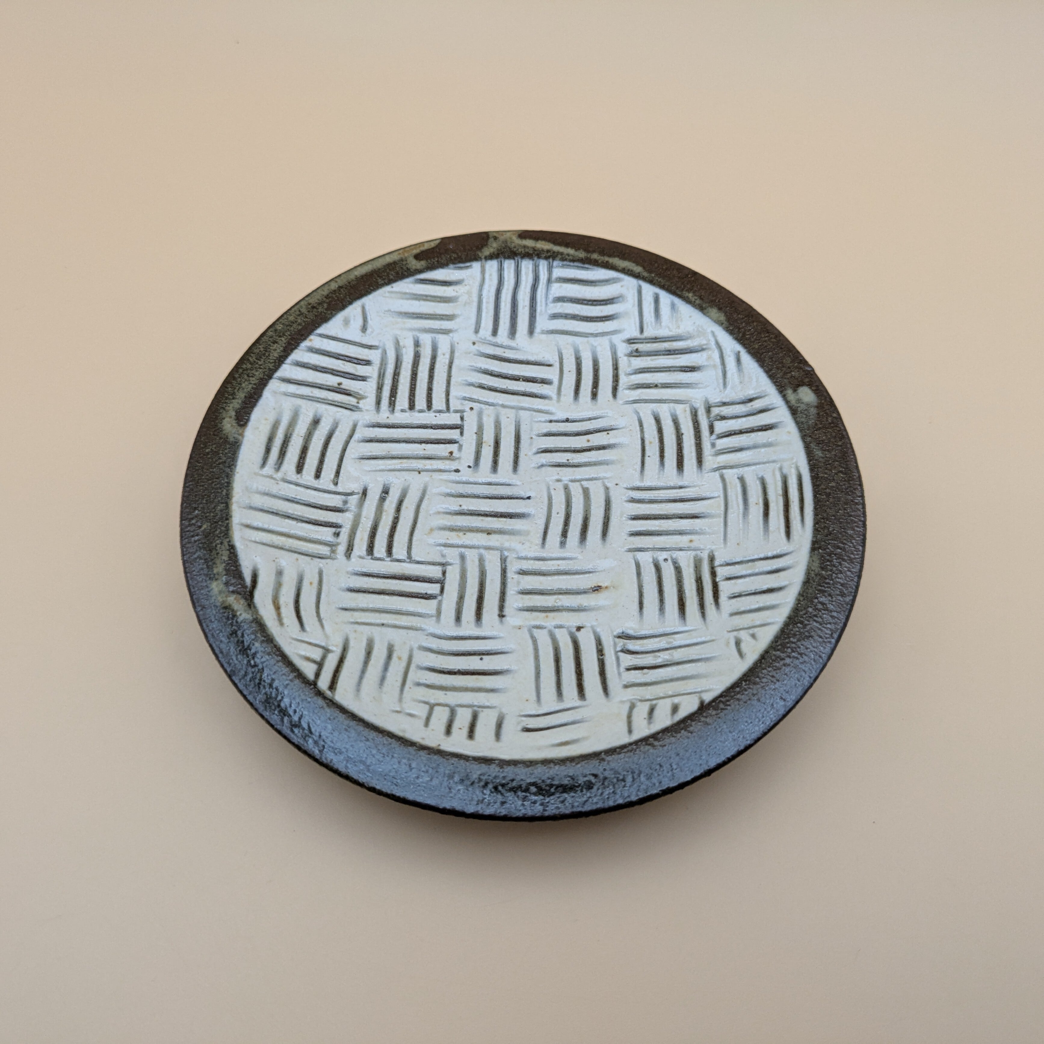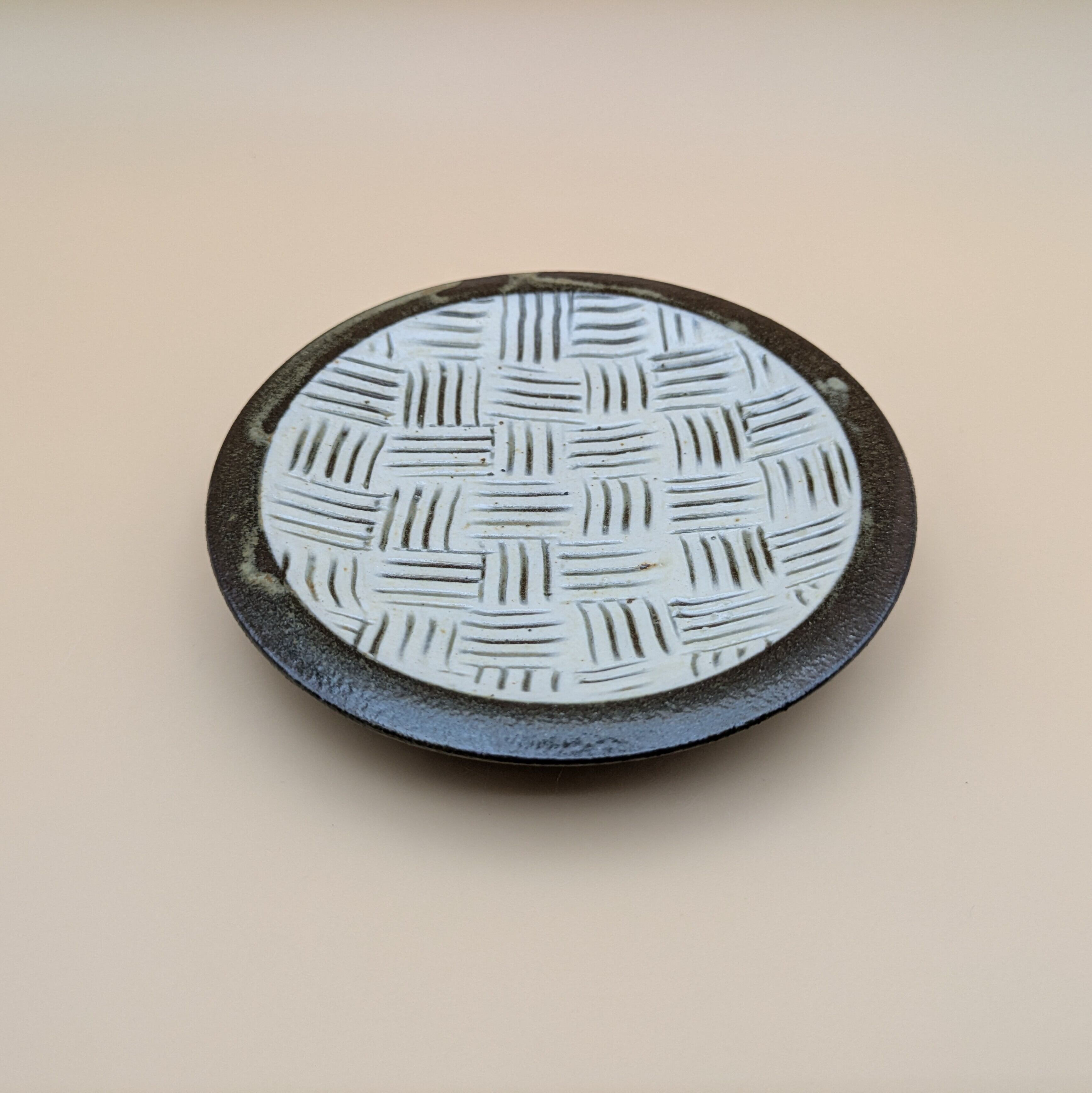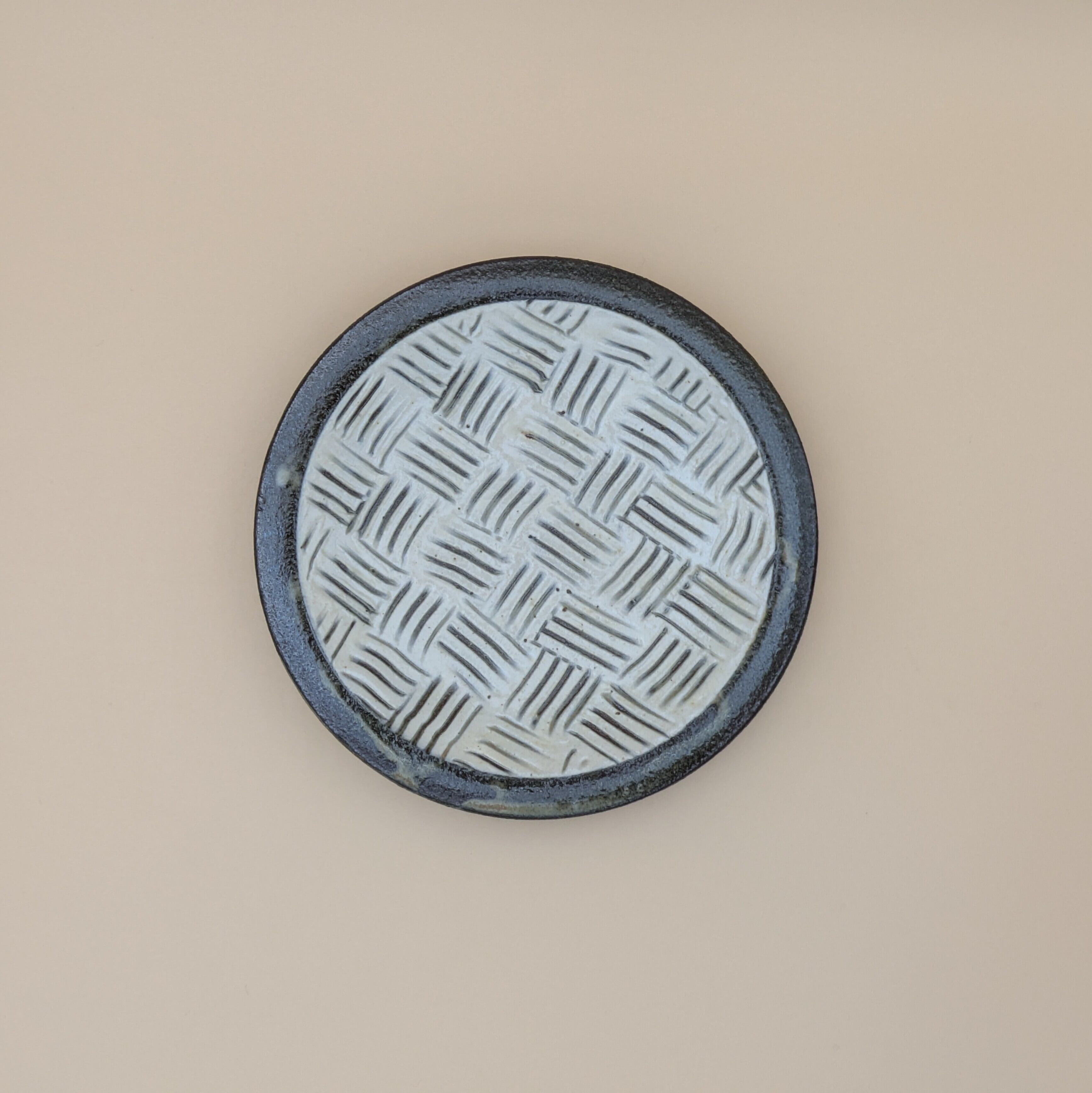 小石原焼の豆皿です。白釉の地に黒縁・白クロスがポイントの可愛らしいデザインです。手作りならではの温かみと風合いがあり、使えば使うほど味わい深さが増します。