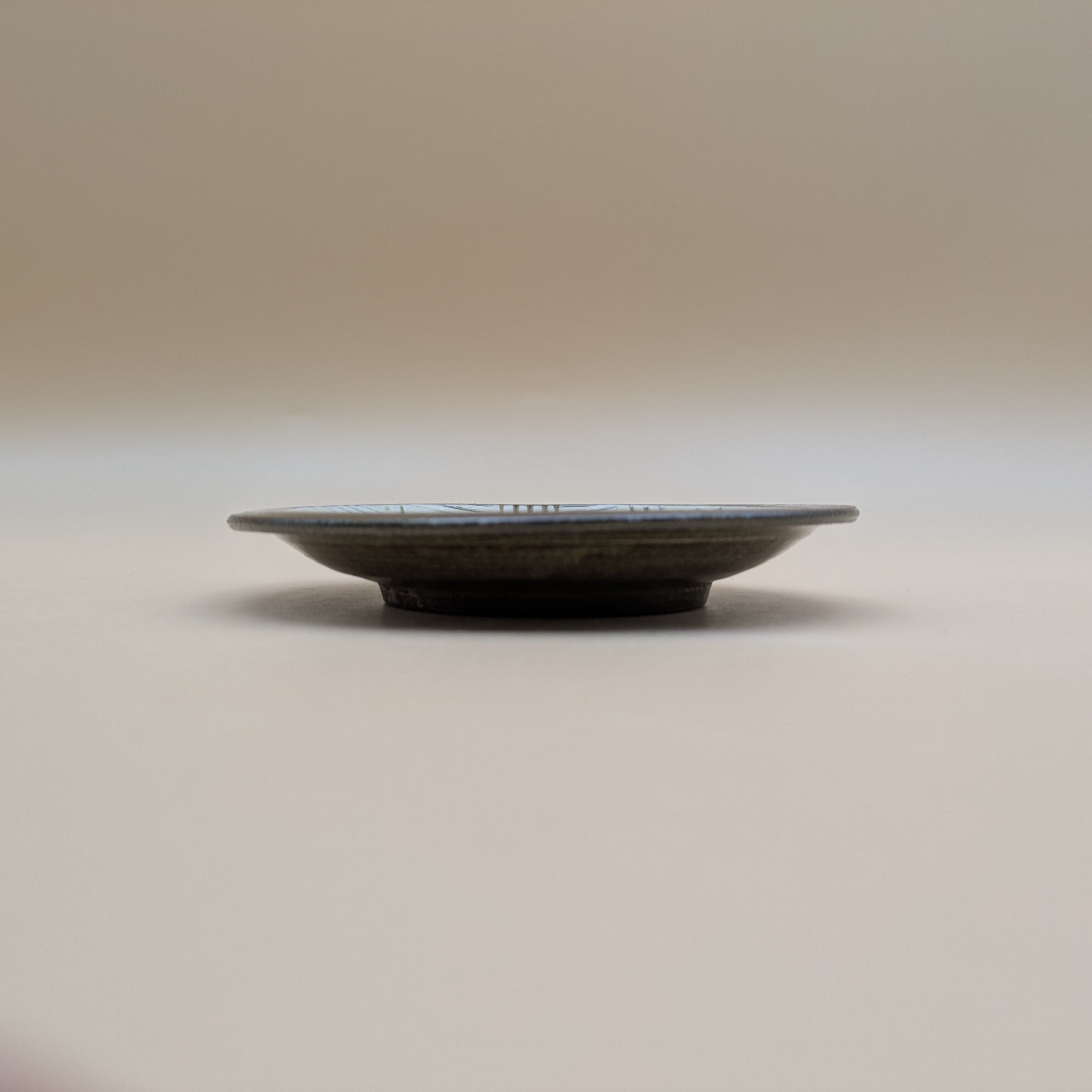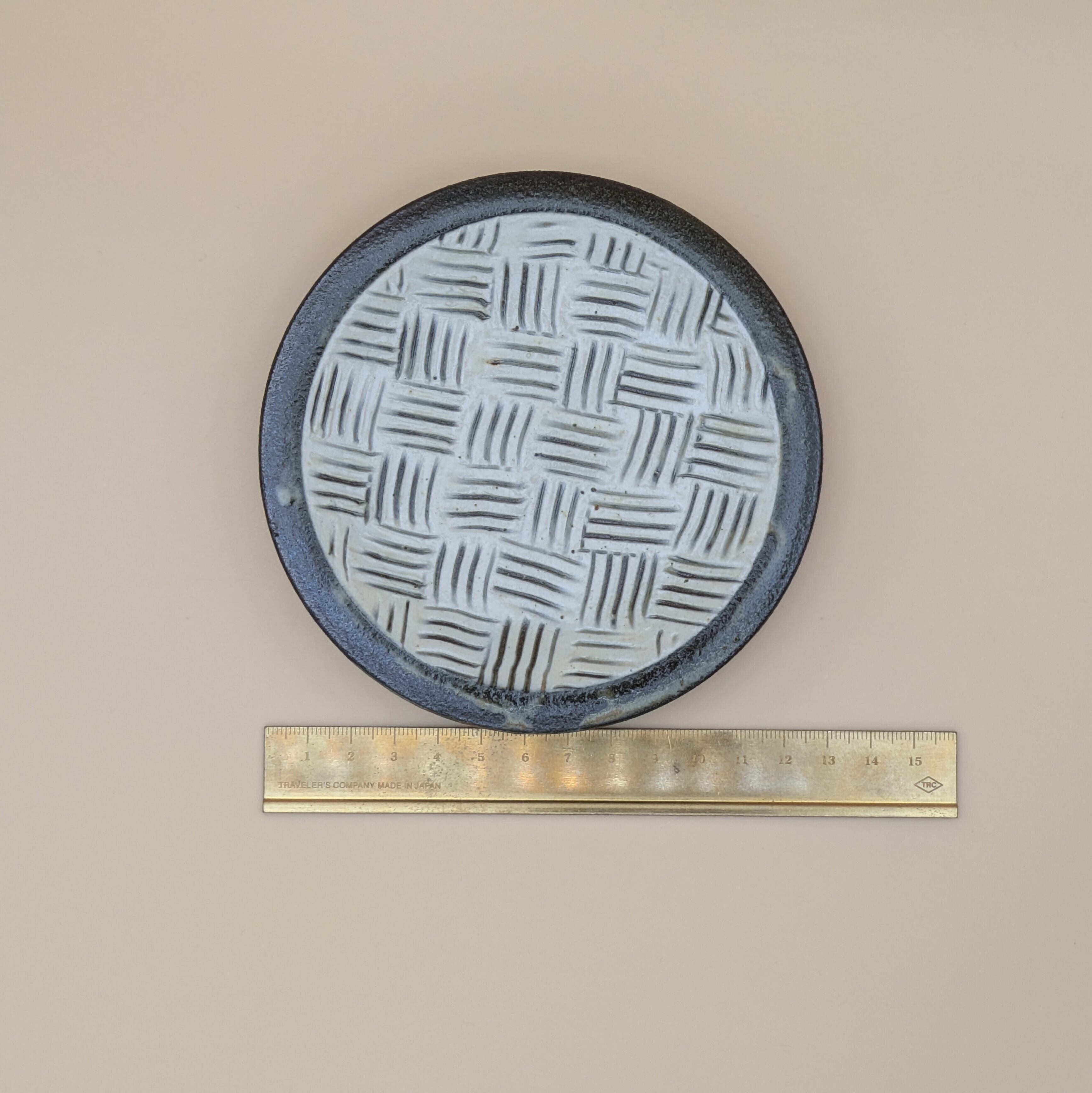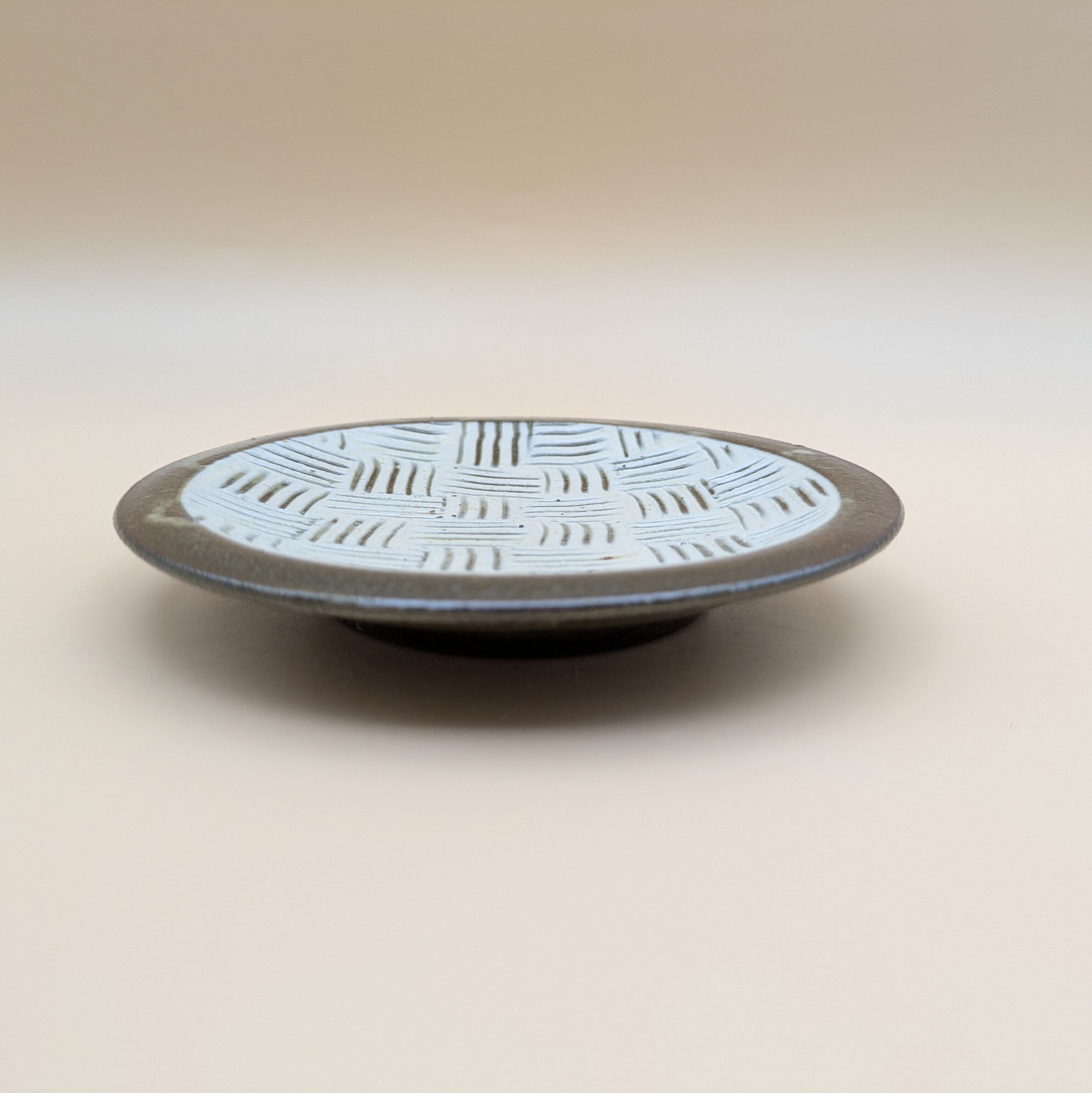 平皿4寸 小石原焼(白釉・黒縁・三本櫛描き02) 直径12.6cm 高さ2cm 重量169g