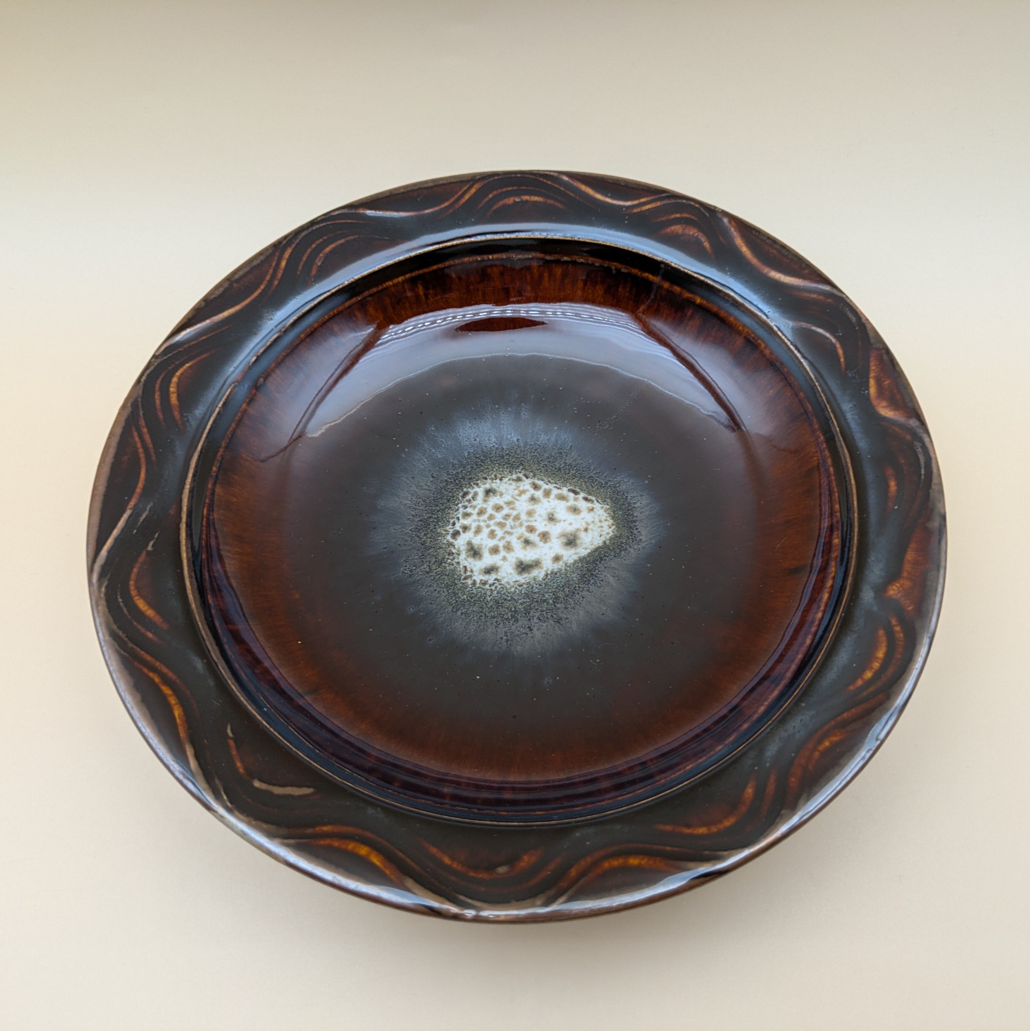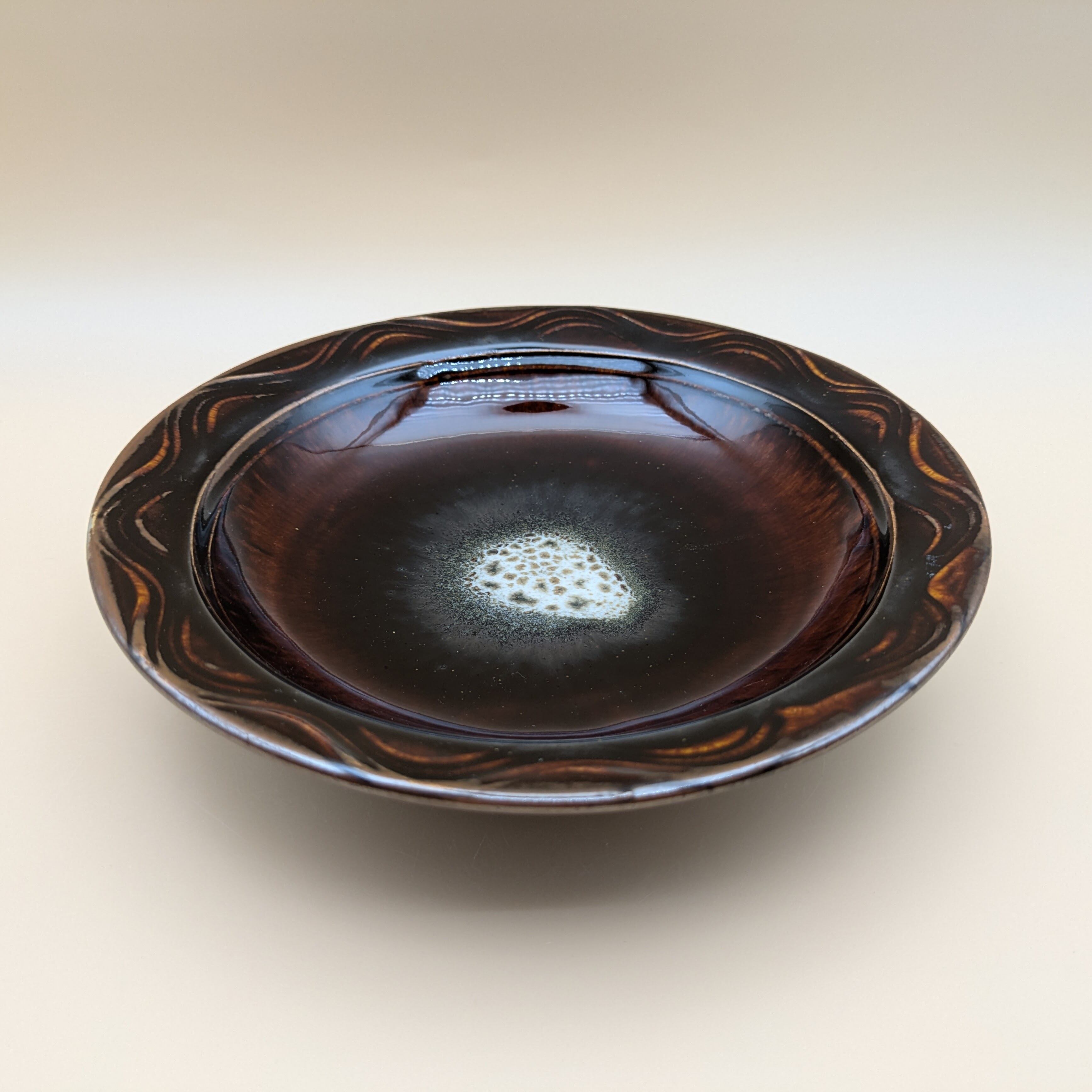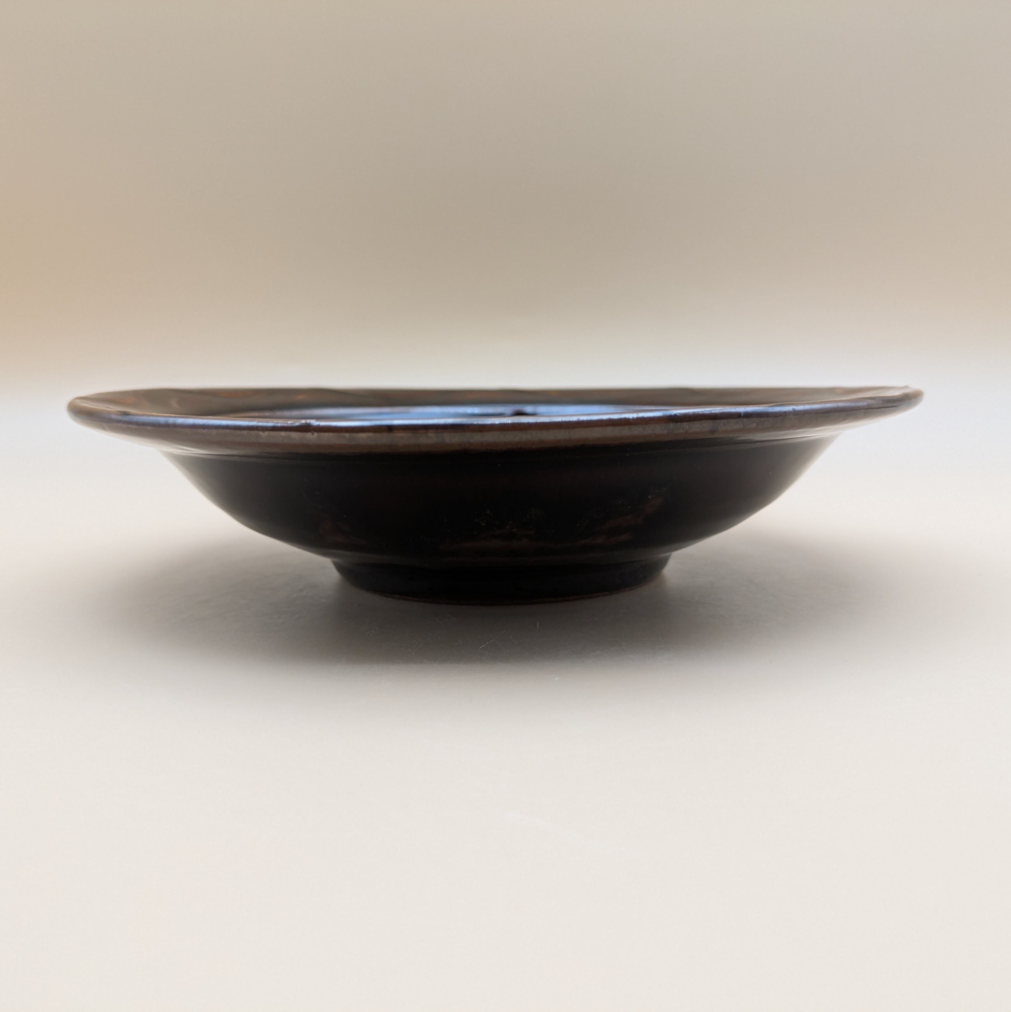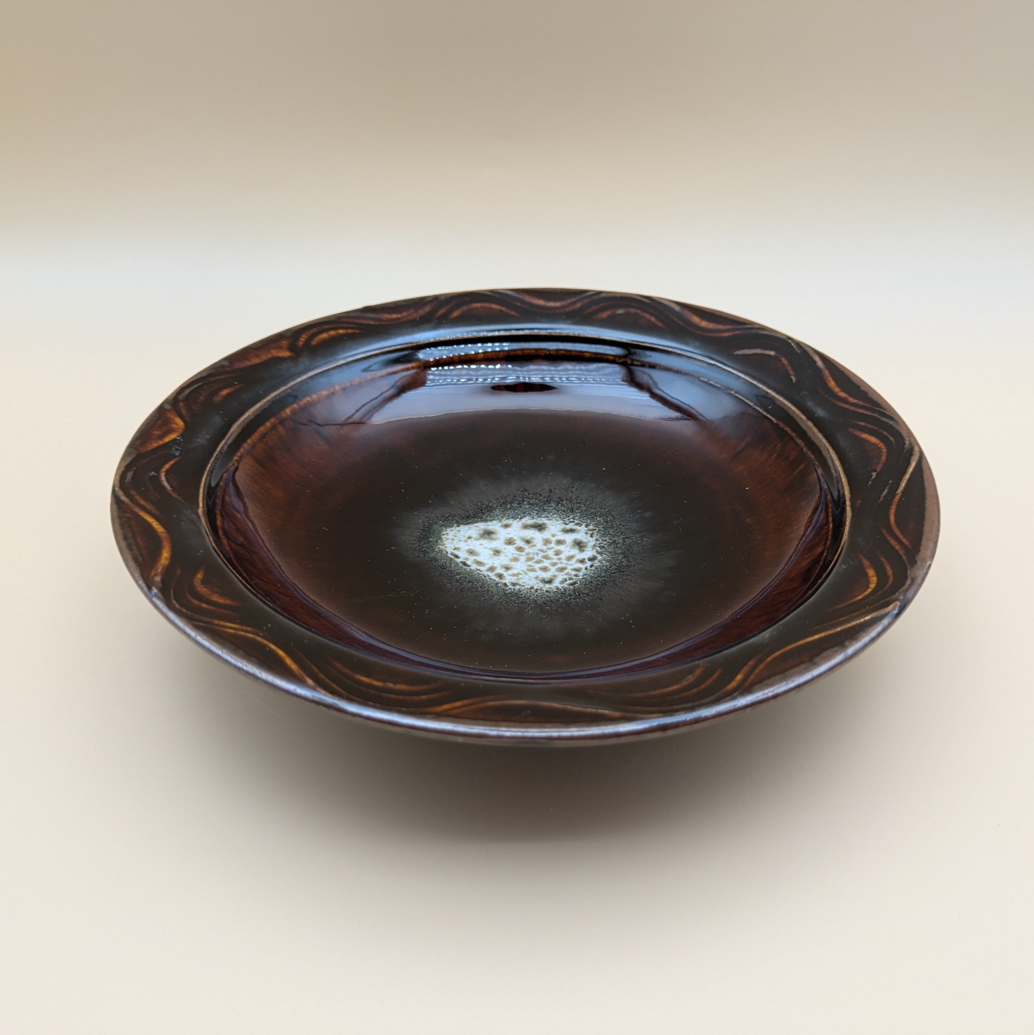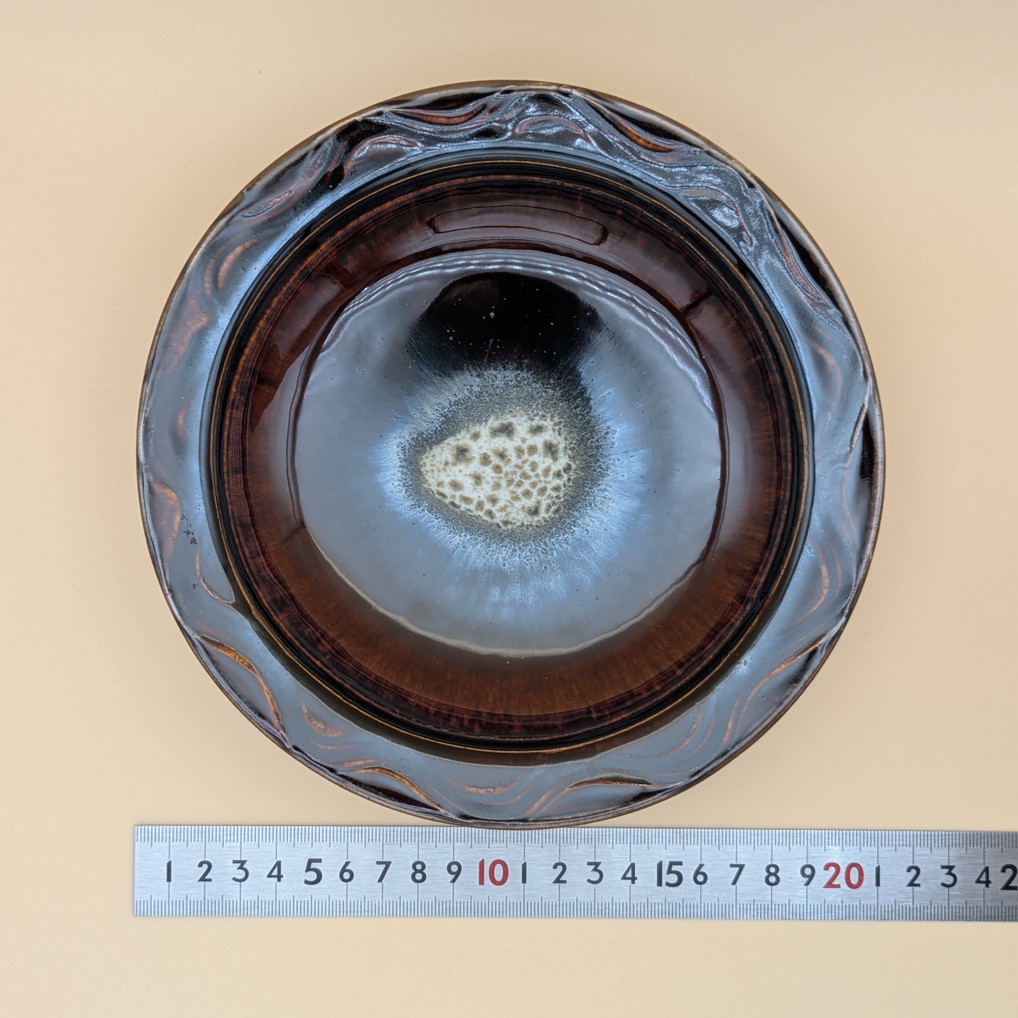 日本の伝統的な焼き物、小石原焼の盛皿です。独自の美しい飴釉に中央部の白く輝く紋様と縁の指描きの紋様が織り成すデザインは、食卓に洗練された印象を与え、料理を一層引き立てます。6.5寸サイズでくぼみもありますので、パスタやサラダなど多様な料理にマッチし、卓越した汎用性を誇ります。