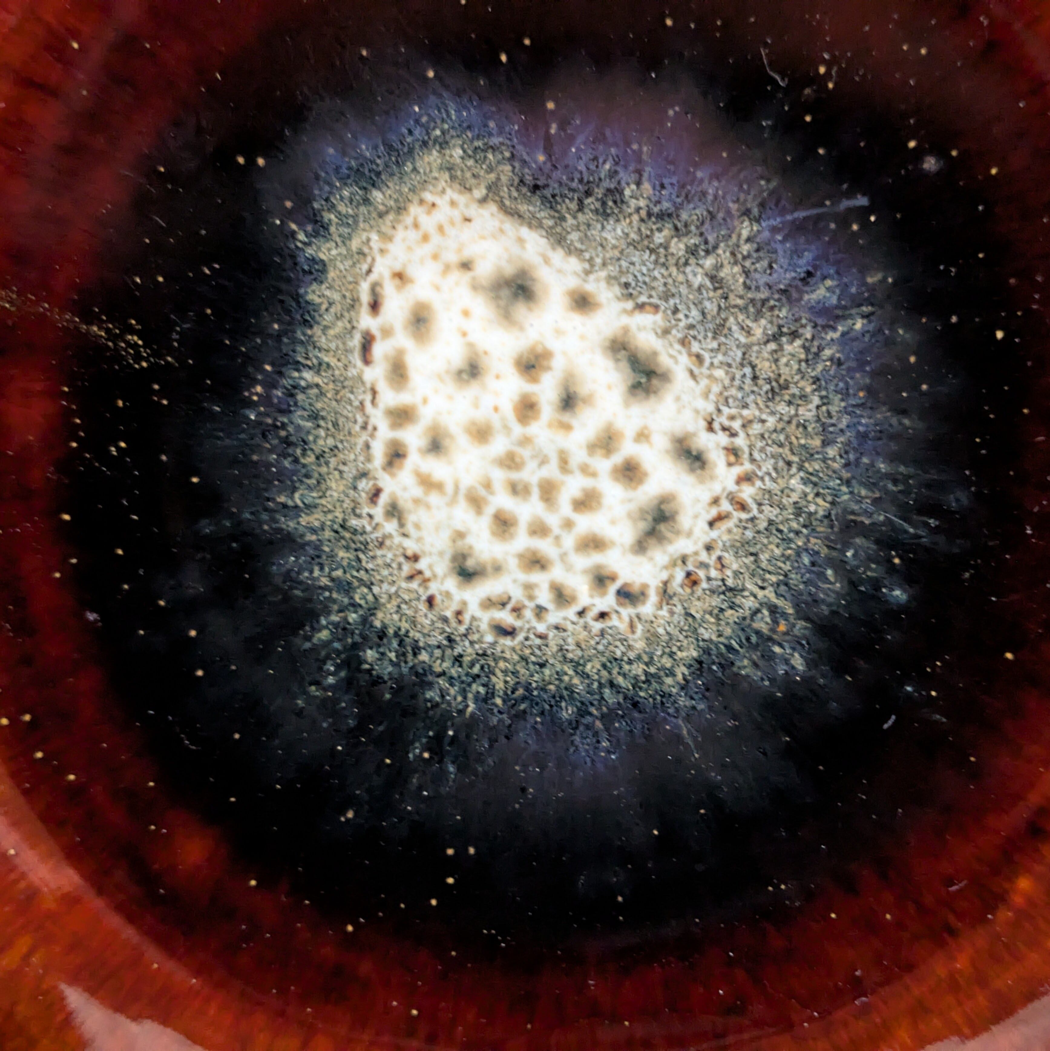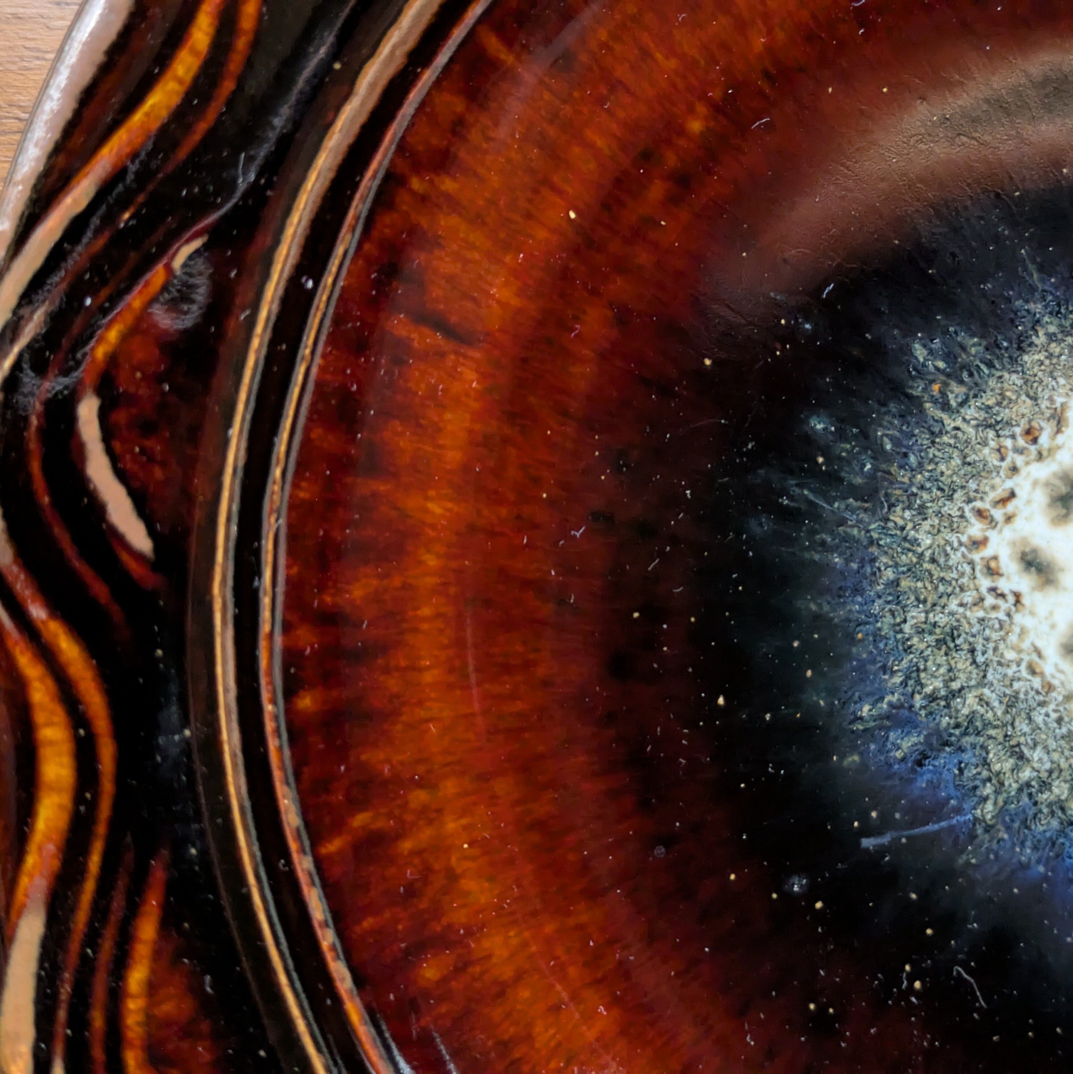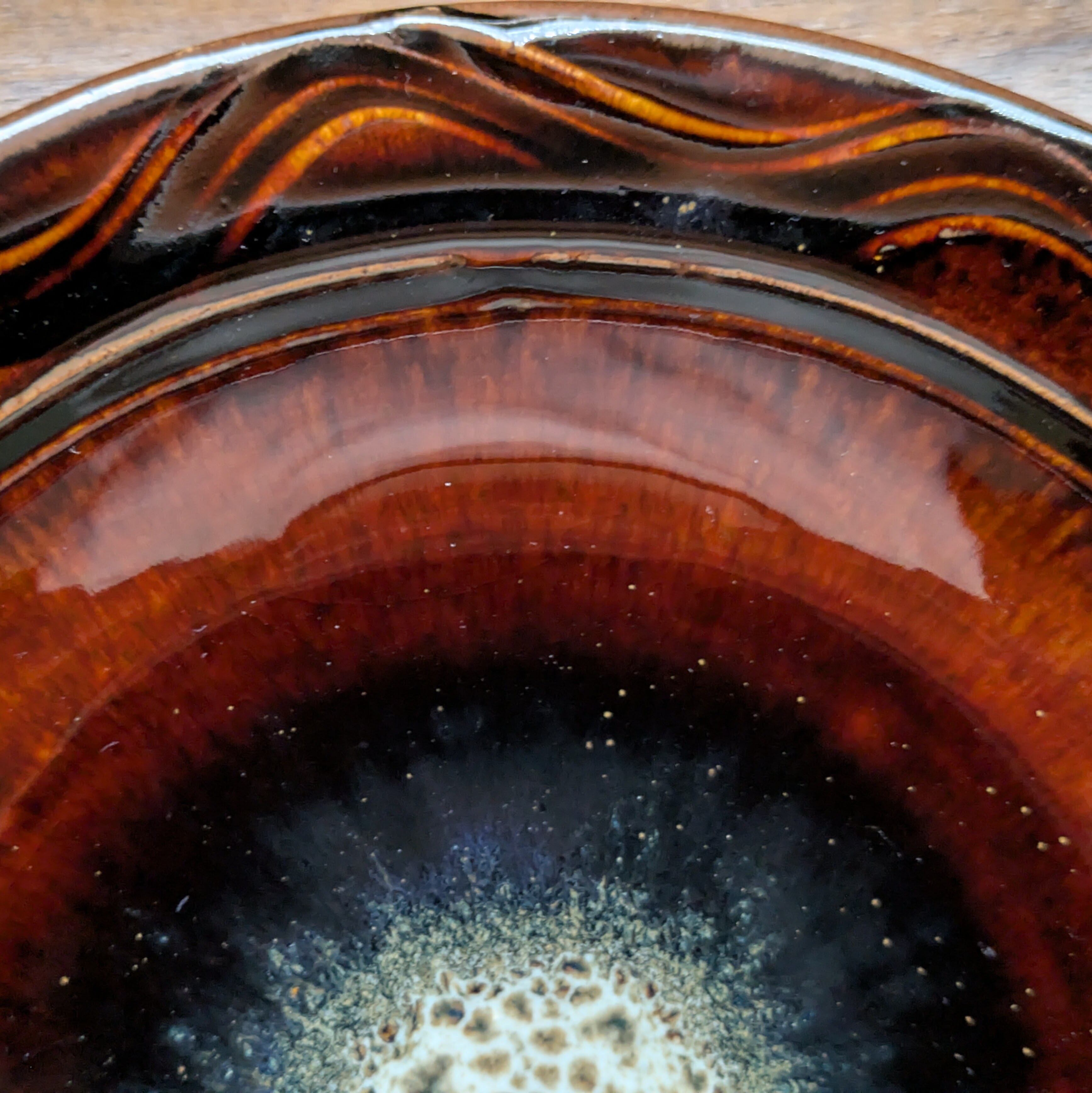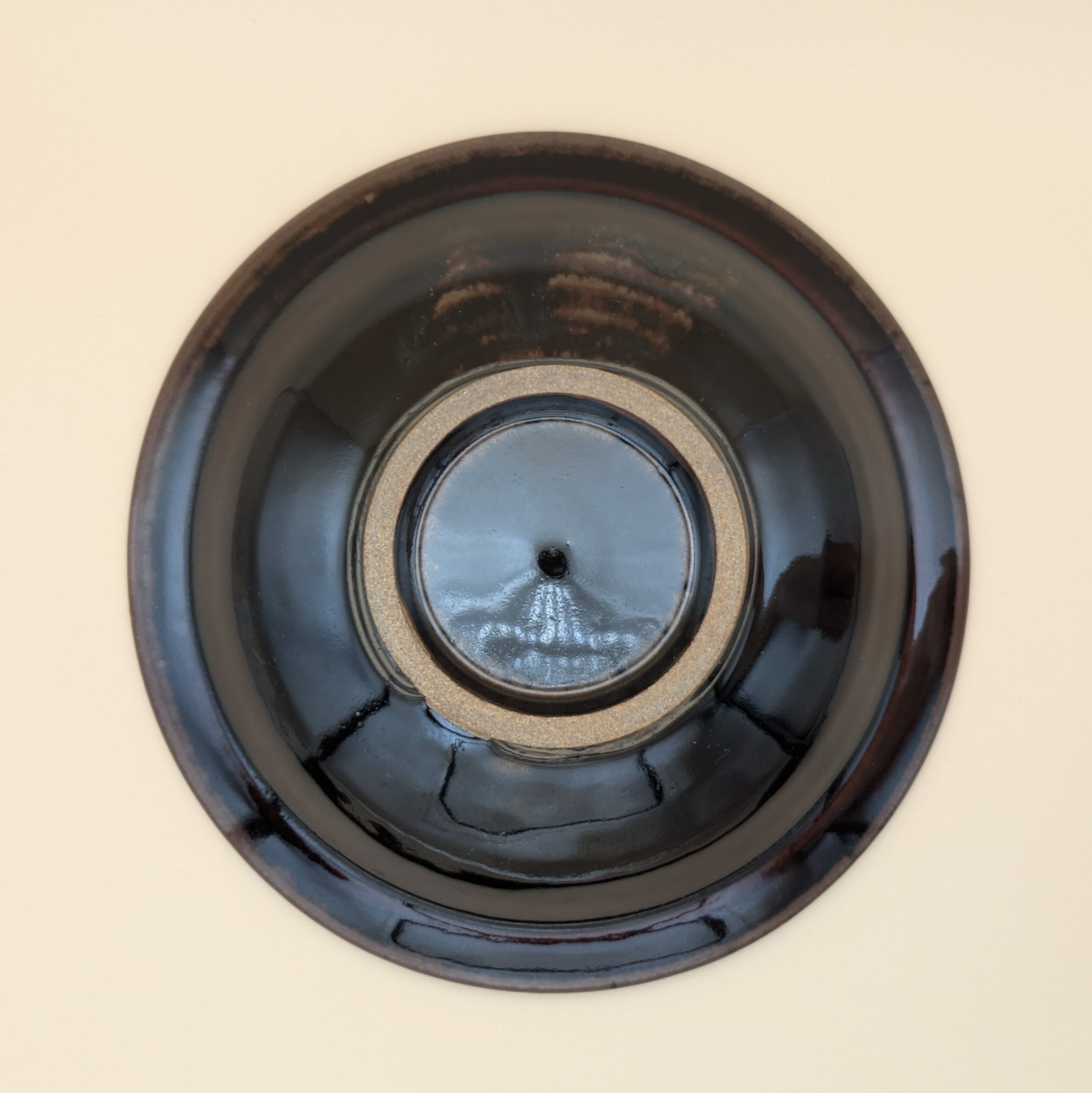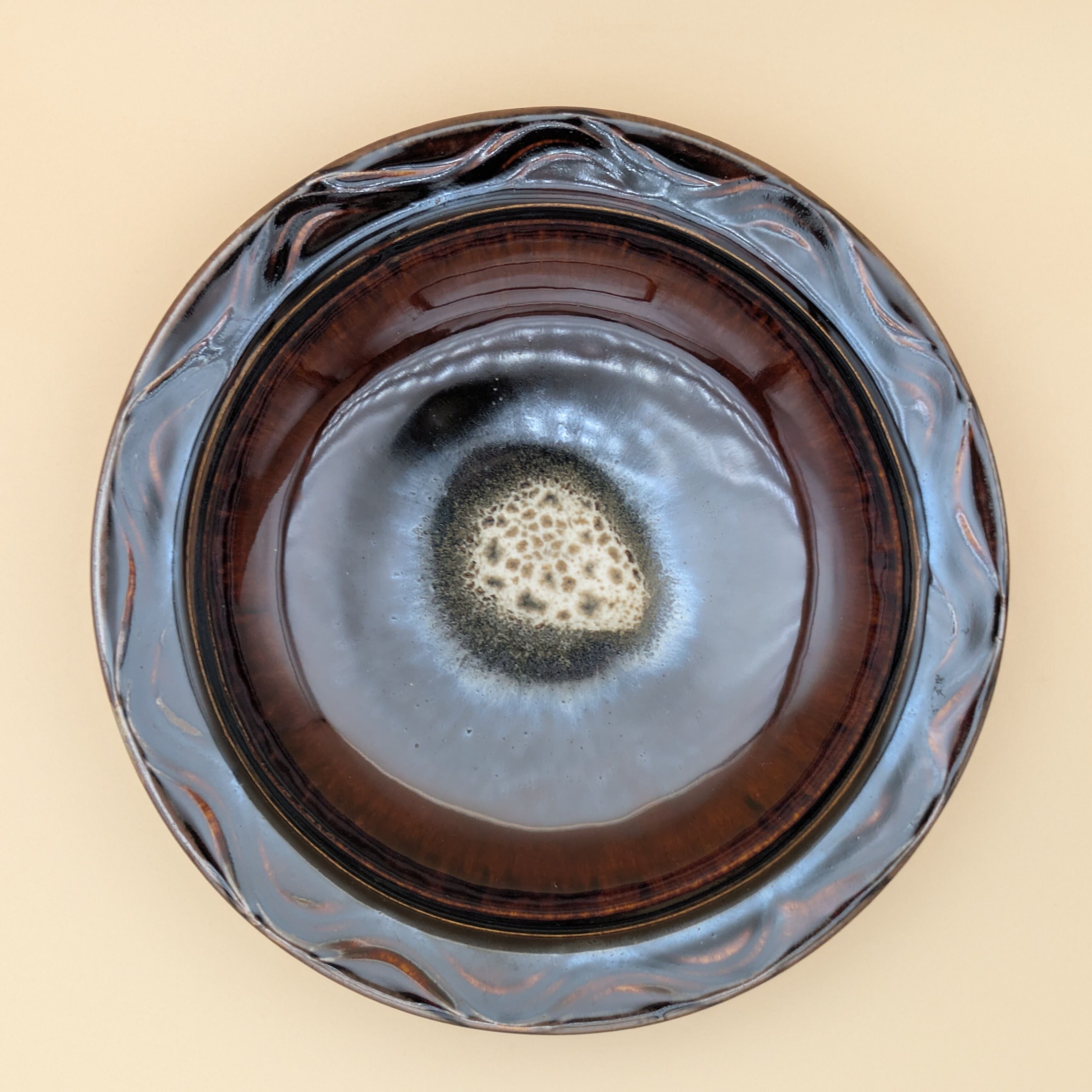 日本の伝統的な焼き物、小石原焼の盛皿です。独自の美しい飴釉に中央部の白く輝く紋様と縁の指描きの紋様が織り成すデザインは、食卓に洗練された印象を与え、料理を一層引き立てます。6.5寸サイズでくぼみもありますので、パスタやサラダなど多様な料理にマッチし、卓越した汎用性を誇ります。