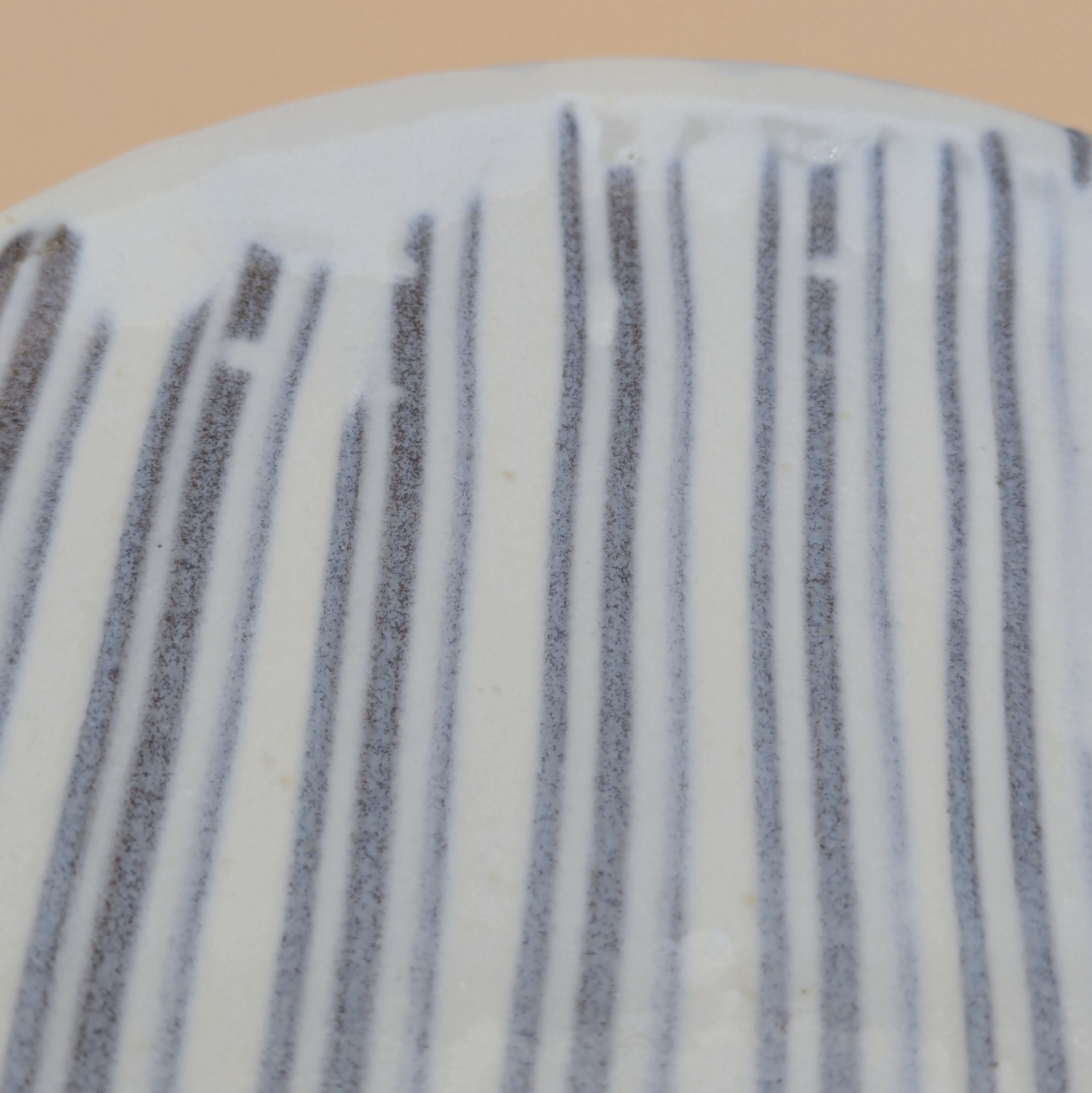 日本の伝統的な焼き物、小石原焼の平皿です。白釉に施された三線の模様が、シンプルながらも洗練された雰囲気を醸し出し、食卓に華を添えます。4.5寸サイズは、取り皿やデザート皿として最適なサイズで、日常の食卓をより一層引き立てます。
