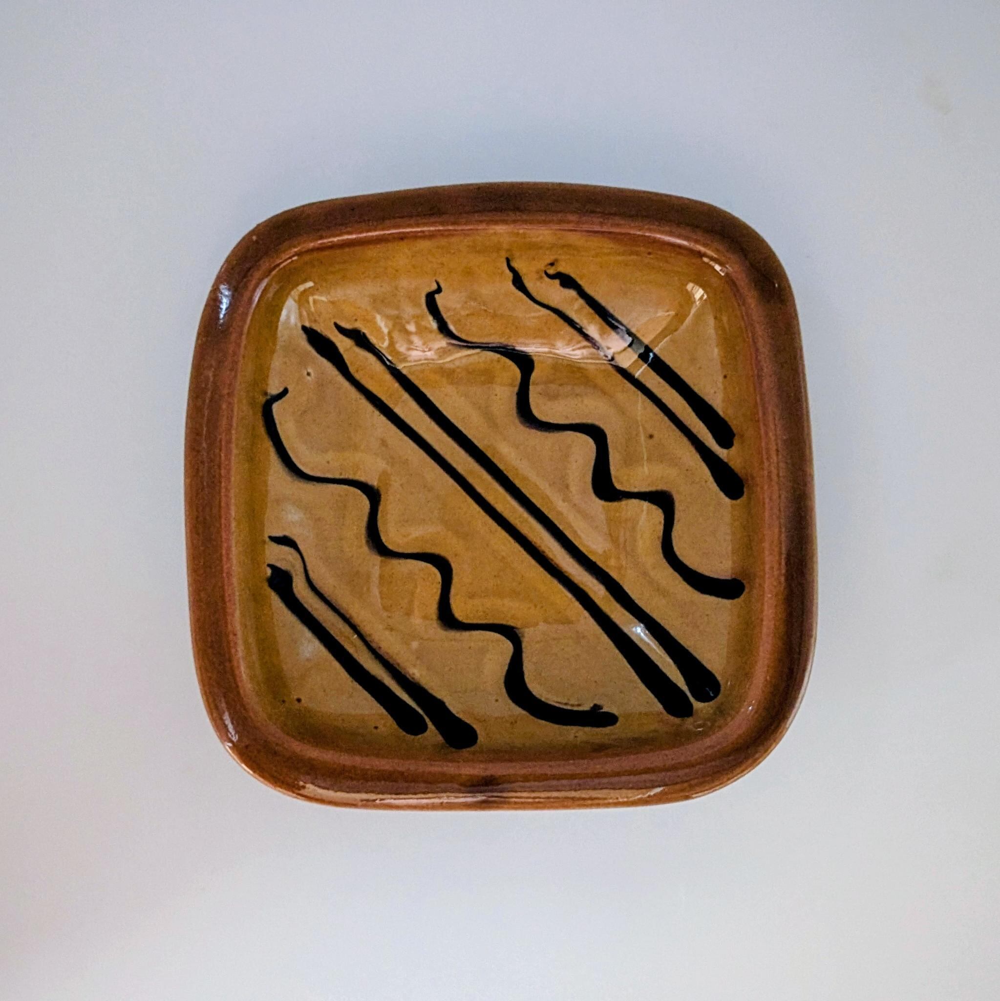 4寸角皿 湯町窯(黄釉+波紋様スリップウエア)