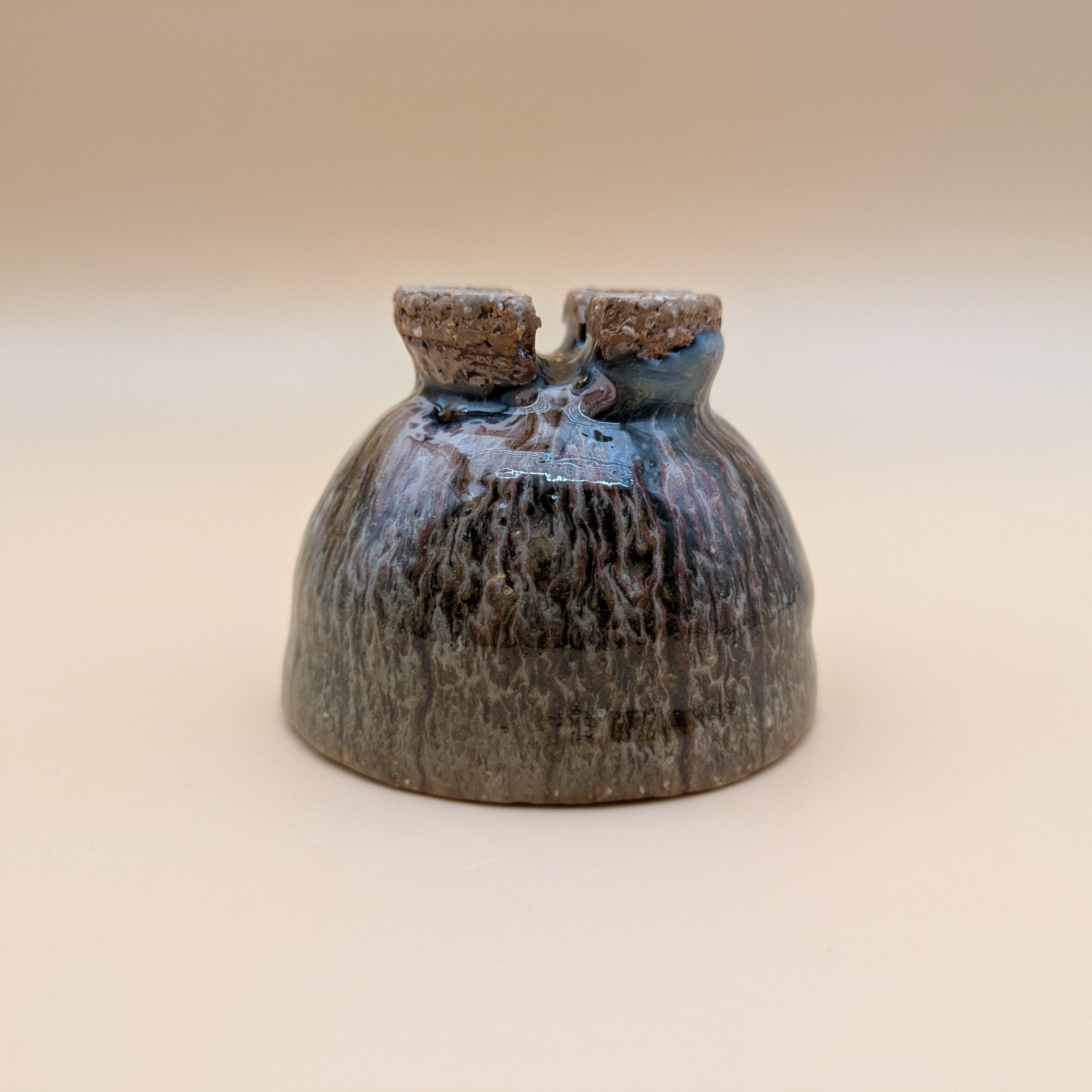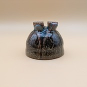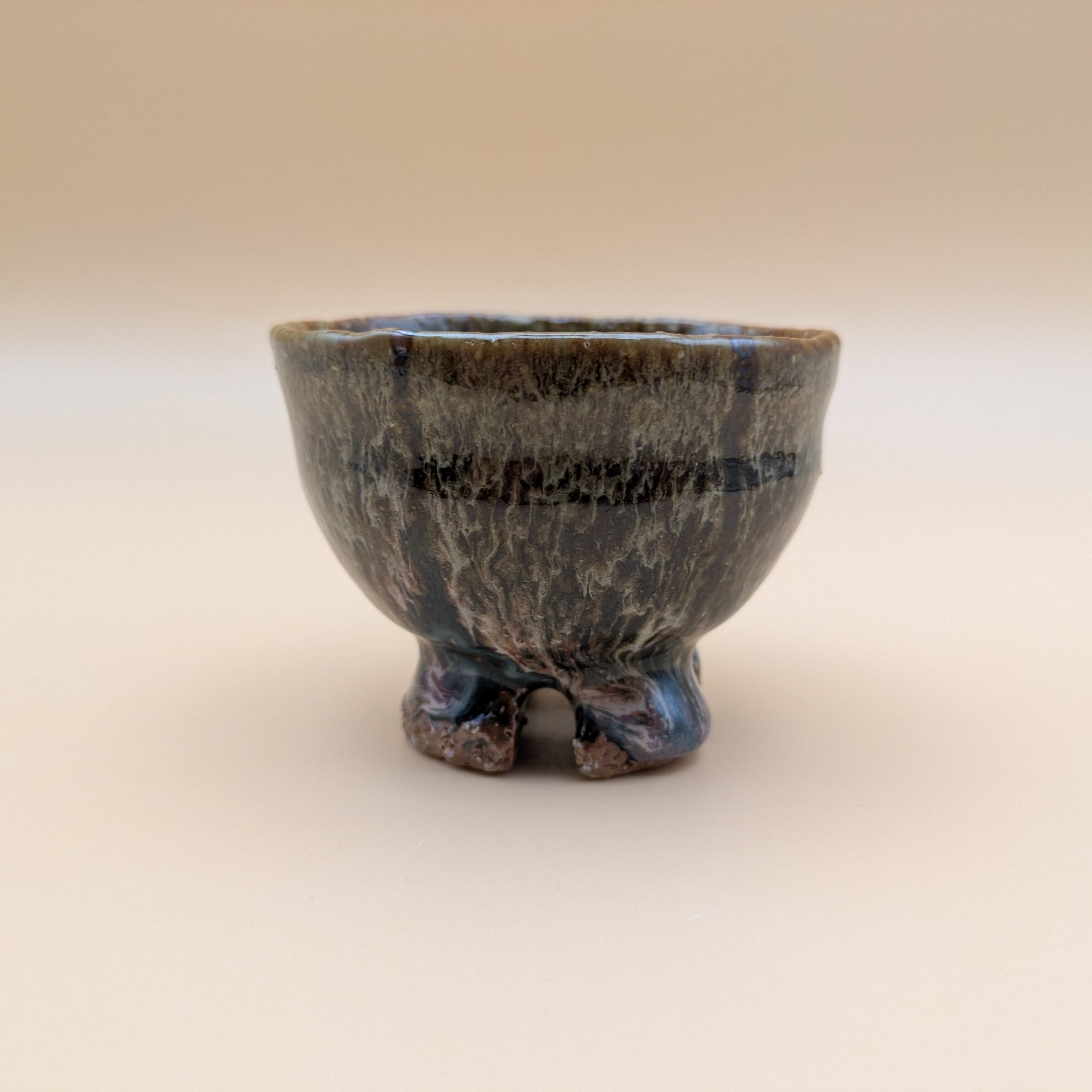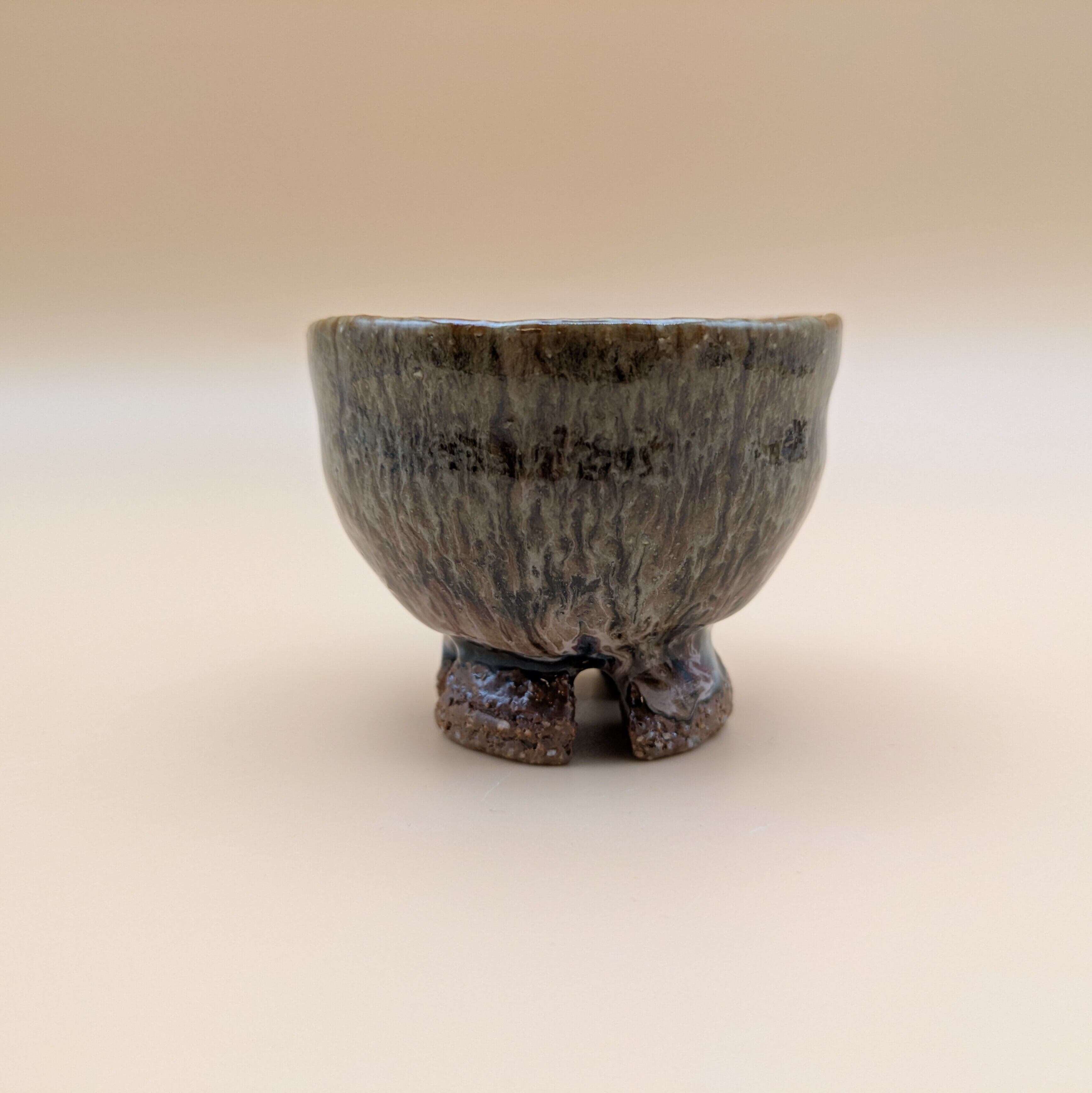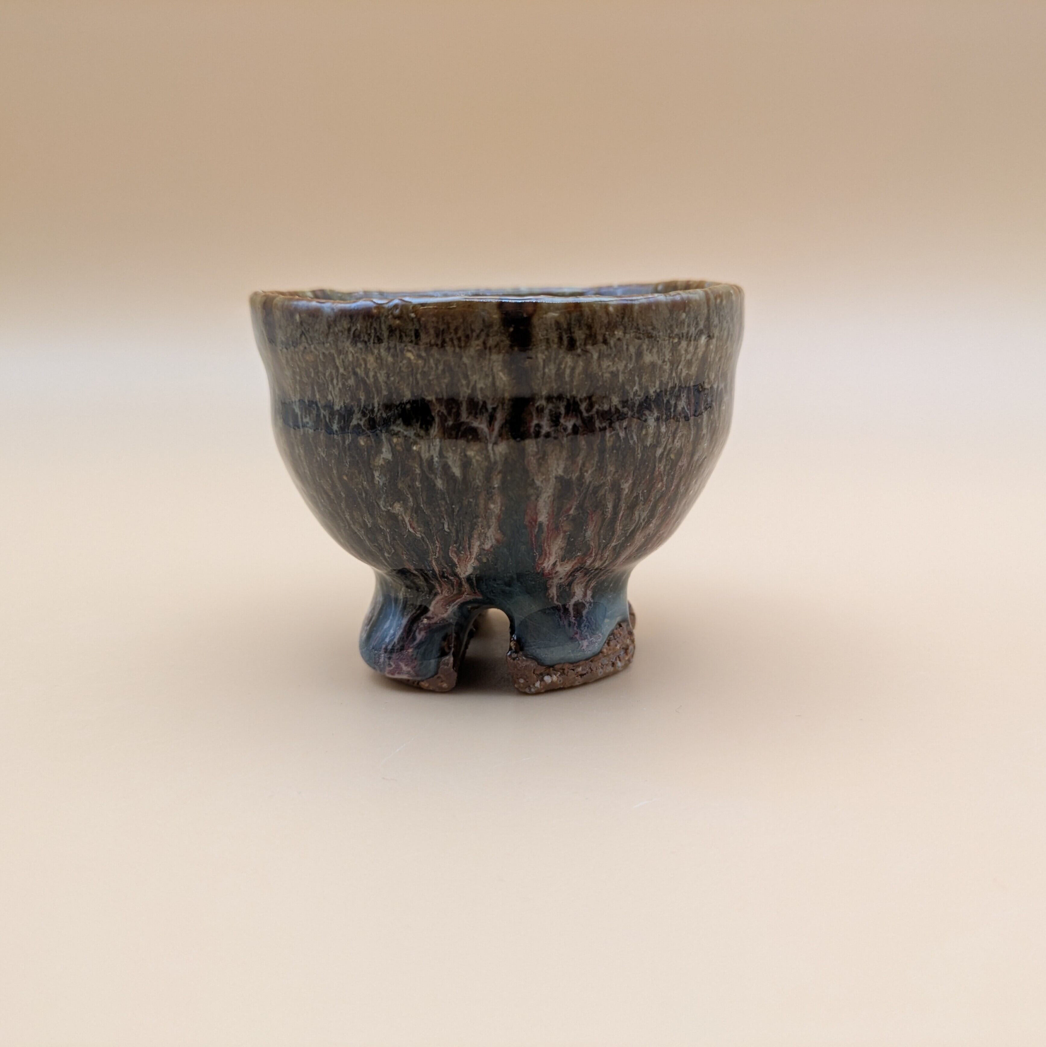魅力的なデザインの萩焼のぐい呑みです。萩焼の特徴である、釉薬が交じり合って孔雀の羽のような風合いがお酒の味わいを引き立てます。手に馴染む形状で、持ちやすく使いやすい一品です。