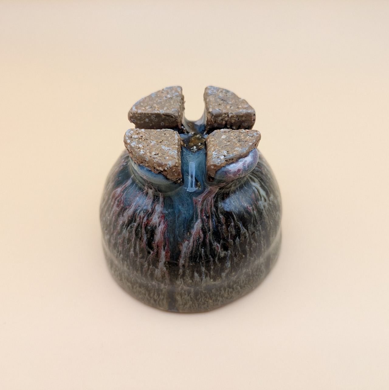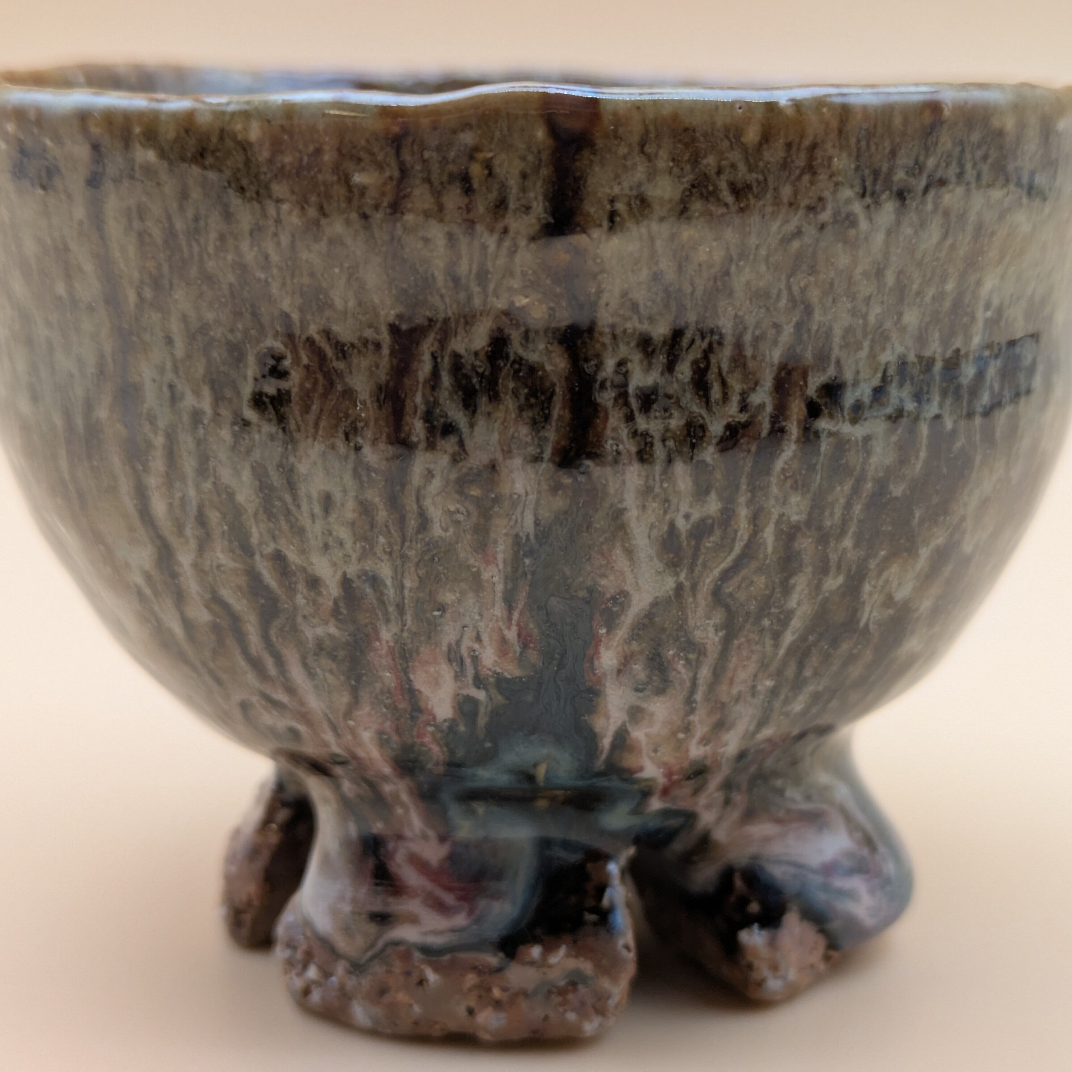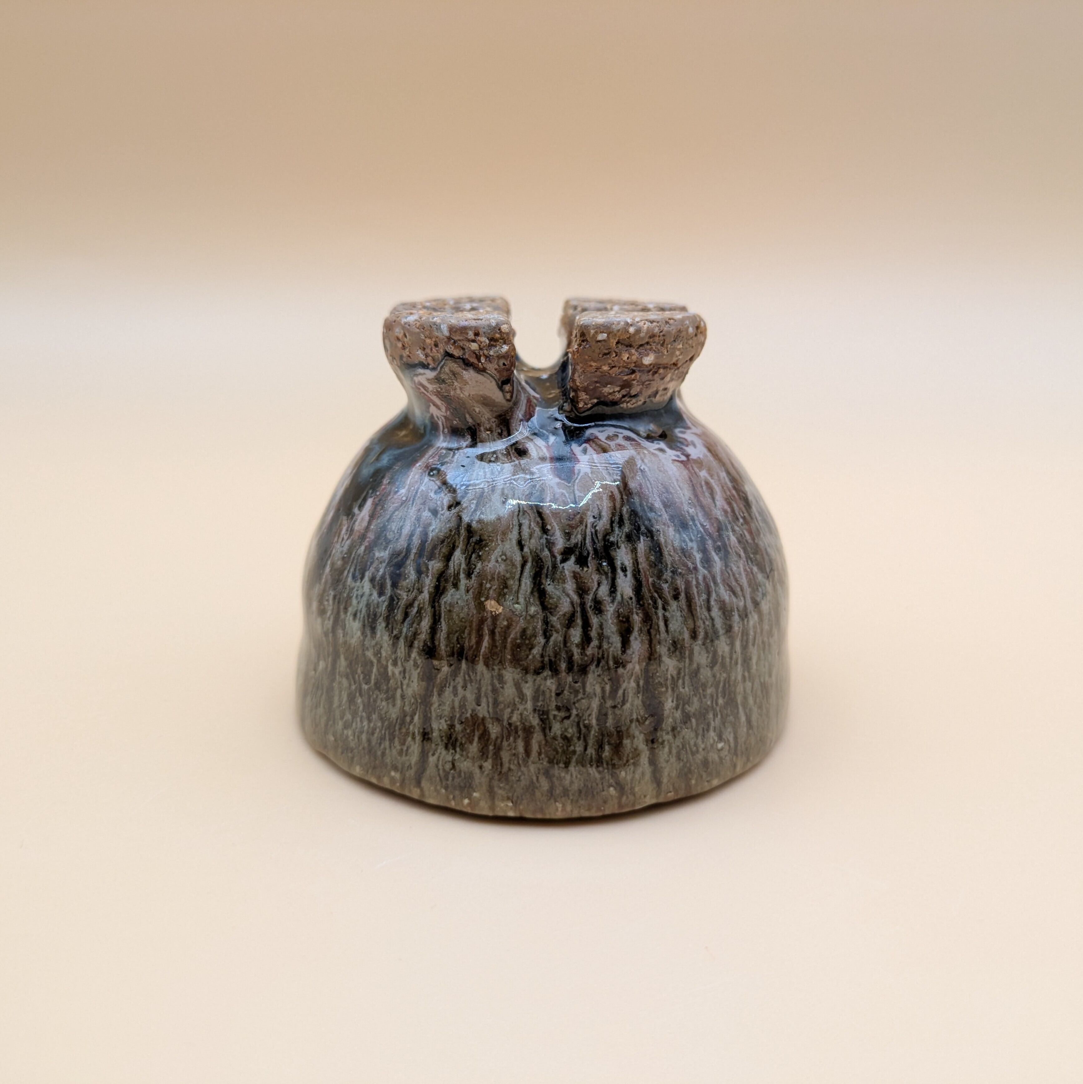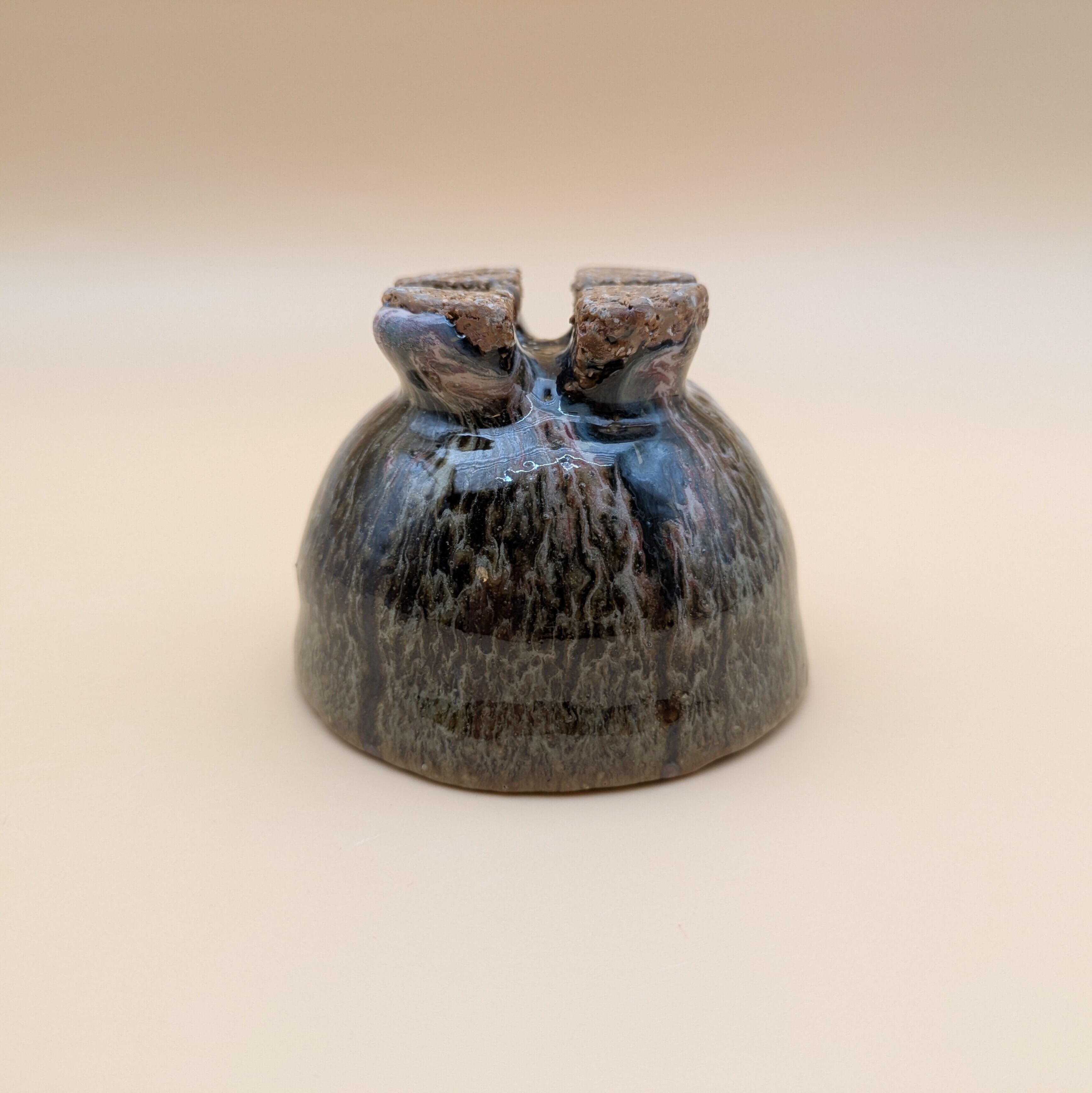 魅力的なデザインの萩焼のぐい呑みです。萩焼の特徴である、釉薬が交じり合って孔雀の羽のような風合いがお酒の味わいを引き立てます。手に馴染む形状で、持ちやすく使いやすい一品です。