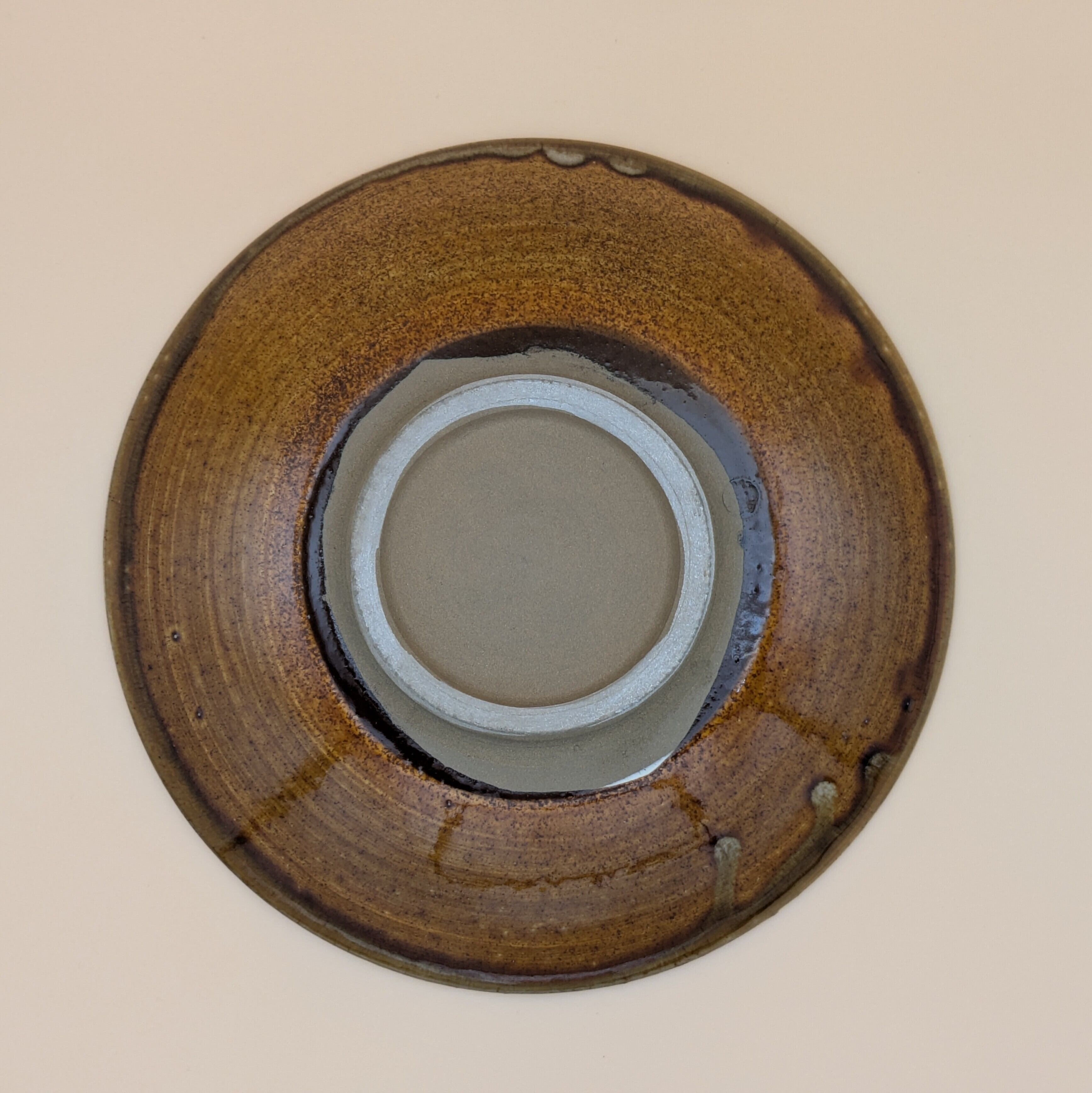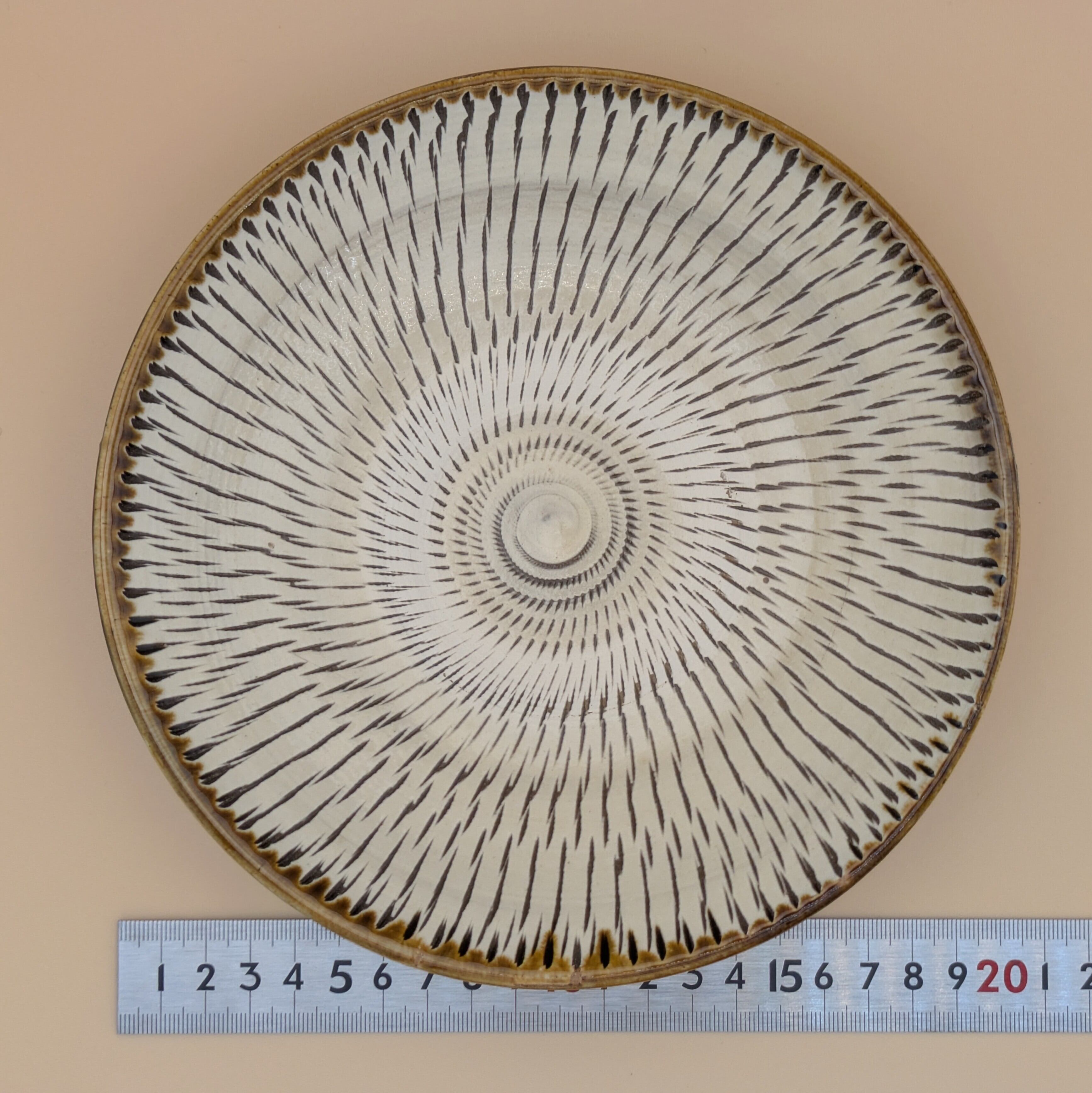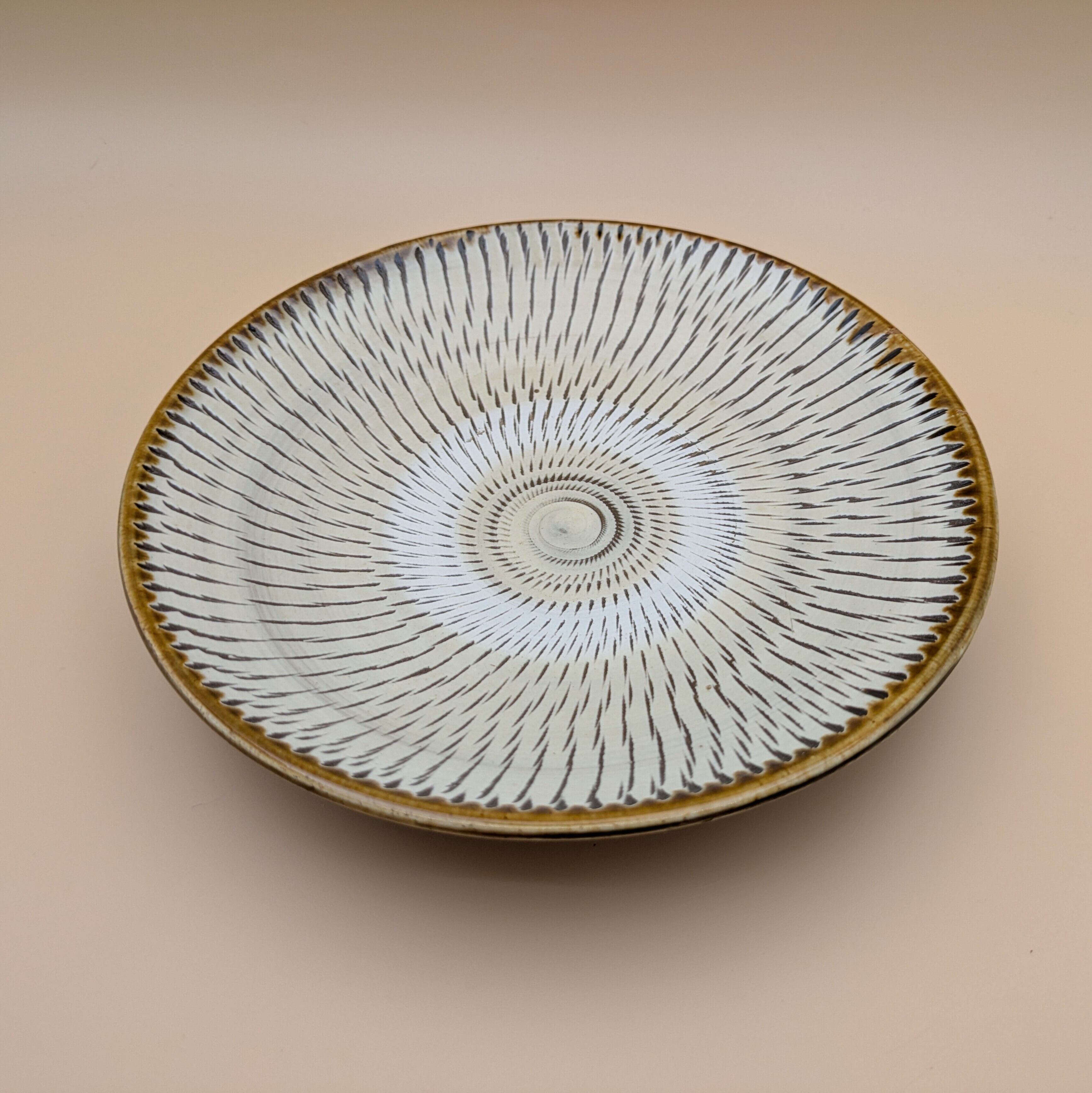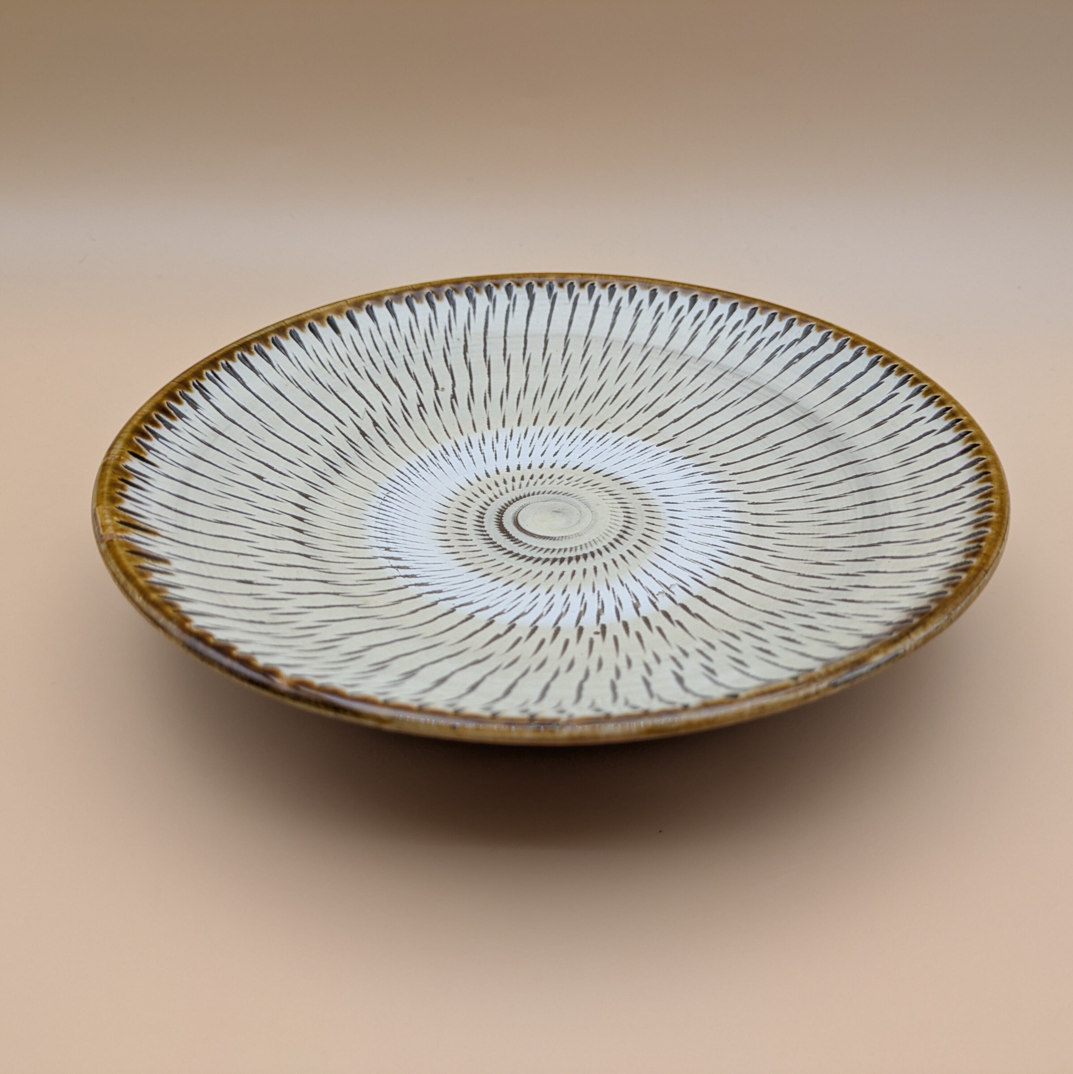 平皿6.5寸 小鹿田焼(縁茶・白飛び鉋) 直径19.8cm 高さ3.8cm 重量438g