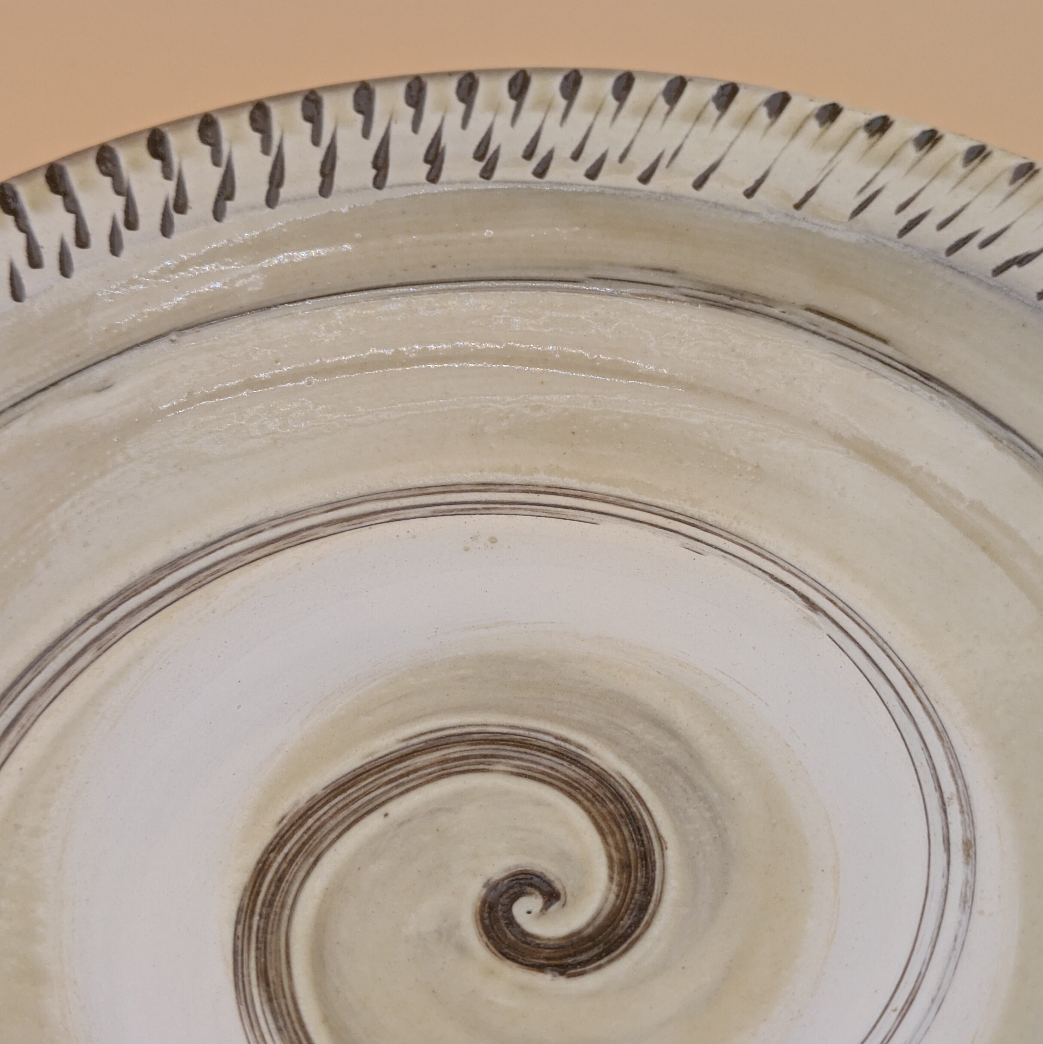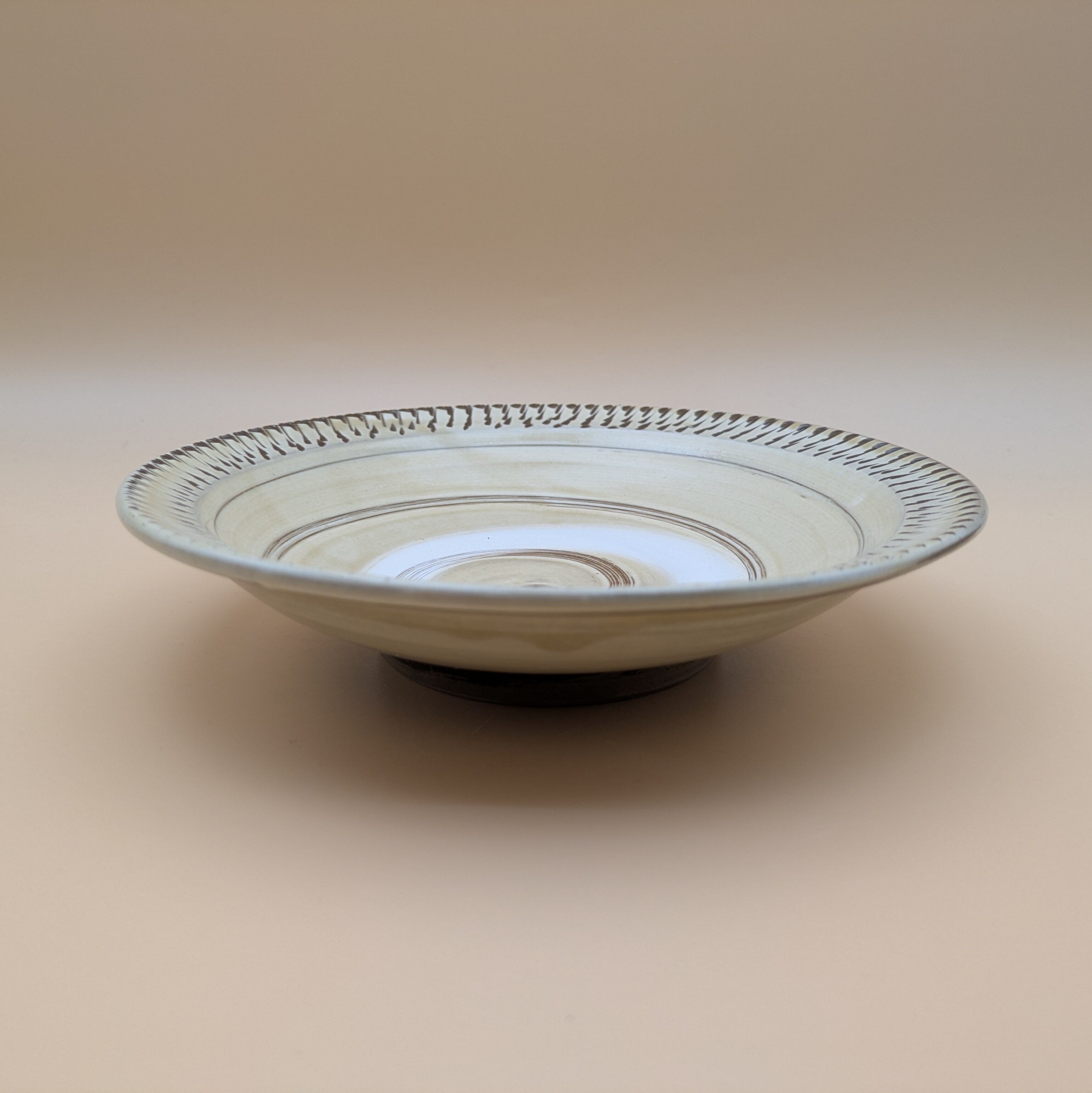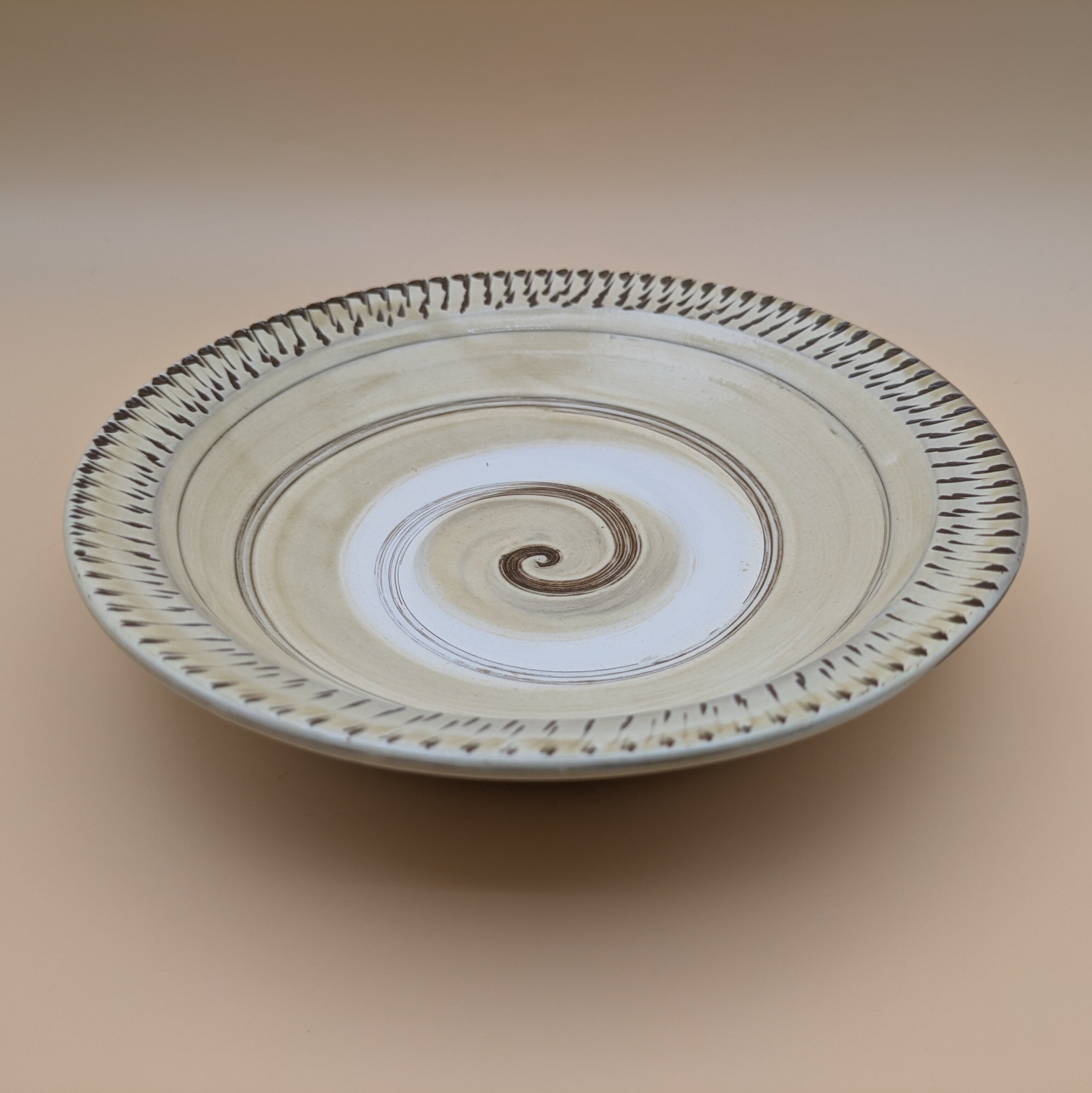 縁に施された飛び鉋の模様が、食卓に上品な彩りを添えます。また、内面に描かれた渦巻き模様が、料理の見栄えを一段と引き立てます。大小のお料理を盛り付けるのに適したサイズで、美食を演出する一皿となることでしょう。