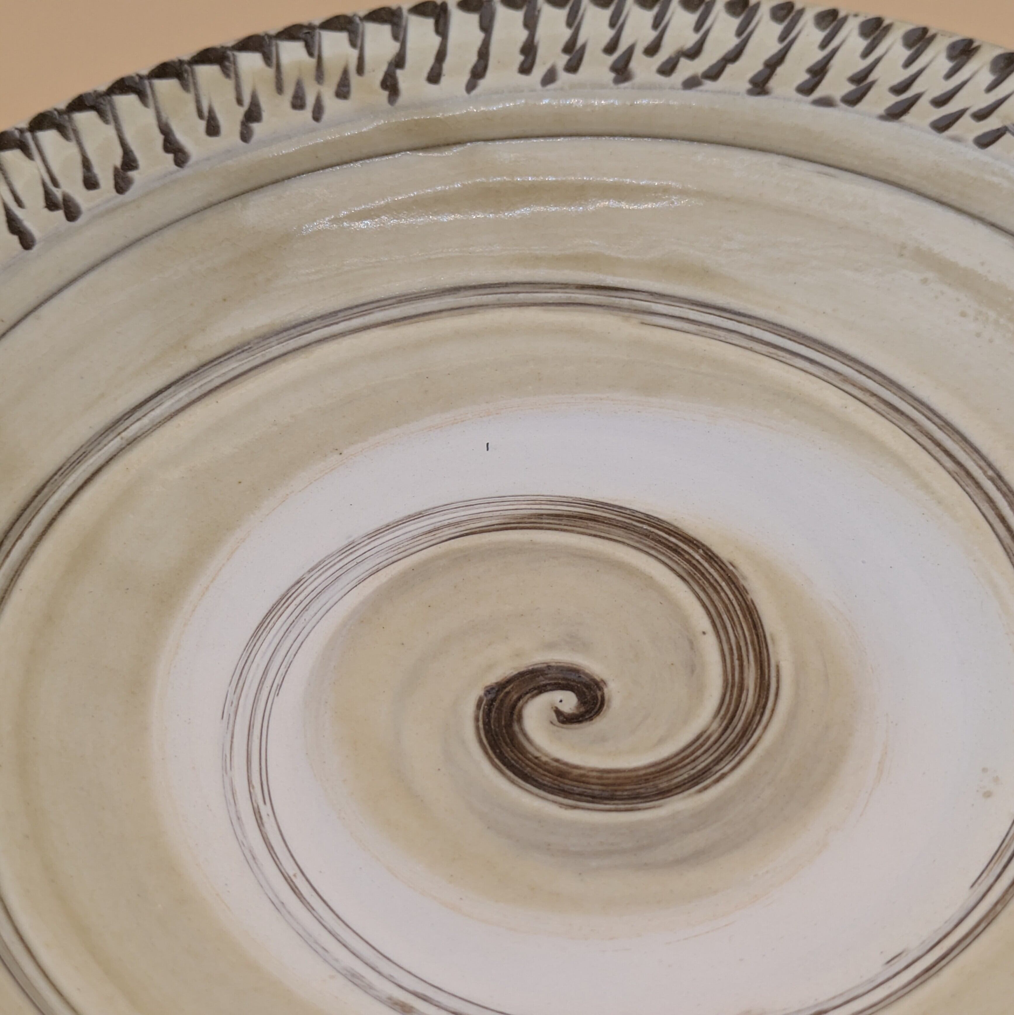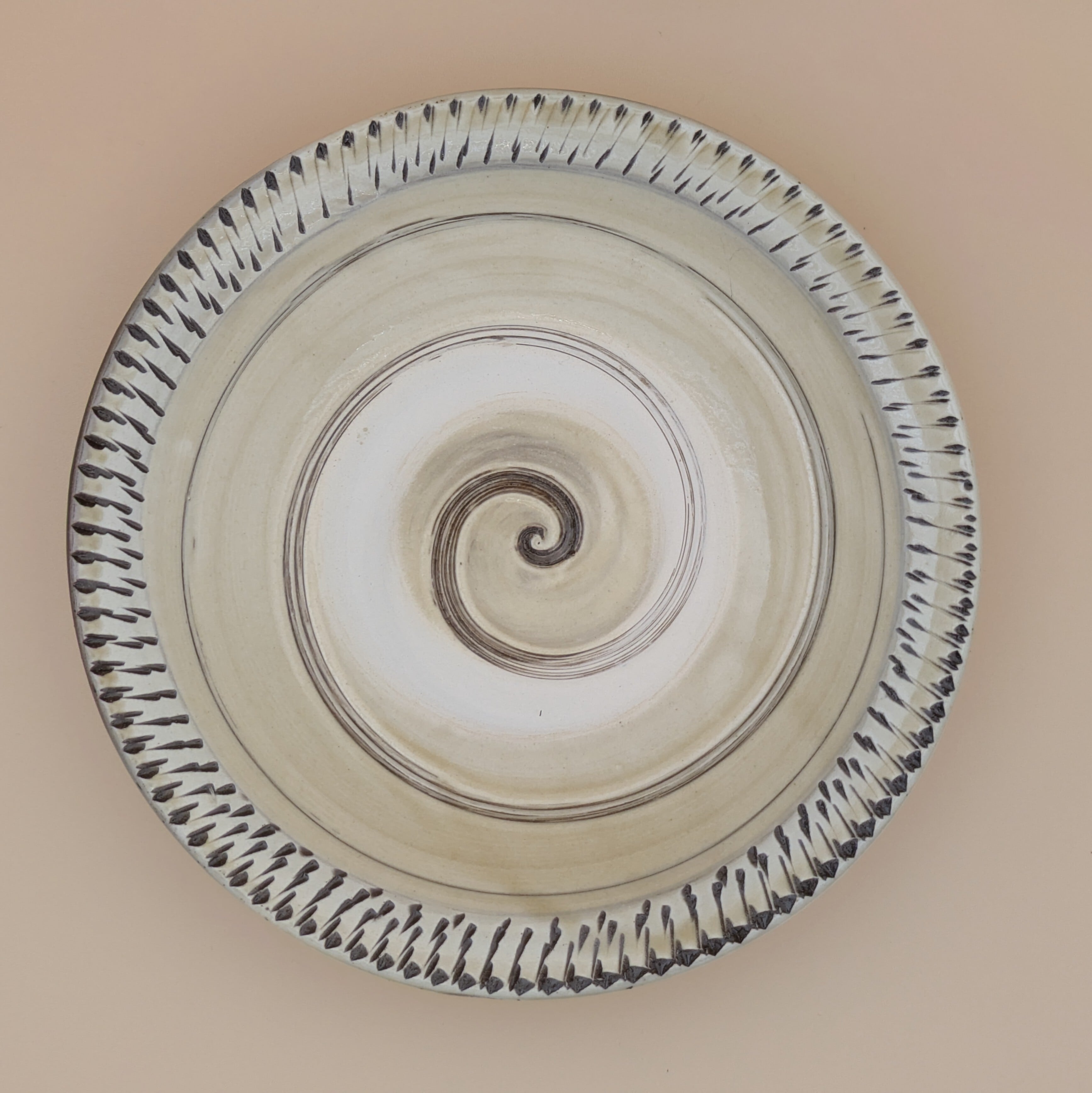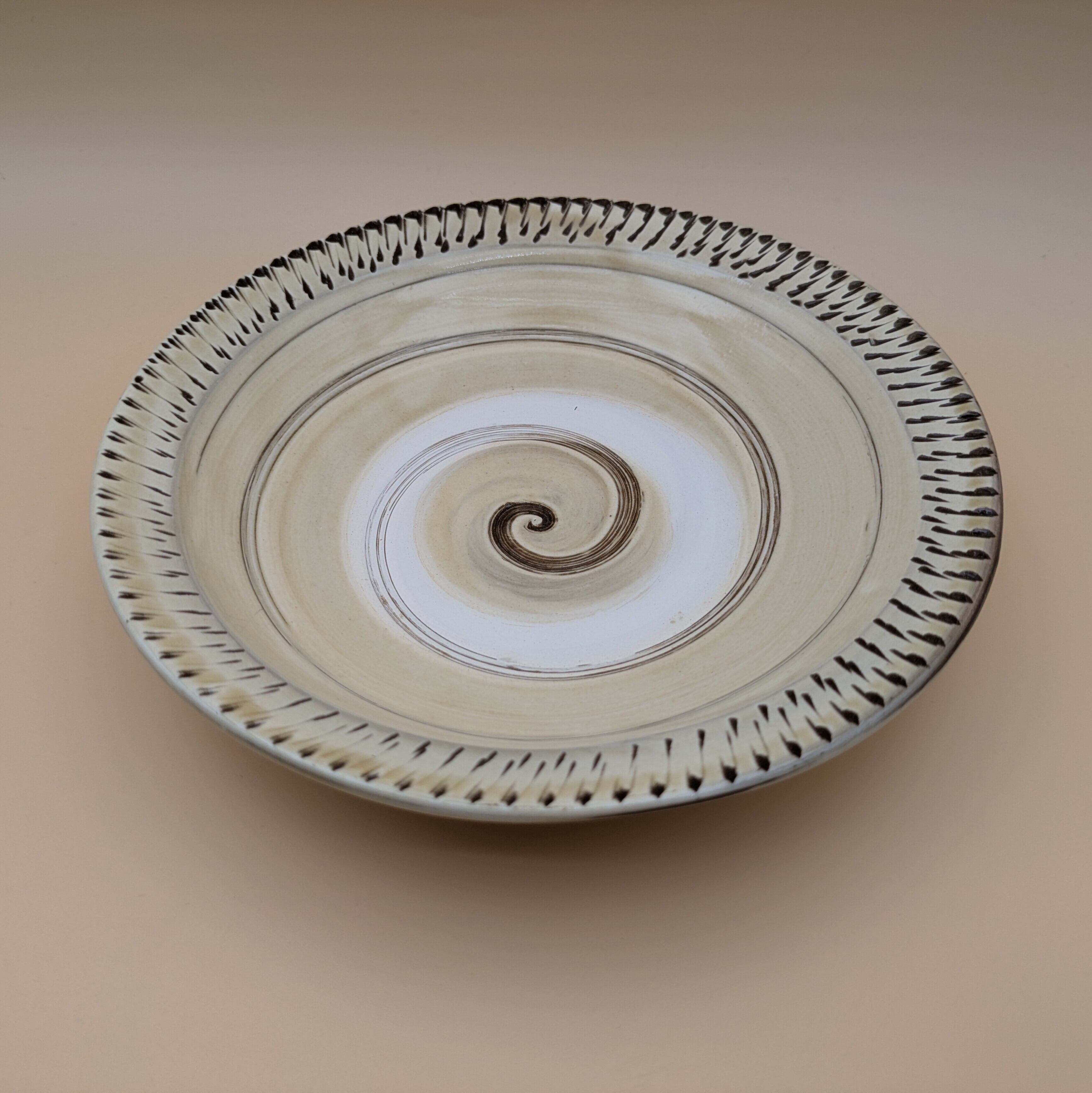 縁に施された飛び鉋の模様が、食卓に上品な彩りを添えます。また、内面に描かれた渦巻き模様が、料理の見栄えを一段と引き立てます。大小のお料理を盛り付けるのに適したサイズで、美食を演出する一皿となることでしょう。