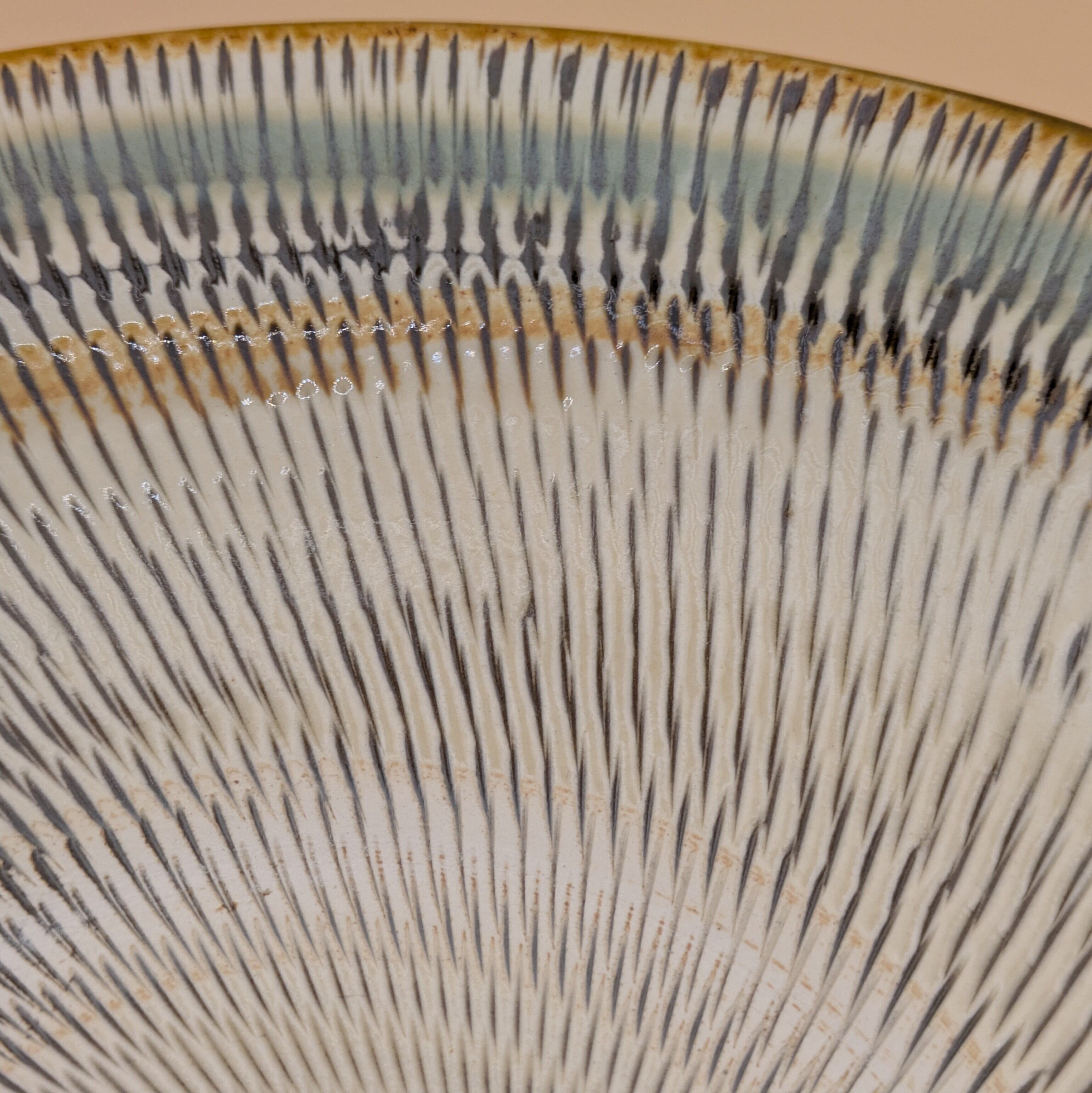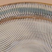 縁の三彩が、食卓に上品な彩りを添えます。また、全面に描かれた飛び鉋の模様が、料理の見栄えを一段と引き立てます。大小のお料理を盛り付けるのに適したサイズで、美食を演出する一皿となることでしょう。