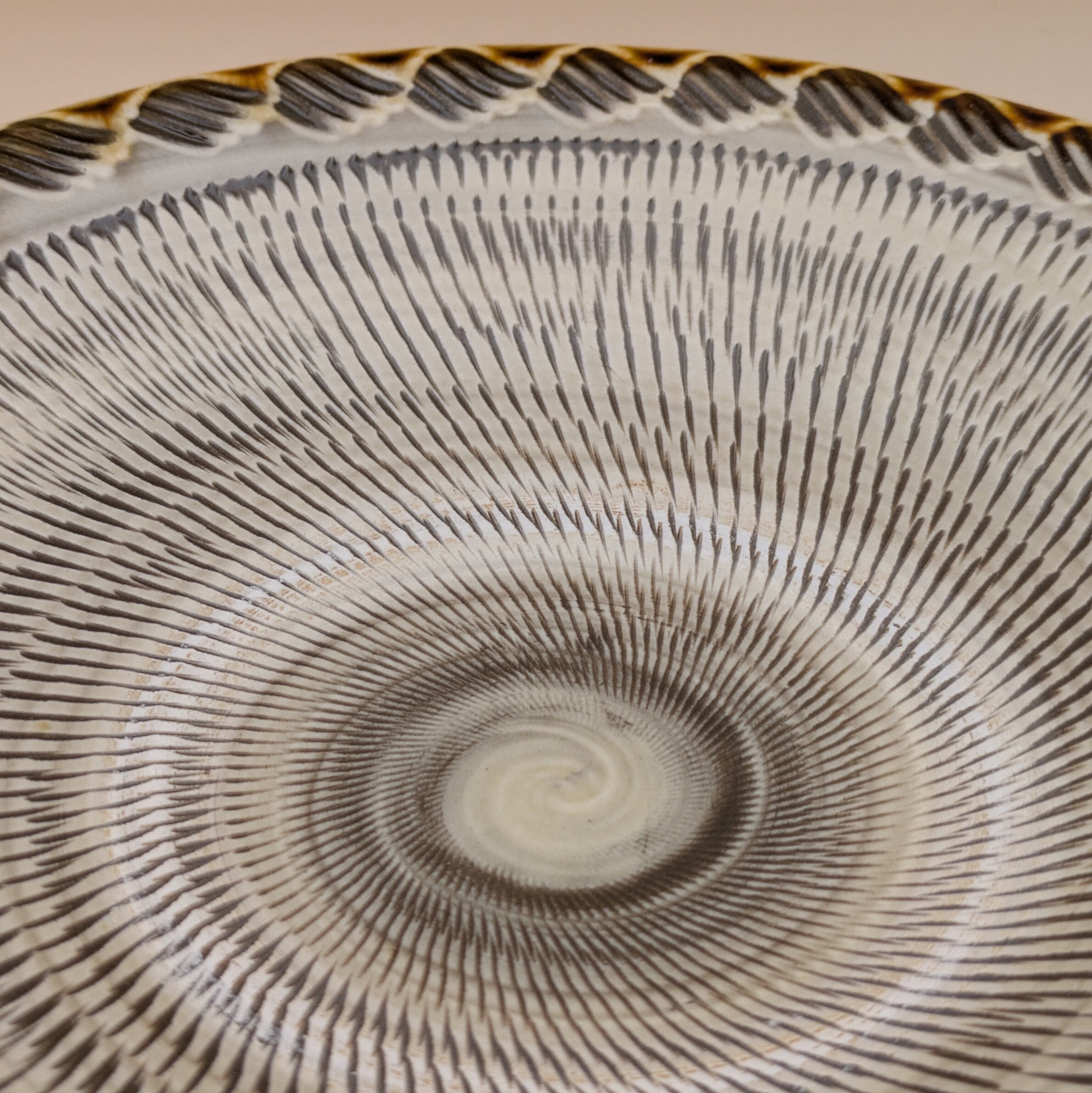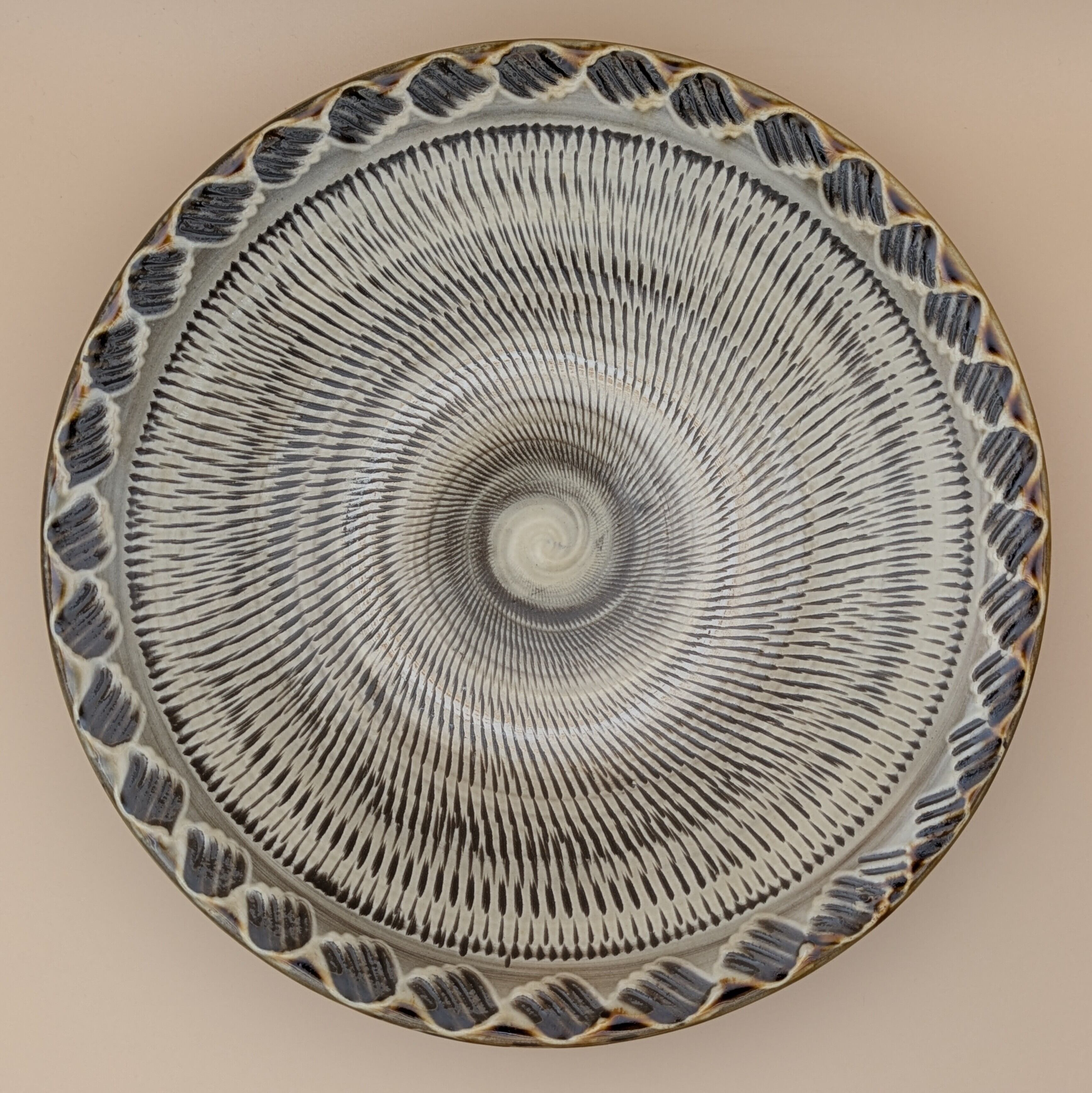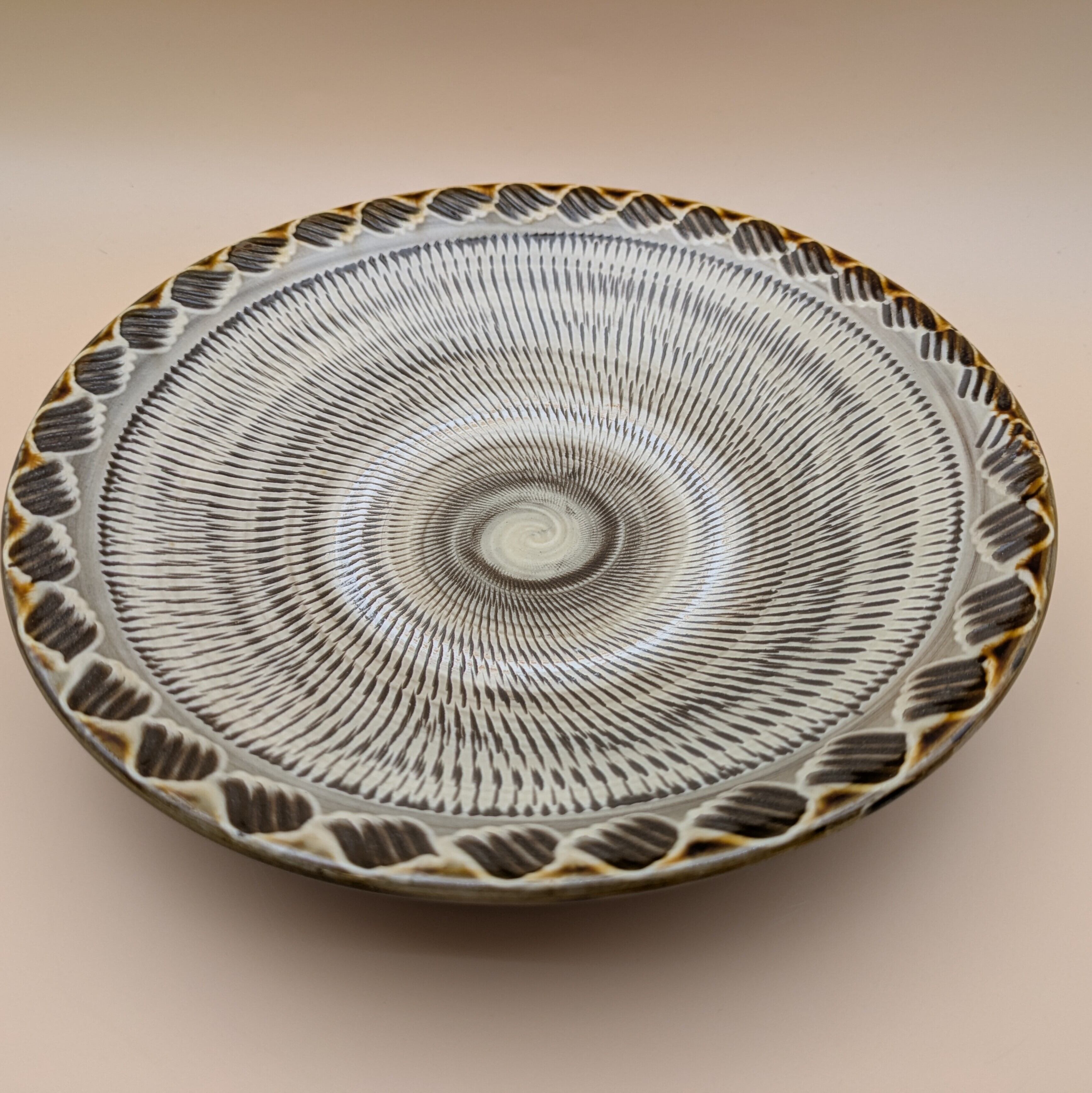 縁の模様が、食卓に上品な彩りを添えます。また、飛び鉋の模様が、料理の見栄えを一段と引き立てます。大小のお料理を盛り付けるのに適したサイズで、美食を演出する一皿となることでしょう。