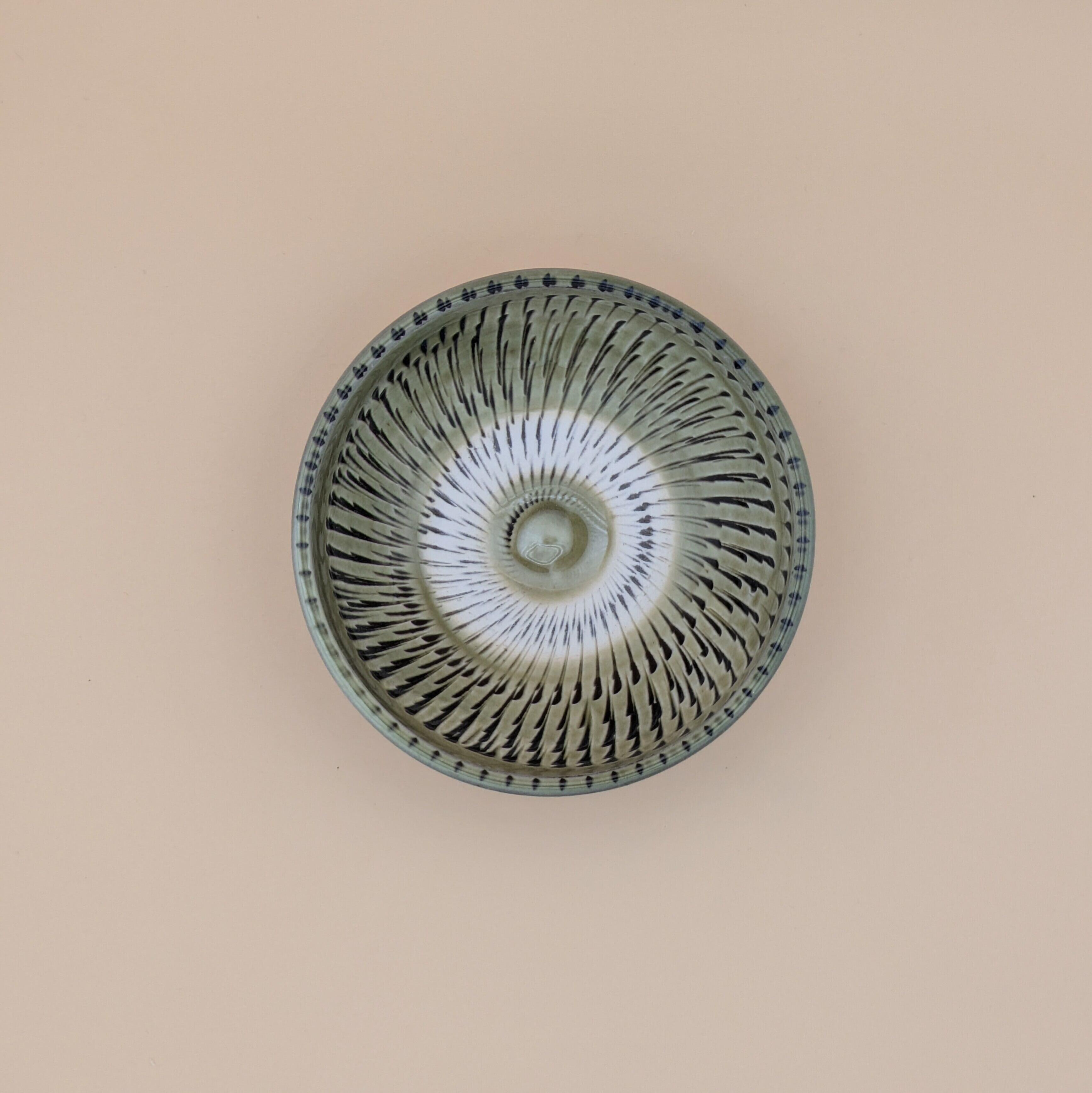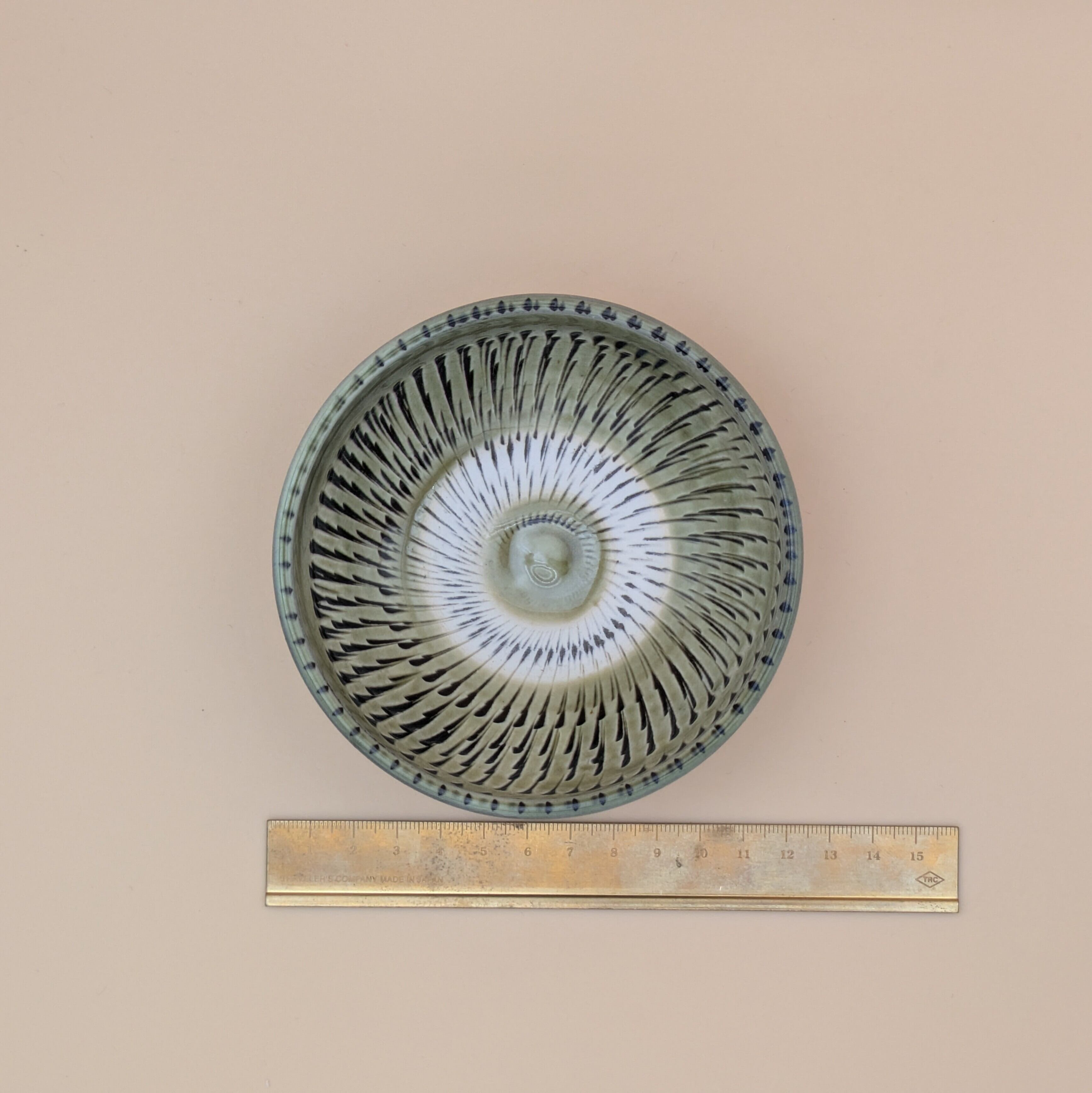 日本の伝統的な焼き物である小鹿田焼を使用した、美しい取り皿です。独特の鮮やかな色合いと、緻密な模様が特徴で、食卓を上品に演出してくれます。表裏全面に、飛び鉋という技法を施してあり、細部にまでこだわっています。