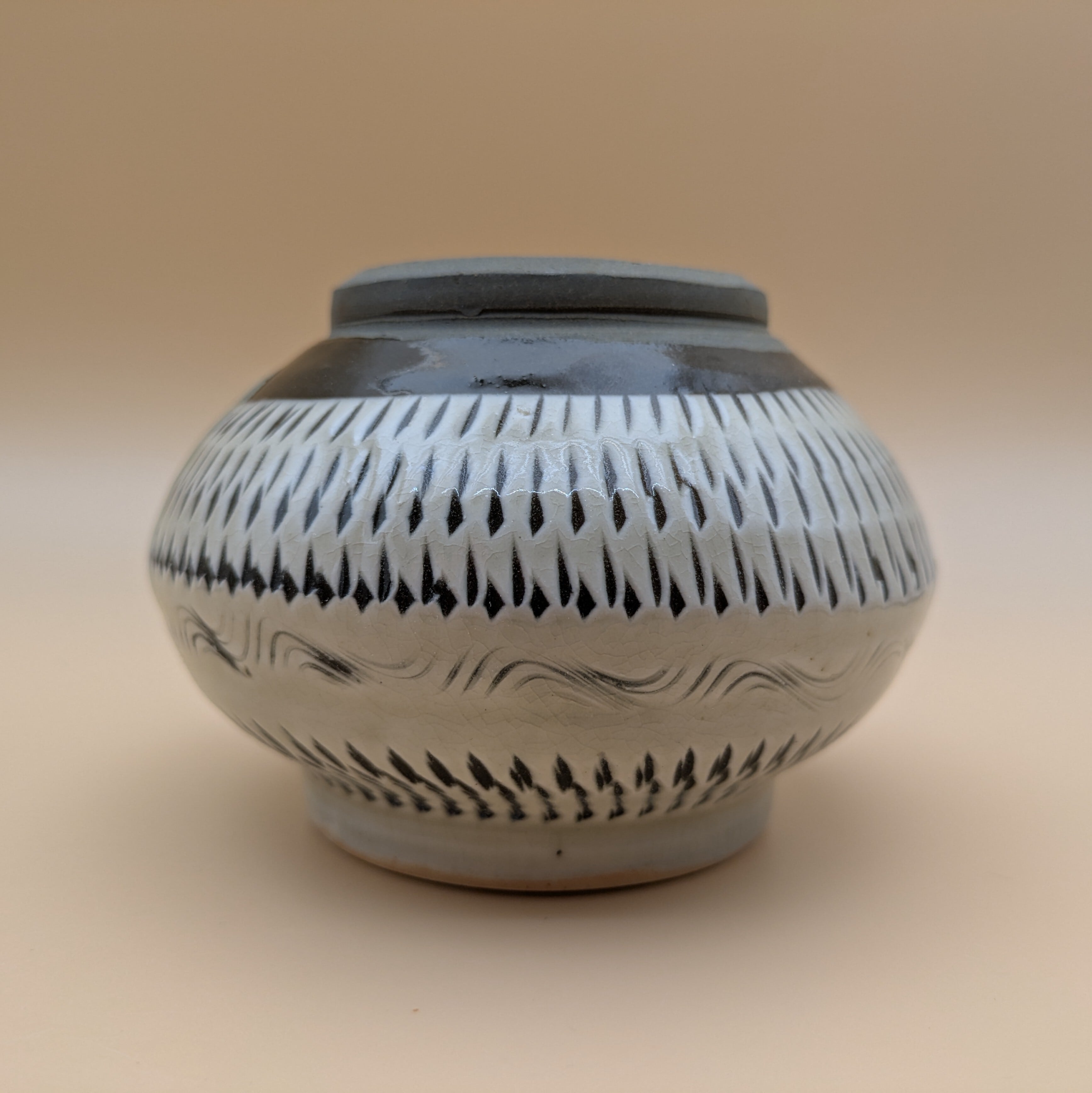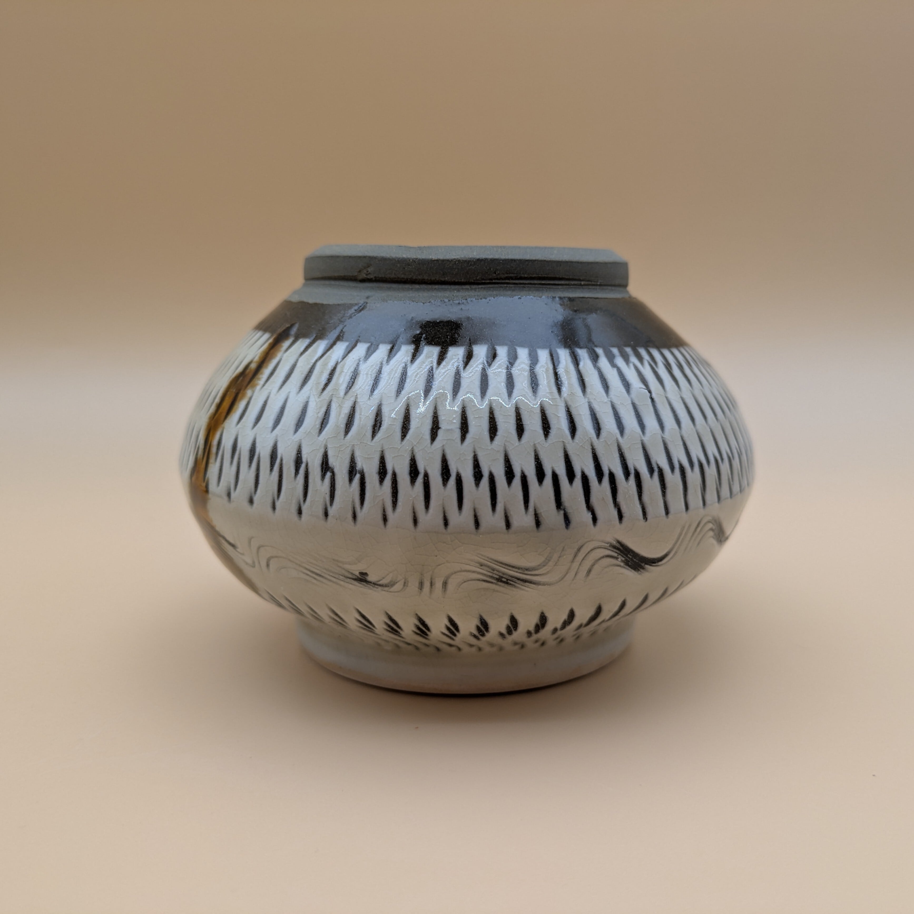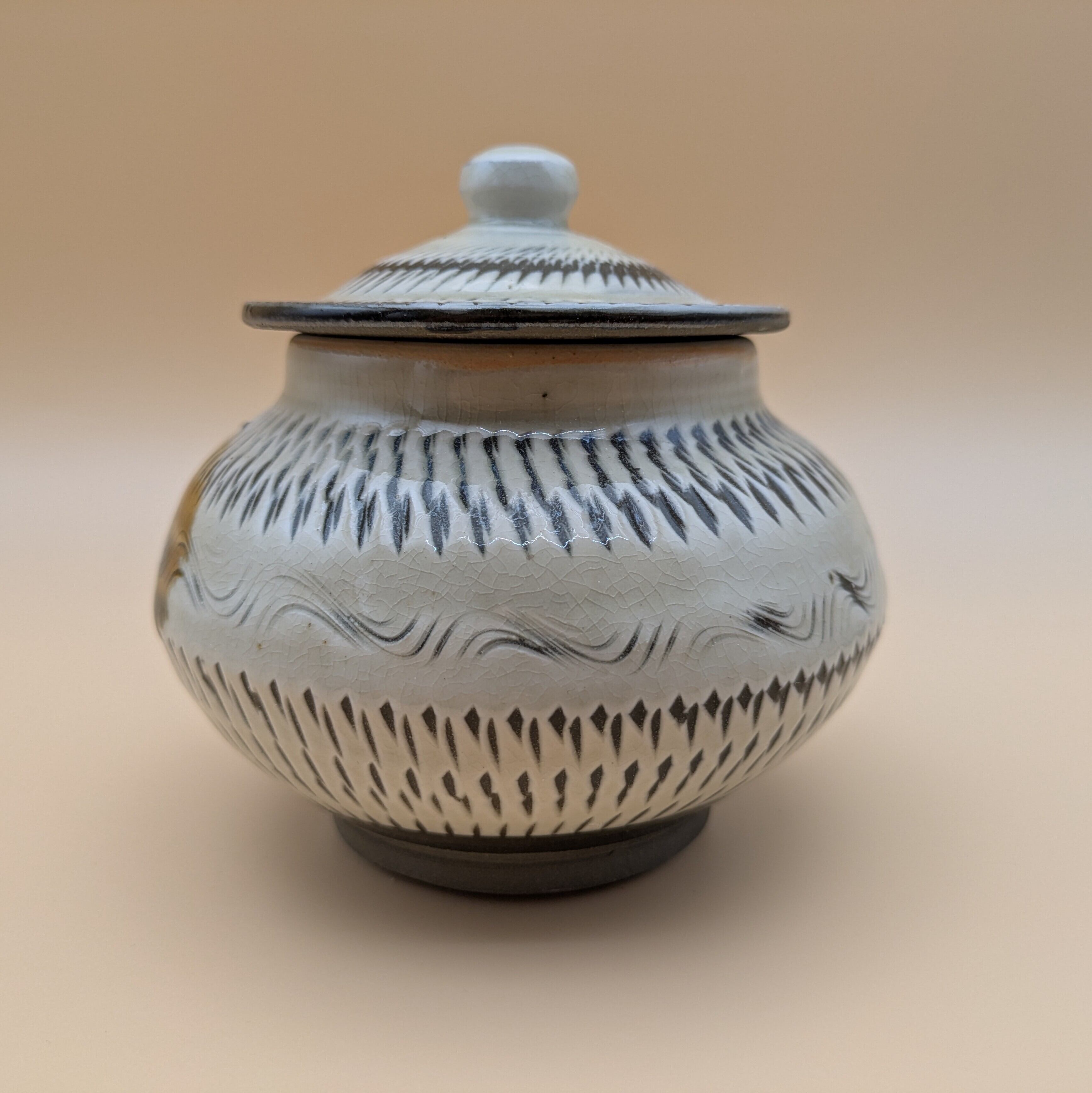 小鹿田焼の伝統的な技法と美しさを堪能できる、蓋つきの壺です。職人が手作りした丁寧な仕上がりと、日本の伝統技法である三彩と飛び鉋の美しい施しをお楽しみいただけます。