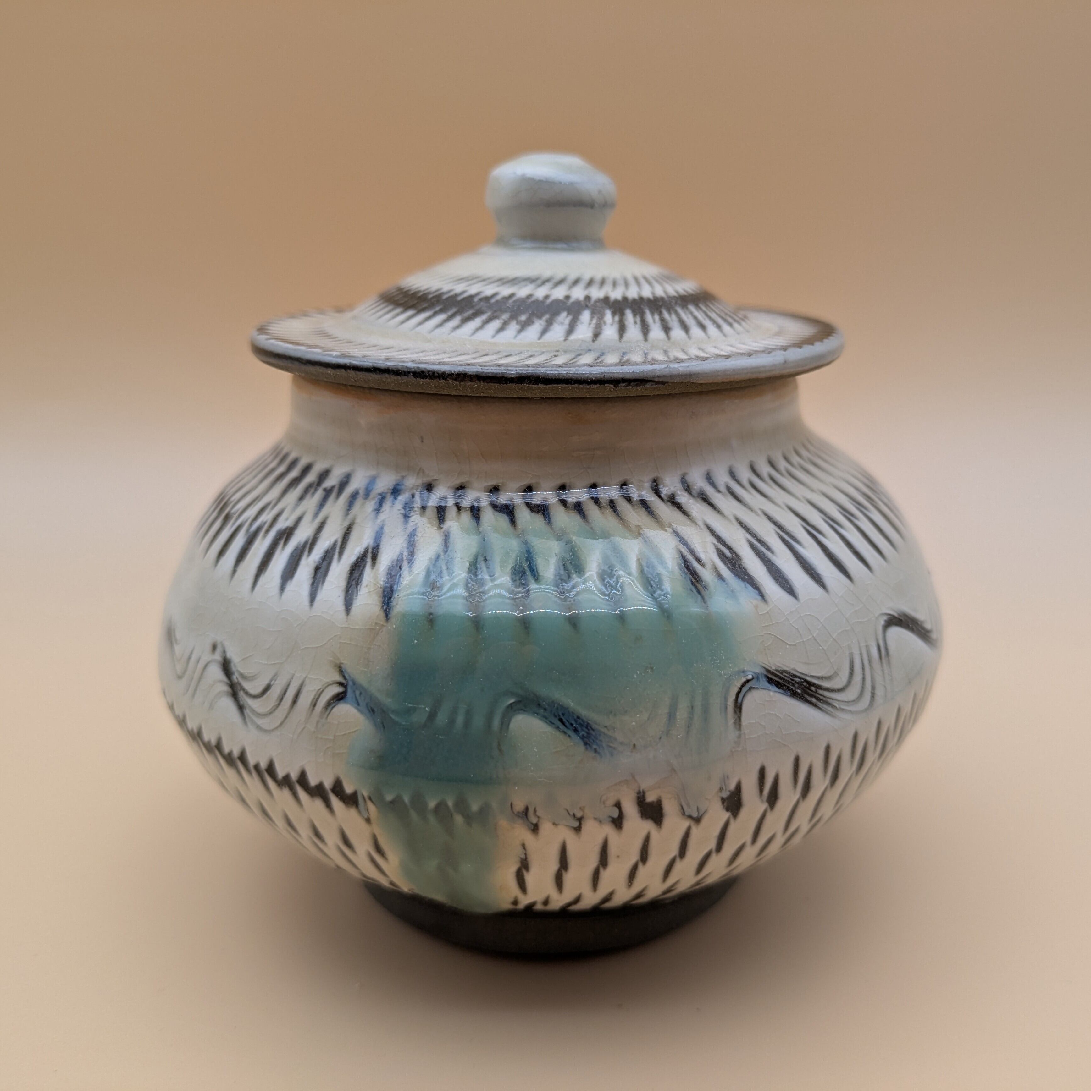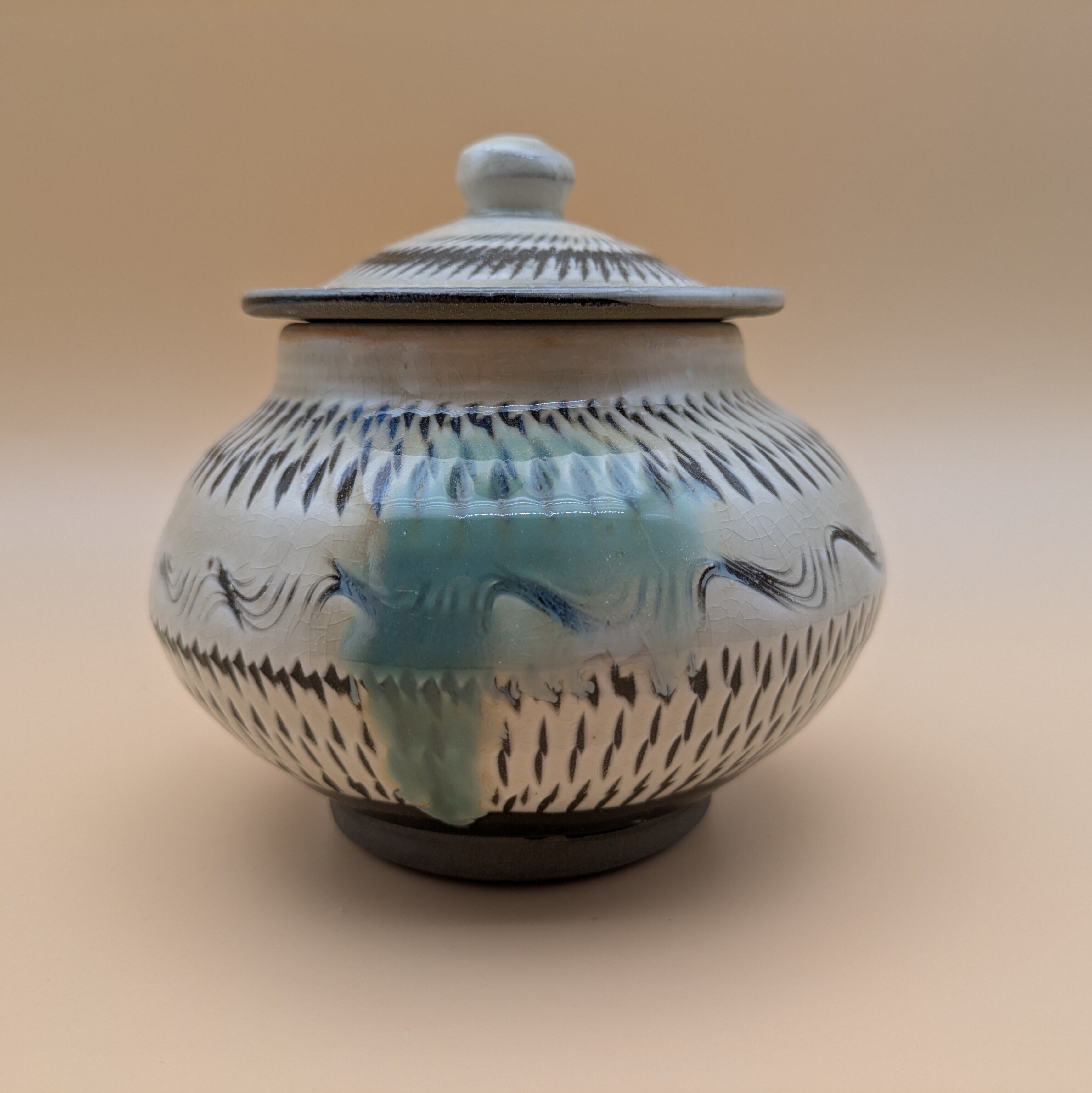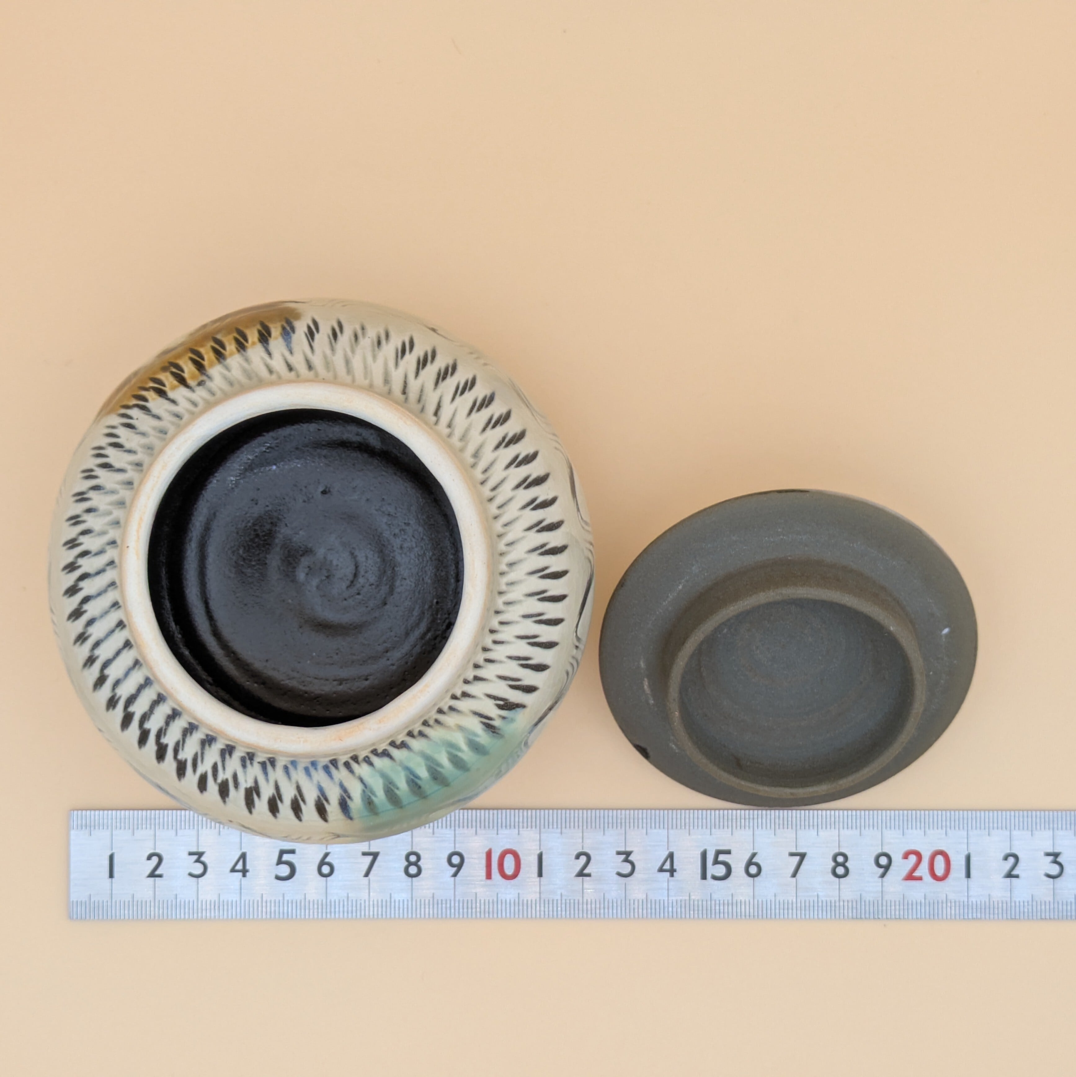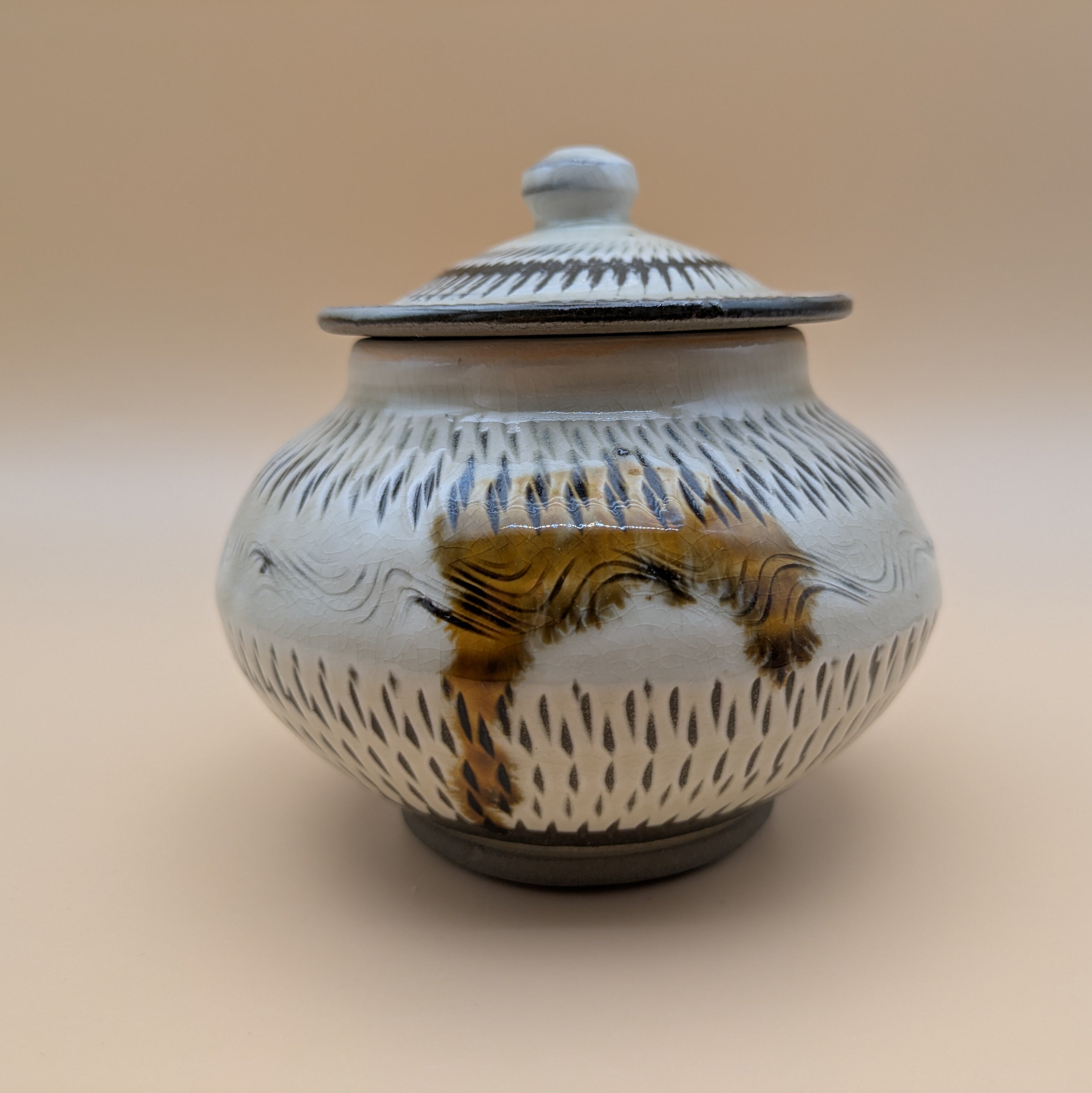 蓋つき壺 小鹿田焼(三彩・飛び鉋) 最大径12.5cm 開口部外径7.4cm内径6.0cm