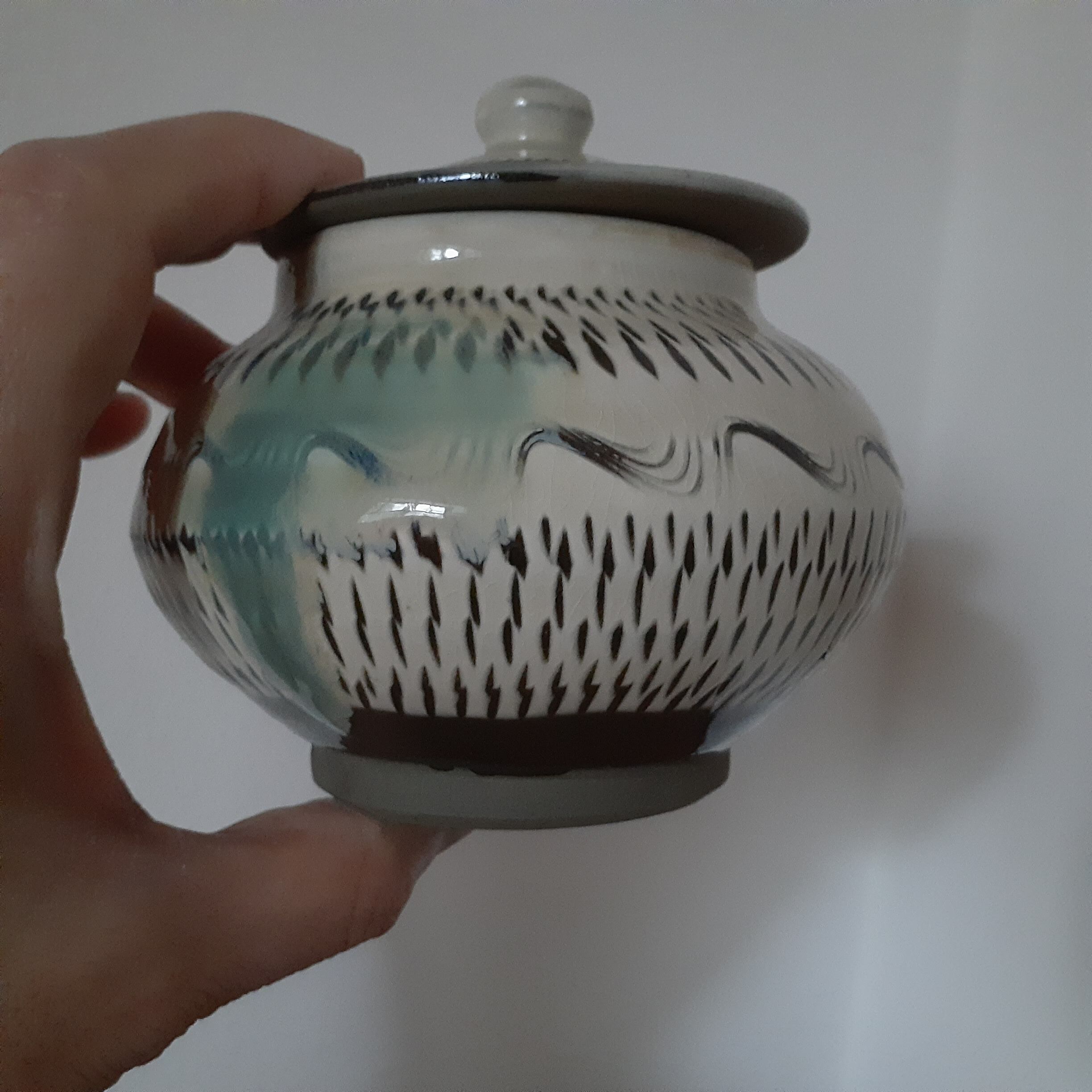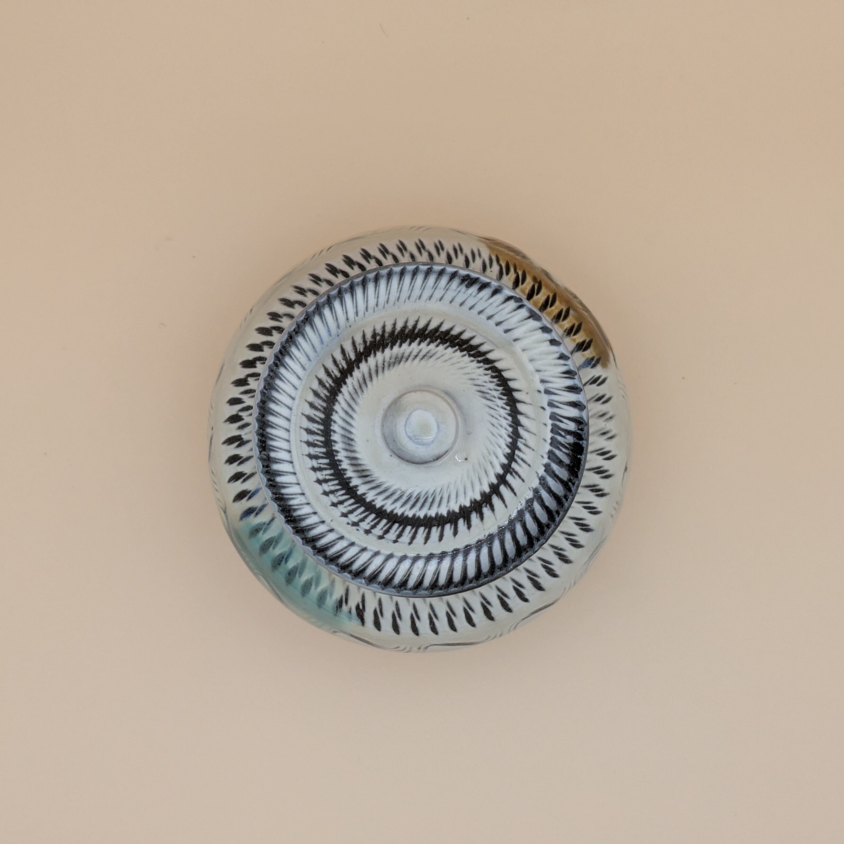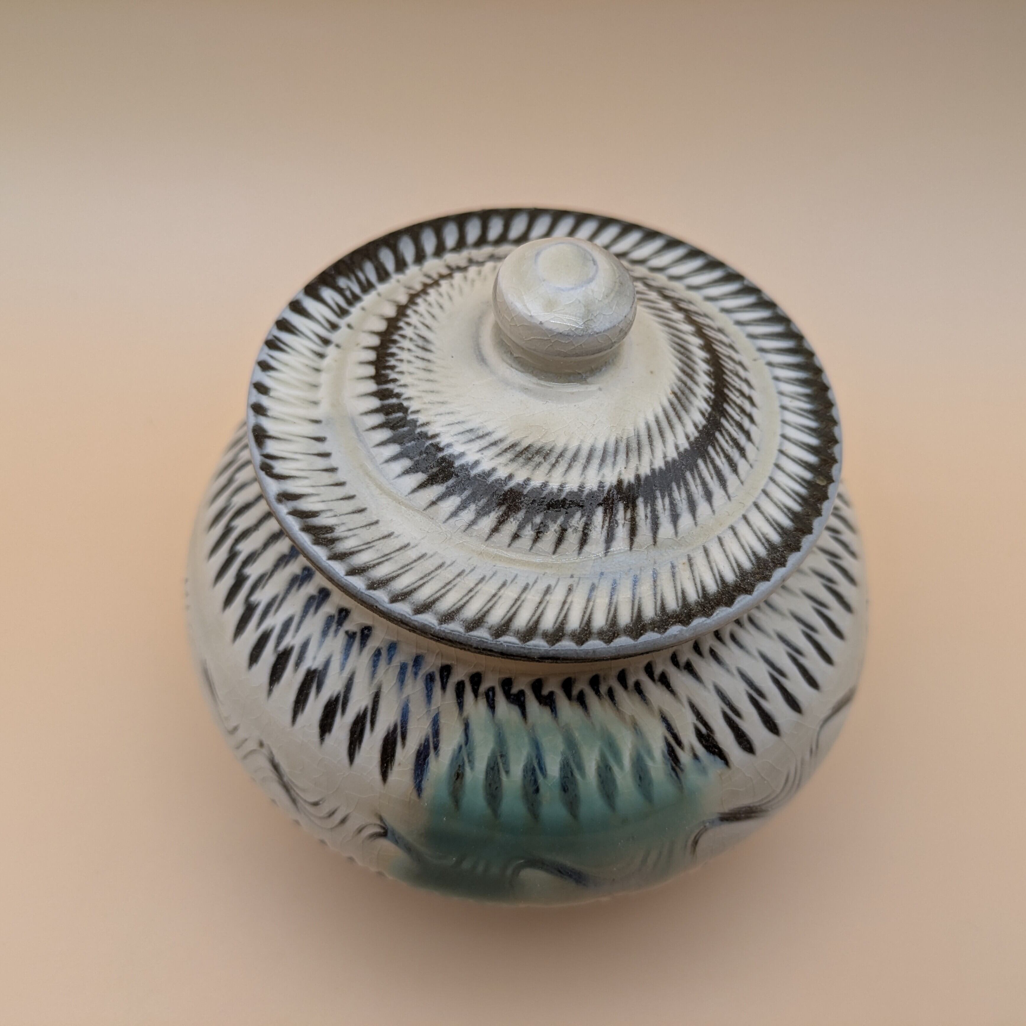蓋つき壺 小鹿田焼(三彩・飛び鉋) 最大径12.5cm 開口部外径7.4cm内径6.0cm