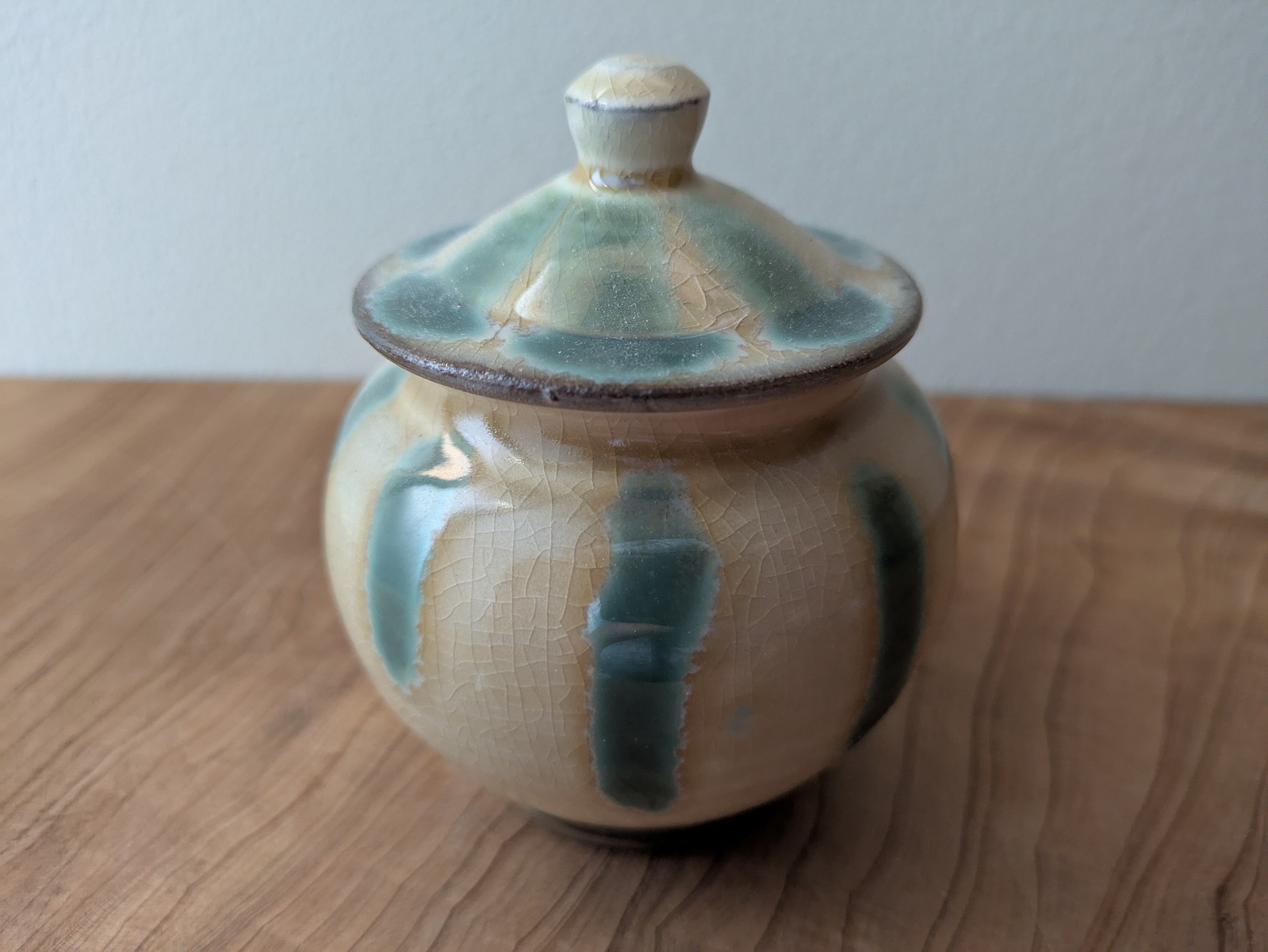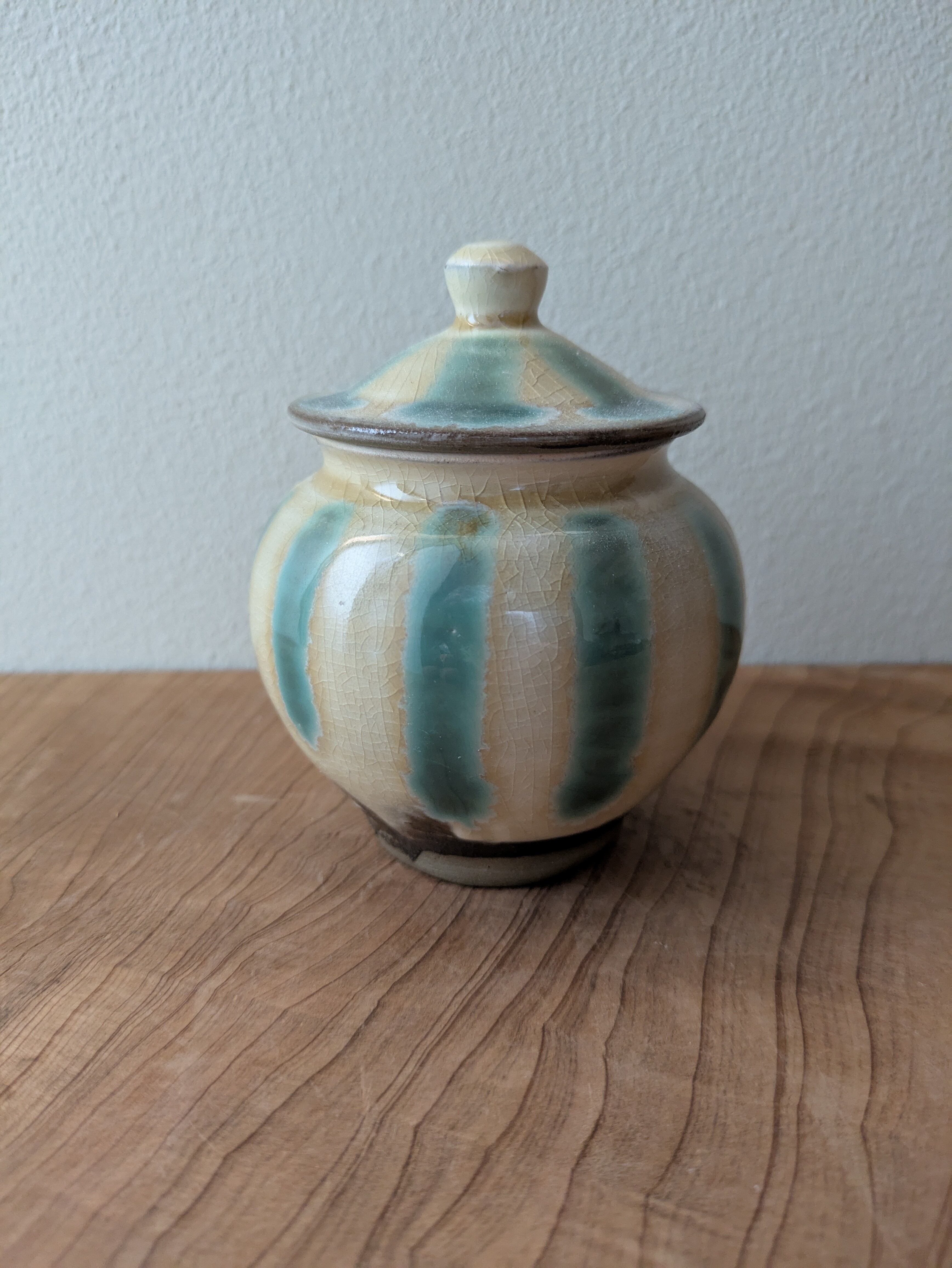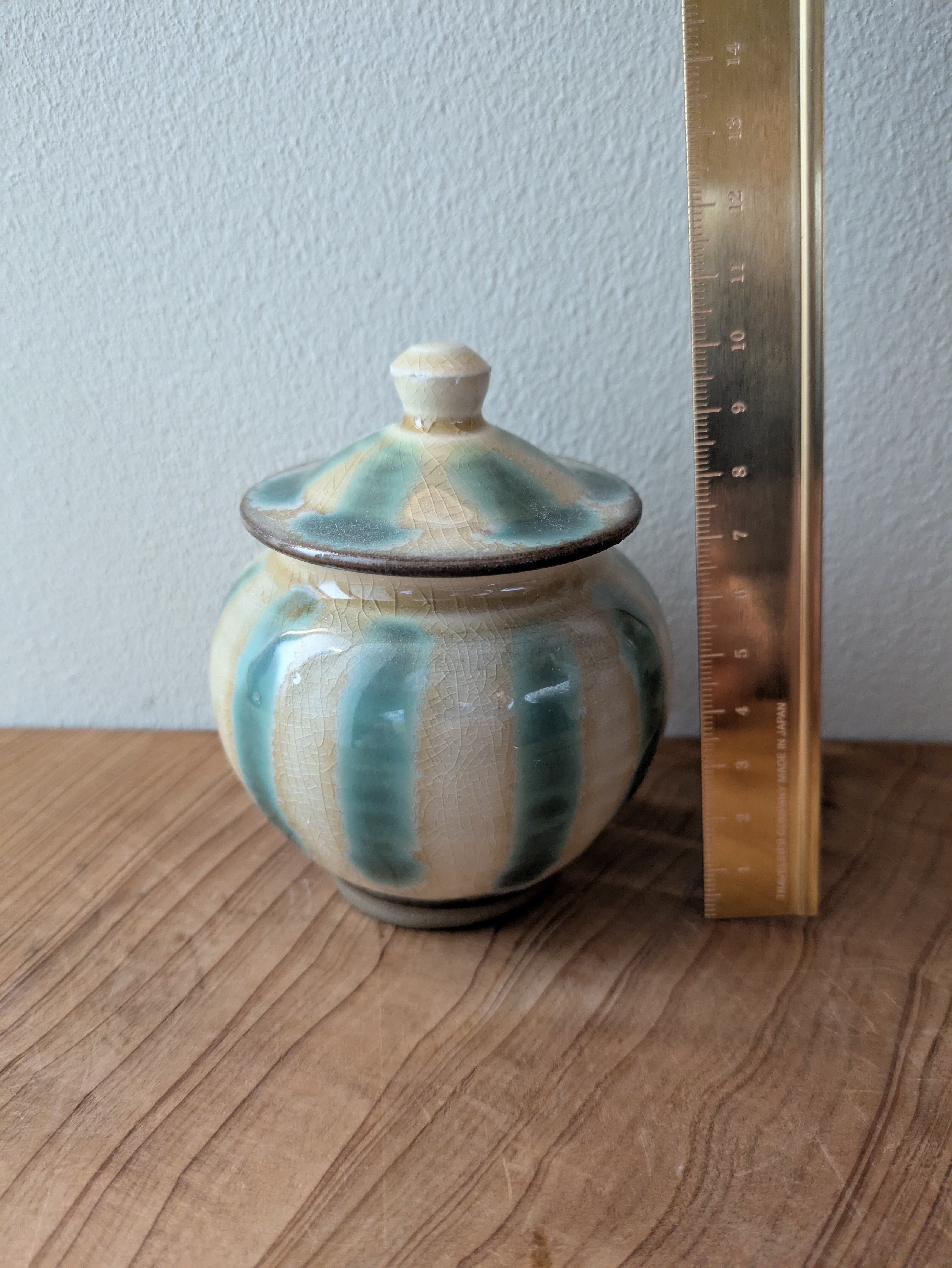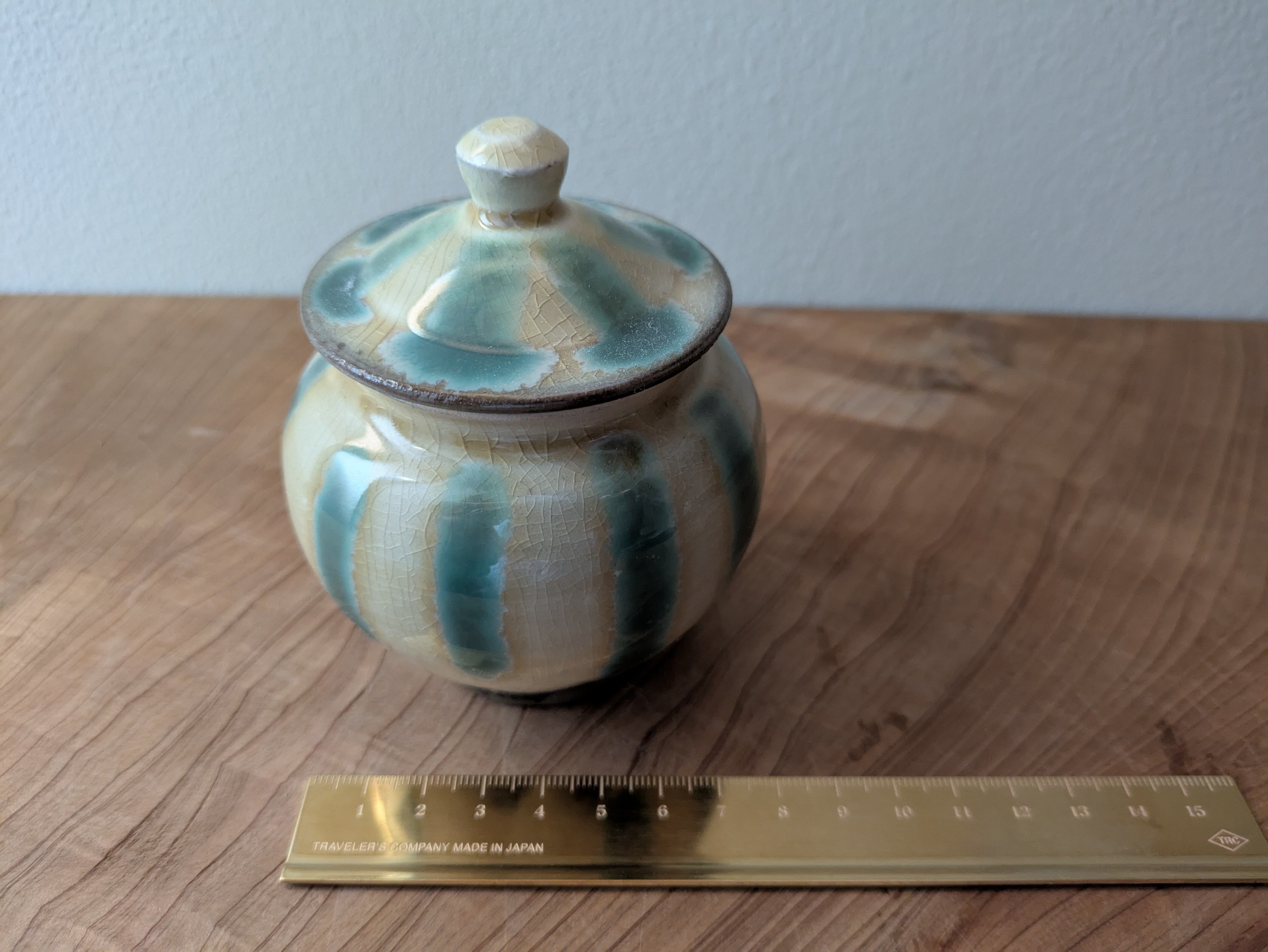蓋つき壺 小鹿田焼(白・緑柚流し掛け)
