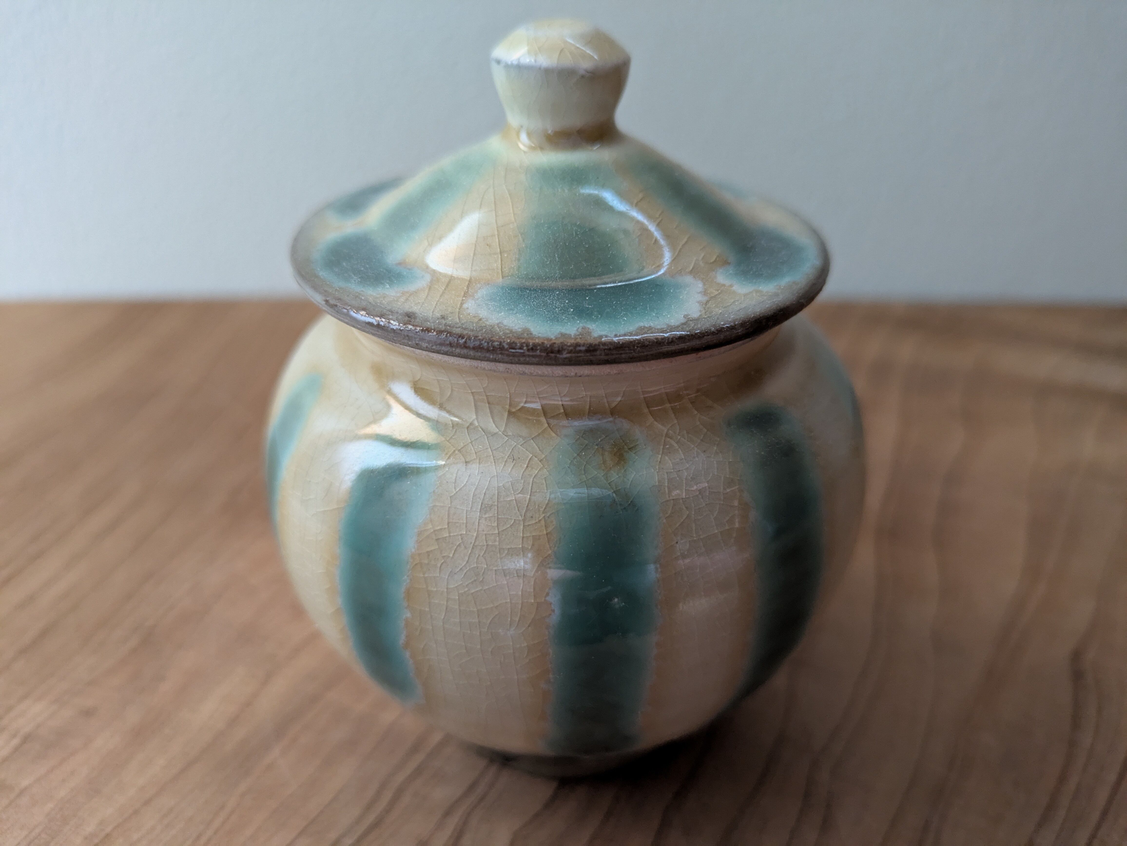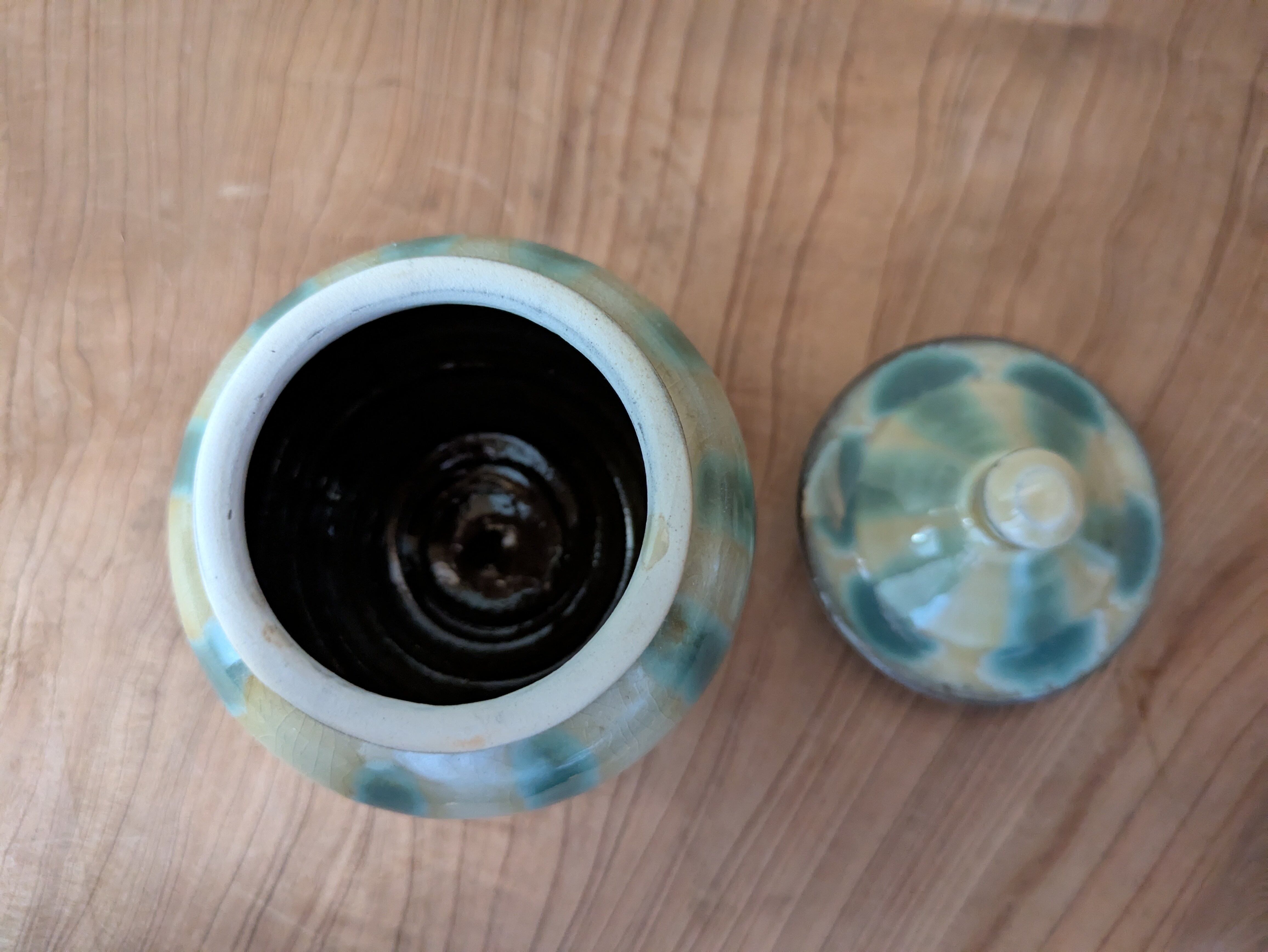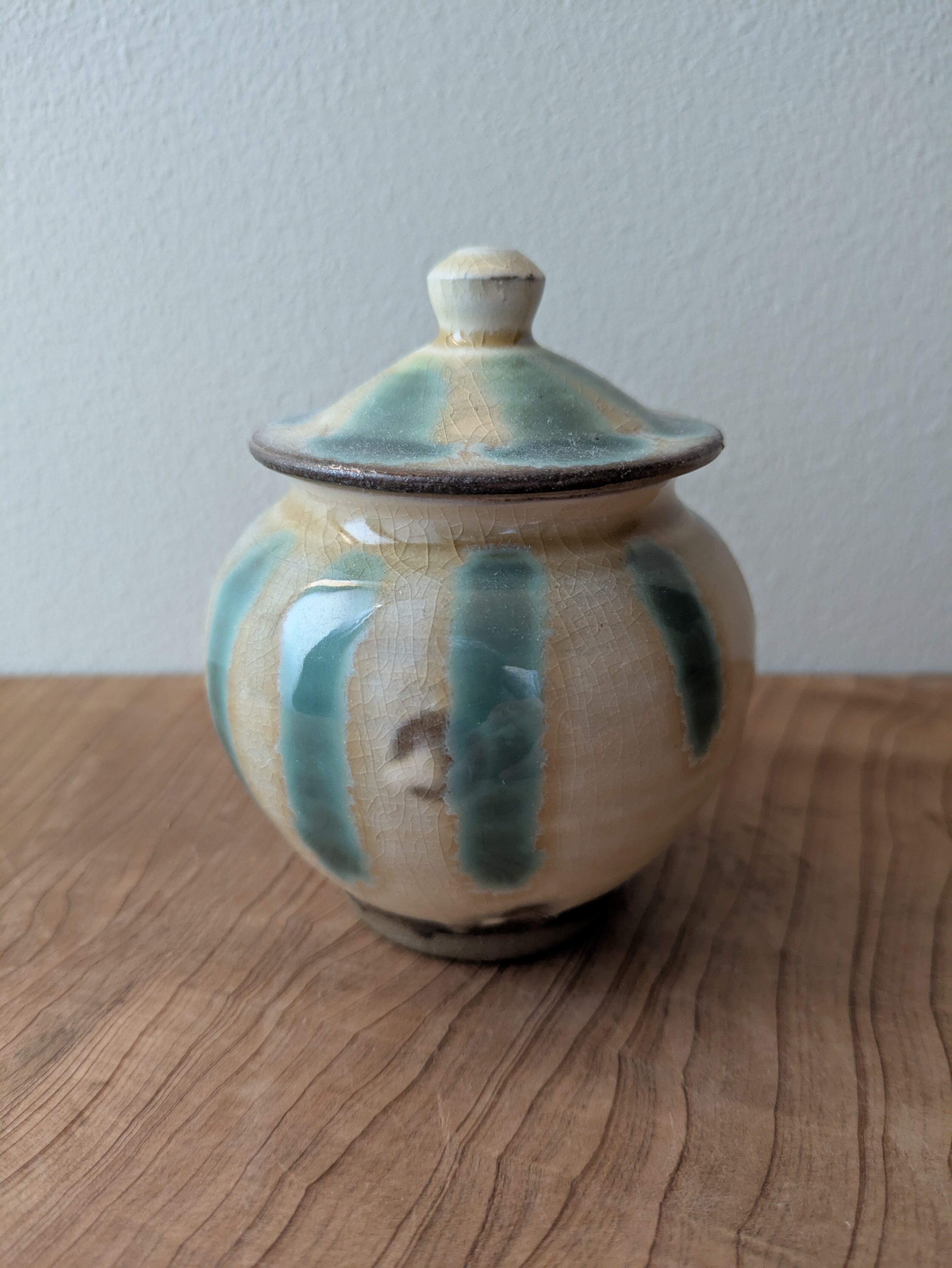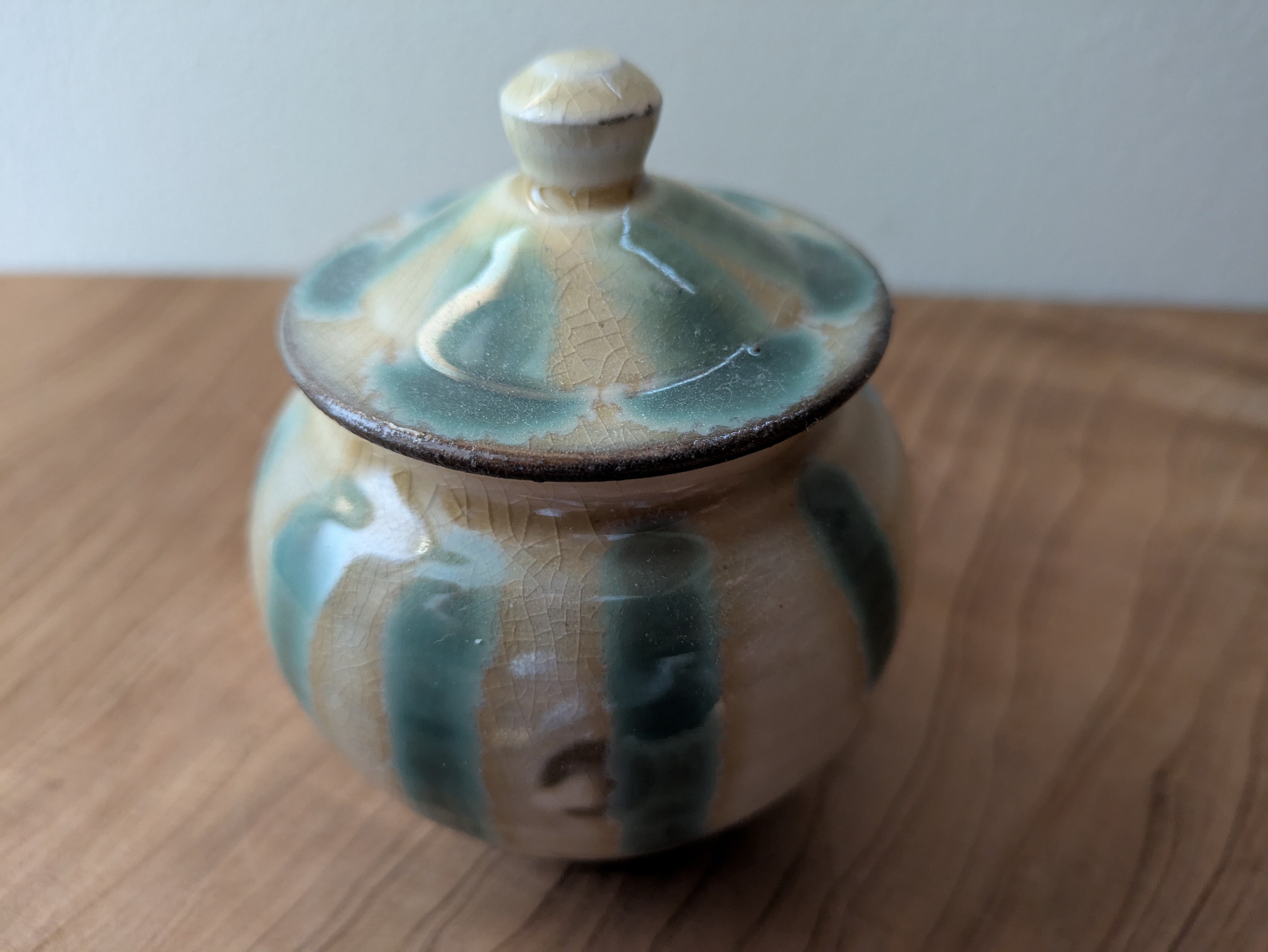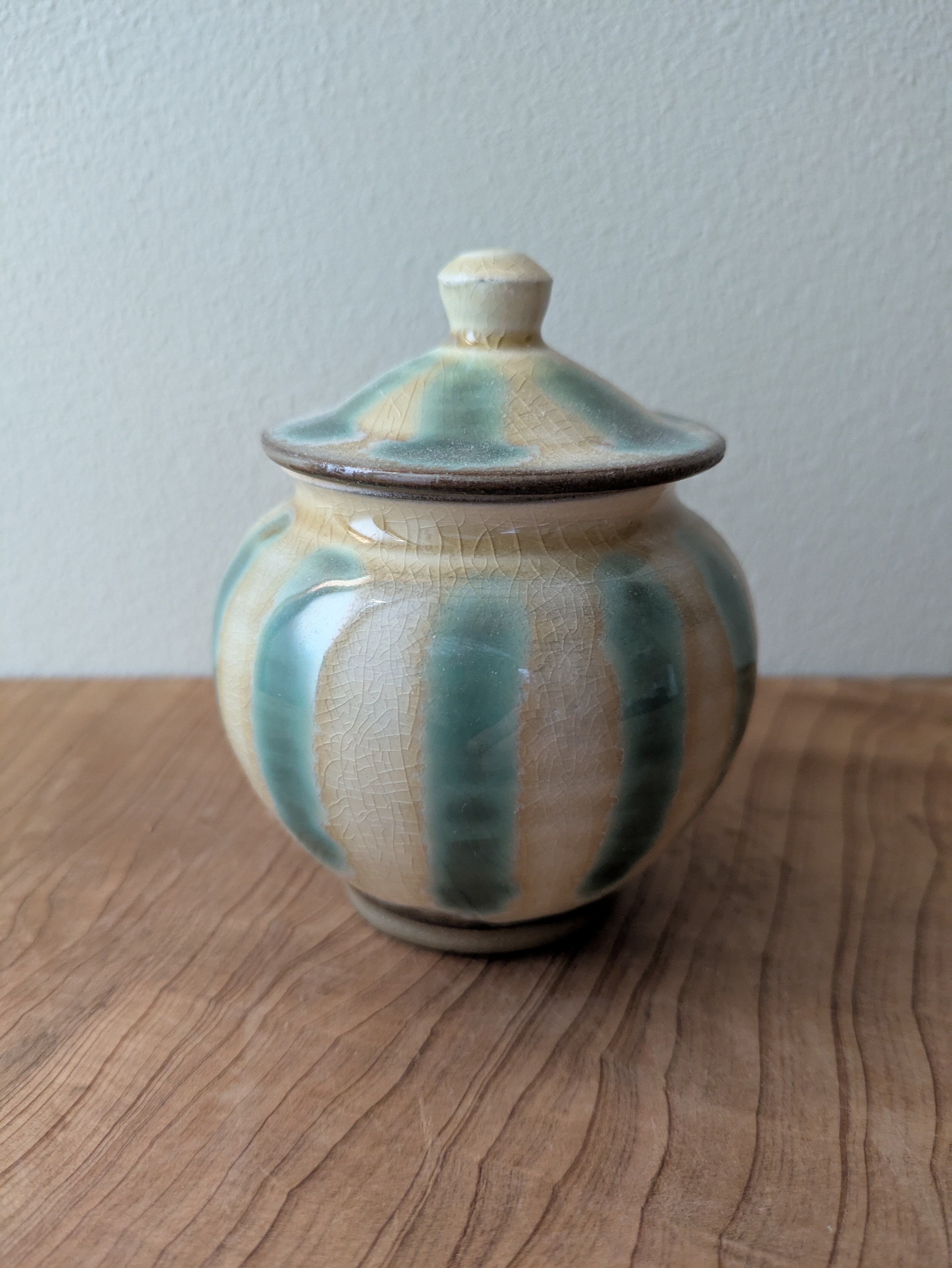 蓋つき壺 小鹿田焼(白・緑柚流し掛け)