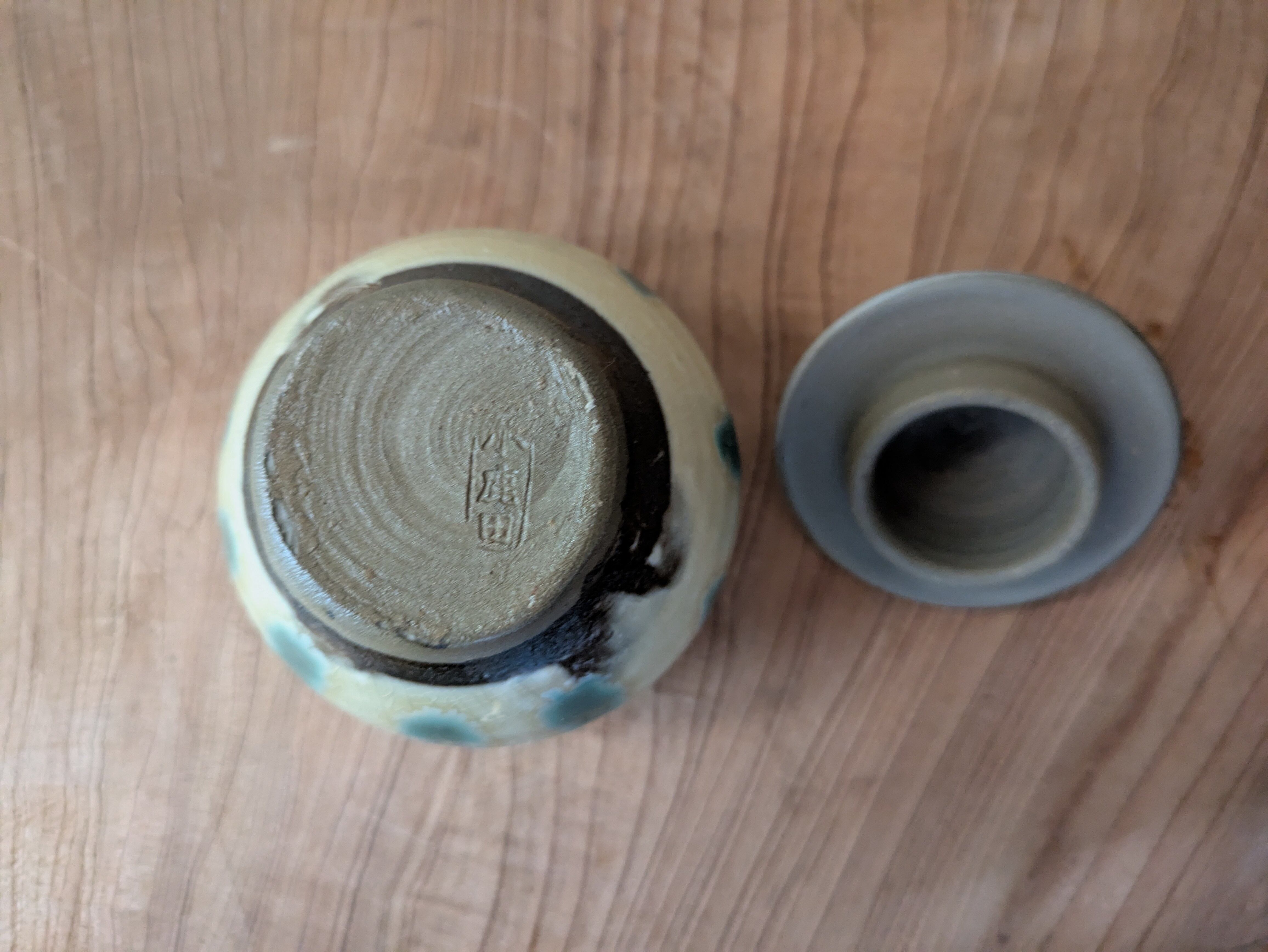蓋つき壺 小鹿田焼(白・緑柚流し掛け) 最大径8.5cm 開口部外径5.7cm内径4.5cm