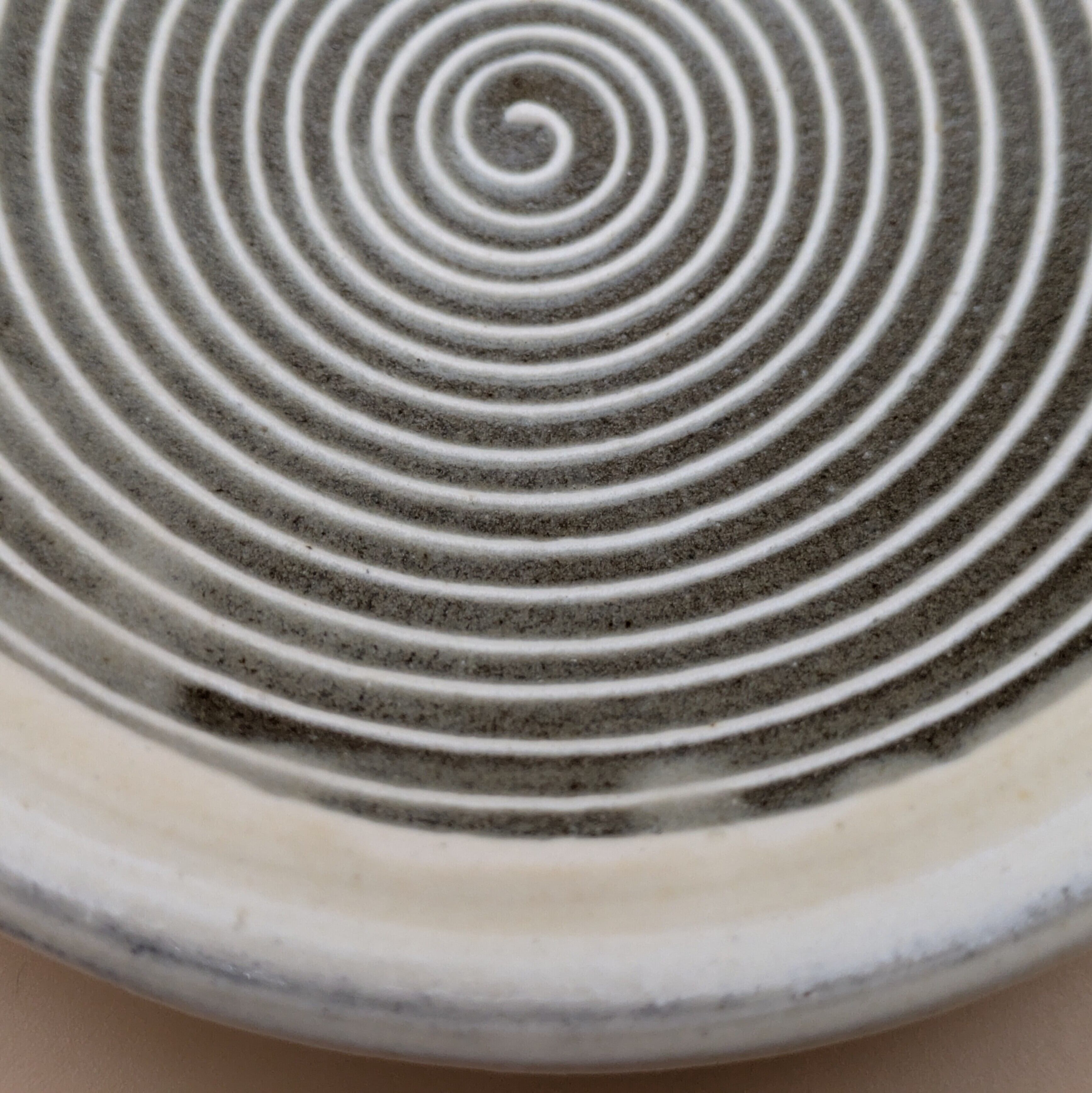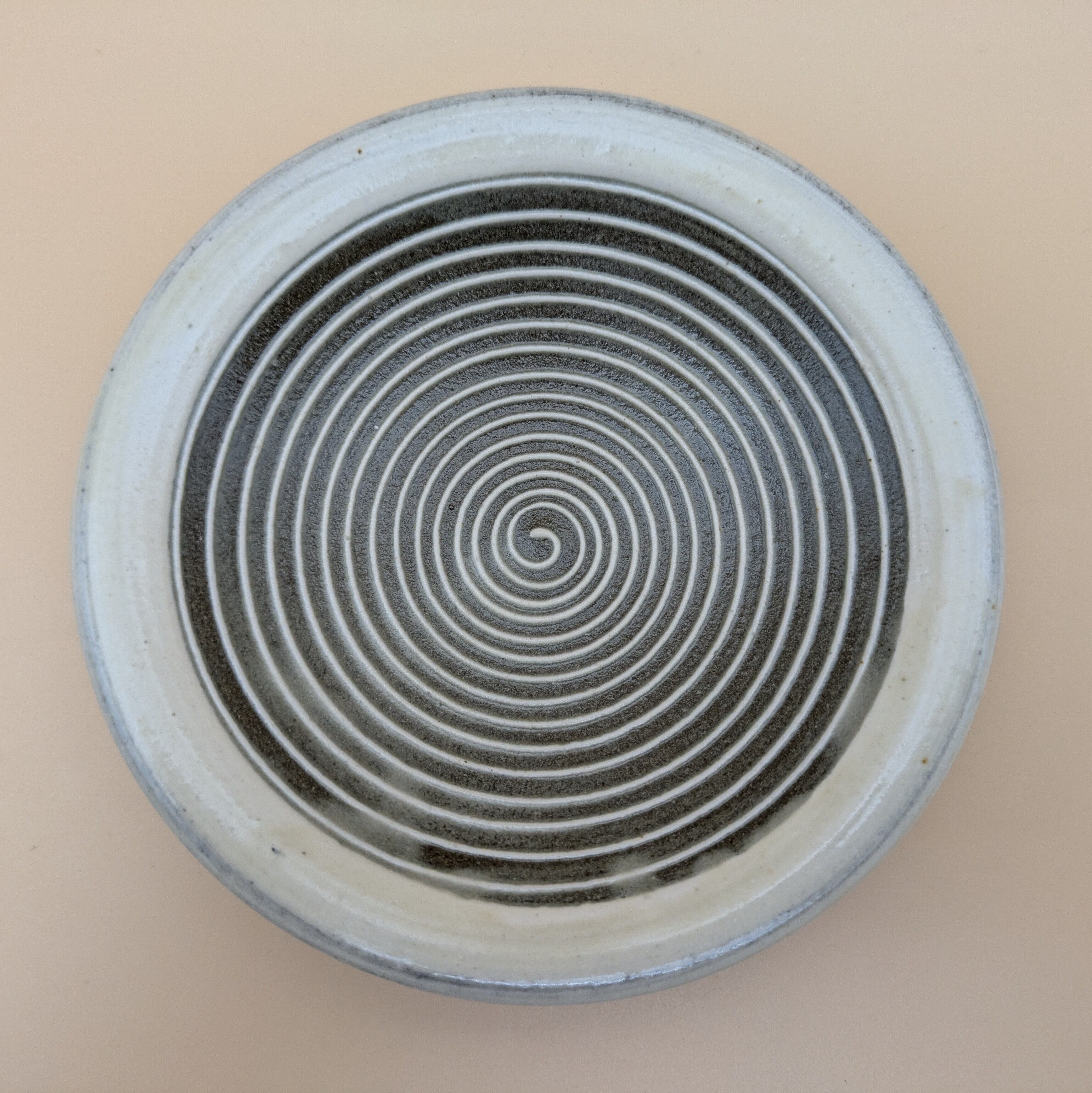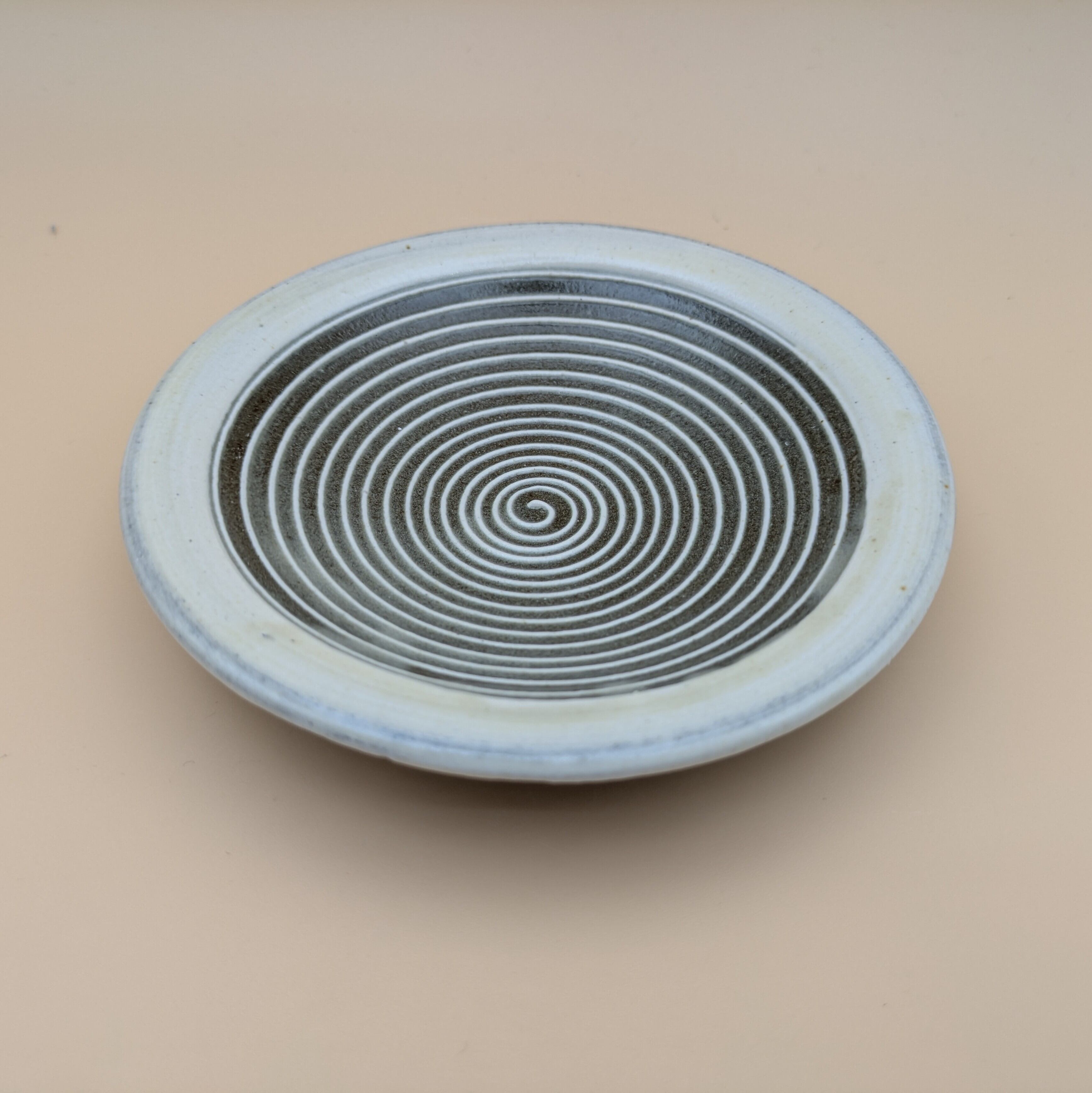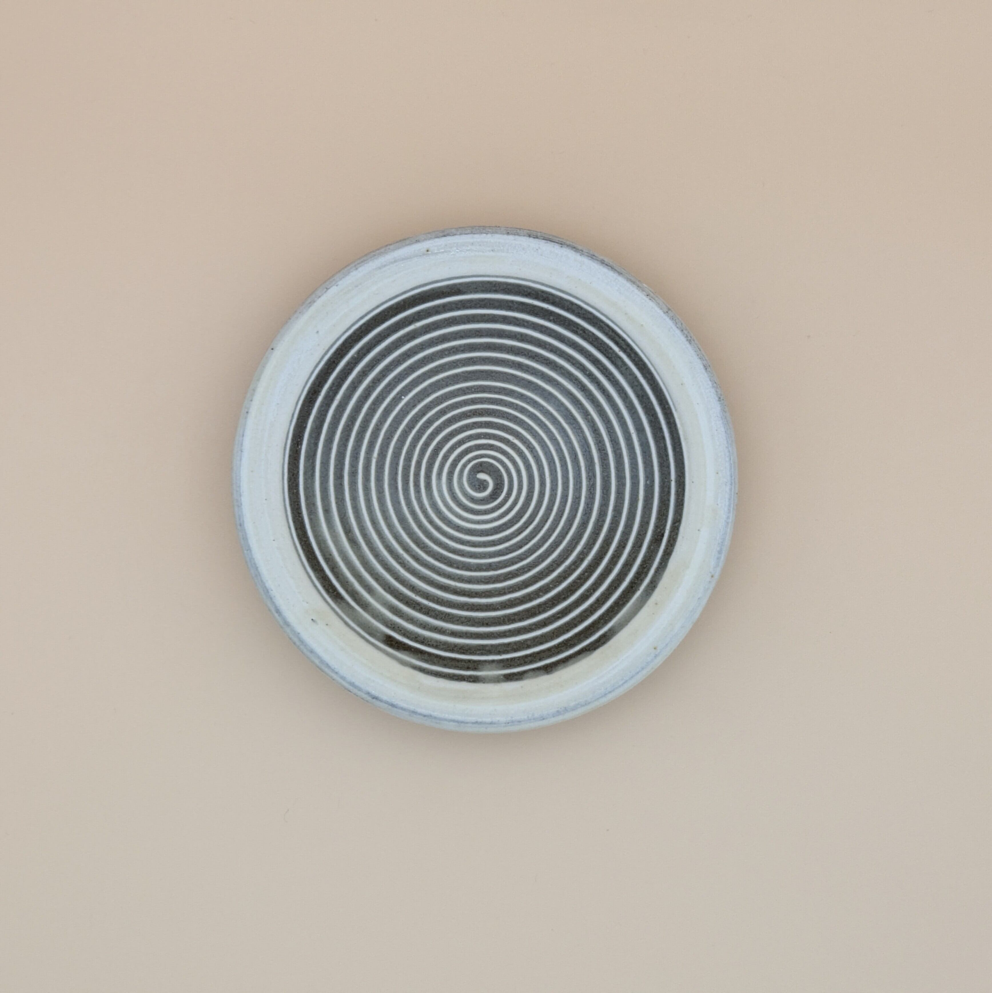 小石原焼の豆皿です。灰釉の地に白縁・白渦巻模様がポイントの可愛らしいデザインです。手作りならではの温かみと風合いがあり、使えば使うほど味わい深さが増します。