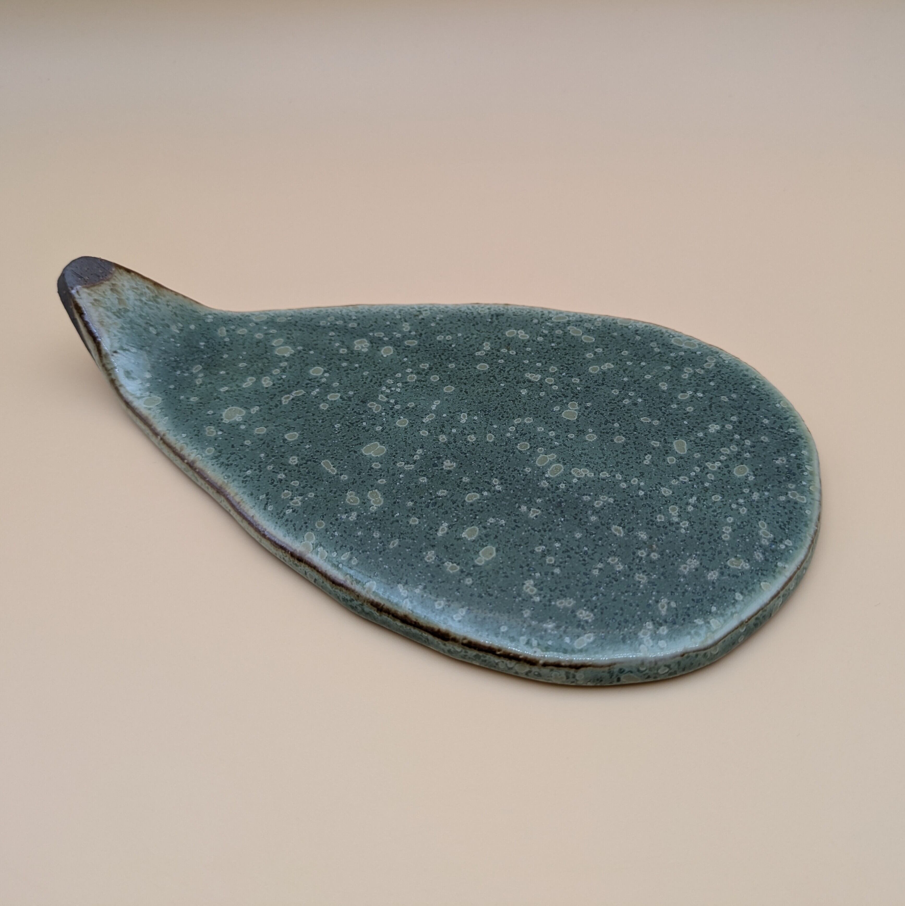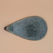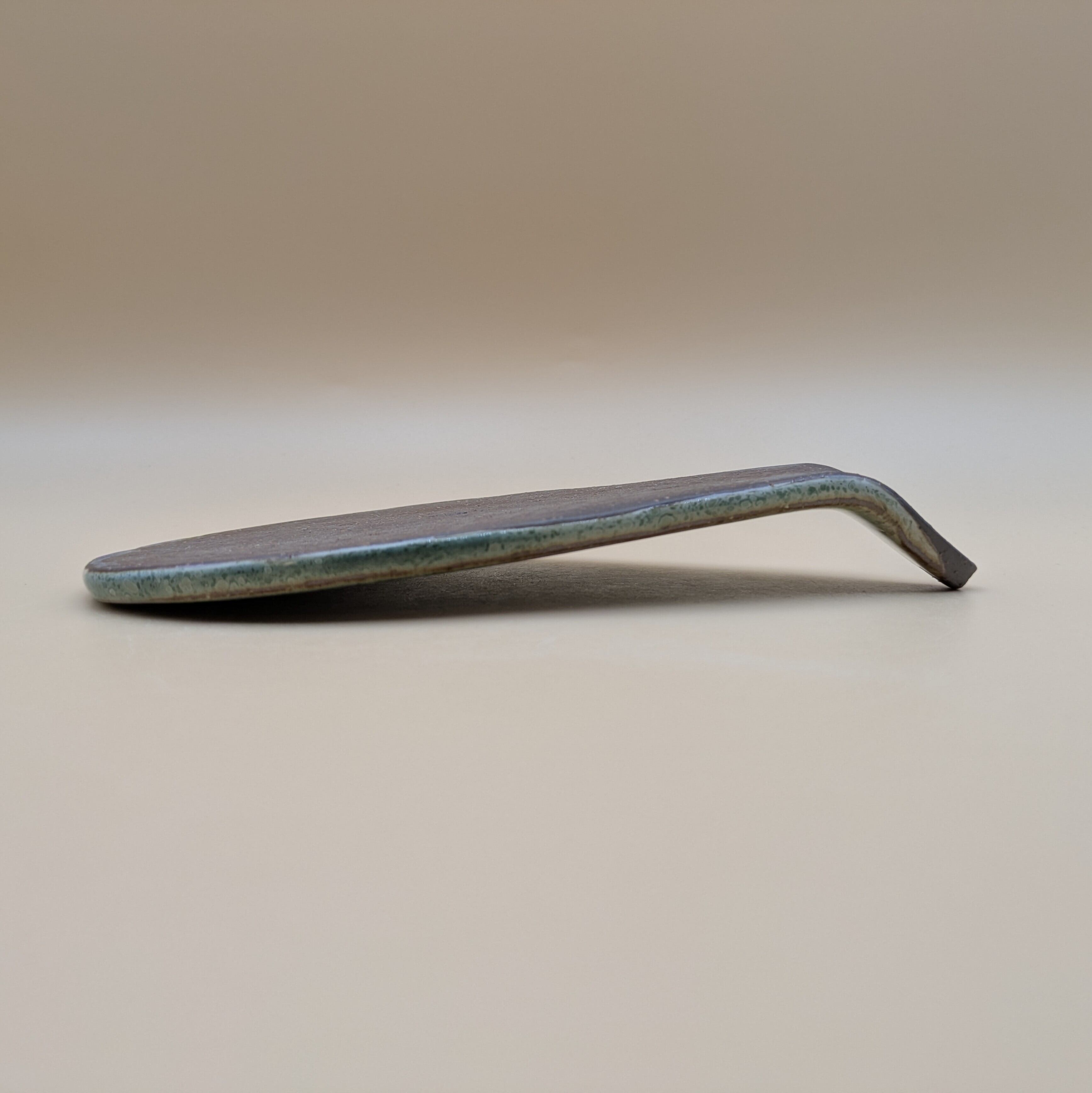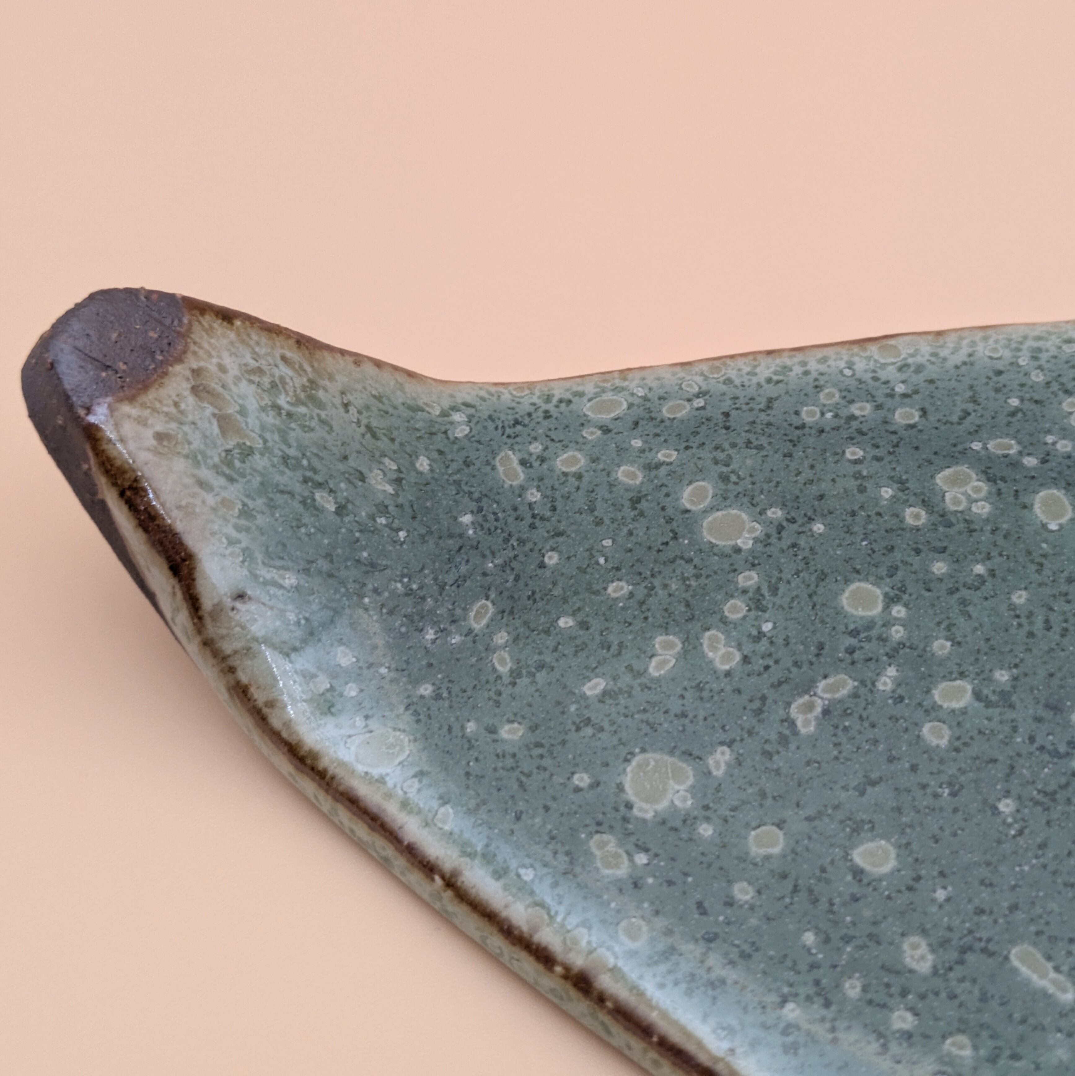 萩焼の平皿です。自然の風景を思わせる美しい緑の色合いが特徴で、なすび型のデザインがおしゃれさを引き立てます。手作りの温かみも感じられ、使うたびに心が和むこと間違いありません。