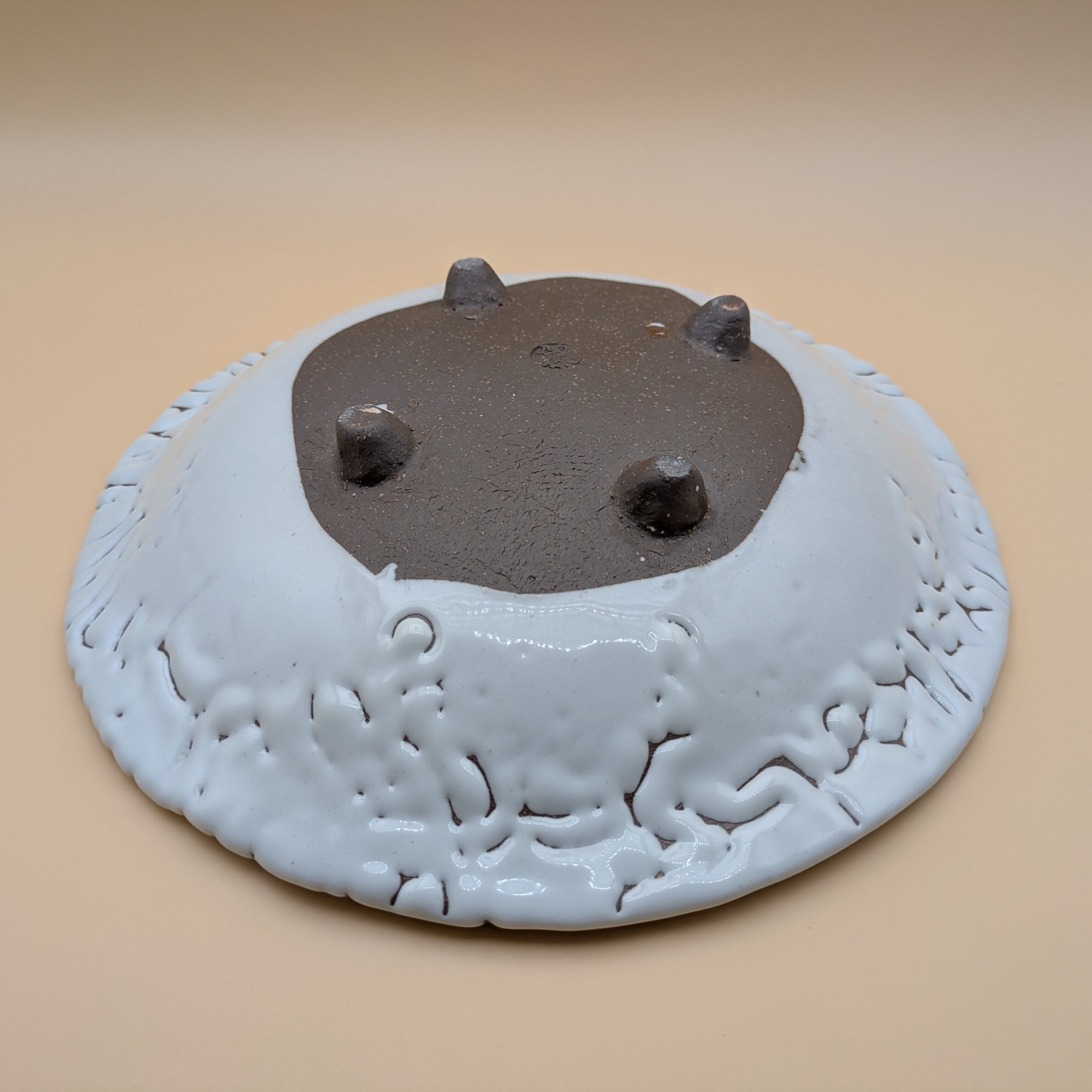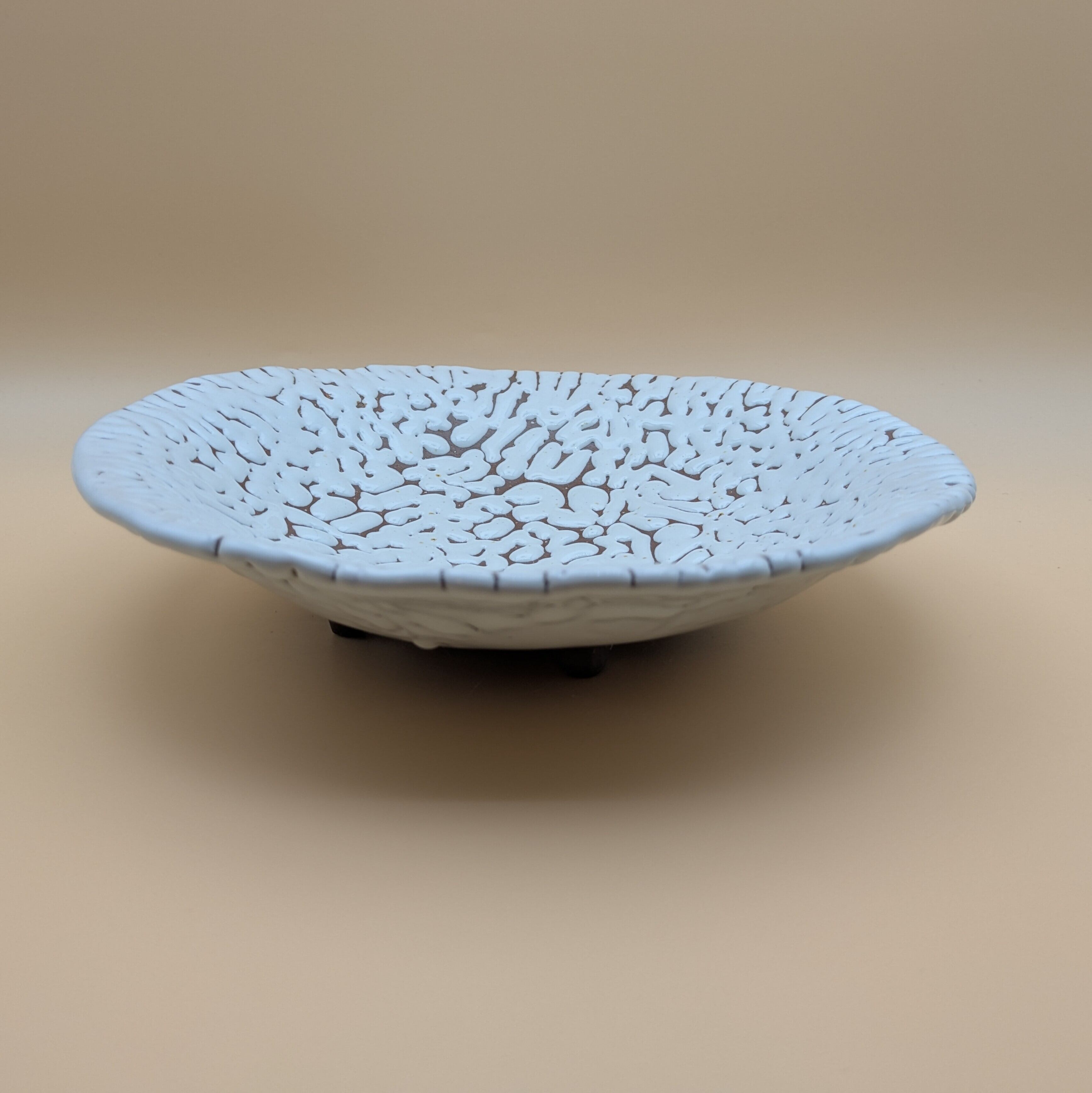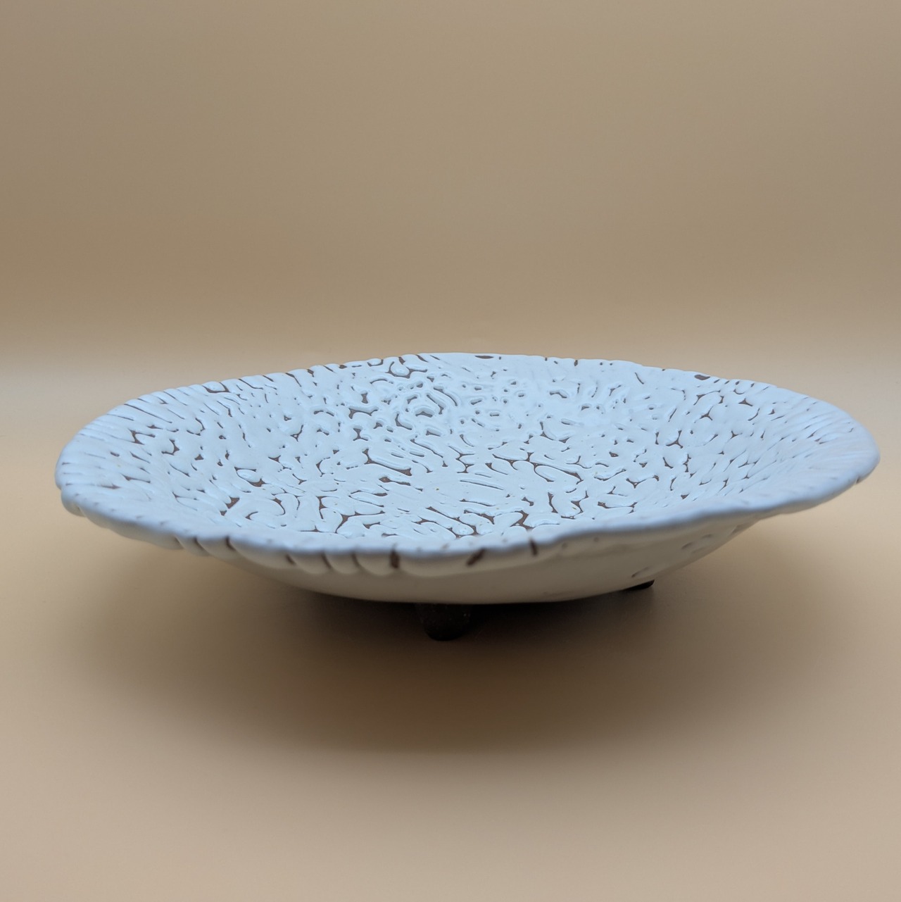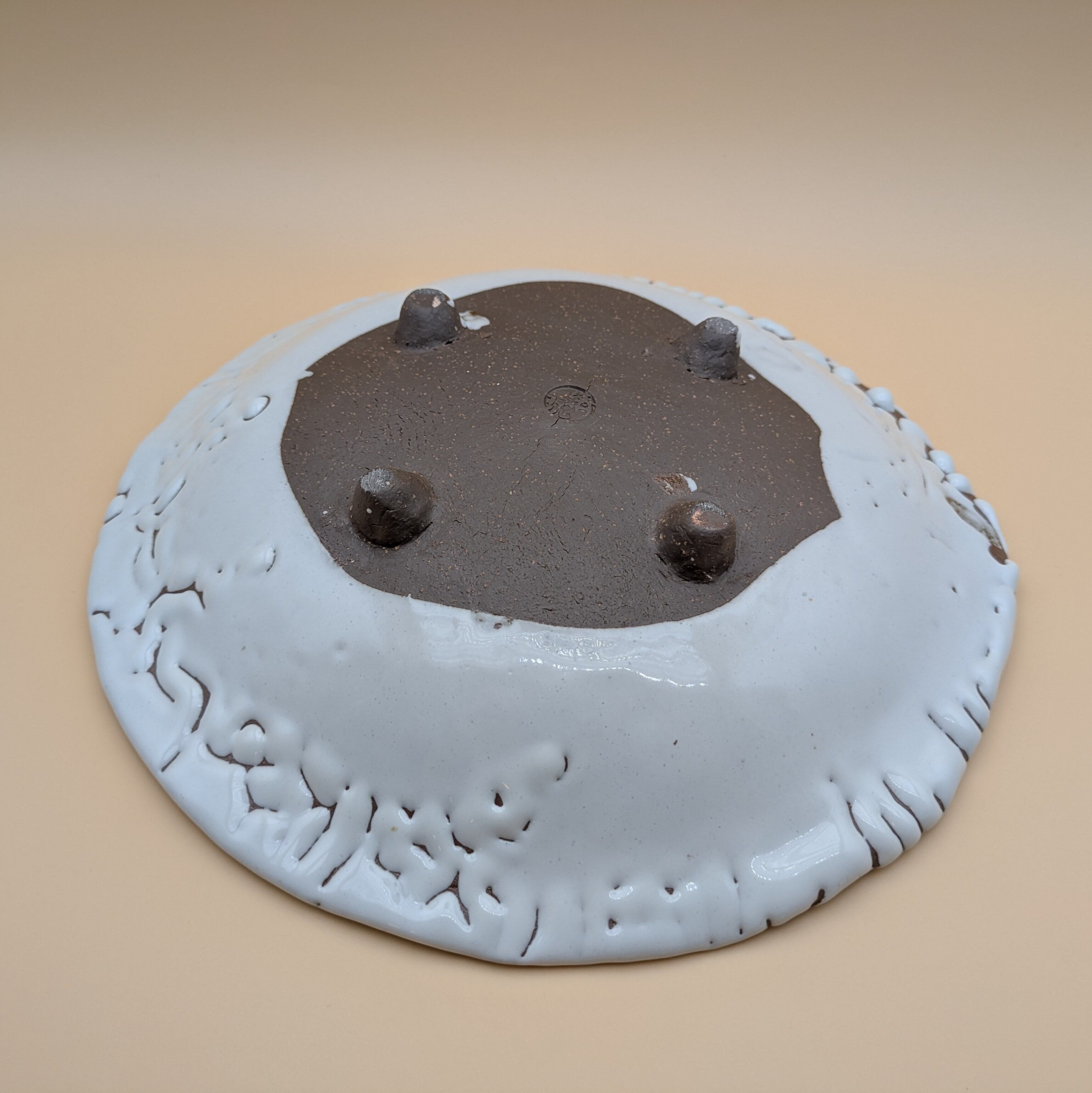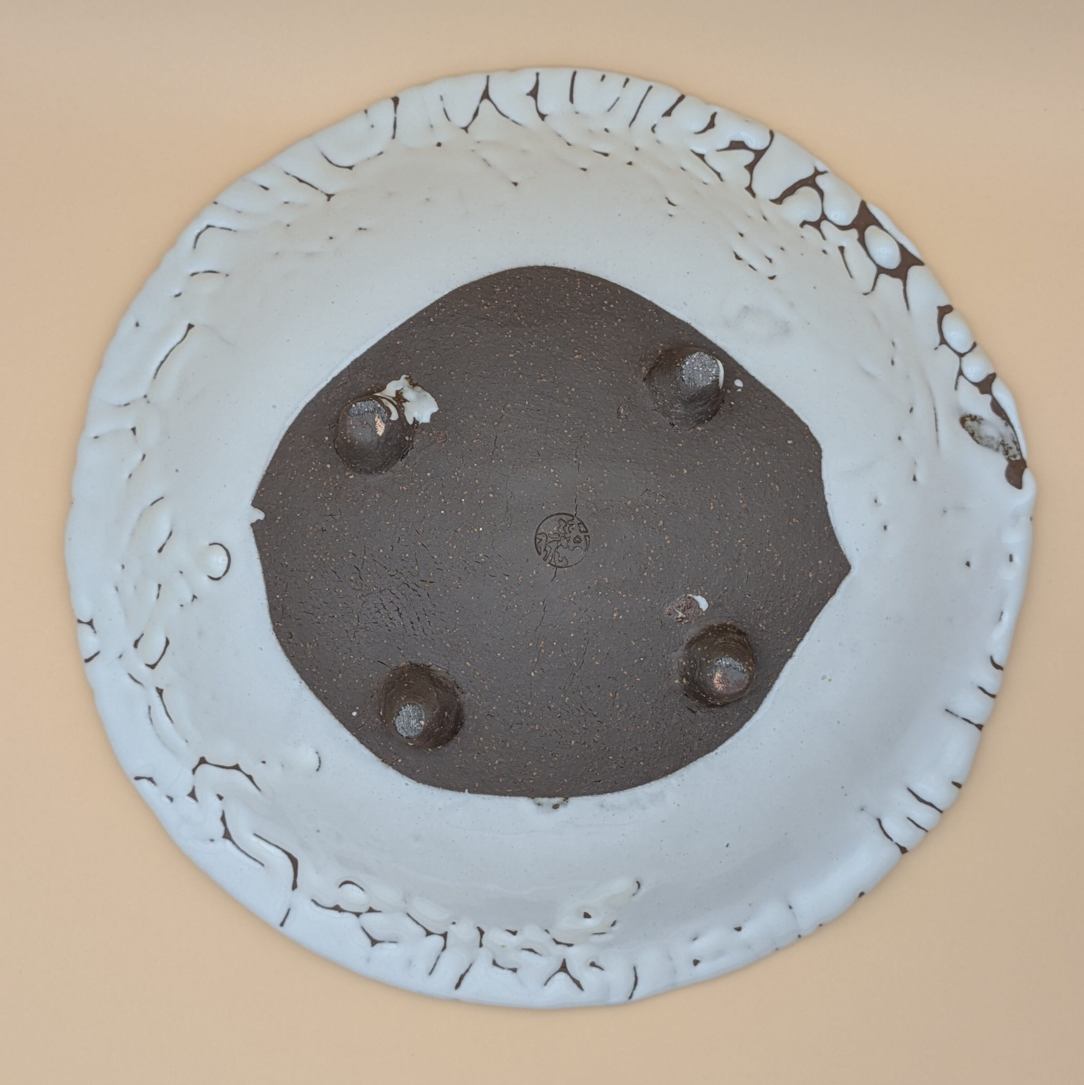 四つ足高台の盛皿です。白い地に、鬼萩らしい独特の絵柄が描かれた、美しい一品です。