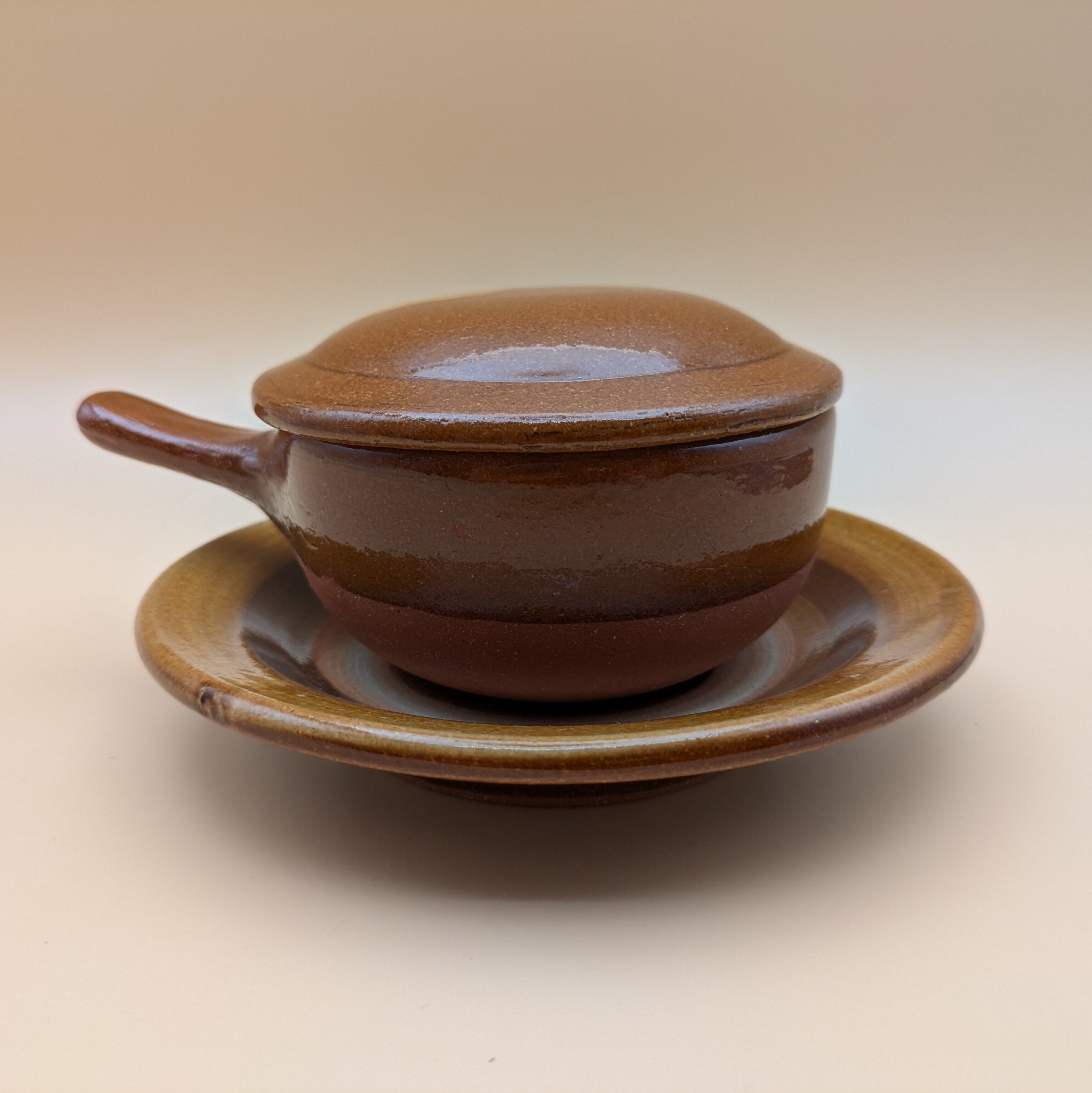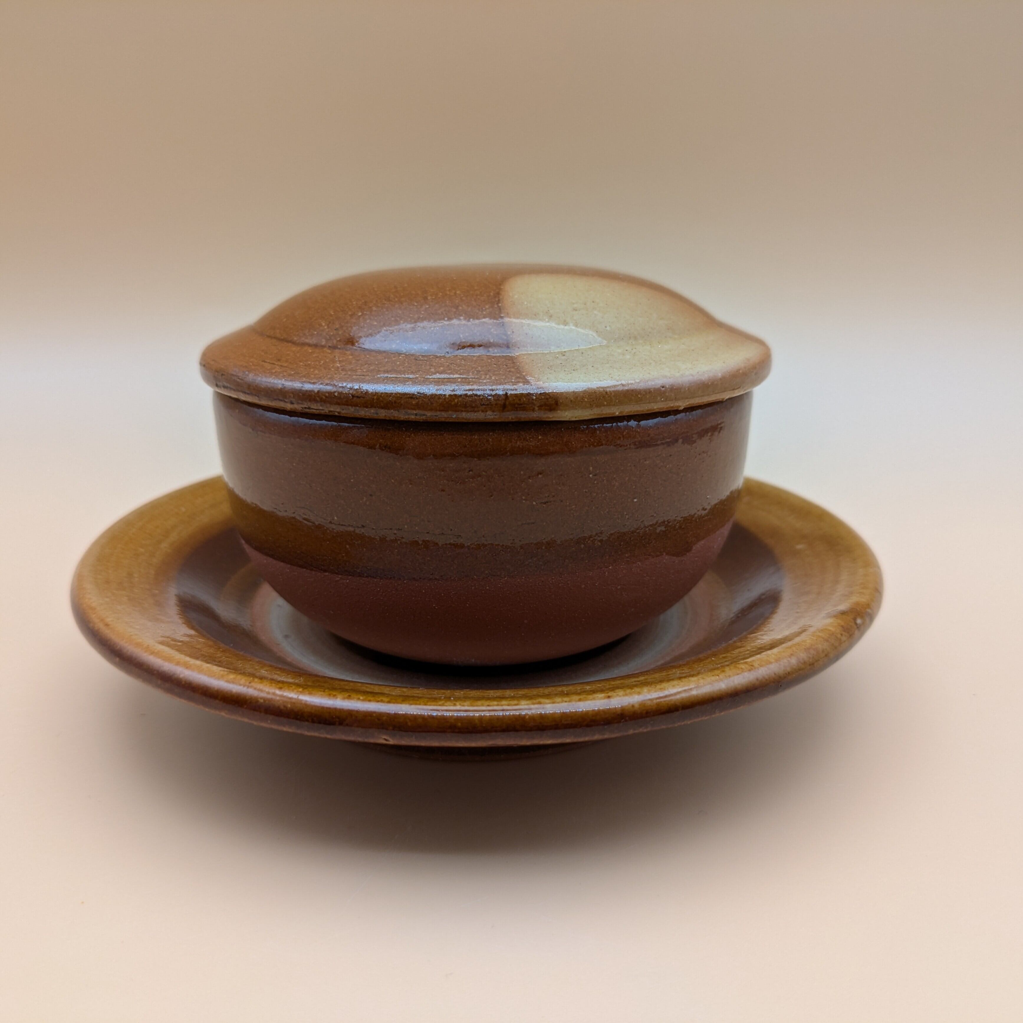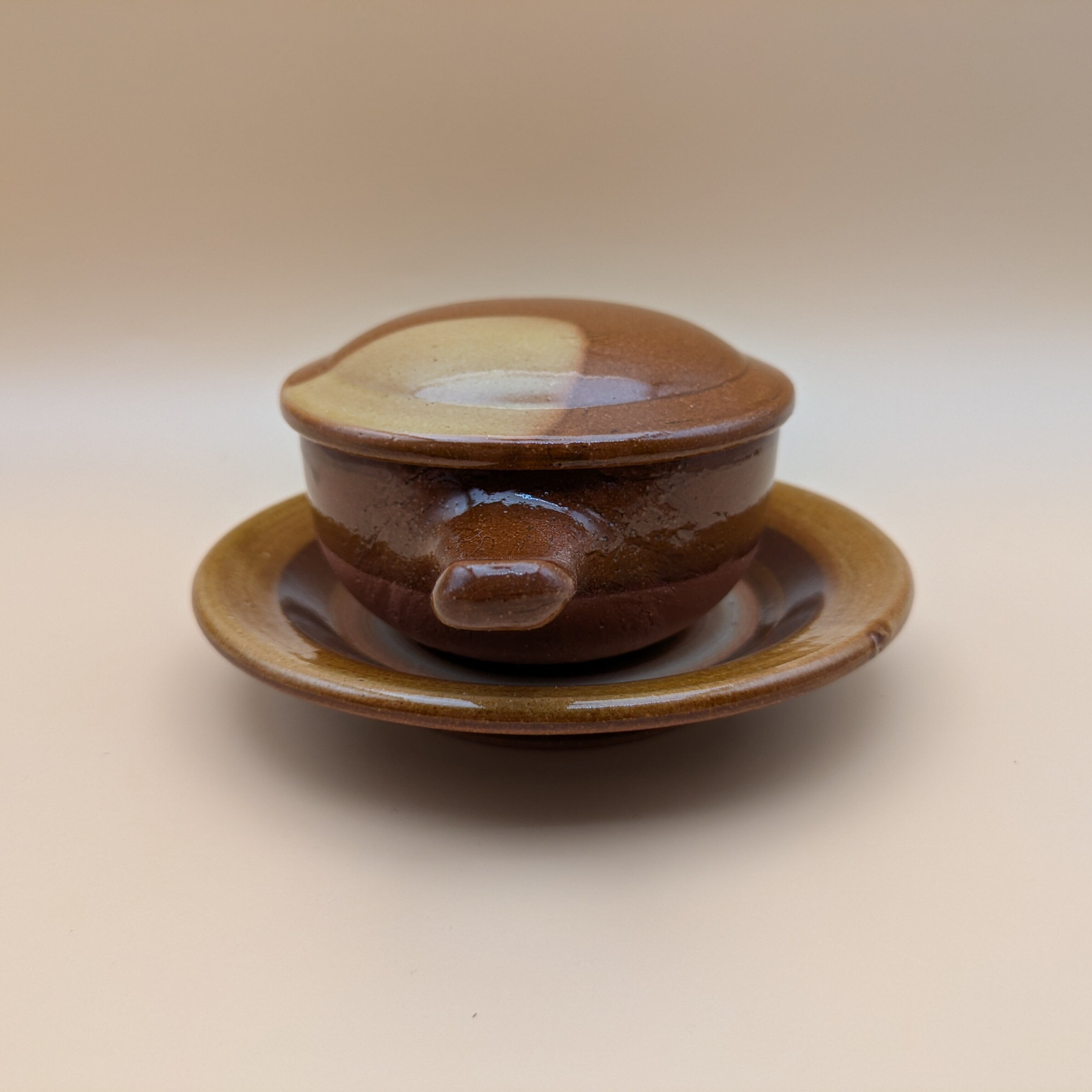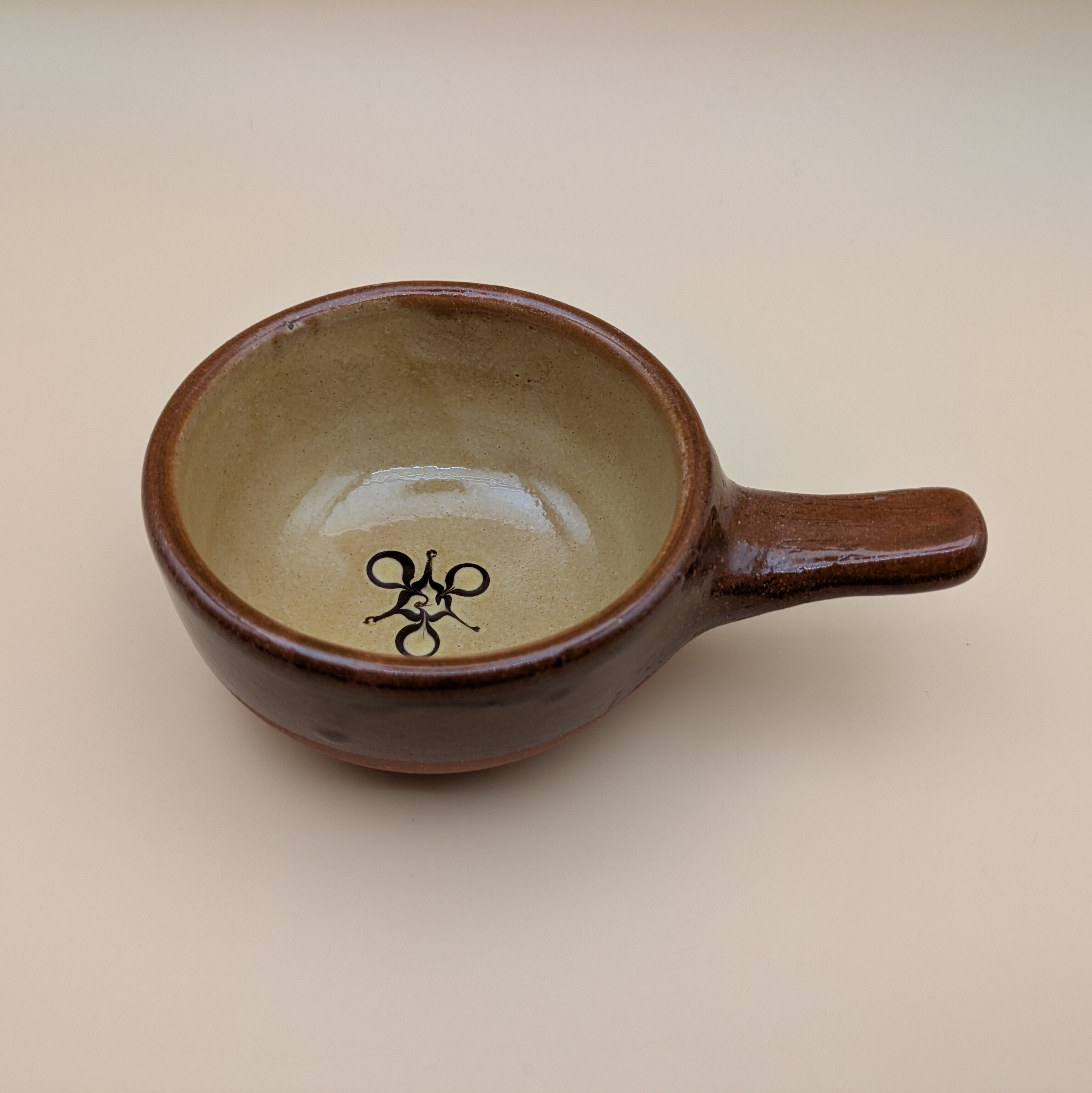 このエッグべーカーは、職人の手によって丹精込めて作られた逸品です。茶色の本体に黄色ぶちがアクセントとなり、和食器としても美しいデザインです。