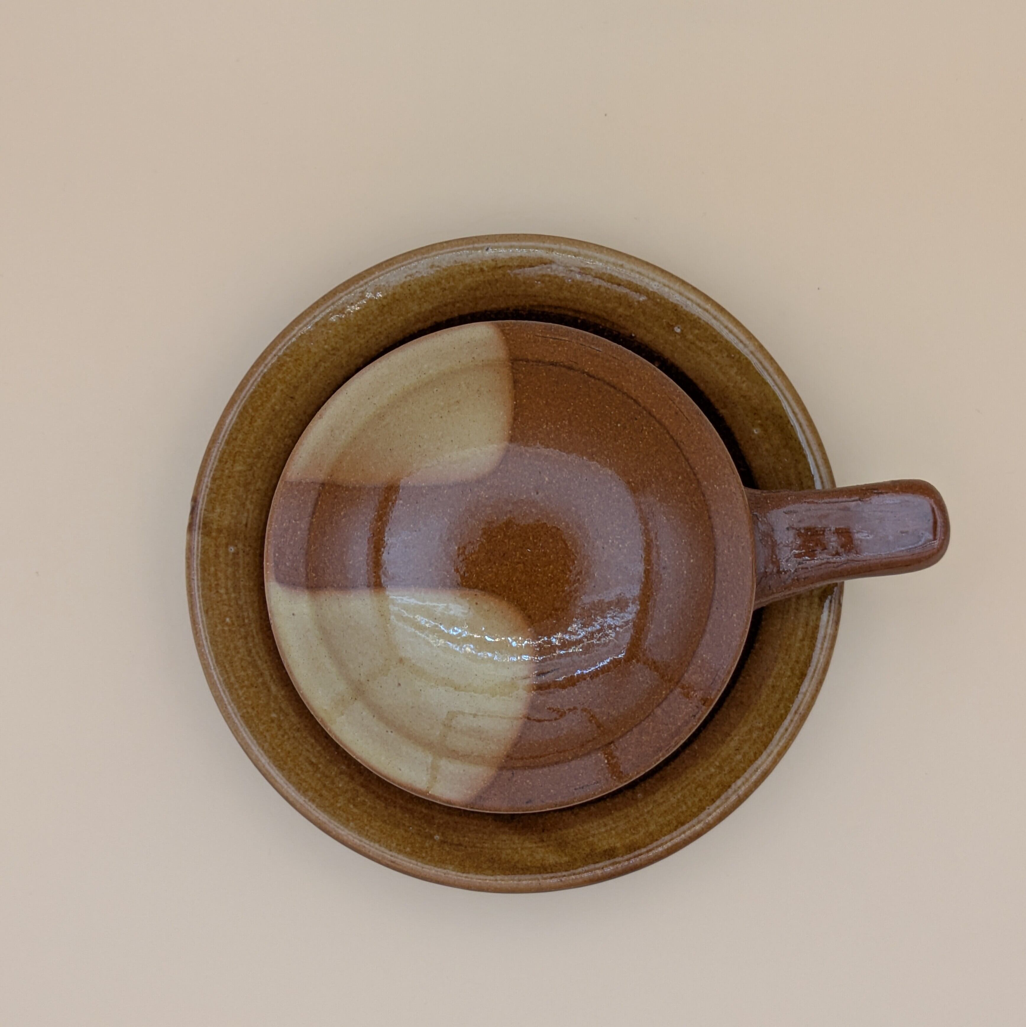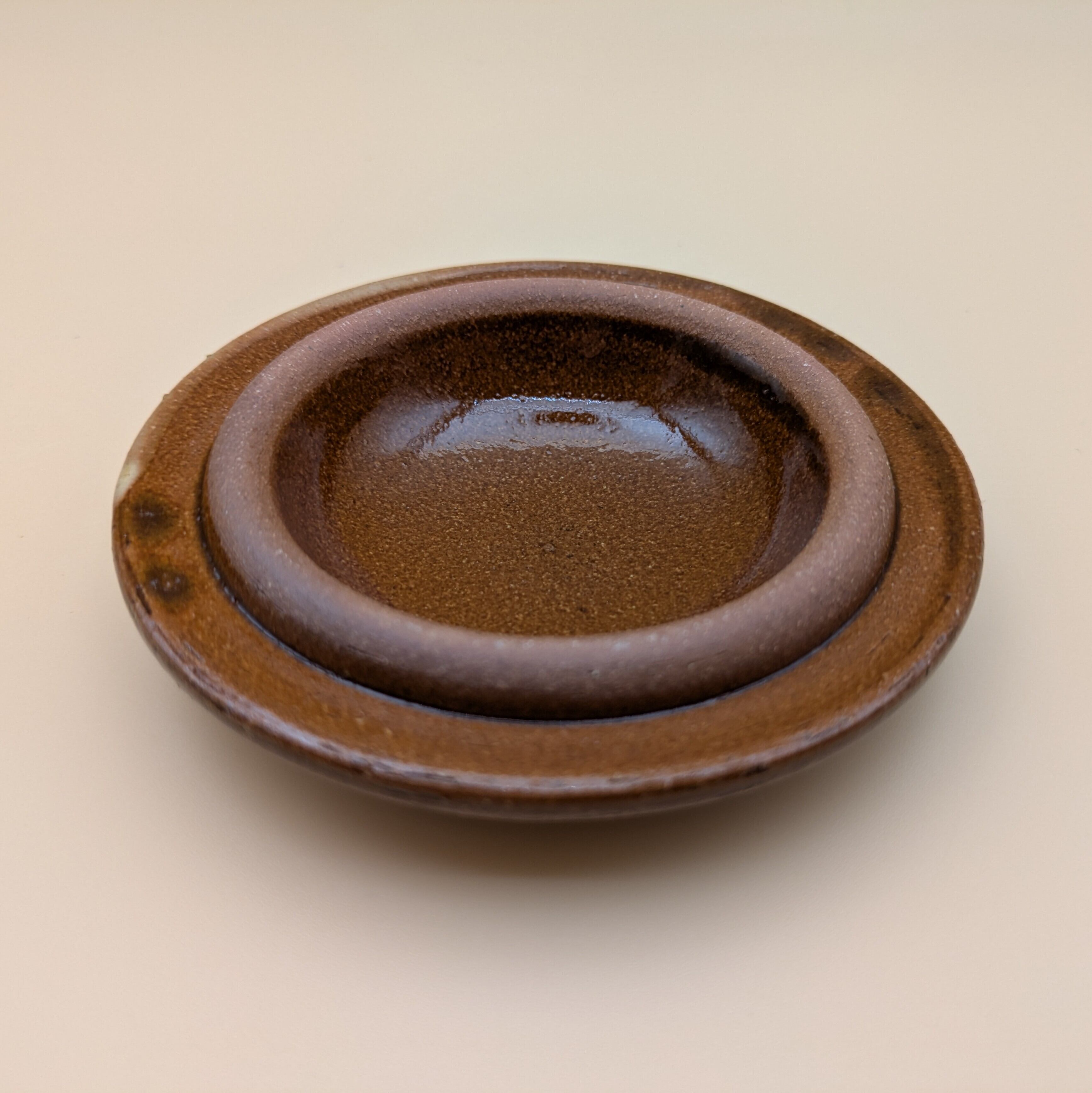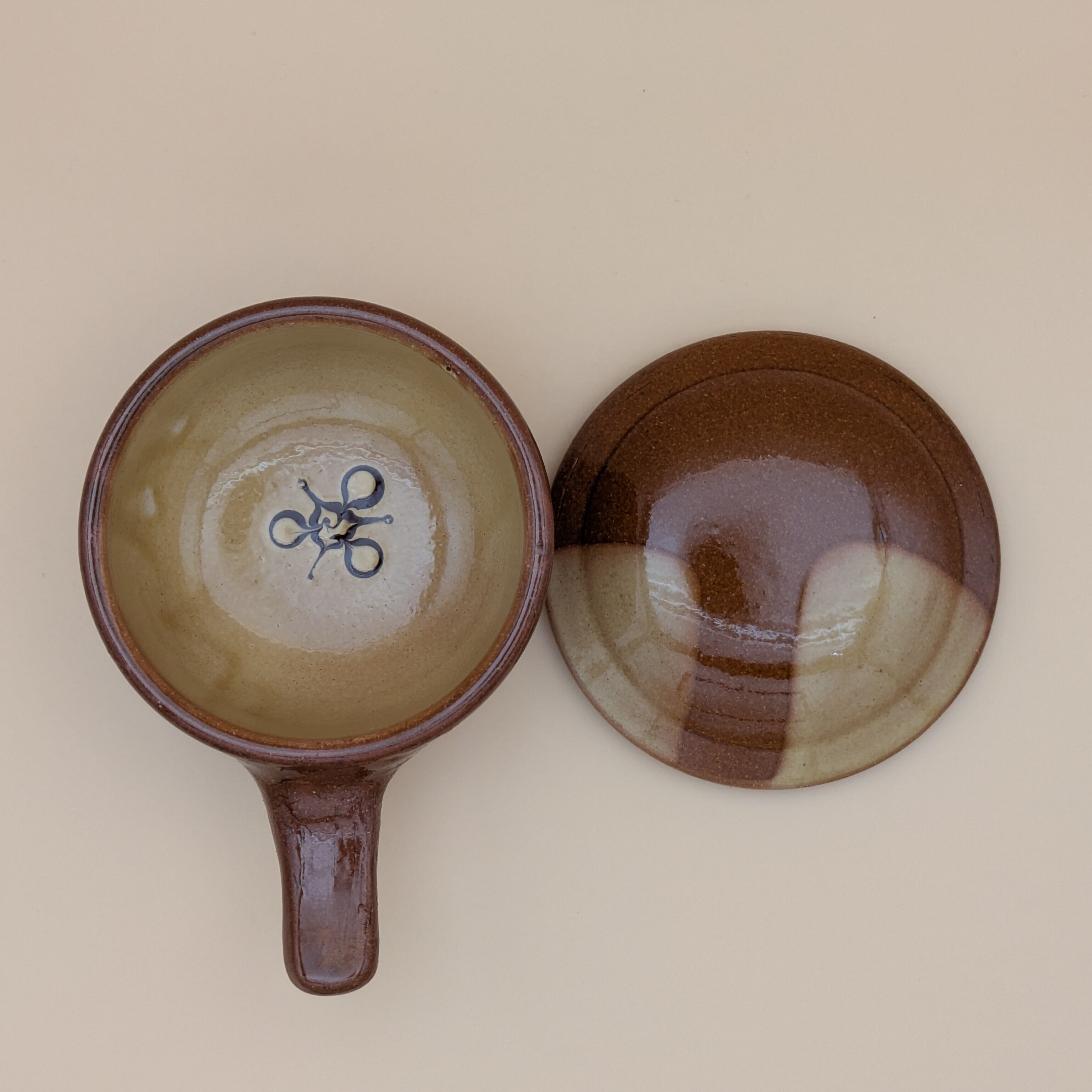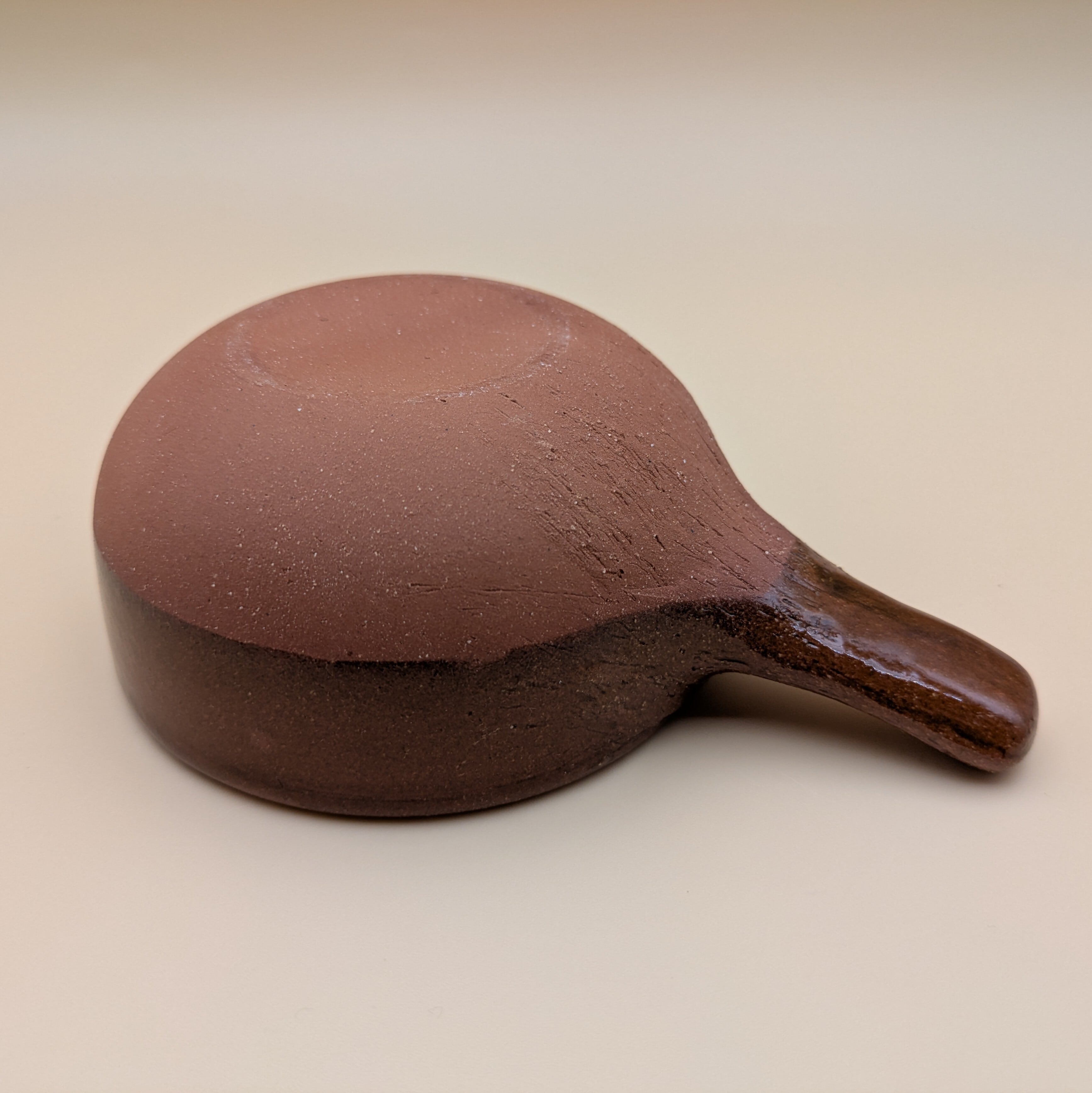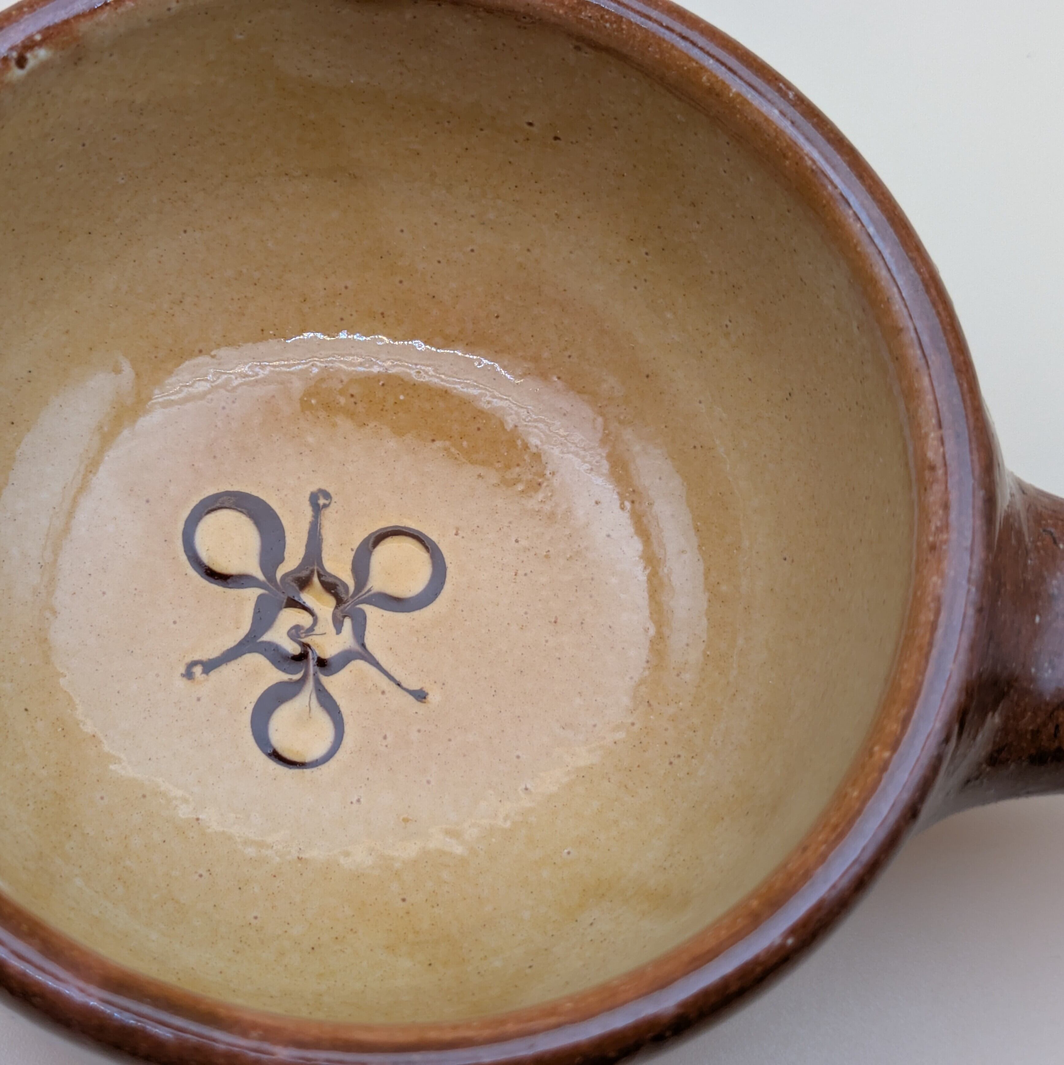 このエッグべーカーは、職人の手によって丹精込めて作られた逸品です。茶色の本体に黄色ぶちがアクセントとなり、和食器としても美しいデザインです。