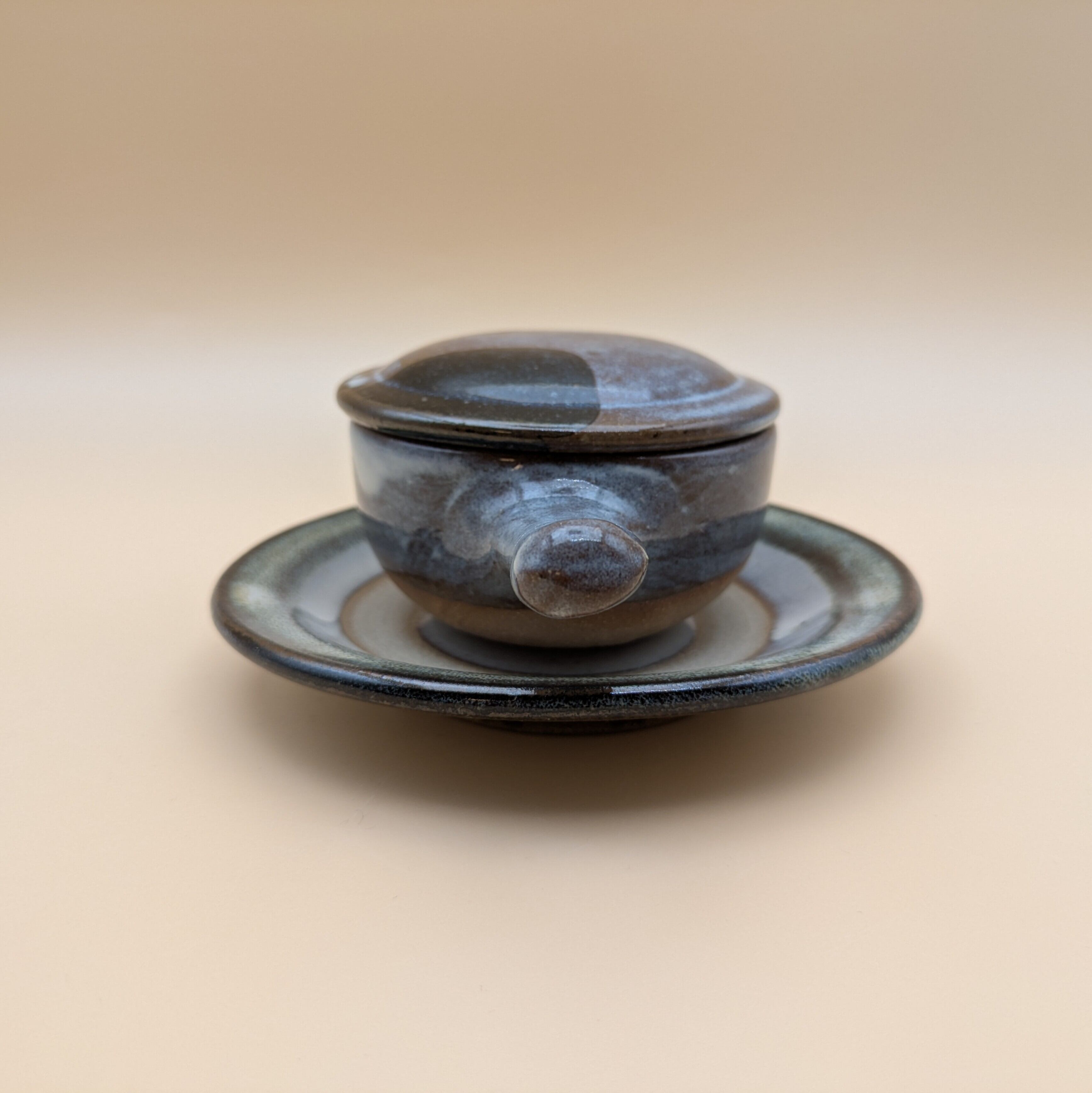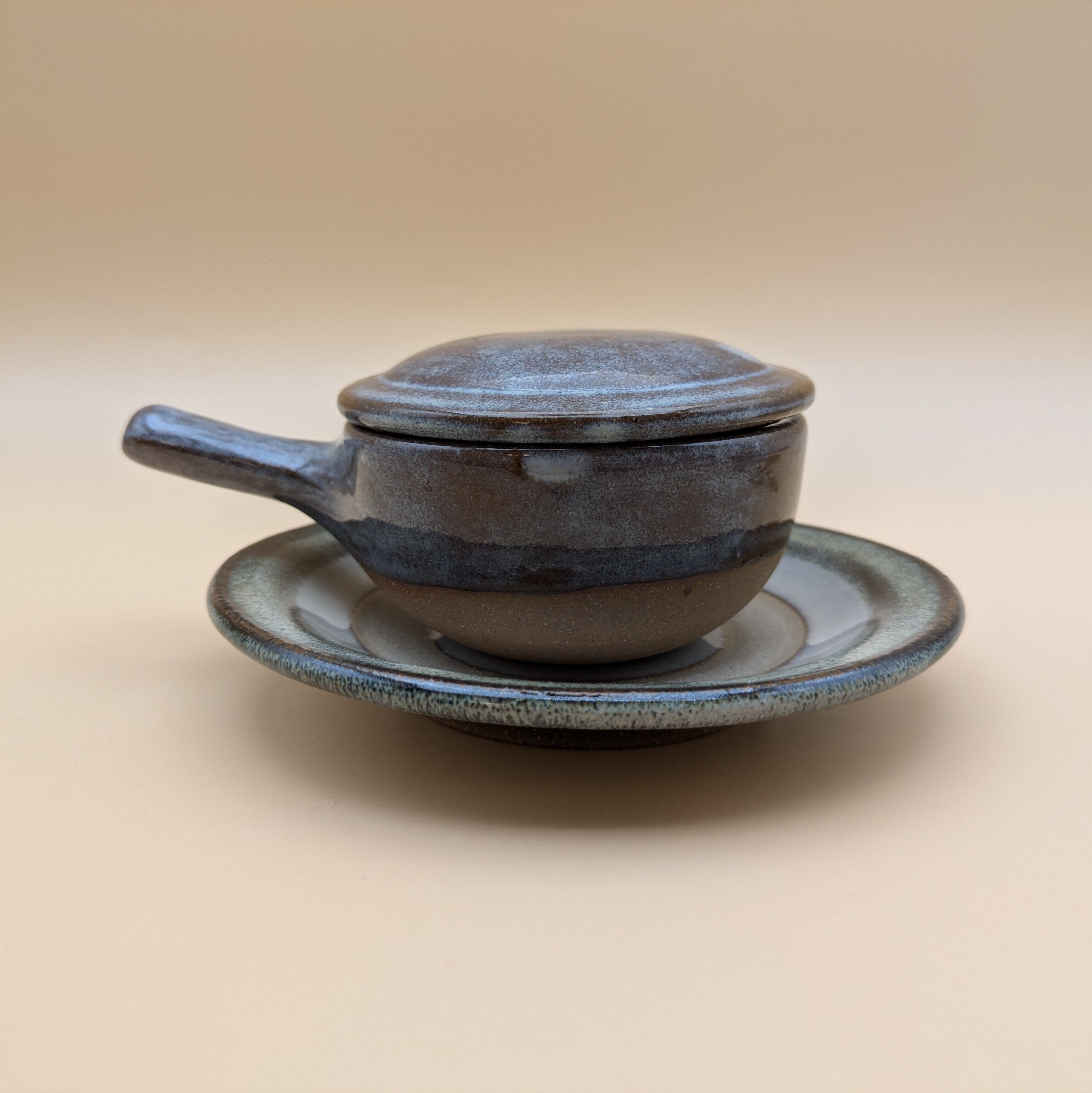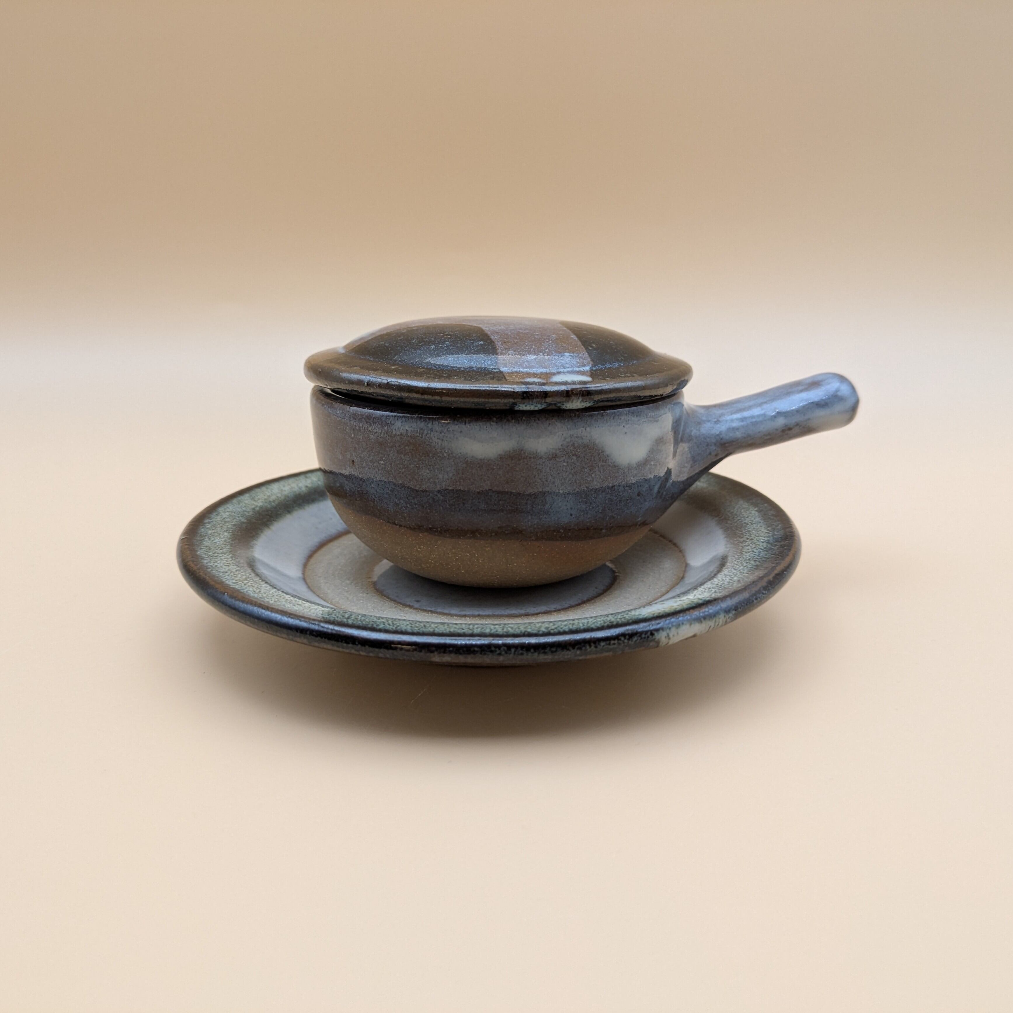 このエッグべーカーは、職人の手によって丹精込めて作られた逸品です。本体は、海鼠色の釉薬に黒縁がアクセントになり和食器としても美しいデザインです。