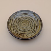 日本の伝統的な技術で作られた美しい陶器です。黄色地に飛び鉋の模様が施されており、和食器としてはもちろん、洋食器としてもお使いいただけます。