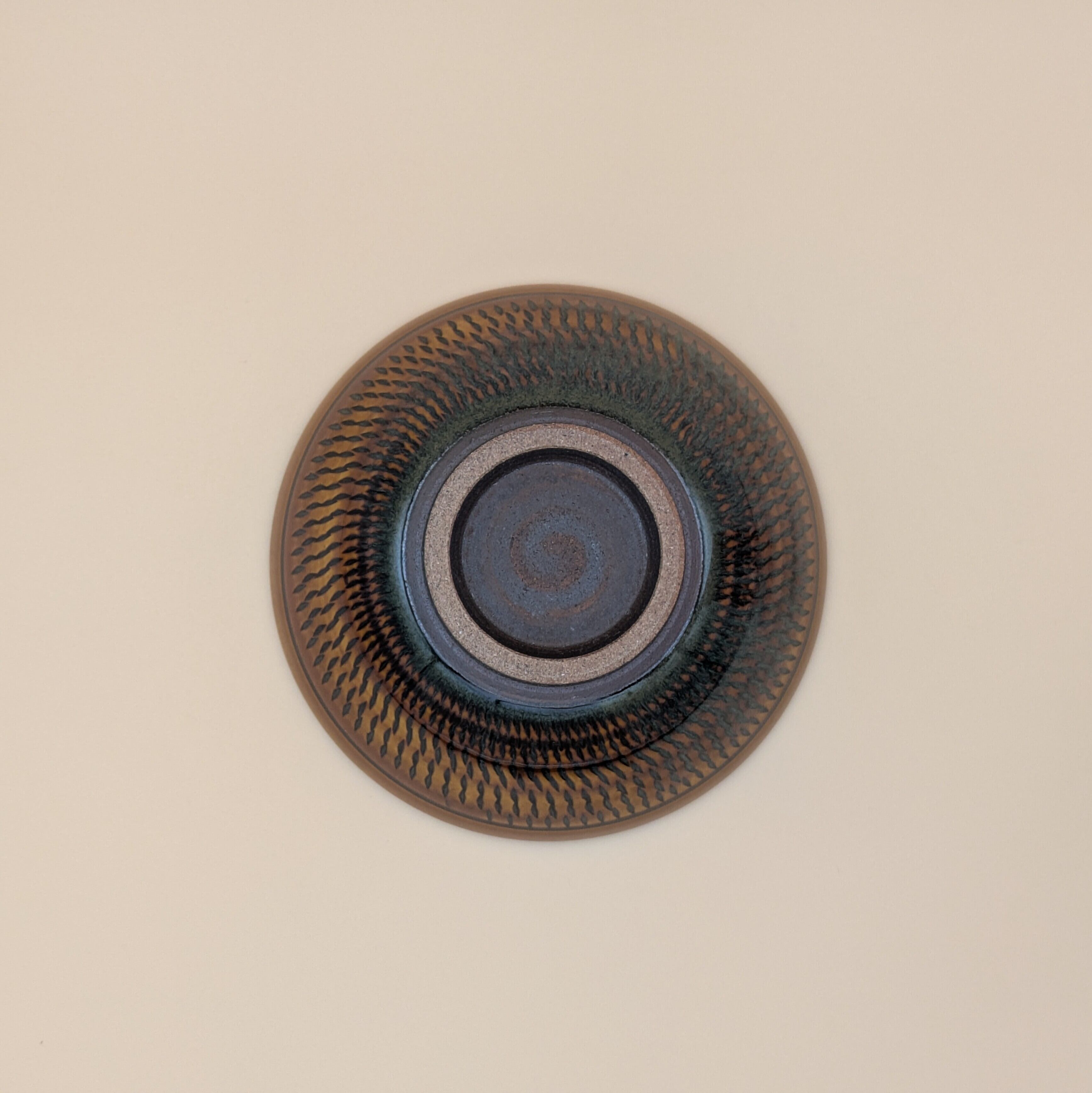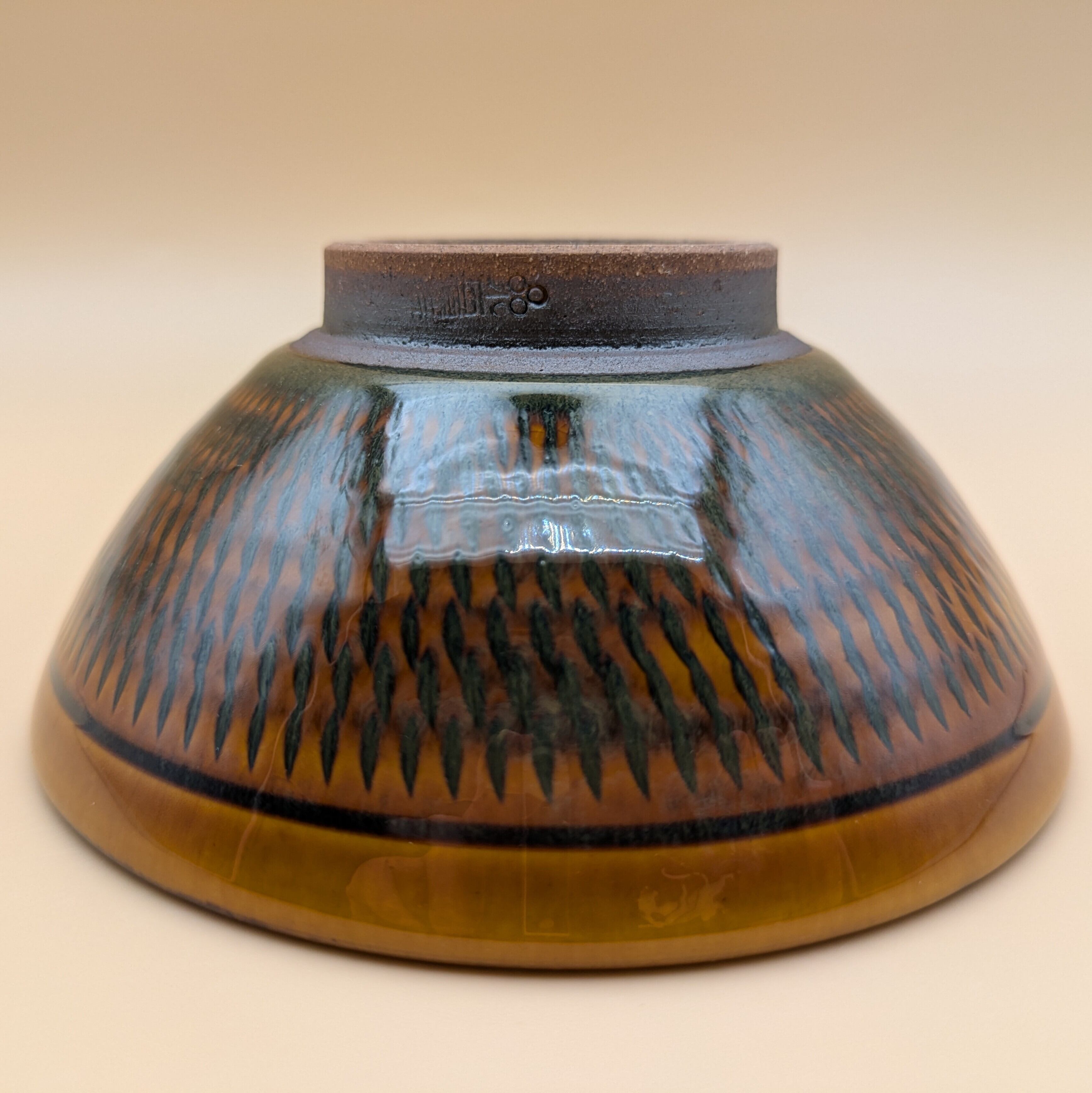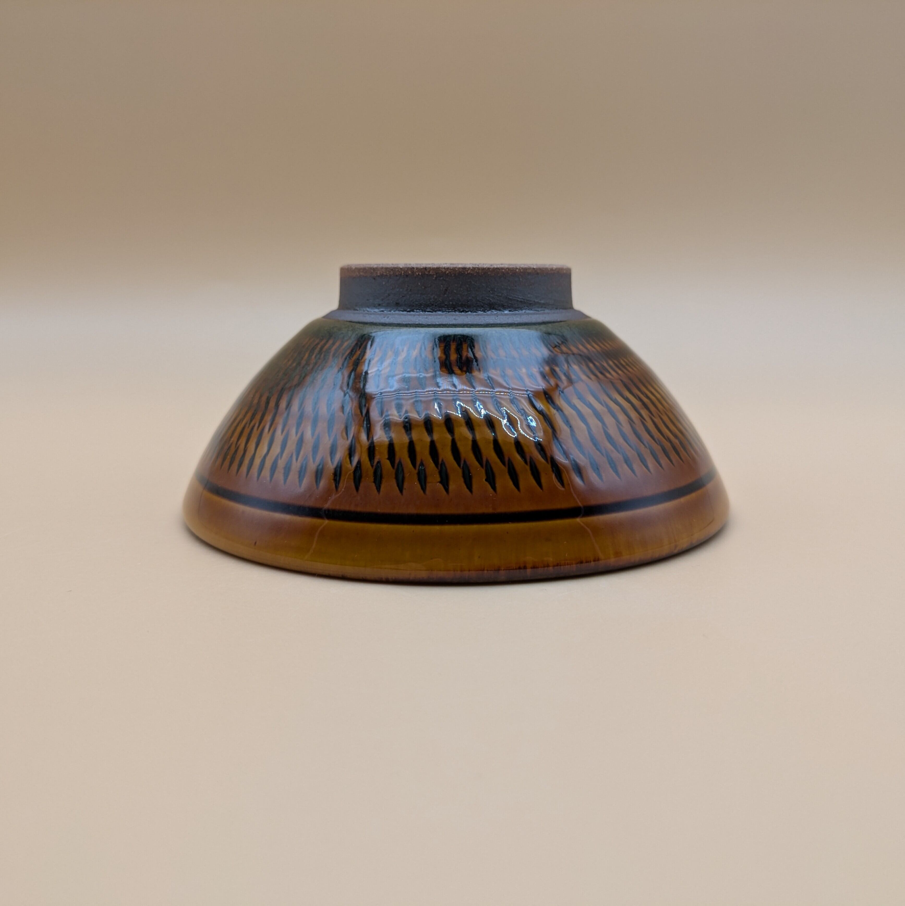 小石原焼の伝統技術が息づく、飴釉の茶碗です。飛び鉋と呼ばれる独特の模様が施され、飴釉が煌びやかな輝きを放ちます。この茶碗は、使うほどに味わい深く、愛着が湧く一品です。