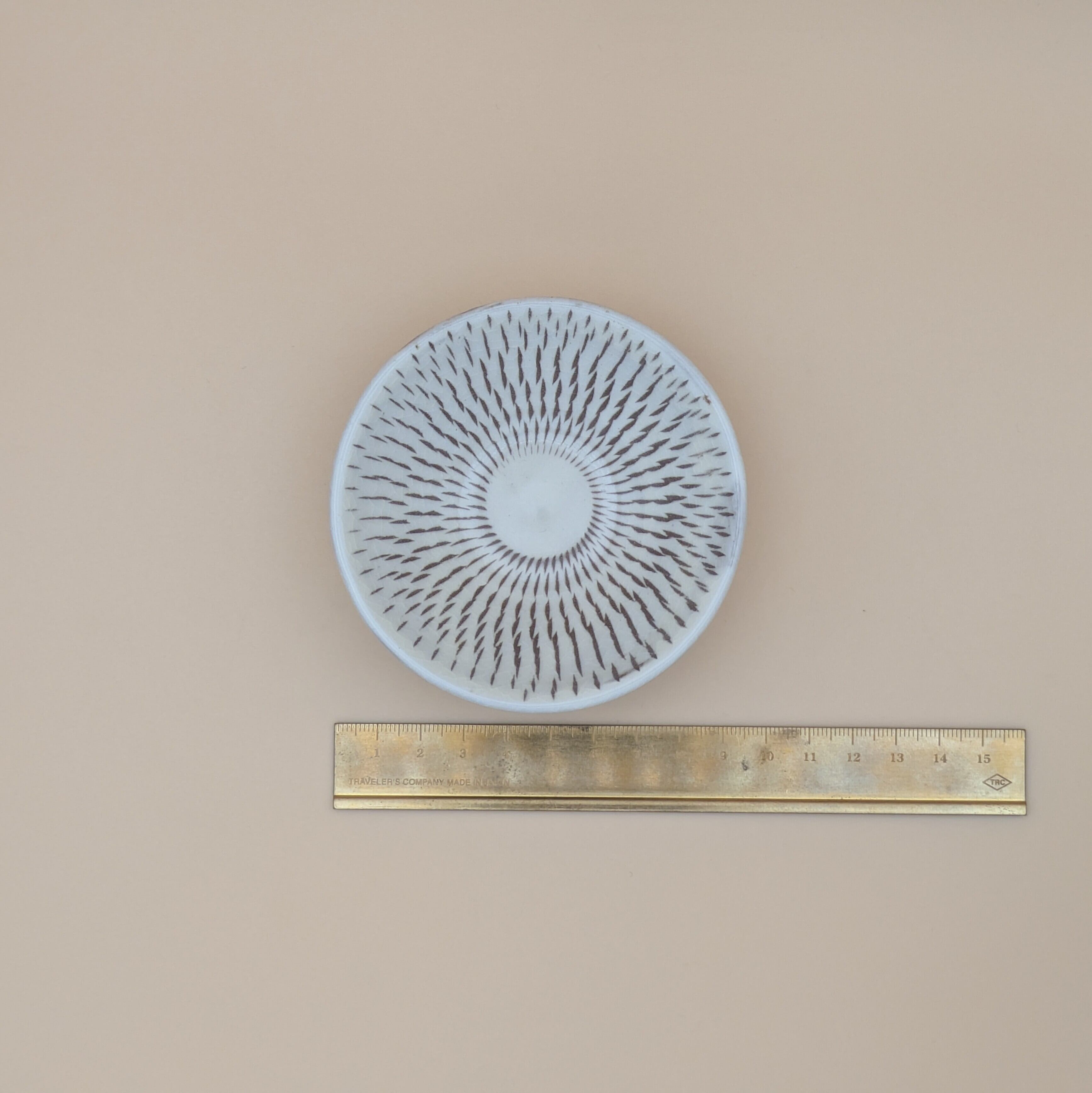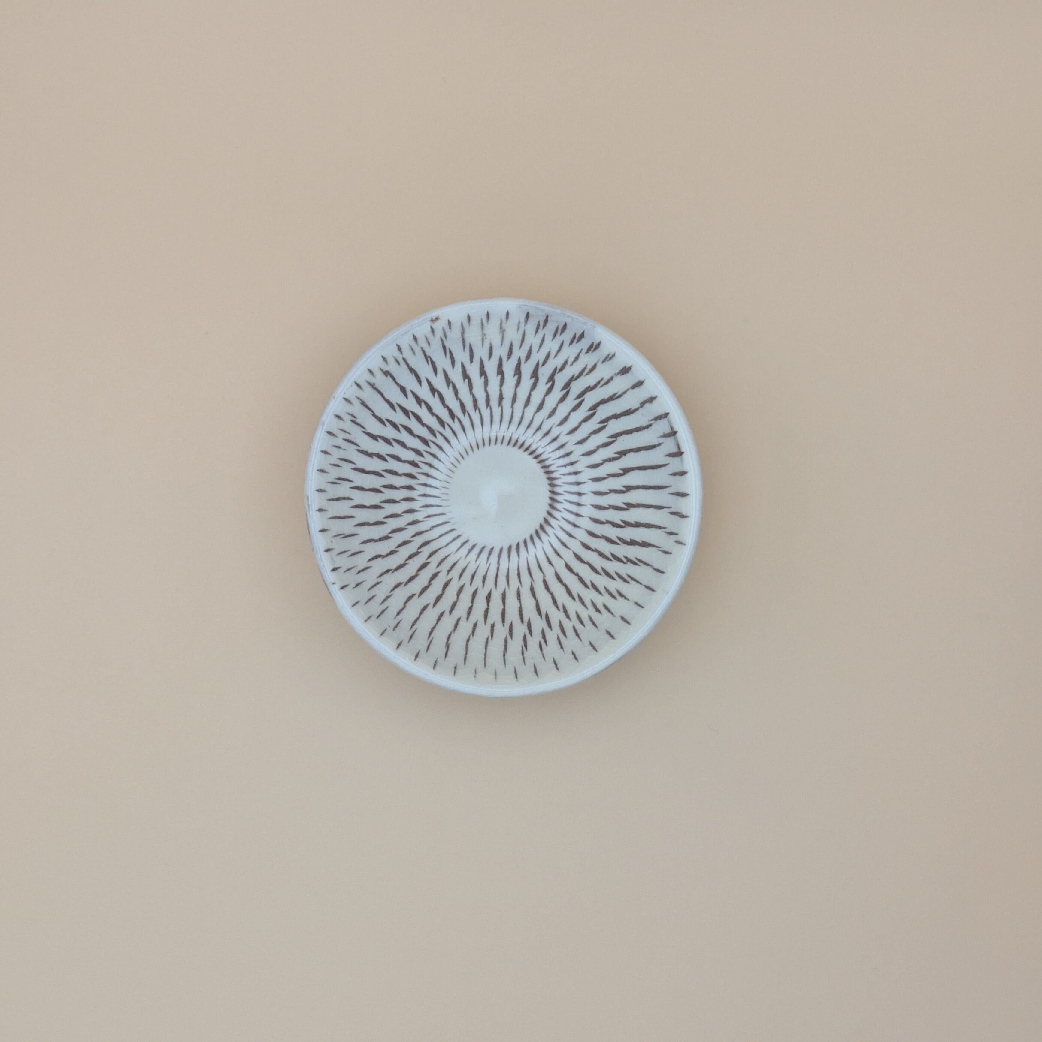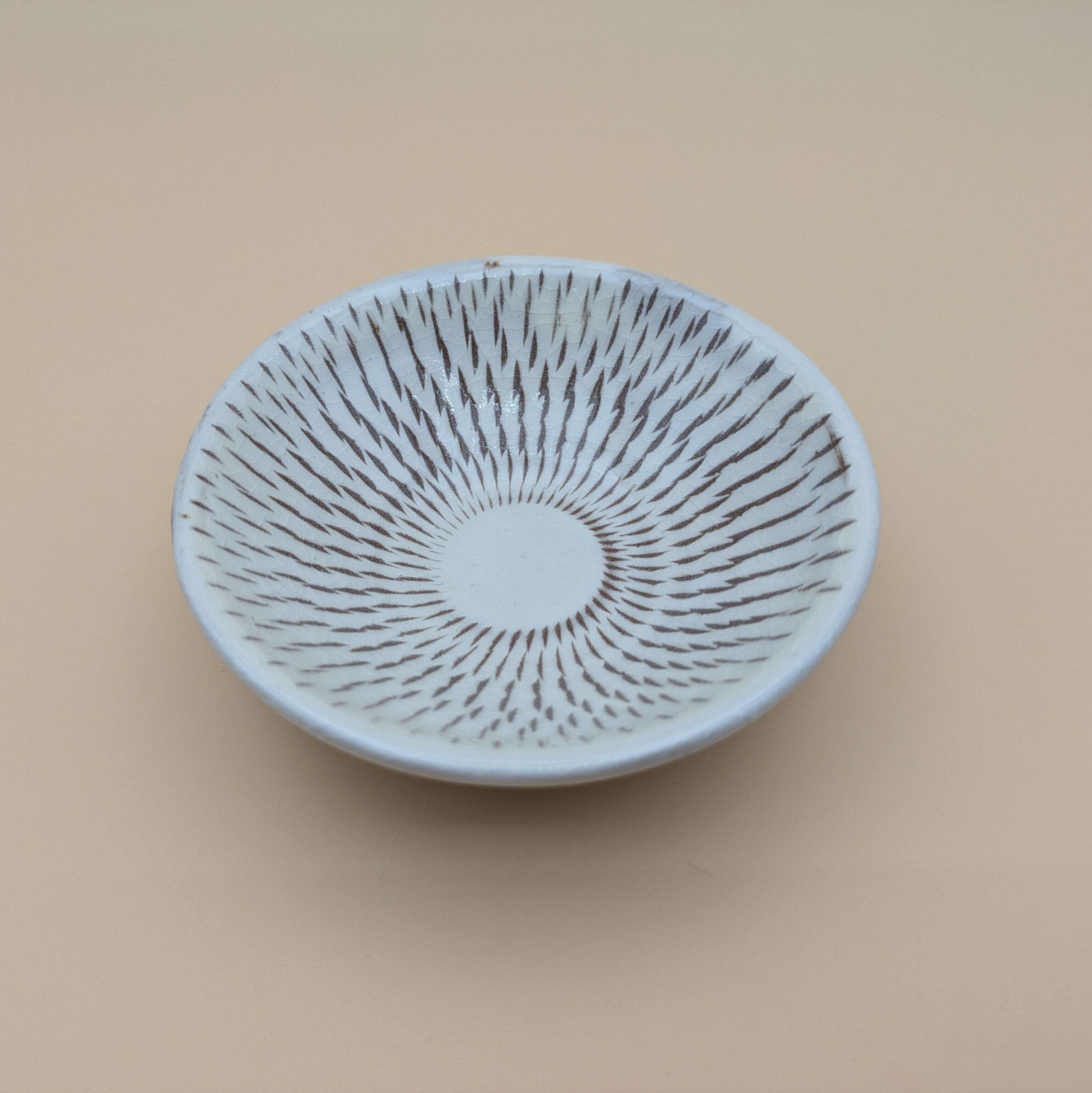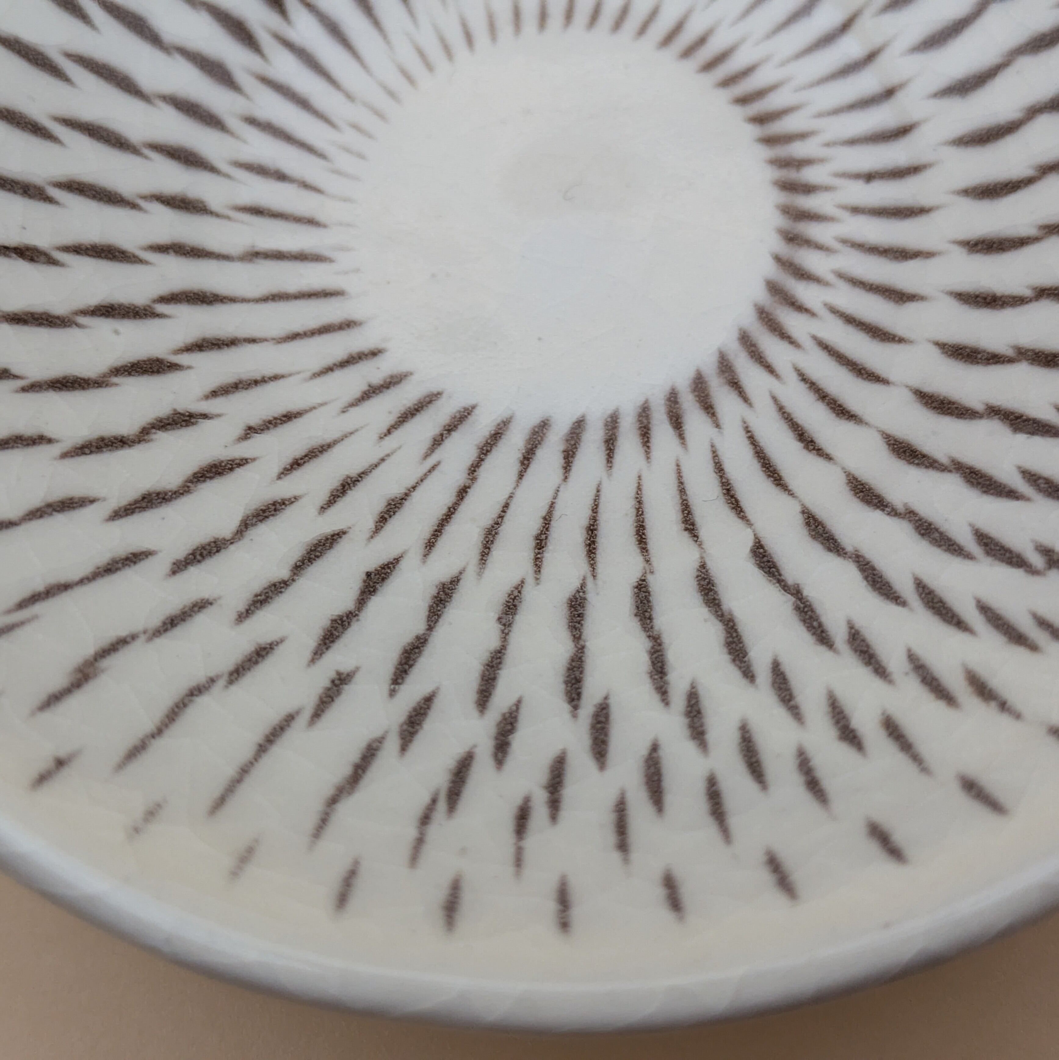 日本の伝統工芸品である小石原焼の豆皿で、飛び鉋の技法を使い、繊細な模様を表現しています。